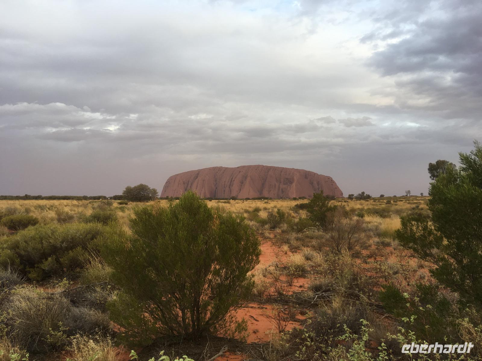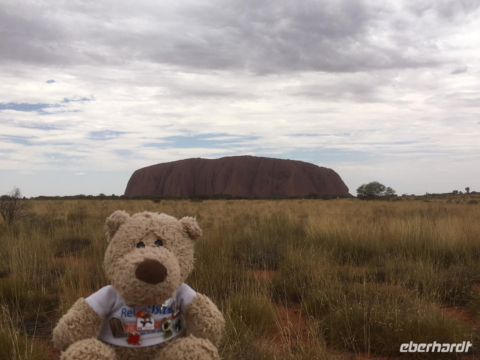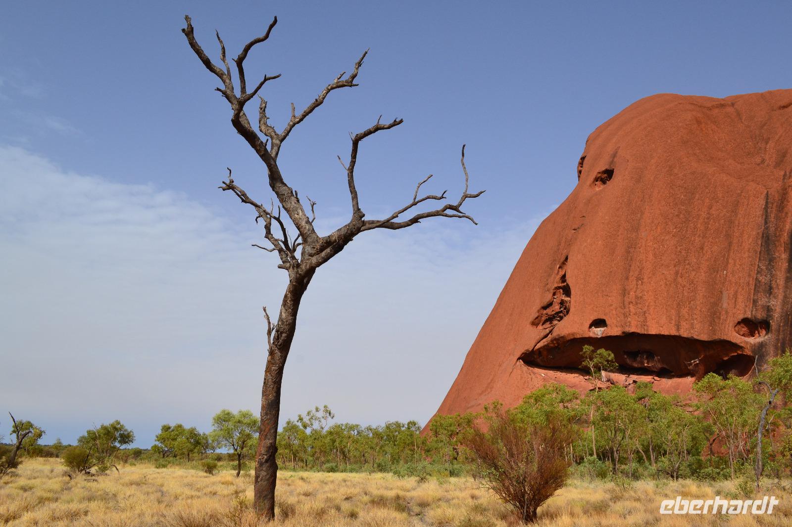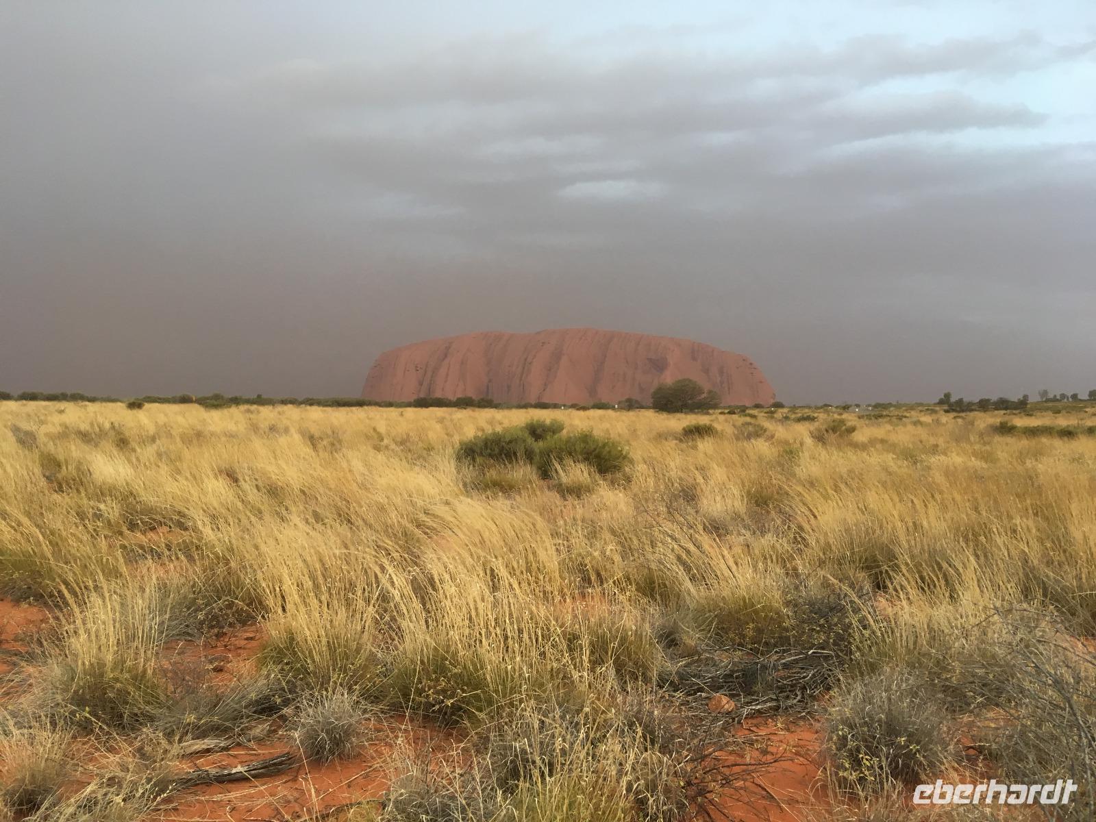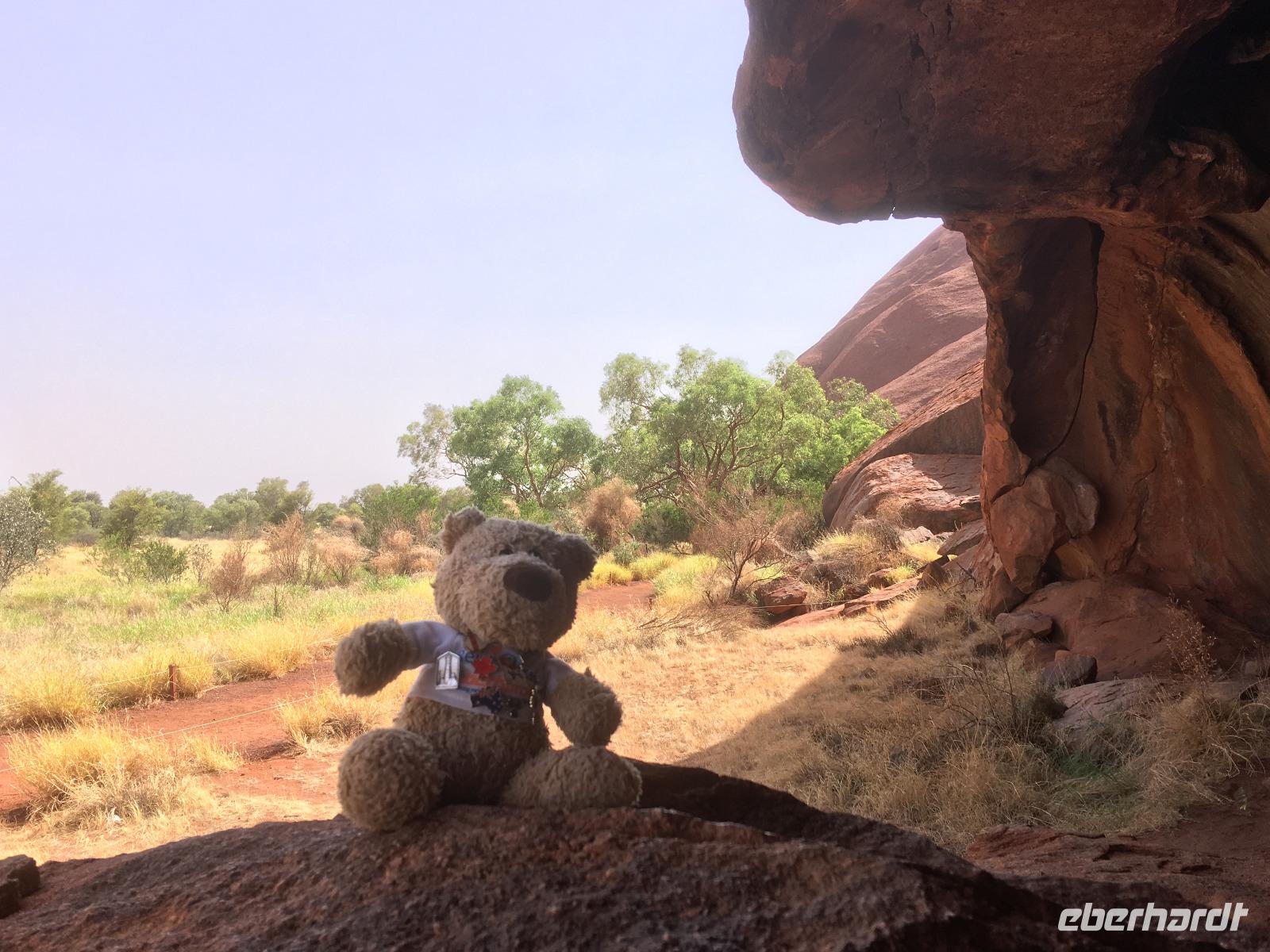Das Herz des Roten Kontinents wartet heute auf uns - und es ist so ungeduldig, dass es uns gar nicht richtig ausschlafen lässt. Noch im Dunkeln werden wir zum Flughafen von Cairns gebracht, wo wir nach dem Einchecken unsere Frühstückspakete schlachten. Der Flughafen Ayers Rock ist noch übersichtlicher als der von Cairns, und so fällt es uns nicht schwer, unseren neuen örtlichen Reiseleiter Johannes zu finden, der gleichzeitig auch unser Fahrer ist. Wir laden die Koffer in den Anhänger und düsen los in Richtung Uluru-Kata-Tjuta-Nationalpark. Es ist sehr heiß draußen, aber zum Glück hat unser Kleinbus eine Klimaanlage und für Trinkwasser ist auch gesorgt. Am Uluru (Ayers Rock) fahren wir zunächst vorbei, auch wenn uns das bekannteste natürliche Wahrzeichen Australiens selbstverständlich ganz besonders reizt. Stattdessen fahren wir zur Kata Tjuta, den 36 Köpfen, dessen höchster mit 564 m sogar höher als der Uluru ist. Die Formationen Kata Tjuta (Olgas) und Uluru sind zur gleichen Zeit entstanden - vor mehr als 300 Millionen Jahren. Während der Uluru aus feinkörnigem Sandstein besteht, ist es bei den Olgas verkittetes Geröll. Nach einem ersten Panorama-Fotostopp können wir dies anschließend bei einer Wanderung in die Walpa Gorge auch eindeutig erkennen. Leider schmälern die vielen Fliegen und die brennende Sonne das Vergnügen. So flüchten wir nach einer Weile zurück in den Bus und fahren schon jetzt zum Sonnenuntergangs-Aussichtspunkt am Uluru, um ein paar Fotos zu machen. Die Mittagspause verbringen wir im übersichtlichen Zentrum des Resort-Ortes Yulara - Essen und Bier bekommt uns aber vorzüglich. In der Zwischenzeit checkt uns Johannes im Hotel ein und lässt uns die Koffer schon auf unsere Zimmer bringen. Dann holt er uns am Marktplatz ab, und wir können uns bis zum Abend erholen. Mit einem Gläschen Sekt und ein paar Snacks gerüstet, wollen wir später dann den Sonnenuntergang am Uluru genießen. Tatsächlich haben sich aber dunkle Regenwolken am Himmel gebildet, und vom Sonnenuntergang ist nicht so viel zu sehen. Dafür sehen wir aber einen wunderschönen Regenbogen und eine Schlange, die eine Fledermaus verspeist! Beim anschließenden Barbecue (australisch: Barbie) im Hotel können wir uns bei Live-Musik unser Abendessen selbst grillen - wie echte Australier.