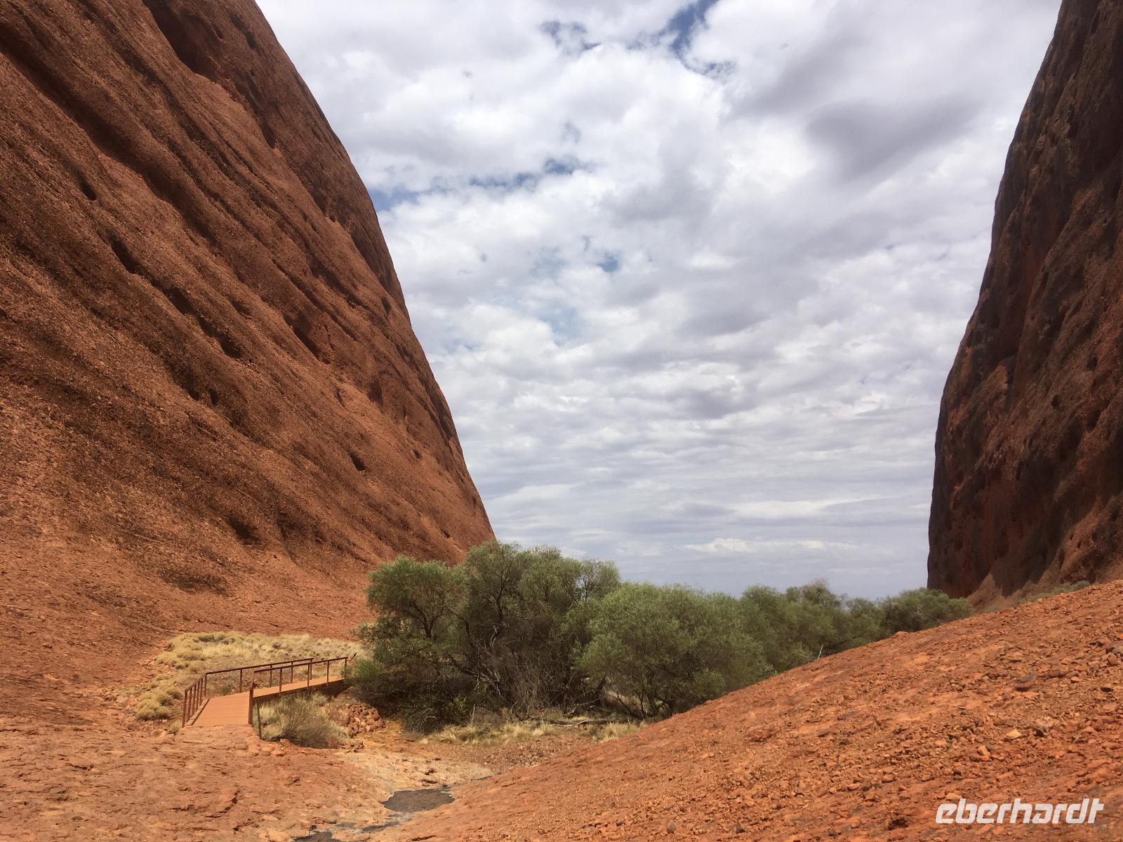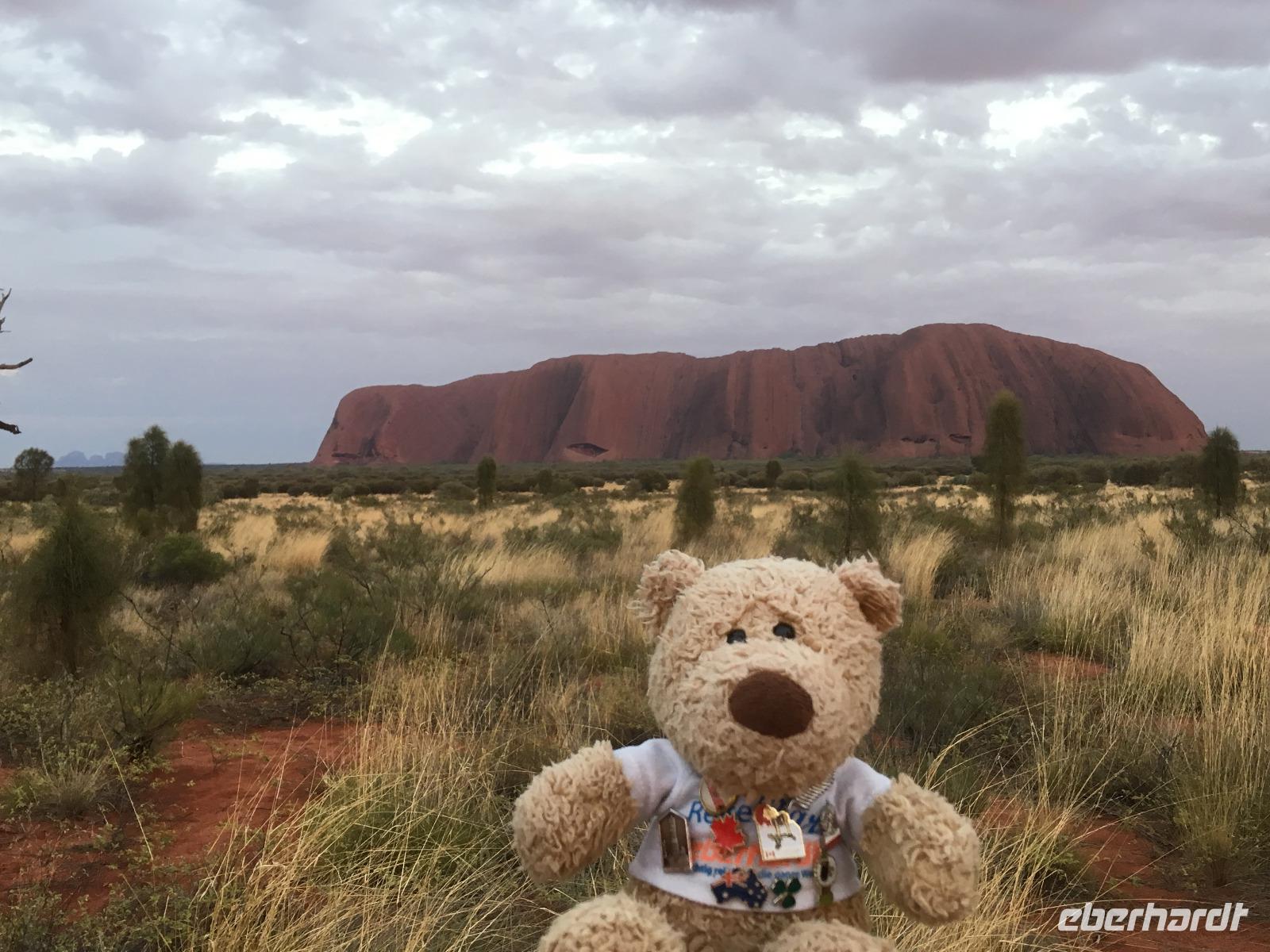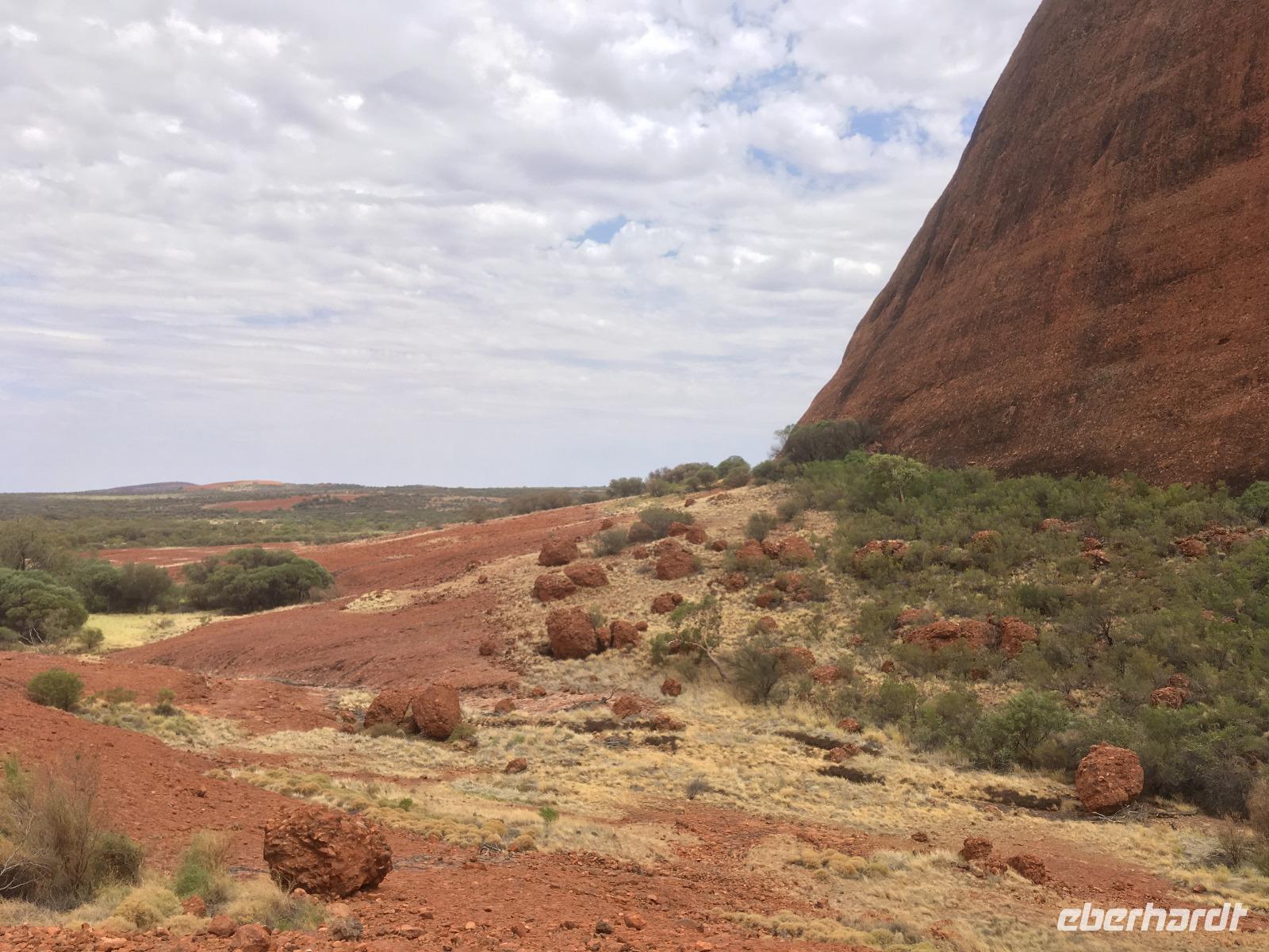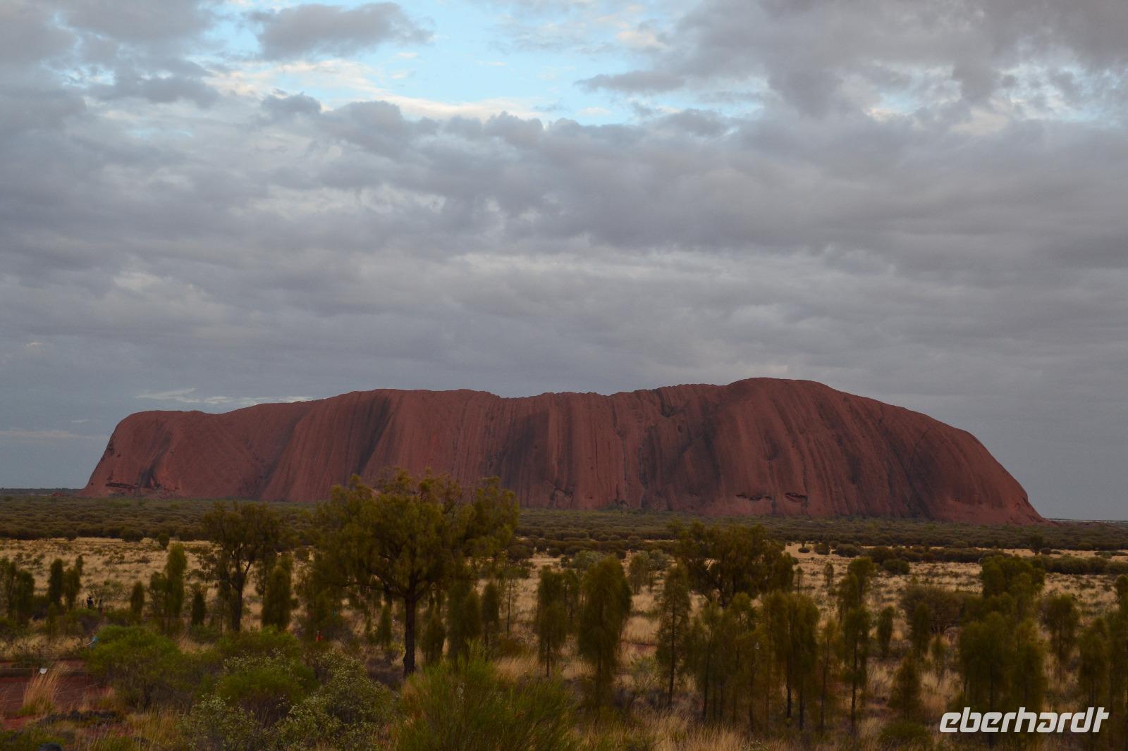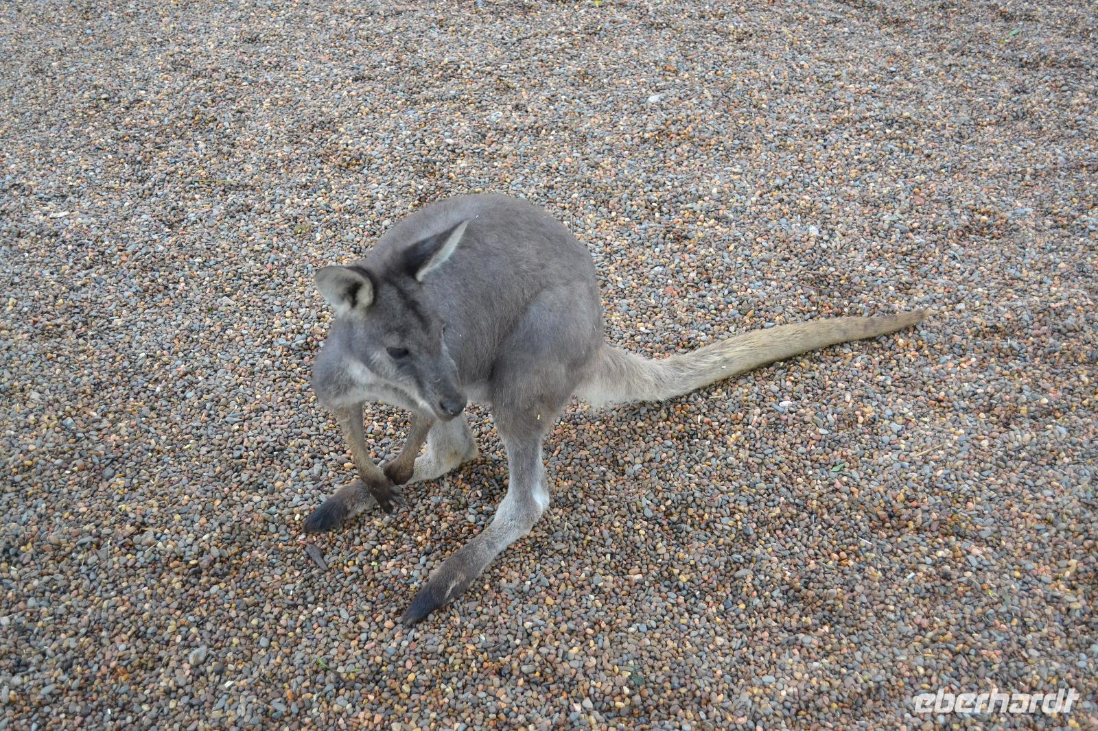 Das Herz des Roten Kontinents wartet heute auf uns - und es ist so ungeduldig, dass es uns gar nicht richtig ausschlafen lässt. Noch im Dunkeln werden wir zum Flughafen von Cairns gebracht, wo wir nach dem Einchecken unsere Frühstückspakete schlachten. Der Flughafen Ayers Rock ist noch übersichtlicher als der von Cairns, und so fällt es uns nicht schwer, unseren neuen örtlichen Reiseleiter Johannes zu finden, der gleichzeitig auch unser Fahrer ist. Wir laden die Koffer in den Anhänger und düsen los in Richtung Uluru-Kata-Tjuta-Nationalpark. Es ist sehr heiß draußen, aber zum Glück hat unser Kleinbus eine Klimaanlage und für Trinkwasser ist auch gesorgt. Am Uluru (Ayers Rock) fahren wir zunächst vorbei, auch wenn uns das bekannteste natürliche Wahrzeichen Australiens selbstverständlich ganz besonders reizt. Stattdessen fahren wir zur Kata Tjuta, den 36 Köpfen, dessen höchster mit 564 m sogar höher als der Uluru ist. Die Formationen Kata Tjuta (Olgas) und Uluru sind zur gleichen Zeit entstanden - vor mehr als 300 Millionen Jahren. Während der Uluru aus feinkörnigem Sandstein besteht, ist es bei den Olgas verkittetes Geröll. Nach einem ersten Panorama-Fotostopp können wir dies anschließend bei einer Wanderung in die Walpa Gorge auch eindeutig erkennen. Leider schmälern die vielen Fliegen und die brennende Sonne das Vergnügen. So flüchten wir nach einer Weile zurück in den Bus und fahren schon jetzt zum Sonnenuntergangs-Aussichtspunkt am Uluru, um ein paar Fotos zu machen. Die Mittagspause verbringen wir im übersichtlichen Zentrum des Resort-Ortes Yulara - Essen und Bier bekommt uns aber vorzüglich. In der Zwischenzeit checkt uns Johannes im Hotel ein und lässt uns die Koffer schon auf unsere Zimmer bringen. Dann holt er uns am Marktplatz ab, und wir können uns bis zum Abend erholen. Mit einem Gläschen Sekt und ein paar Snacks gerüstet, wollen wir später dann den Sonnenuntergang am Uluru genießen. Tatsächlich haben sich aber dunkle Regenwolken am Himmel gebildet, und vom Sonnenuntergang ist nicht so viel zu sehen. Dafür sehen wir aber einen wunderschönen Regenbogen und eine Schlange, die eine Fledermaus verspeist! Beim anschließenden Barbecue (australisch: Barbie) im Hotel können wir uns bei Live-Musik unser Abendessen selbst grillen - wie echte Australier.