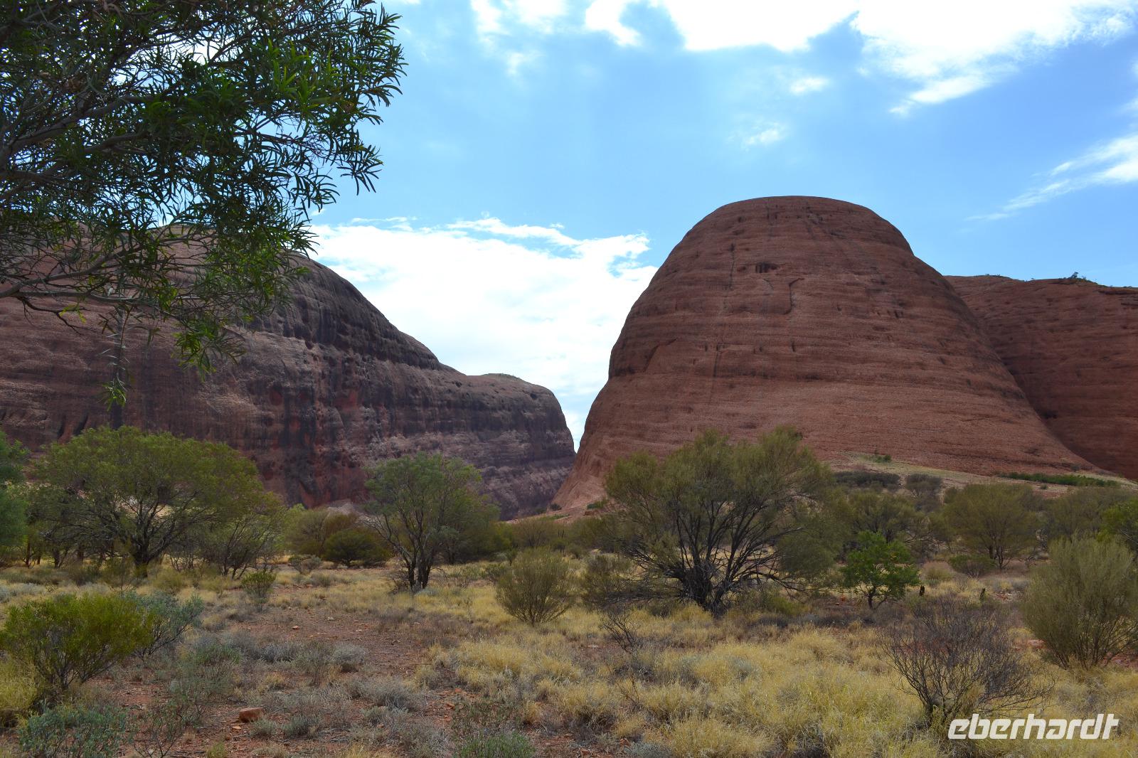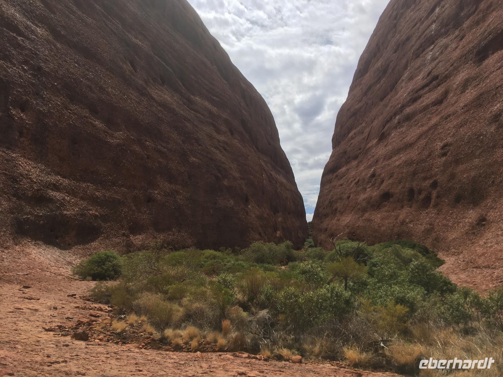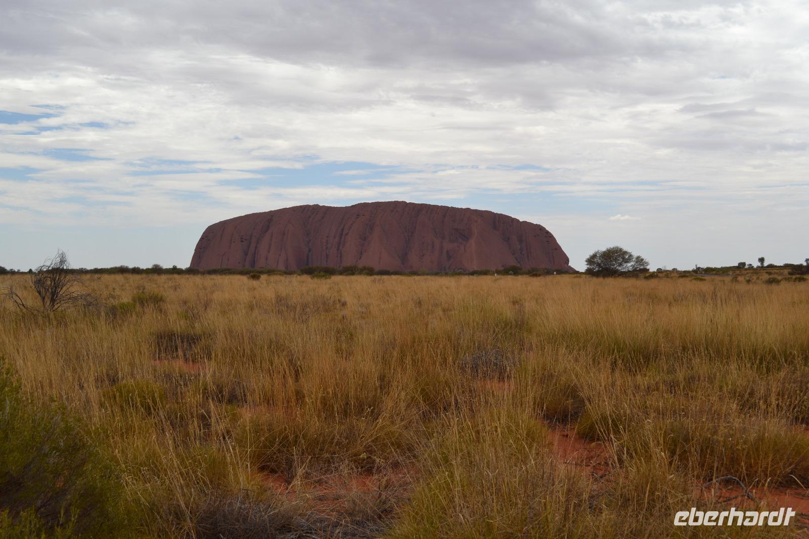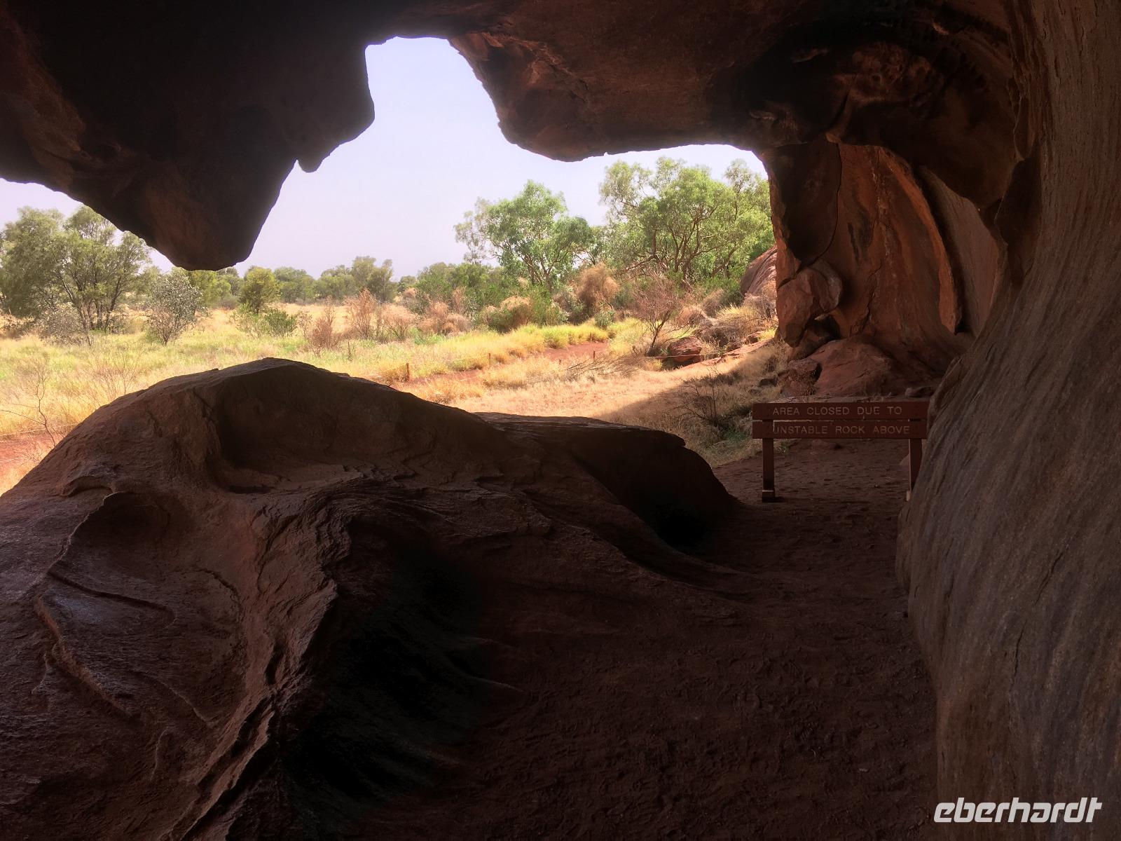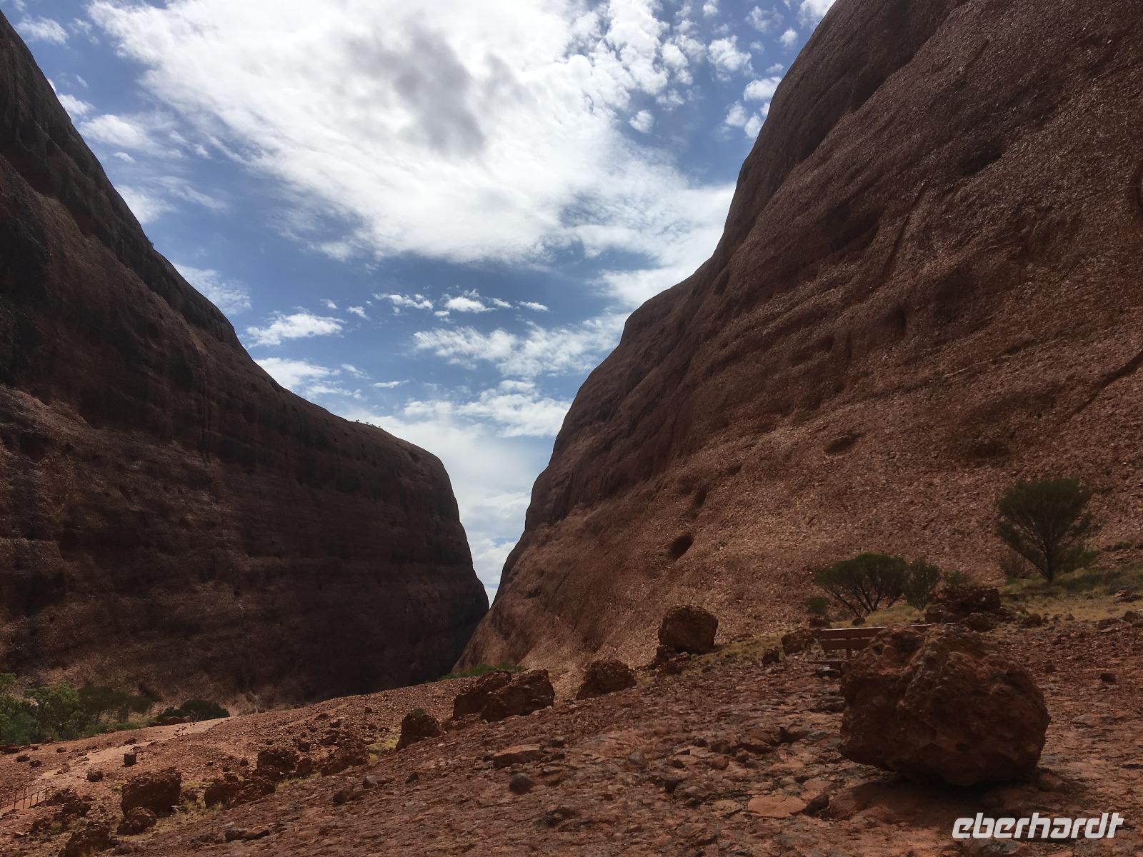 Das Herz des Roten Kontinents wartet heute auf uns - und es ist so ungeduldig, dass es uns gar nicht richtig ausschlafen lässt. Noch im Dunkeln werden wir zum Flughafen von Cairns gebracht, wo wir nach dem Einchecken unsere Frühstückspakete schlachten. Der Flughafen Ayers Rock ist noch übersichtlicher als der von Cairns, und so fällt es uns nicht schwer, unseren neuen örtlichen Reiseleiter Johannes zu finden, der gleichzeitig auch unser Fahrer ist. Wir laden die Koffer in den Anhänger und düsen los in Richtung Uluru-Kata-Tjuta-Nationalpark. Es ist sehr heiß draußen, aber zum Glück hat unser Kleinbus eine Klimaanlage und für Trinkwasser ist auch gesorgt. Am Uluru (Ayers Rock) fahren wir zunächst vorbei, auch wenn uns das bekannteste natürliche Wahrzeichen Australiens selbstverständlich ganz besonders reizt. Stattdessen fahren wir zur Kata Tjuta, den 36 Köpfen, dessen höchster mit 564 m sogar höher als der Uluru ist. Die Formationen Kata Tjuta (Olgas) und Uluru sind zur gleichen Zeit entstanden - vor mehr als 300 Millionen Jahren. Während der Uluru aus feinkörnigem Sandstein besteht, ist es bei den Olgas verkittetes Geröll. Nach einem ersten Panorama-Fotostopp können wir dies anschließend bei einer Wanderung in die Walpa Gorge auch eindeutig erkennen. Leider schmälern die vielen Fliegen und die brennende Sonne das Vergnügen. So flüchten wir nach einer Weile zurück in den Bus und fahren schon jetzt zum Sonnenuntergangs-Aussichtspunkt am Uluru, um ein paar Fotos zu machen. Die Mittagspause verbringen wir im übersichtlichen Zentrum des Resort-Ortes Yulara - Essen und Bier bekommt uns aber vorzüglich. In der Zwischenzeit checkt uns Johannes im Hotel ein und lässt uns die Koffer schon auf unsere Zimmer bringen. Dann holt er uns am Marktplatz ab, und wir können uns bis zum Abend erholen. Mit einem Gläschen Sekt und ein paar Snacks gerüstet, wollen wir später dann den Sonnenuntergang am Uluru genießen. Tatsächlich haben sich aber dunkle Regenwolken am Himmel gebildet, und vom Sonnenuntergang ist nicht so viel zu sehen. Dafür sehen wir aber einen wunderschönen Regenbogen und eine Schlange, die eine Fledermaus verspeist! Beim anschließenden Barbecue (australisch: Barbie) im Hotel können wir uns bei Live-Musik unser Abendessen selbst grillen - wie echte Australier.