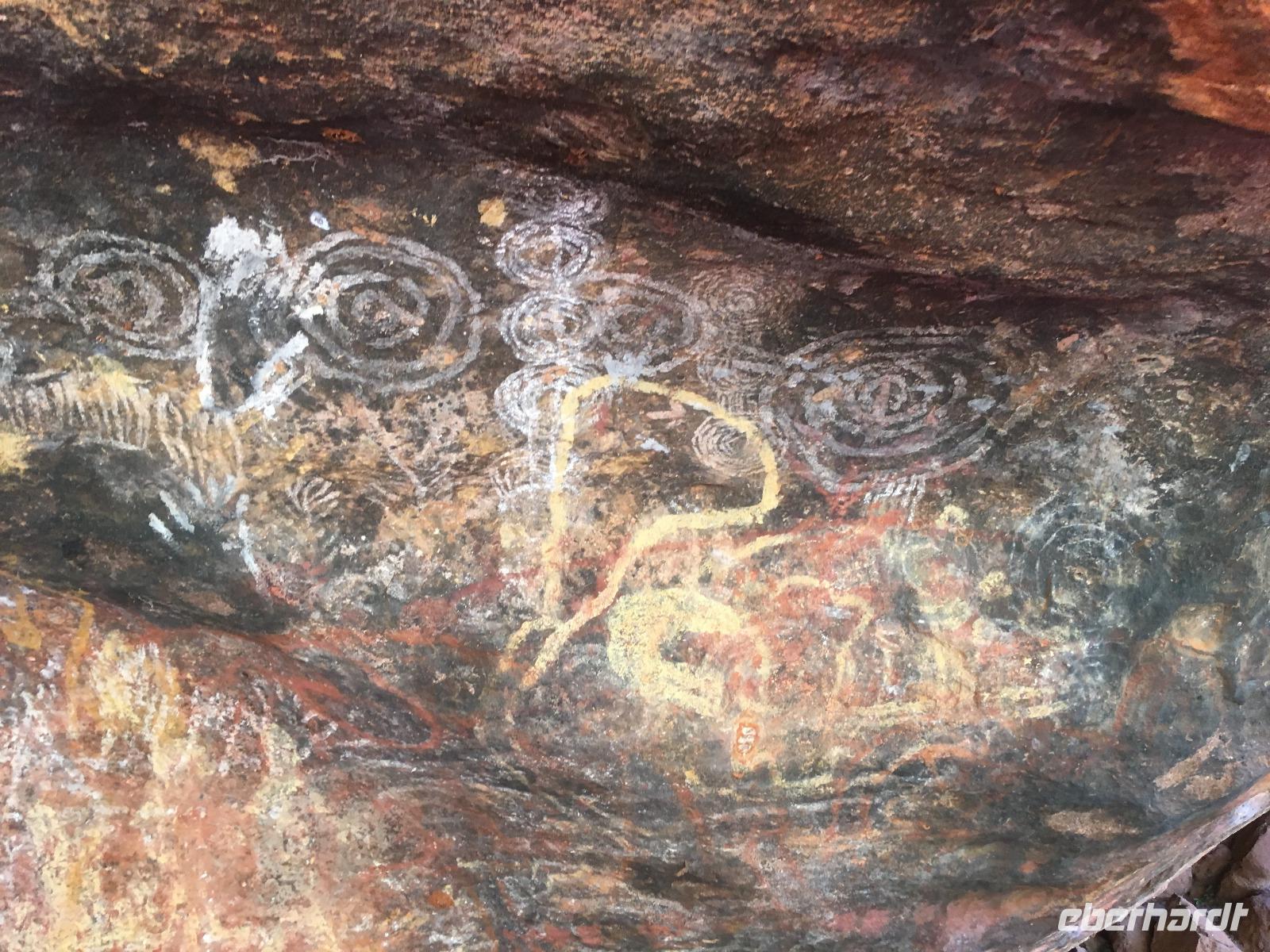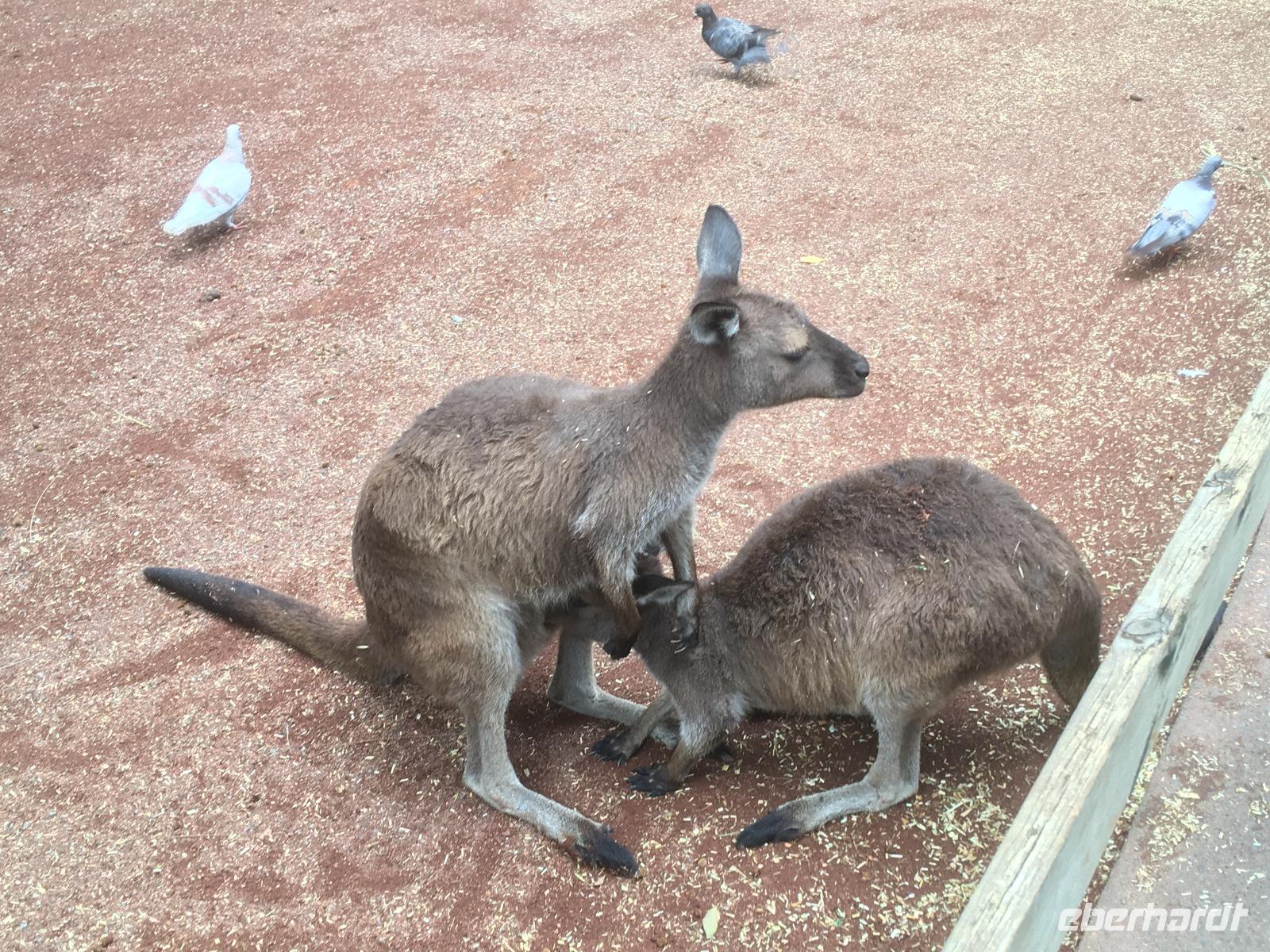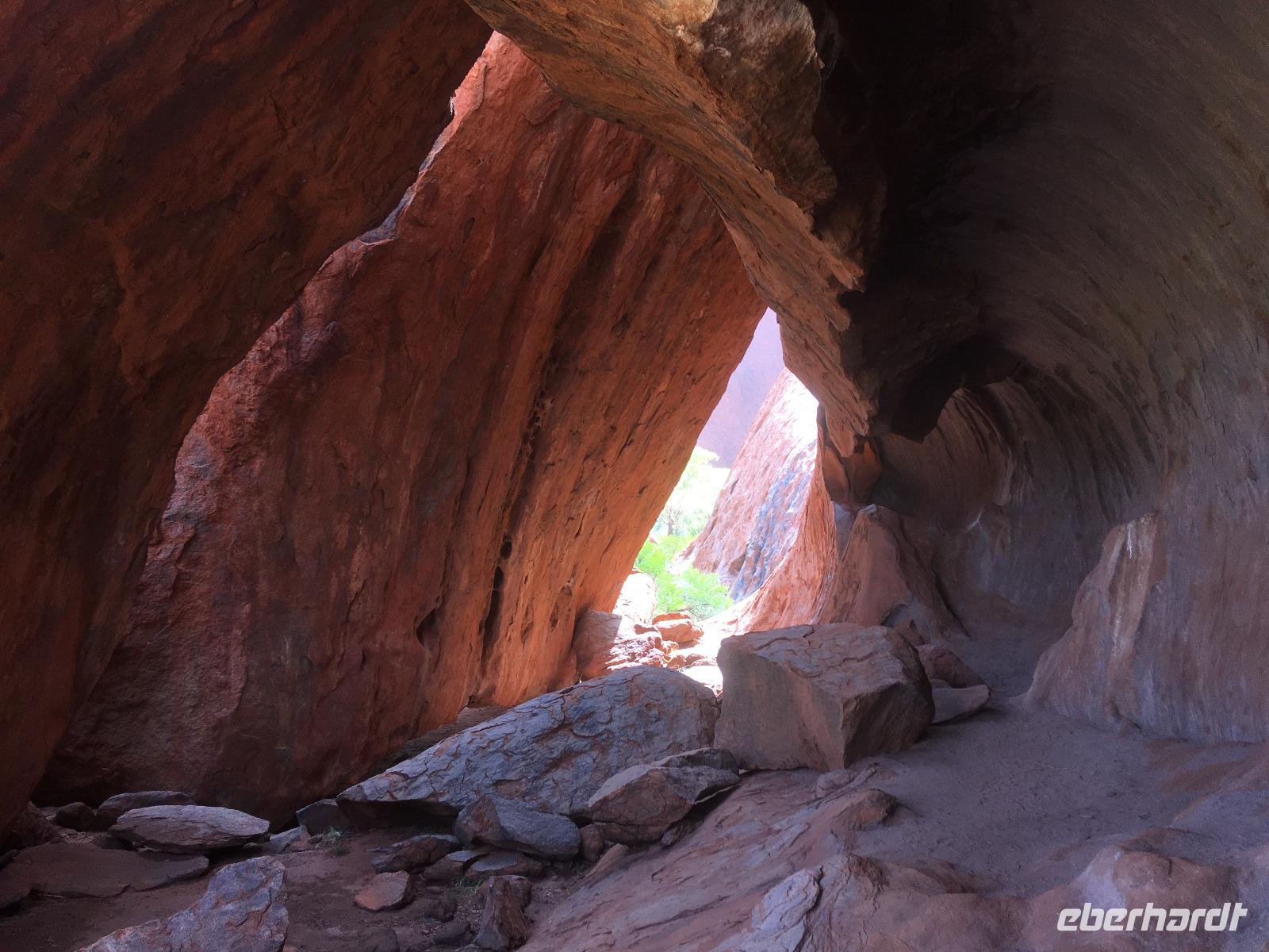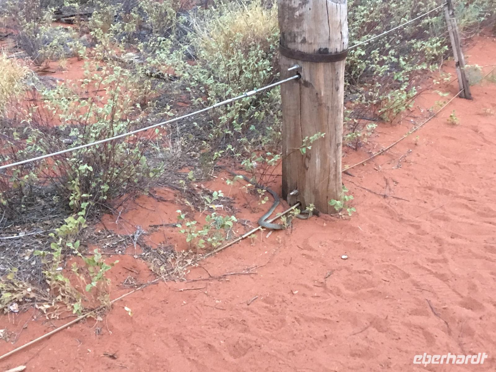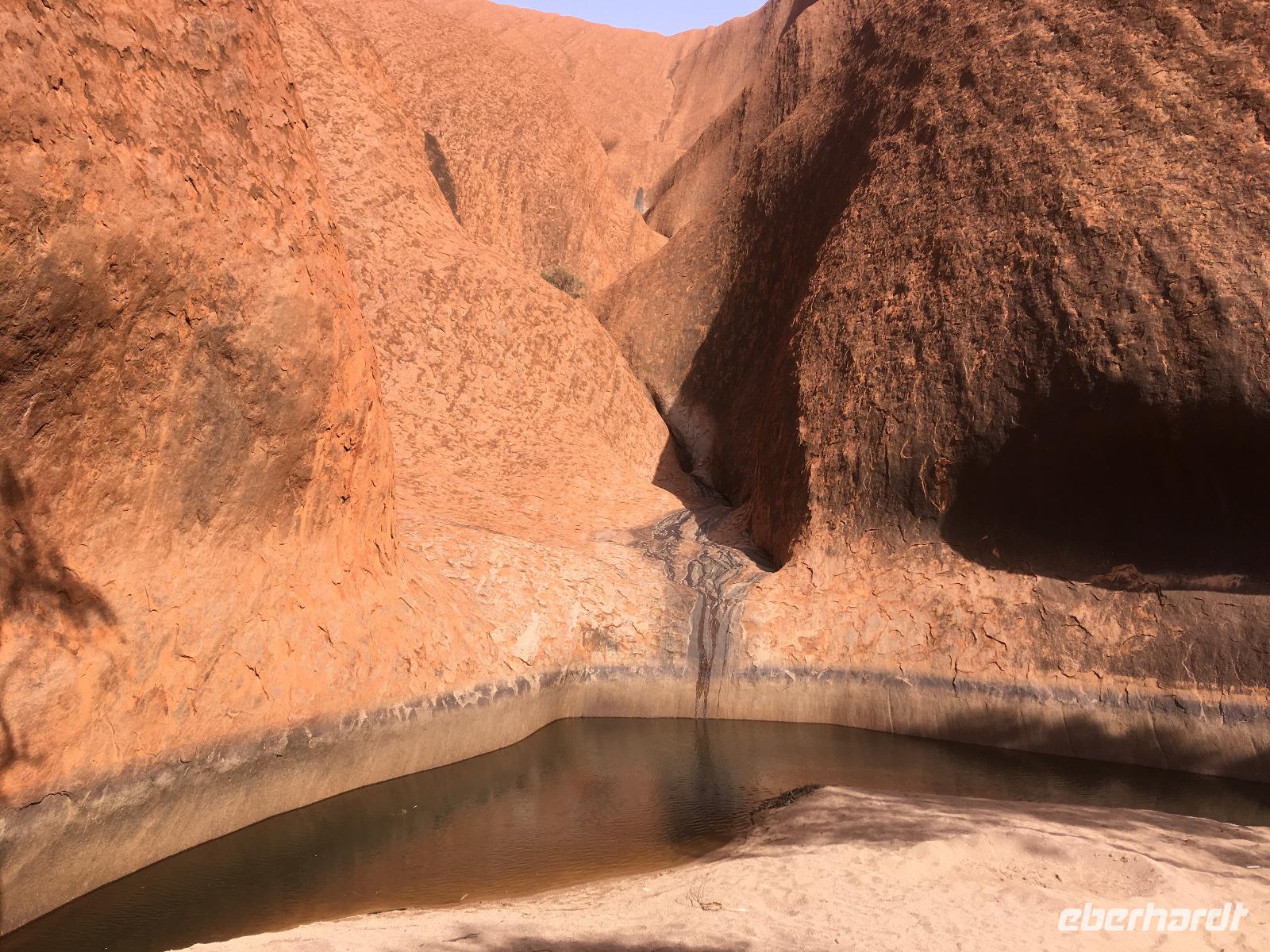 Das Herz des Roten Kontinents wartet heute auf uns - und es ist so ungeduldig, dass es uns gar nicht richtig ausschlafen lässt. Noch im Dunkeln werden wir zum Flughafen von Cairns gebracht, wo wir nach dem Einchecken unsere Frühstückspakete schlachten. Der Flughafen Ayers Rock ist noch übersichtlicher als der von Cairns, und so fällt es uns nicht schwer, unseren neuen örtlichen Reiseleiter Johannes zu finden, der gleichzeitig auch unser Fahrer ist. Wir laden die Koffer in den Anhänger und düsen los in Richtung Uluru-Kata-Tjuta-Nationalpark. Es ist sehr heiß draußen, aber zum Glück hat unser Kleinbus eine Klimaanlage und für Trinkwasser ist auch gesorgt. Am Uluru (Ayers Rock) fahren wir zunächst vorbei, auch wenn uns das bekannteste natürliche Wahrzeichen Australiens selbstverständlich ganz besonders reizt. Stattdessen fahren wir zur Kata Tjuta, den 36 Köpfen, dessen höchster mit 564 m sogar höher als der Uluru ist. Die Formationen Kata Tjuta (Olgas) und Uluru sind zur gleichen Zeit entstanden - vor mehr als 300 Millionen Jahren. Während der Uluru aus feinkörnigem Sandstein besteht, ist es bei den Olgas verkittetes Geröll. Nach einem ersten Panorama-Fotostopp können wir dies anschließend bei einer Wanderung in die Walpa Gorge auch eindeutig erkennen. Leider schmälern die vielen Fliegen und die brennende Sonne das Vergnügen. So flüchten wir nach einer Weile zurück in den Bus und fahren schon jetzt zum Sonnenuntergangs-Aussichtspunkt am Uluru, um ein paar Fotos zu machen. Die Mittagspause verbringen wir im übersichtlichen Zentrum des Resort-Ortes Yulara - Essen und Bier bekommt uns aber vorzüglich. In der Zwischenzeit checkt uns Johannes im Hotel ein und lässt uns die Koffer schon auf unsere Zimmer bringen. Dann holt er uns am Marktplatz ab, und wir können uns bis zum Abend erholen. Mit einem Gläschen Sekt und ein paar Snacks gerüstet, wollen wir später dann den Sonnenuntergang am Uluru genießen. Tatsächlich haben sich aber dunkle Regenwolken am Himmel gebildet, und vom Sonnenuntergang ist nicht so viel zu sehen. Dafür sehen wir aber einen wunderschönen Regenbogen und eine Schlange, die eine Fledermaus verspeist! Beim anschließenden Barbecue (australisch: Barbie) im Hotel können wir uns bei Live-Musik unser Abendessen selbst grillen - wie echte Australier.
