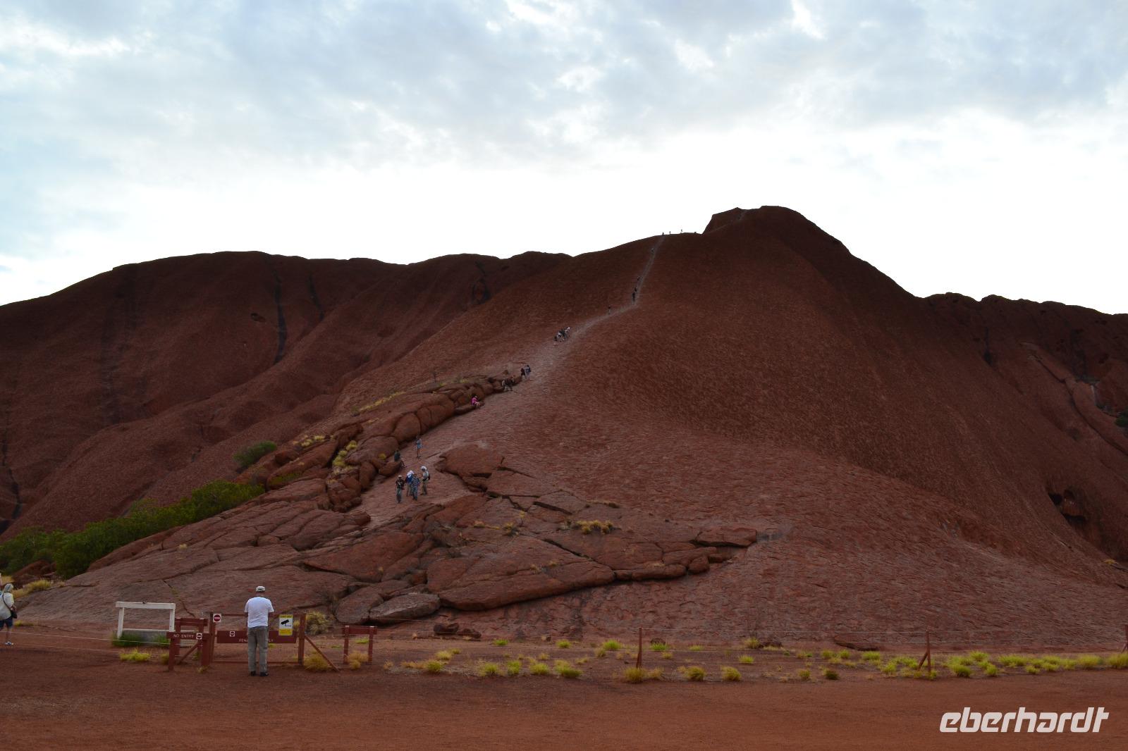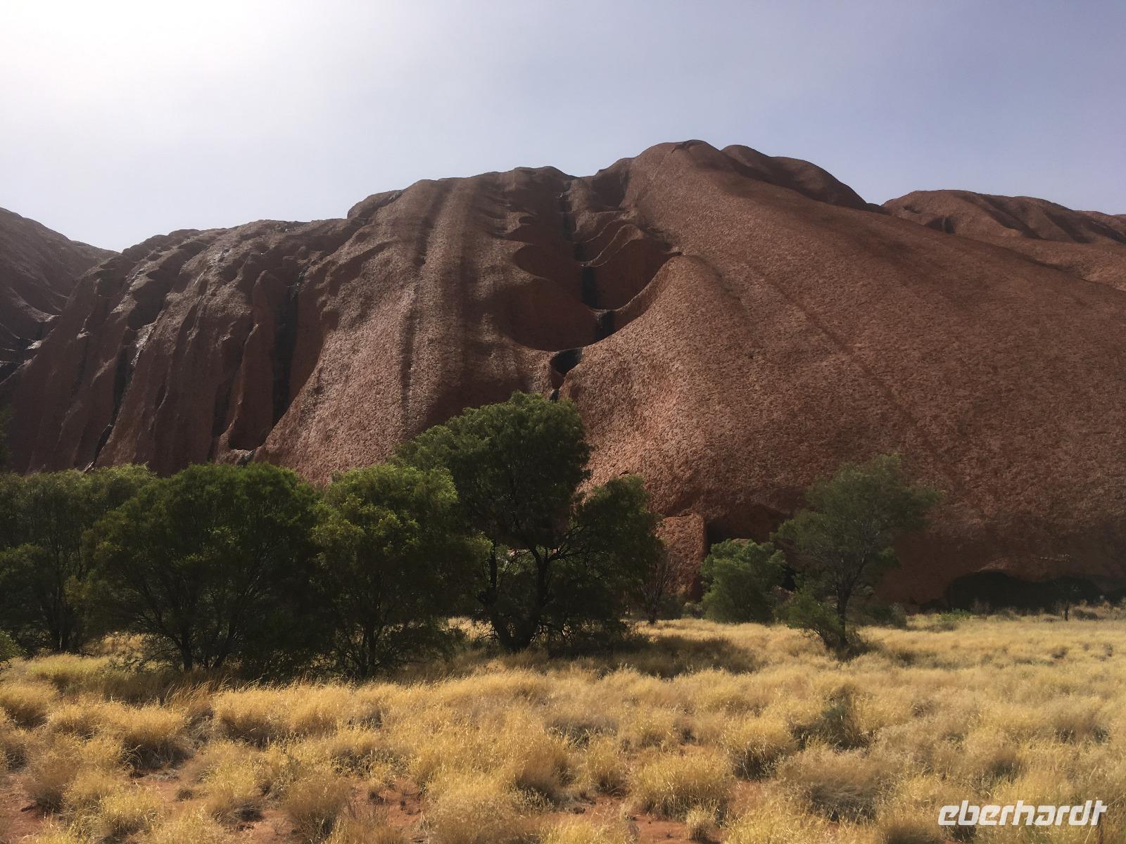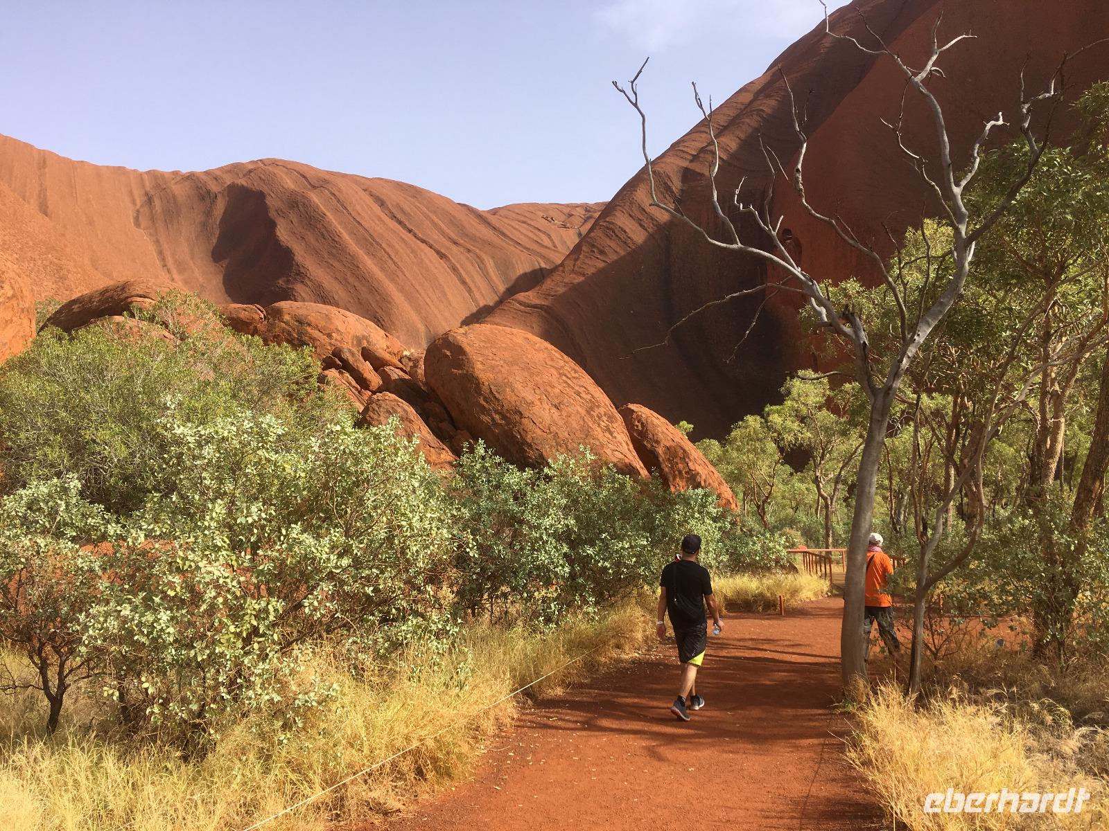 Auch heute müssen wir wieder zeitig aufstehen, doch wir tun es freiwillig, denn wir wollen den Sonnenaufgang am Uluru erleben. Und tatsächlich haben wir mehr Glück als gestern Abend. Die Wolken, die noch am Himmel sind, fliehen vor den Strahlen der aufgehenden Sonne. Irgendwann liegt er dann in seiner ganzen Pracht rot glänzend im Morgenlicht vor uns, der heilige Berg der Ureinwohner. Doch es ist nicht nur der Monolith allein, der für die einmalige Atmosphäre sorgt. Die rostrote Erde, die Vegetation - wir fühlen uns wie auf einem anderen Planeten. Auf dem Weg zum Frühstück halten wir am Fuße des Berges, an der Stelle, wo der Aufstieg beginnt. Noch ist es erlaubt, den Uluru zu besteigen, doch im Oktober 2019 soll damit Schluss sein. Eine gute Konstitution ist Voraussetzung für die Kletterpartie, denn es geht gerade am Anfang sehr steil nach oben. Nun ist es aber wirklich Zeit für das Frühstück, das wir im Besucherzentrum des Nationalparks einnehmen. Anschließend besichtigen wir noch das Museum, das die Geschichte des Nationalparks erzählt und den Kampf der Ureinwohner um ihre Anerkennung nachzeichnet. Auf zwei kleinen Spaziergängen am Fuße des Uluru erkunden wir den 384 m hohen Berg noch etwas näher. Johannes entführt uns mit einer Geschichte in die Traumzeit, den Schöpfungsmythos der Ureinwohner, und zeigt uns uralte Felsmalereien, deren Bedeutung sich uns nur teilweise offenbart - die Aborigines achten sehr darauf, ihre Geheimnisse zu wahren. Und dann geht es schon wieder zum Flughafen und unser kurzer Abstecher in das rote Zentrum Australiens neigt sich dem Ende zu. Bevor wir uns von Johannes verabschieden, der uns trotz der kurzen Zeit ans Herz gewachsen ist, entdecken wir vor dem Terminal einen der Road Trains, große LKWs mit mehreren Anhängern, die im Outback vor allem mit Erz beladen über die Highways düsen. Der Flug nach Sydney verschiebt sich leider, da die Maschine mit zwei Stunden Verspätung aus Sydney eintrifft. Uli und Max, das örtliche Gespann aus Reiseleiterin und Busfahrer, wissen aber Bescheid und warten geduldig auf unser Eintreffen. Unser Hotel in der Innenstadt der größten australischen Metropole erreichen wir aber dennoch rechtzeitig, um am Abend noch das wöchentliche Feuerwerk über dem Darling Harbour zu sehen. Ein schöner Einstand für unseren Besuch in einer der schönsten Städte der Welt.