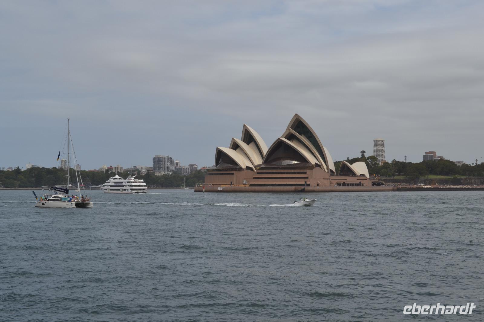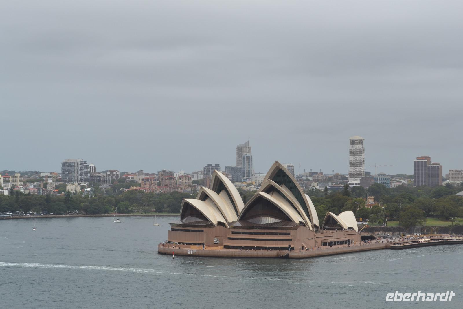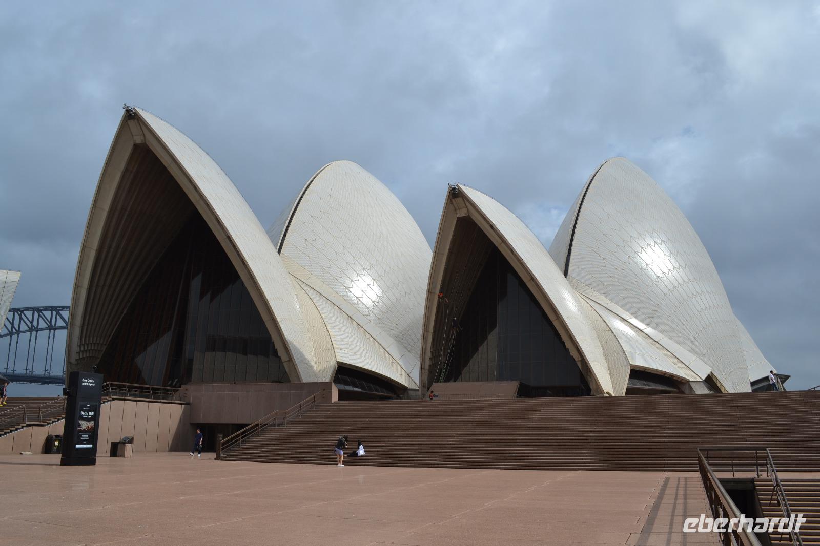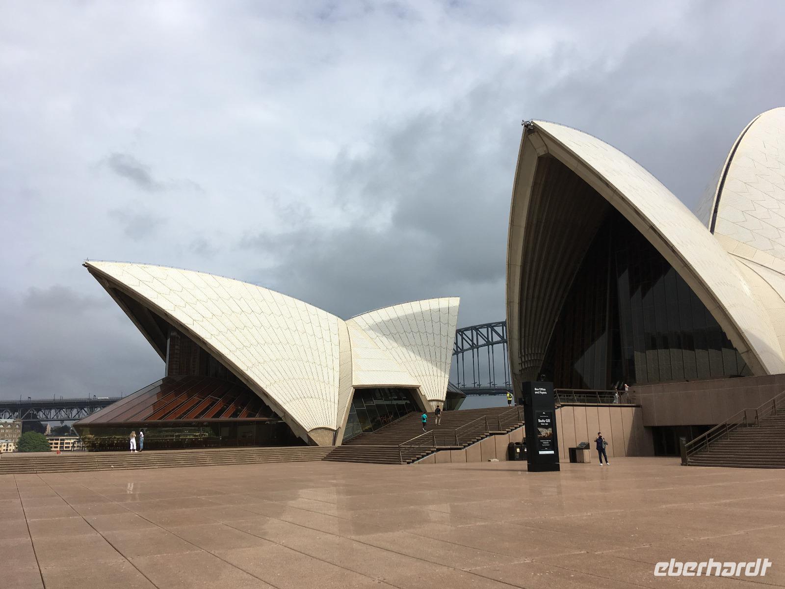 Im Morgengrauen legt die Sun Princess wieder am Überseeterminal in Sydney an. Als wir von Bord gehen und unser Gepäck an unseren Busfahrer Max übergeben, der uns am Terminal trifft, überkommt uns ein Gefühl der Wehmut und der Wunsch, doch noch etwas weiterzureisen. Neuseeland, das nächste Ziel unseres Schiffes? Oder noch ein paar Tage Tasmanien? Oder nach Melbourne! Nur nach Hause, nach Deutschland will niemand so richtig (freiwillig). Immerhin bleiben uns noch drei Stunden in der größten Stadt Australiens, bevor wir zum Flughafen müssen. Wir nutzen die Zeit, um uns das Opernhaus aus der Nähe anzuschauen. Das imposante Bauwerk, ein Entwurf des dänischen Architekten Jørn Utzon, ist mit über 1,1 Millionen Keramikfliesen verkleidet, die im Glanz der Sonne wie Spiegel zu glänzen scheinen. Das Innere mag einige Besucher enttäuschen, denn es ist viel nackter Beton zu sehen. Im Jahr 1957 war der markante Entwurf jedoch geradezu revolutionär. Auf dem Weg zum Treffpunkt betrachten und fotografieren wir die Skulpturen, die anlässlich des Chinesischen Neujahrsfestes rund um den Circular Quay aufgebaut sind. Mit einem Spaziergang durch The Rocks, das älteste Stadtviertel, erreichen wir dann die Bushaltestelle unterhalb der Harbour Bridge, an der unser Busfahrer Max schon auf uns wartet.