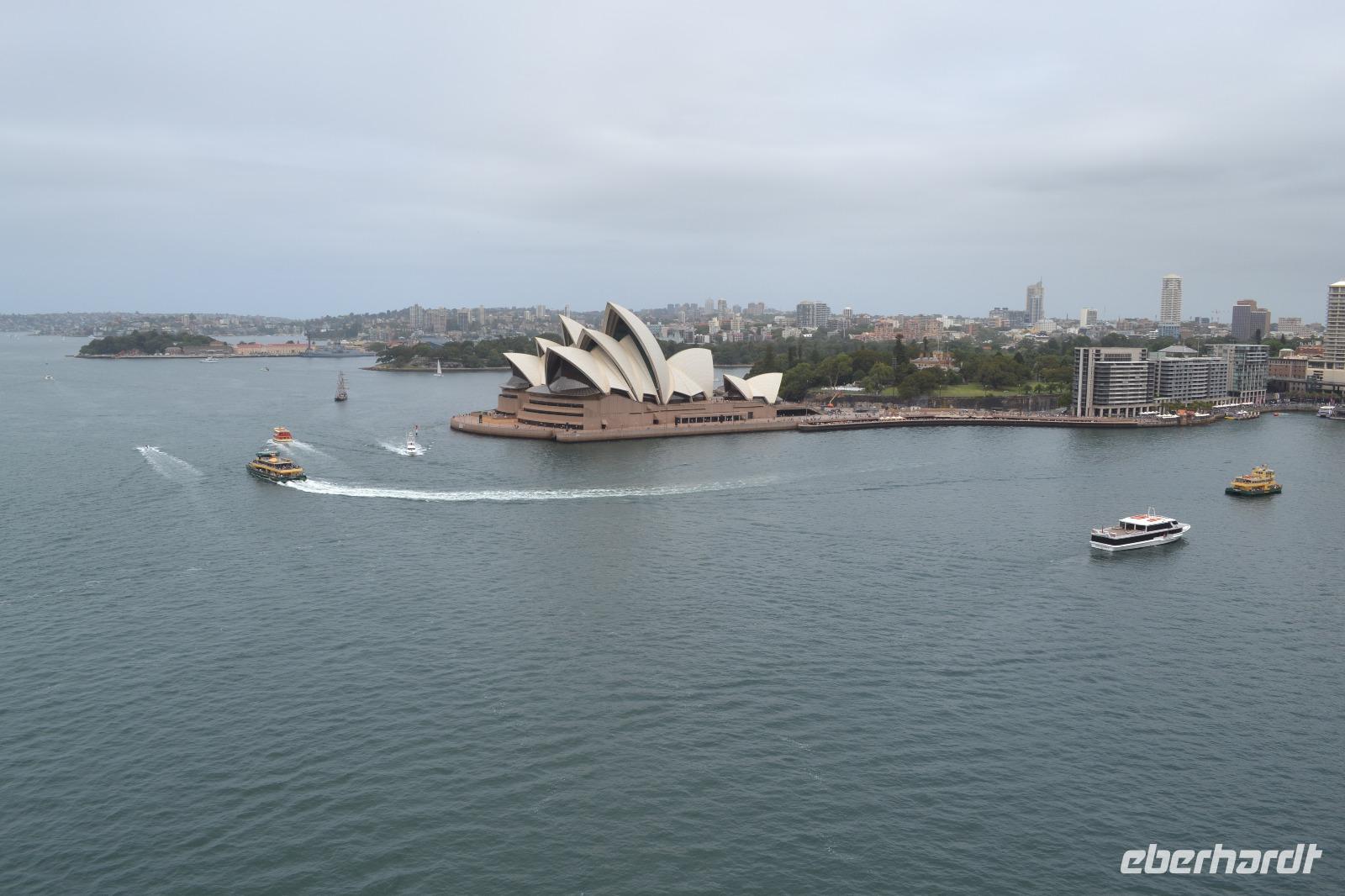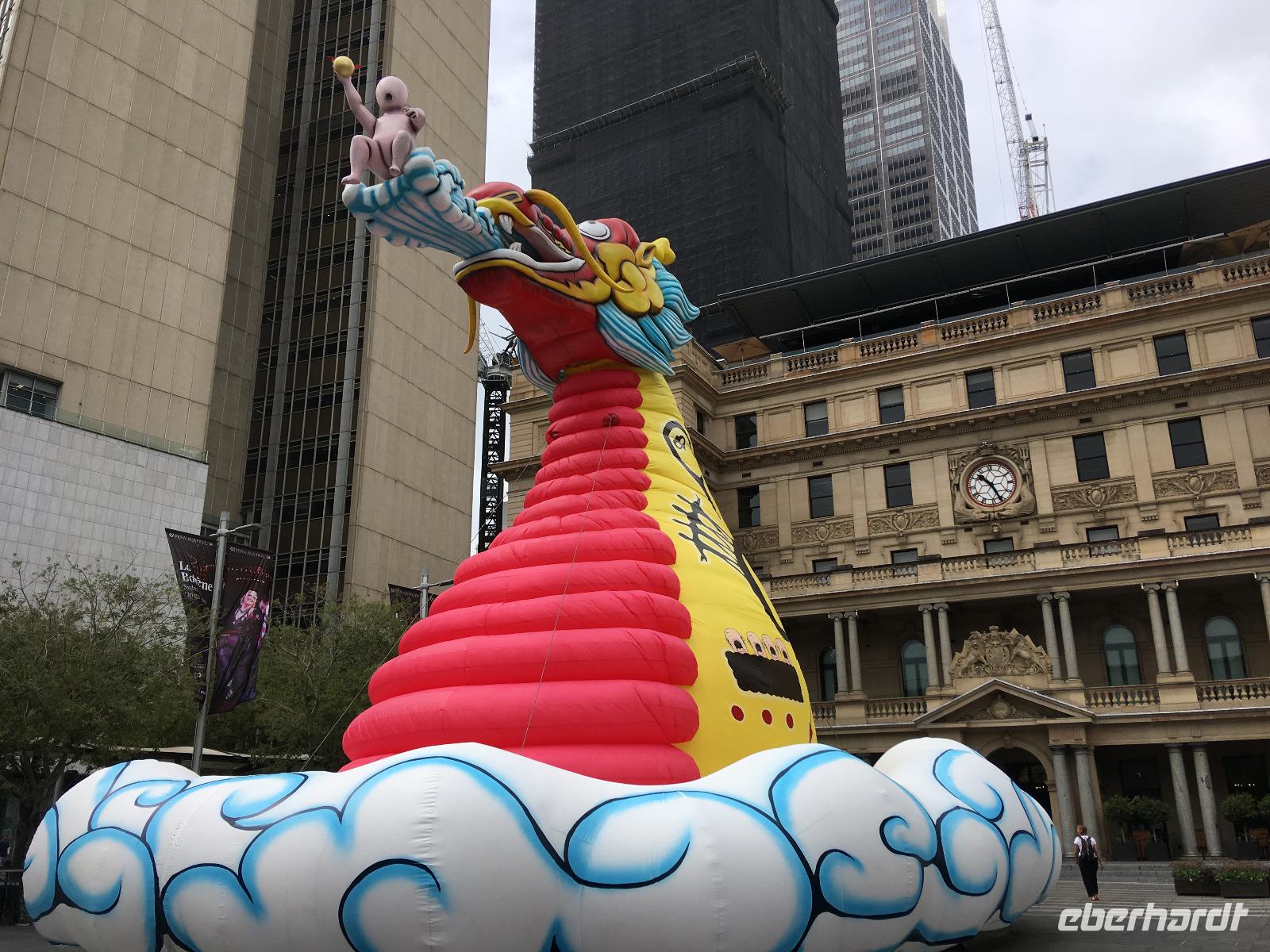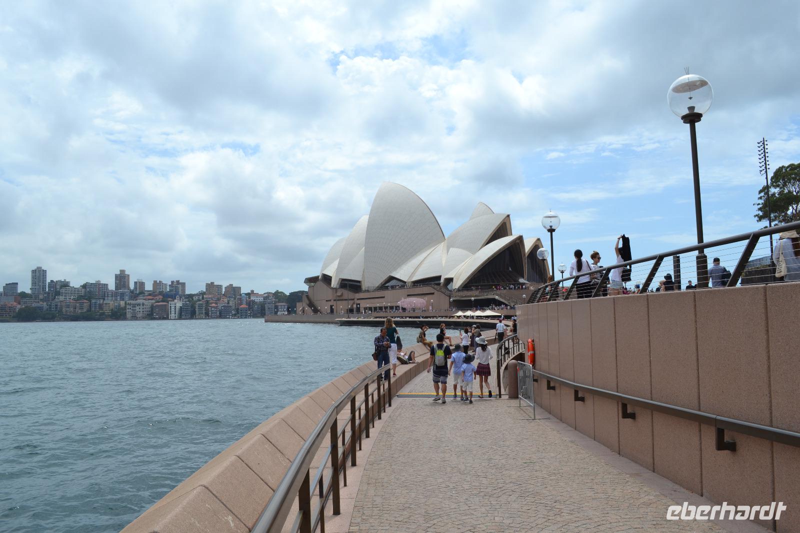 Im Morgengrauen legt die Sun Princess wieder am Überseeterminal in Sydney an. Als wir von Bord gehen und unser Gepäck an unseren Busfahrer Max übergeben, der uns am Terminal trifft, überkommt uns ein Gefühl der Wehmut und der Wunsch, doch noch etwas weiterzureisen. Neuseeland, das nächste Ziel unseres Schiffes? Oder noch ein paar Tage Tasmanien? Oder nach Melbourne! Nur nach Hause, nach Deutschland will niemand so richtig (freiwillig). Immerhin bleiben uns noch drei Stunden in der größten Stadt Australiens, bevor wir zum Flughafen müssen. Wir nutzen die Zeit, um uns das Opernhaus aus der Nähe anzuschauen. Das imposante Bauwerk, ein Entwurf des dänischen Architekten Jørn Utzon, ist mit über 1,1 Millionen Keramikfliesen verkleidet, die im Glanz der Sonne wie Spiegel zu glänzen scheinen. Das Innere mag einige Besucher enttäuschen, denn es ist viel nackter Beton zu sehen. Im Jahr 1957 war der markante Entwurf jedoch geradezu revolutionär. Auf dem Weg zum Treffpunkt betrachten und fotografieren wir die Skulpturen, die anlässlich des Chinesischen Neujahrsfestes rund um den Circular Quay aufgebaut sind. Mit einem Spaziergang durch The Rocks, das älteste Stadtviertel, erreichen wir dann die Bushaltestelle unterhalb der Harbour Bridge, an der unser Busfahrer Max schon auf uns wartet.