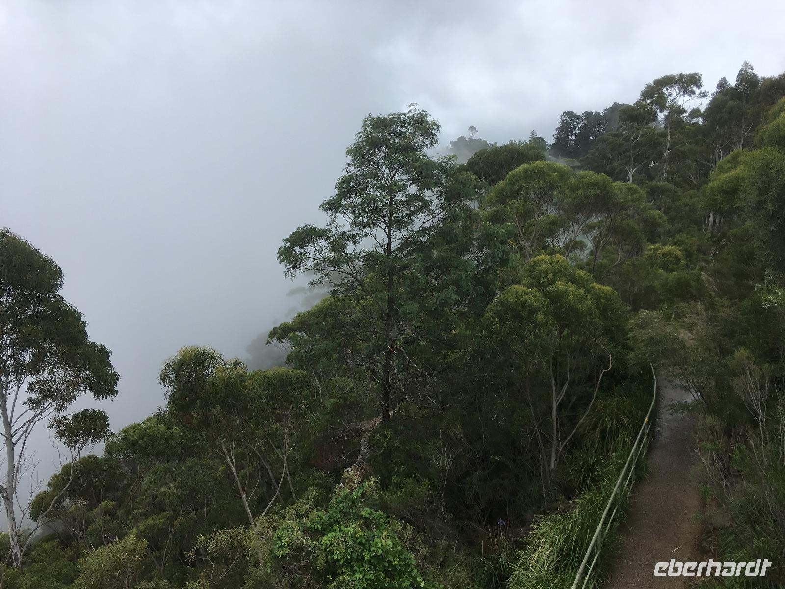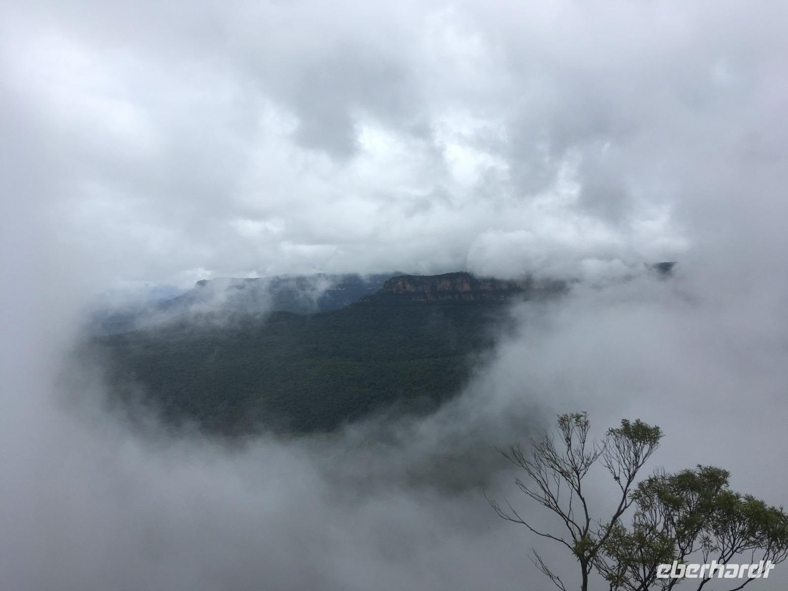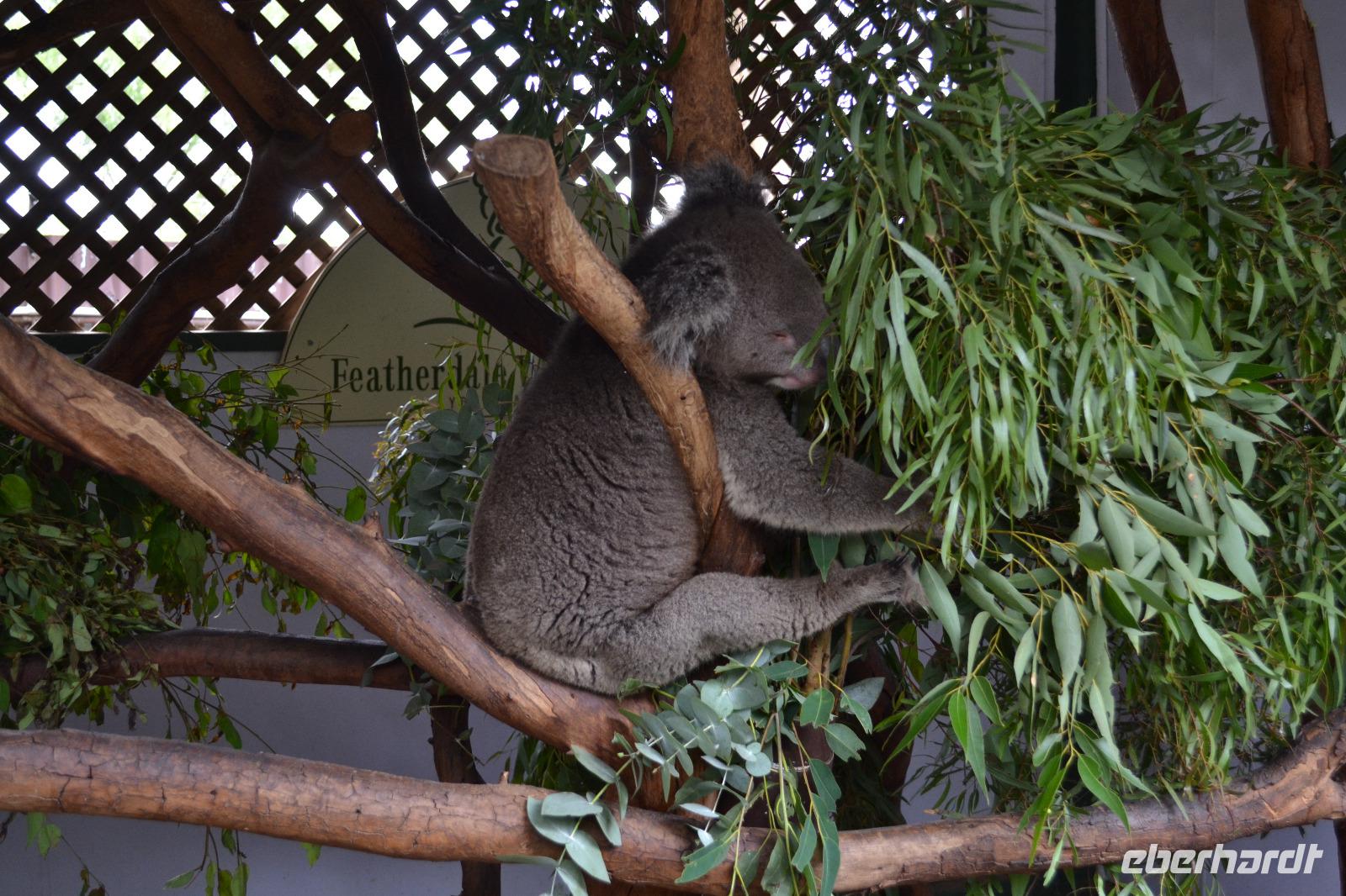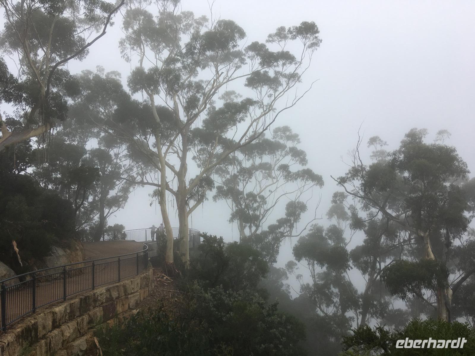 Auch beim heutigen Ausflug in die Blue Mountains sind alle mit dabei. Der Name kommt von den Öldämpfen über den ausgedehnten Eukalyptuswäldern, die den Bergen im Licht der Sonne einen blauen Glanz verleihen. Da der Wettergott uns am Morgen nicht ganz so wohlgesonnen ist, stellen wir spontan unser Programm ein bisschen um und halten zuerst im Örtchen Leura, der Perle der Blue Mountains. Hier entdecke ich in der kleinen Einkaufsstraße eine Schokoladenmanufaktur, und als mich beim Eintreten der herrliche Duft überrollt, bin ich im siebten Schokoladenhimmel. Nun stehen eigentlich die Drei Schwestern auf dem Programm, die markanteste Felsformation der Blue Mountains. Wir sehen nur leider - nichts. Die scheuen Damen verstecken sich hinter dicken Nebelschwaden. Auch ein Spaziergang durch den Eukalyptuswald hinter die Felsformation kann da nur teilweise Abhilfe schaffen. Aber vielleicht wird es ja doch noch besser, das Wetter? Gehen wir doch erstmal zum Mittagessen in den Wentworth Falls Country Club. Es übertrifft sogar noch unsere Erwartungen. Wir möchten am liebsten alles aufessen, so lecker ist es, doch irgendwann passt einfach nichts mehr rein. Doch nicht nur beim Mittagessen ist uns das Glück hold, auch der Nebel reißt jetzt tatsächlich noch auf und eröffnet uns DEN Postkartenblick schlechthin auf die Blue Mountains und auch die Drei Schwestern. Deren Geschichte erzählt uns Uli nach einer kurzen Wanderung auf der Fahrt zum Featherdale Wildlife Park. Im Wildpark können wir die australische Tierwelt bestaunen, die so ganz anders ist, als auf allen anderen Kontinenten. Die Dingos, die australischen Wildhunde, fallen noch am wenigsten aus der Reihe, doch Wombat, Tasmanischer Teufel, Schnabeltier und Känguru sind schon sehr außergewöhnliche Tiere. Und kennen Sie den Echidna, den australischen Ameisenigel? Natürlich darf auch der Koala in der Auflistung nicht fehlen, das berühmteste australische Tier, das jeder so gern streicheln will. Und ja, wir können uns hier auch mit einem Koala fotografieren lassen. Ein schöner Abschluss unseres heutigen Ausflugs, mit dem auch der Abschied von Uli näher rückt, die uns nicht nur viele Informationen über Sydney und auch Australien vermittelt, sondern auch an ihrer persönlichen Auswanderungsgeschichte teilnehmen lassen hat. Das Eberhardt-Vorprogramm ist damit beendet, was wir abends zusammen auf dem Sydney Tower feiern und uns mit vielen Köstlichkeiten vom Schlemmer-Buffet (schon wieder) den Bauch vollschlagen, bis nichts mehr reinpasst. Wer weiß schließlich, ob es auf dem Kreuzfahrtschiff etwas zu essen gibt. Dann erleben wir gegen Ende unseres Aufenthalts noch einen wunderschönen Sonnenuntergang über Sydney, der unserer Reise zu den Highlights von Australien ein würdiges Ende bereitet.