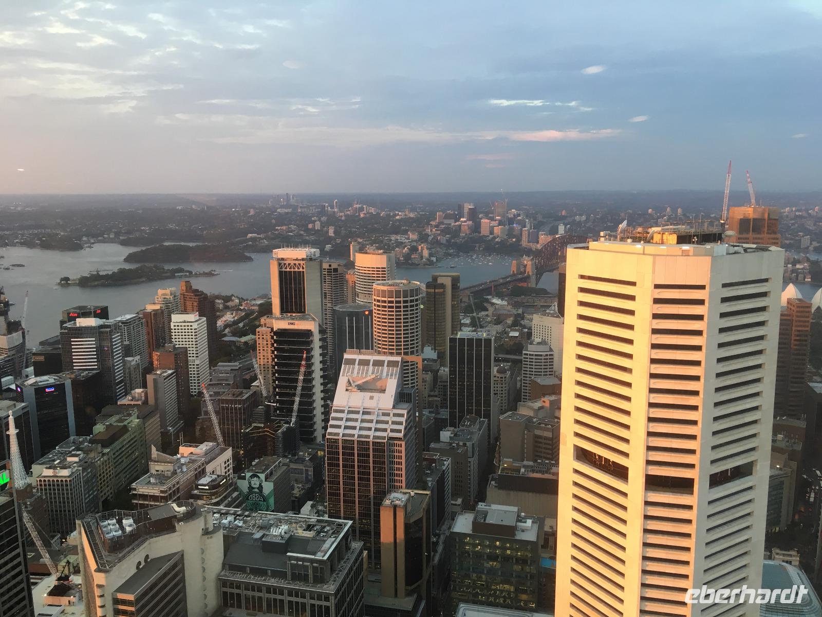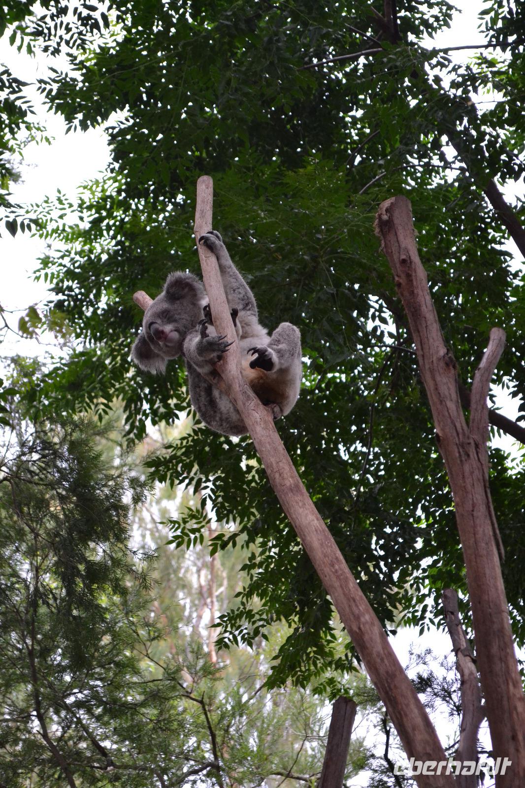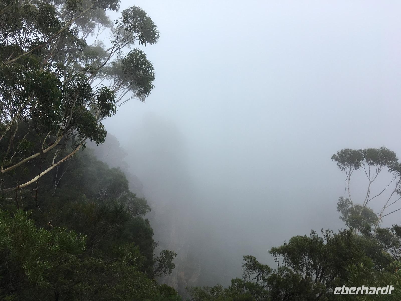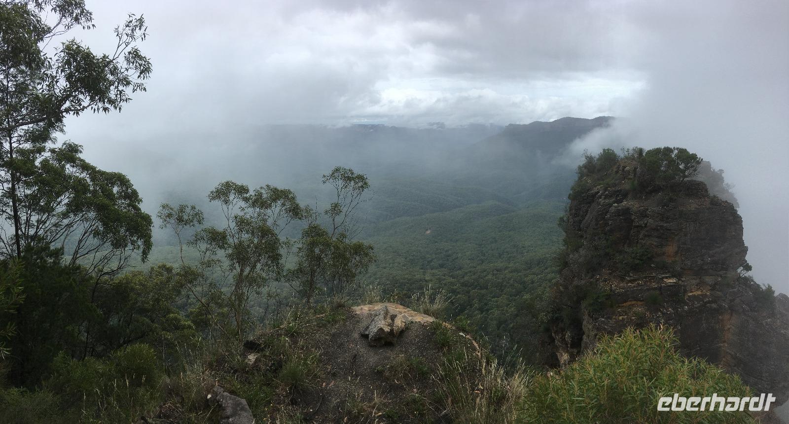 Auch beim heutigen Ausflug in die Blue Mountains sind alle mit dabei. Der Name kommt von den Öldämpfen über den ausgedehnten Eukalyptuswäldern, die den Bergen im Licht der Sonne einen blauen Glanz verleihen. Da der Wettergott uns am Morgen nicht ganz so wohlgesonnen ist, stellen wir spontan unser Programm ein bisschen um und halten zuerst im Örtchen Leura, der Perle der Blue Mountains. Hier entdecke ich in der kleinen Einkaufsstraße eine Schokoladenmanufaktur, und als mich beim Eintreten der herrliche Duft überrollt, bin ich im siebten Schokoladenhimmel. Nun stehen eigentlich die Drei Schwestern auf dem Programm, die markanteste Felsformation der Blue Mountains. Wir sehen nur leider - nichts. Die scheuen Damen verstecken sich hinter dicken Nebelschwaden. Auch ein Spaziergang durch den Eukalyptuswald hinter die Felsformation kann da nur teilweise Abhilfe schaffen. Aber vielleicht wird es ja doch noch besser, das Wetter? Gehen wir doch erstmal zum Mittagessen in den Wentworth Falls Country Club. Es übertrifft sogar noch unsere Erwartungen. Wir möchten am liebsten alles aufessen, so lecker ist es, doch irgendwann passt einfach nichts mehr rein. Doch nicht nur beim Mittagessen ist uns das Glück hold, auch der Nebel reißt jetzt tatsächlich noch auf und eröffnet uns DEN Postkartenblick schlechthin auf die Blue Mountains und auch die Drei Schwestern. Deren Geschichte erzählt uns Uli nach einer kurzen Wanderung auf der Fahrt zum Featherdale Wildlife Park. Im Wildpark können wir die australische Tierwelt bestaunen, die so ganz anders ist, als auf allen anderen Kontinenten. Die Dingos, die australischen Wildhunde, fallen noch am wenigsten aus der Reihe, doch Wombat, Tasmanischer Teufel, Schnabeltier und Känguru sind schon sehr außergewöhnliche Tiere. Und kennen Sie den Echidna, den australischen Ameisenigel? Natürlich darf auch der Koala in der Auflistung nicht fehlen, das berühmteste australische Tier, das jeder so gern streicheln will. Und ja, wir können uns hier auch mit einem Koala fotografieren lassen. Ein schöner Abschluss unseres heutigen Ausflugs, mit dem auch der Abschied von Uli näher rückt, die uns nicht nur viele Informationen über Sydney und auch Australien vermittelt, sondern auch an ihrer persönlichen Auswanderungsgeschichte teilnehmen lassen hat. Das Eberhardt-Vorprogramm ist damit beendet, was wir abends zusammen auf dem Sydney Tower feiern und uns mit vielen Köstlichkeiten vom Schlemmer-Buffet (schon wieder) den Bauch vollschlagen, bis nichts mehr reinpasst. Wer weiß schließlich, ob es auf dem Kreuzfahrtschiff etwas zu essen gibt. Dann erleben wir gegen Ende unseres Aufenthalts noch einen wunderschönen Sonnenuntergang über Sydney, der unserer Reise zu den Highlights von Australien ein würdiges Ende bereitet.