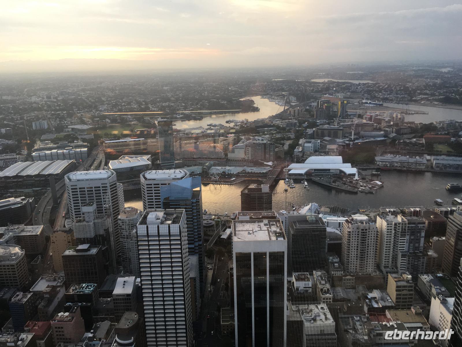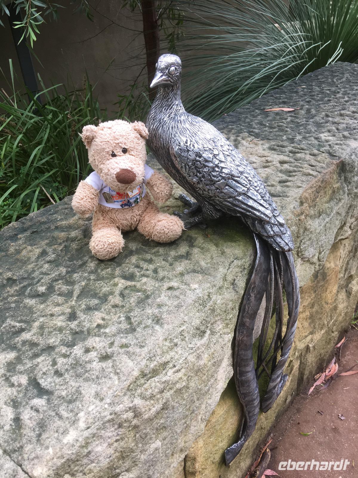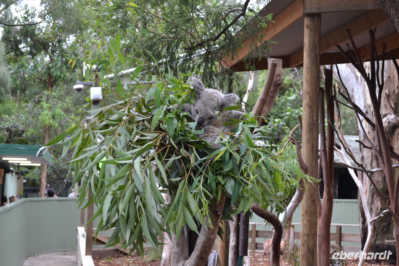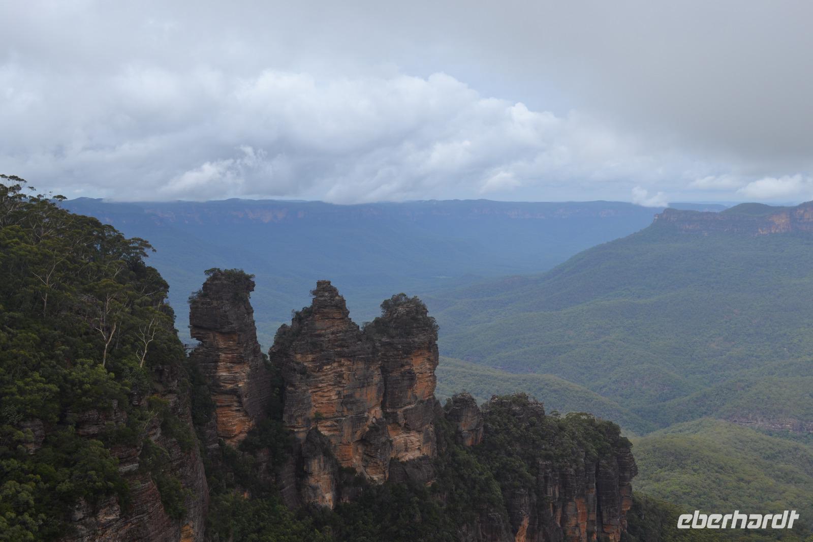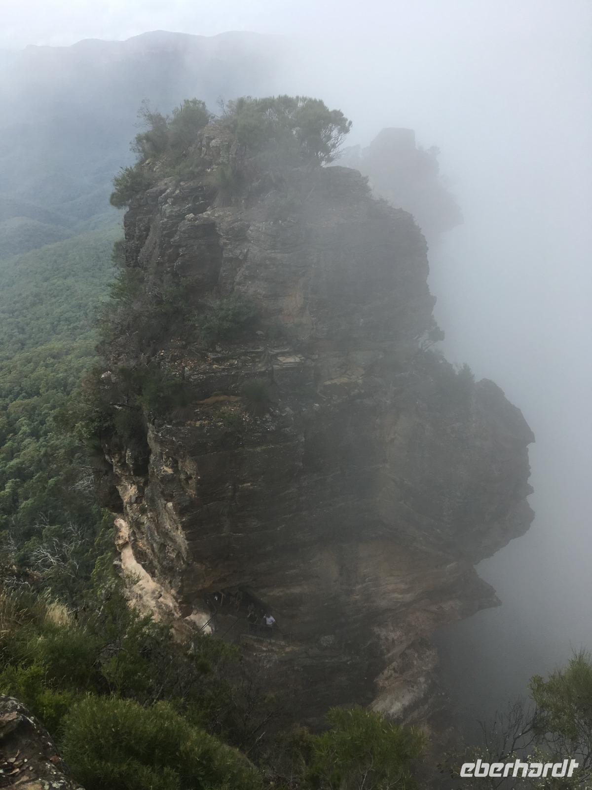 Auch beim heutigen Ausflug in die Blue Mountains sind alle mit dabei. Der Name kommt von den Öldämpfen über den ausgedehnten Eukalyptuswäldern, die den Bergen im Licht der Sonne einen blauen Glanz verleihen. Da der Wettergott uns am Morgen nicht ganz so wohlgesonnen ist, stellen wir spontan unser Programm ein bisschen um und halten zuerst im Örtchen Leura, der Perle der Blue Mountains. Hier entdecke ich in der kleinen Einkaufsstraße eine Schokoladenmanufaktur, und als mich beim Eintreten der herrliche Duft überrollt, bin ich im siebten Schokoladenhimmel. Nun stehen eigentlich die Drei Schwestern auf dem Programm, die markanteste Felsformation der Blue Mountains. Wir sehen nur leider - nichts. Die scheuen Damen verstecken sich hinter dicken Nebelschwaden. Auch ein Spaziergang durch den Eukalyptuswald hinter die Felsformation kann da nur teilweise Abhilfe schaffen. Aber vielleicht wird es ja doch noch besser, das Wetter? Gehen wir doch erstmal zum Mittagessen in den Wentworth Falls Country Club. Es übertrifft sogar noch unsere Erwartungen. Wir möchten am liebsten alles aufessen, so lecker ist es, doch irgendwann passt einfach nichts mehr rein. Doch nicht nur beim Mittagessen ist uns das Glück hold, auch der Nebel reißt jetzt tatsächlich noch auf und eröffnet uns DEN Postkartenblick schlechthin auf die Blue Mountains und auch die Drei Schwestern. Deren Geschichte erzählt uns Uli nach einer kurzen Wanderung auf der Fahrt zum Featherdale Wildlife Park. Im Wildpark können wir die australische Tierwelt bestaunen, die so ganz anders ist, als auf allen anderen Kontinenten. Die Dingos, die australischen Wildhunde, fallen noch am wenigsten aus der Reihe, doch Wombat, Tasmanischer Teufel, Schnabeltier und Känguru sind schon sehr außergewöhnliche Tiere. Und kennen Sie den Echidna, den australischen Ameisenigel? Natürlich darf auch der Koala in der Auflistung nicht fehlen, das berühmteste australische Tier, das jeder so gern streicheln will. Und ja, wir können uns hier auch mit einem Koala fotografieren lassen. Ein schöner Abschluss unseres heutigen Ausflugs, mit dem auch der Abschied von Uli näher rückt, die uns nicht nur viele Informationen über Sydney und auch Australien vermittelt, sondern auch an ihrer persönlichen Auswanderungsgeschichte teilnehmen lassen hat. Das Eberhardt-Vorprogramm ist damit beendet, was wir abends zusammen auf dem Sydney Tower feiern und uns mit vielen Köstlichkeiten vom Schlemmer-Buffet (schon wieder) den Bauch vollschlagen, bis nichts mehr reinpasst. Wer weiß schließlich, ob es auf dem Kreuzfahrtschiff etwas zu essen gibt. Dann erleben wir gegen Ende unseres Aufenthalts noch einen wunderschönen Sonnenuntergang über Sydney, der unserer Reise zu den Highlights von Australien ein würdiges Ende bereitet.