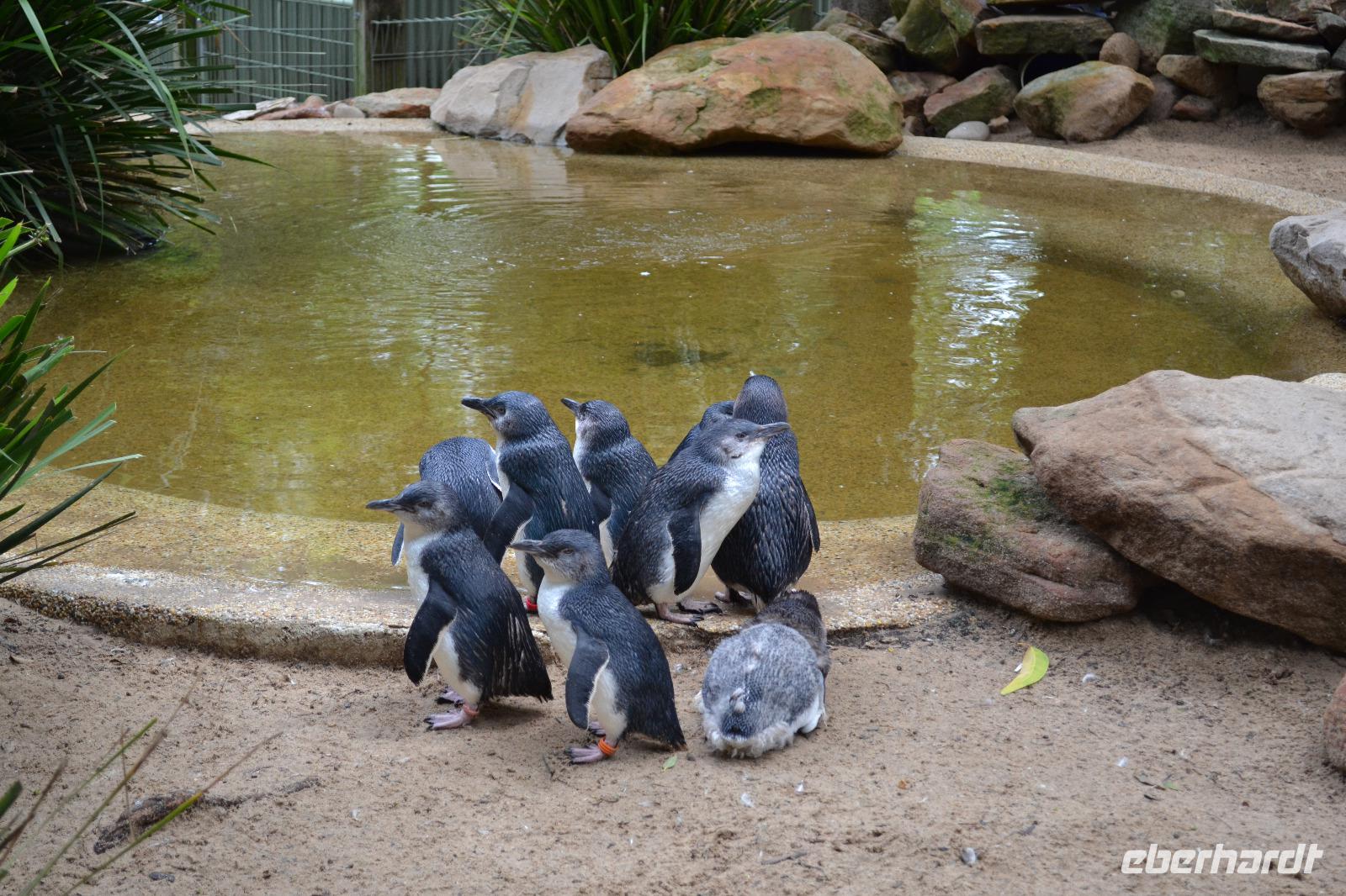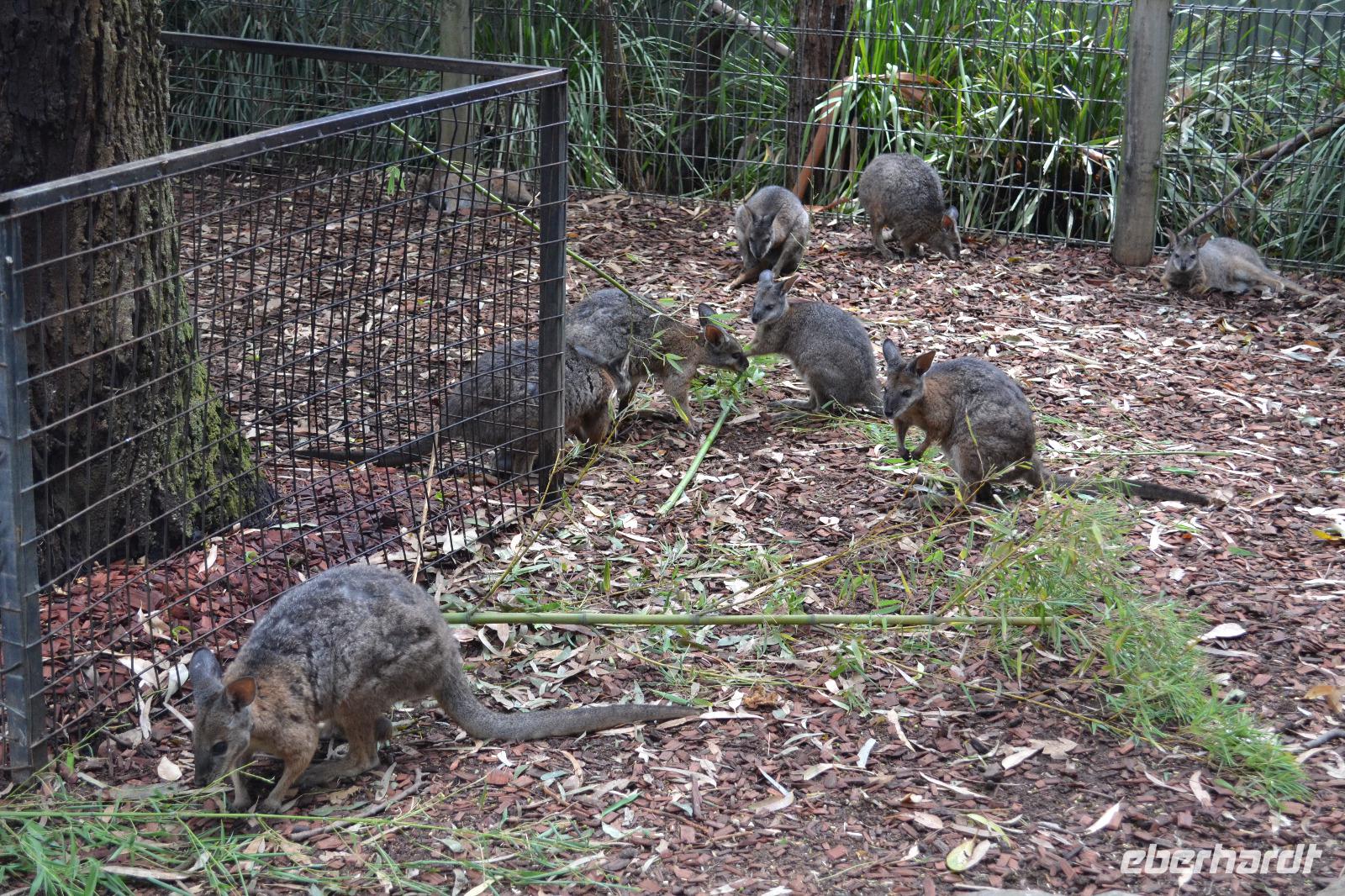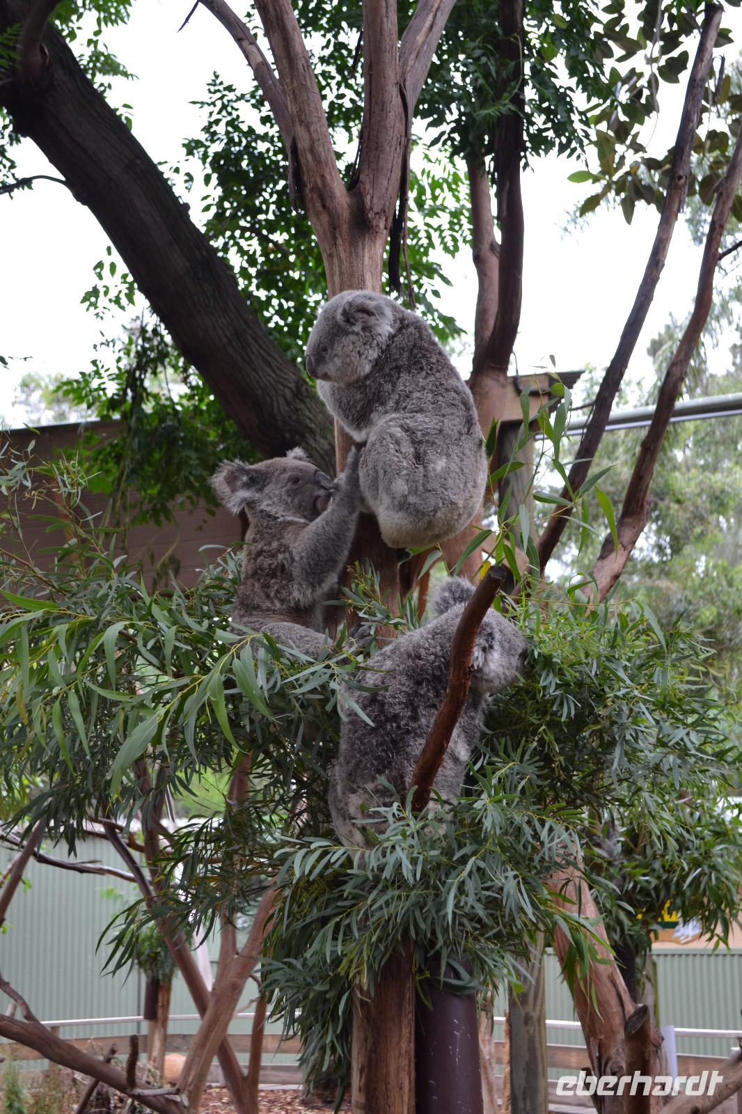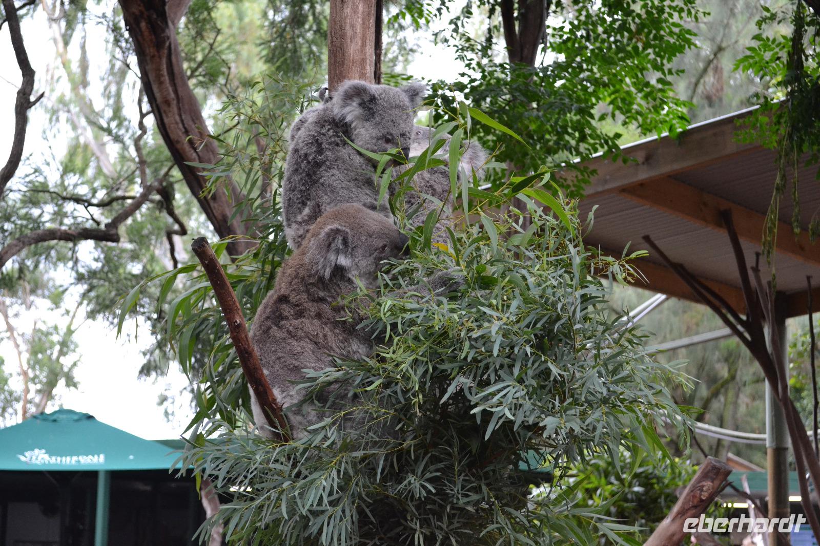 Auch beim heutigen Ausflug in die Blue Mountains sind alle mit dabei. Der Name kommt von den Öldämpfen über den ausgedehnten Eukalyptuswäldern, die den Bergen im Licht der Sonne einen blauen Glanz verleihen. Da der Wettergott uns am Morgen nicht ganz so wohlgesonnen ist, stellen wir spontan unser Programm ein bisschen um und halten zuerst im Örtchen Leura, der Perle der Blue Mountains. Hier entdecke ich in der kleinen Einkaufsstraße eine Schokoladenmanufaktur, und als mich beim Eintreten der herrliche Duft überrollt, bin ich im siebten Schokoladenhimmel. Nun stehen eigentlich die Drei Schwestern auf dem Programm, die markanteste Felsformation der Blue Mountains. Wir sehen nur leider - nichts. Die scheuen Damen verstecken sich hinter dicken Nebelschwaden. Auch ein Spaziergang durch den Eukalyptuswald hinter die Felsformation kann da nur teilweise Abhilfe schaffen. Aber vielleicht wird es ja doch noch besser, das Wetter? Gehen wir doch erstmal zum Mittagessen in den Wentworth Falls Country Club. Es übertrifft sogar noch unsere Erwartungen. Wir möchten am liebsten alles aufessen, so lecker ist es, doch irgendwann passt einfach nichts mehr rein. Doch nicht nur beim Mittagessen ist uns das Glück hold, auch der Nebel reißt jetzt tatsächlich noch auf und eröffnet uns DEN Postkartenblick schlechthin auf die Blue Mountains und auch die Drei Schwestern. Deren Geschichte erzählt uns Uli nach einer kurzen Wanderung auf der Fahrt zum Featherdale Wildlife Park. Im Wildpark können wir die australische Tierwelt bestaunen, die so ganz anders ist, als auf allen anderen Kontinenten. Die Dingos, die australischen Wildhunde, fallen noch am wenigsten aus der Reihe, doch Wombat, Tasmanischer Teufel, Schnabeltier und Känguru sind schon sehr außergewöhnliche Tiere. Und kennen Sie den Echidna, den australischen Ameisenigel? Natürlich darf auch der Koala in der Auflistung nicht fehlen, das berühmteste australische Tier, das jeder so gern streicheln will. Und ja, wir können uns hier auch mit einem Koala fotografieren lassen. Ein schöner Abschluss unseres heutigen Ausflugs, mit dem auch der Abschied von Uli näher rückt, die uns nicht nur viele Informationen über Sydney und auch Australien vermittelt, sondern auch an ihrer persönlichen Auswanderungsgeschichte teilnehmen lassen hat. Das Eberhardt-Vorprogramm ist damit beendet, was wir abends zusammen auf dem Sydney Tower feiern und uns mit vielen Köstlichkeiten vom Schlemmer-Buffet (schon wieder) den Bauch vollschlagen, bis nichts mehr reinpasst. Wer weiß schließlich, ob es auf dem Kreuzfahrtschiff etwas zu essen gibt. Dann erleben wir gegen Ende unseres Aufenthalts noch einen wunderschönen Sonnenuntergang über Sydney, der unserer Reise zu den Highlights von Australien ein würdiges Ende bereitet.