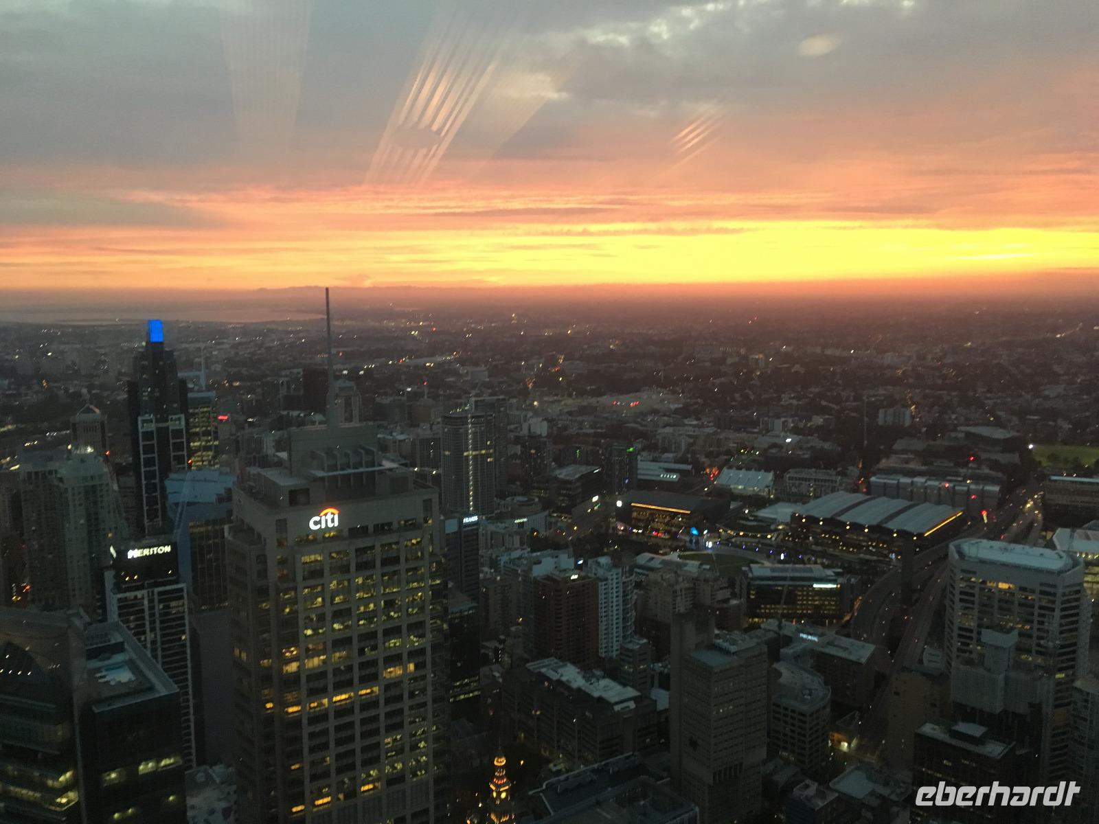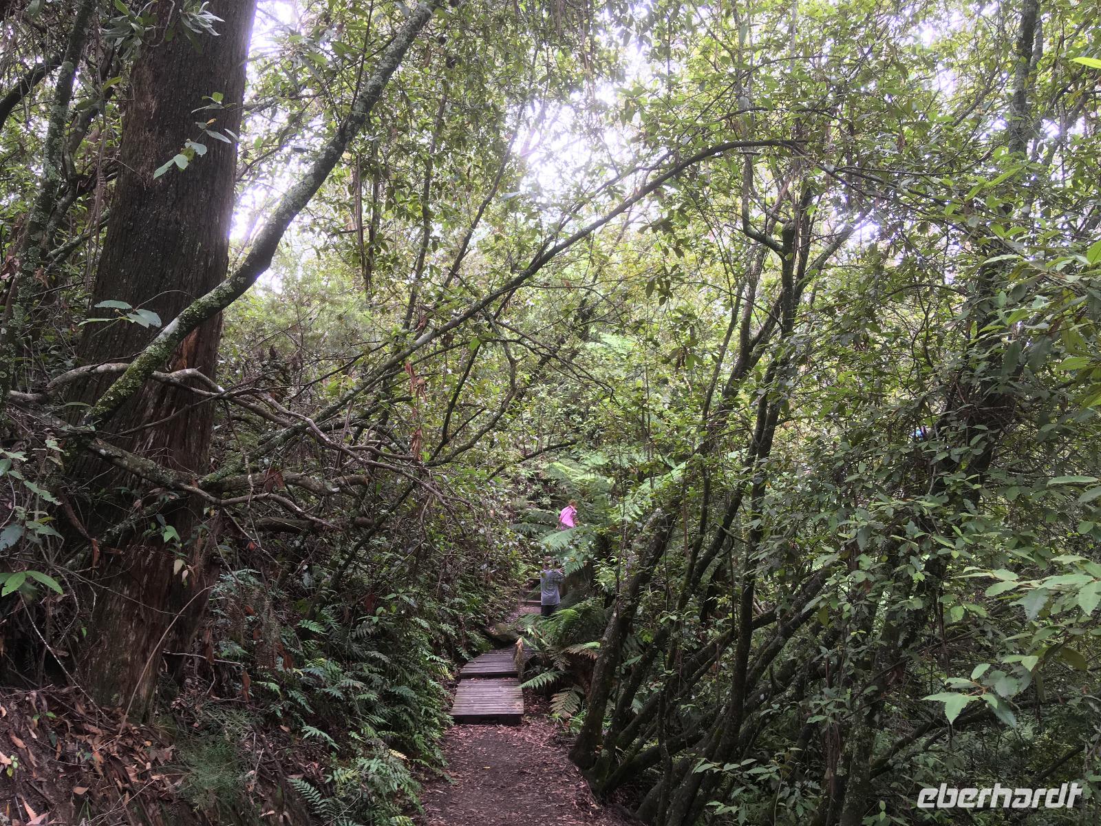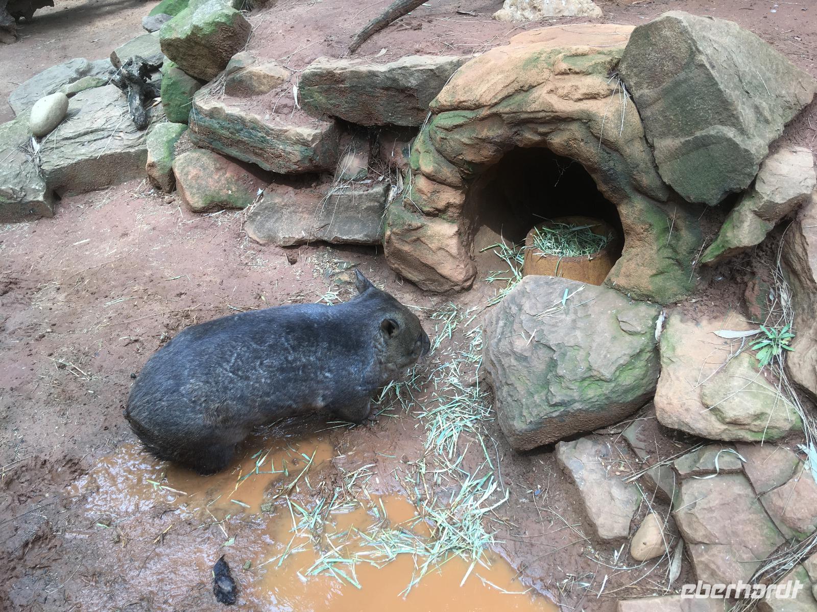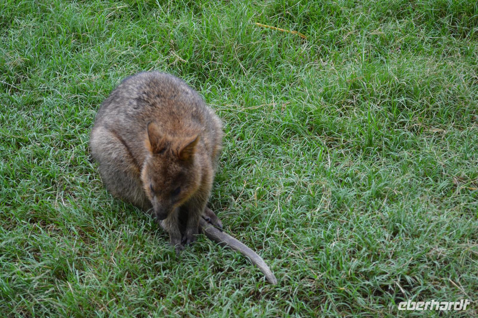 Auch beim heutigen Ausflug in die Blue Mountains sind alle mit dabei. Der Name kommt von den Öldämpfen über den ausgedehnten Eukalyptuswäldern, die den Bergen im Licht der Sonne einen blauen Glanz verleihen. Da der Wettergott uns am Morgen nicht ganz so wohlgesonnen ist, stellen wir spontan unser Programm ein bisschen um und halten zuerst im Örtchen Leura, der Perle der Blue Mountains. Hier entdecke ich in der kleinen Einkaufsstraße eine Schokoladenmanufaktur, und als mich beim Eintreten der herrliche Duft überrollt, bin ich im siebten Schokoladenhimmel. Nun stehen eigentlich die Drei Schwestern auf dem Programm, die markanteste Felsformation der Blue Mountains. Wir sehen nur leider - nichts. Die scheuen Damen verstecken sich hinter dicken Nebelschwaden. Auch ein Spaziergang durch den Eukalyptuswald hinter die Felsformation kann da nur teilweise Abhilfe schaffen. Aber vielleicht wird es ja doch noch besser, das Wetter? Gehen wir doch erstmal zum Mittagessen in den Wentworth Falls Country Club. Es übertrifft sogar noch unsere Erwartungen. Wir möchten am liebsten alles aufessen, so lecker ist es, doch irgendwann passt einfach nichts mehr rein. Doch nicht nur beim Mittagessen ist uns das Glück hold, auch der Nebel reißt jetzt tatsächlich noch auf und eröffnet uns DEN Postkartenblick schlechthin auf die Blue Mountains und auch die Drei Schwestern. Deren Geschichte erzählt uns Uli nach einer kurzen Wanderung auf der Fahrt zum Featherdale Wildlife Park. Im Wildpark können wir die australische Tierwelt bestaunen, die so ganz anders ist, als auf allen anderen Kontinenten. Die Dingos, die australischen Wildhunde, fallen noch am wenigsten aus der Reihe, doch Wombat, Tasmanischer Teufel, Schnabeltier und Känguru sind schon sehr außergewöhnliche Tiere. Und kennen Sie den Echidna, den australischen Ameisenigel? Natürlich darf auch der Koala in der Auflistung nicht fehlen, das berühmteste australische Tier, das jeder so gern streicheln will. Und ja, wir können uns hier auch mit einem Koala fotografieren lassen. Ein schöner Abschluss unseres heutigen Ausflugs, mit dem auch der Abschied von Uli näher rückt, die uns nicht nur viele Informationen über Sydney und auch Australien vermittelt, sondern auch an ihrer persönlichen Auswanderungsgeschichte teilnehmen lassen hat. Das Eberhardt-Vorprogramm ist damit beendet, was wir abends zusammen auf dem Sydney Tower feiern und uns mit vielen Köstlichkeiten vom Schlemmer-Buffet (schon wieder) den Bauch vollschlagen, bis nichts mehr reinpasst. Wer weiß schließlich, ob es auf dem Kreuzfahrtschiff etwas zu essen gibt. Dann erleben wir gegen Ende unseres Aufenthalts noch einen wunderschönen Sonnenuntergang über Sydney, der unserer Reise zu den Highlights von Australien ein würdiges Ende bereitet.