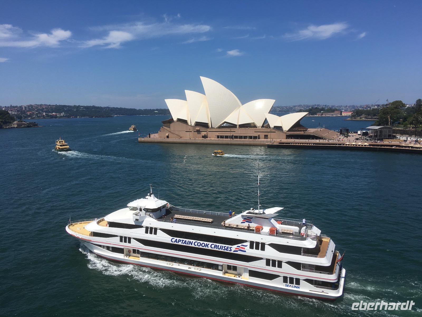 War dies wirklich schon unsere letzte Insel? Es scheint so, denn die Sun Princess nimmt Kurs auf Sydney. Die Überfahrt dauert wieder zwei Tage, an denen wir uns noch einmal so richtig entspannen können. Wir schauen dem Chefkoch aus Italien und dem Restaurantchef beim Wettkochen zu und dürfen anschließend die Bordküche besuchen, deren schiere Größe mich dann doch überrascht. Mit „Voice of the Ocean" und einer tollen Akrobatik-Show läuft das Entertainment-Programm noch einmal zur Hochform auf. Als am letzten Abend an Bord aber die Eistorte vor uns steht, müssen wir uns schweren Herzens doch von Marijana und Edwin verabschieden, die uns jeden Abend sehr herzlich und professionell bewirtet haben - gern möchten wir die beiden mit nach Hause nehmen.