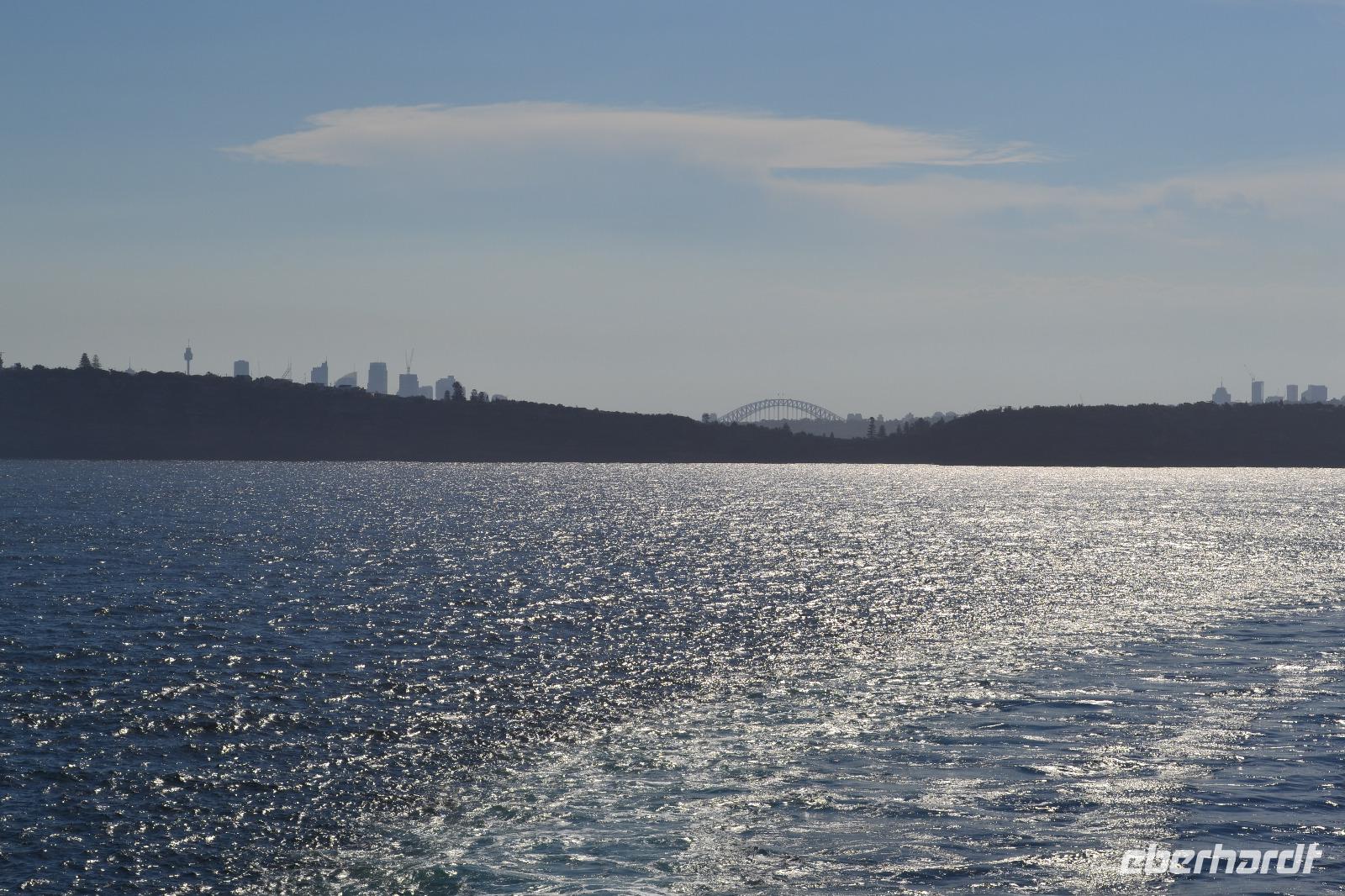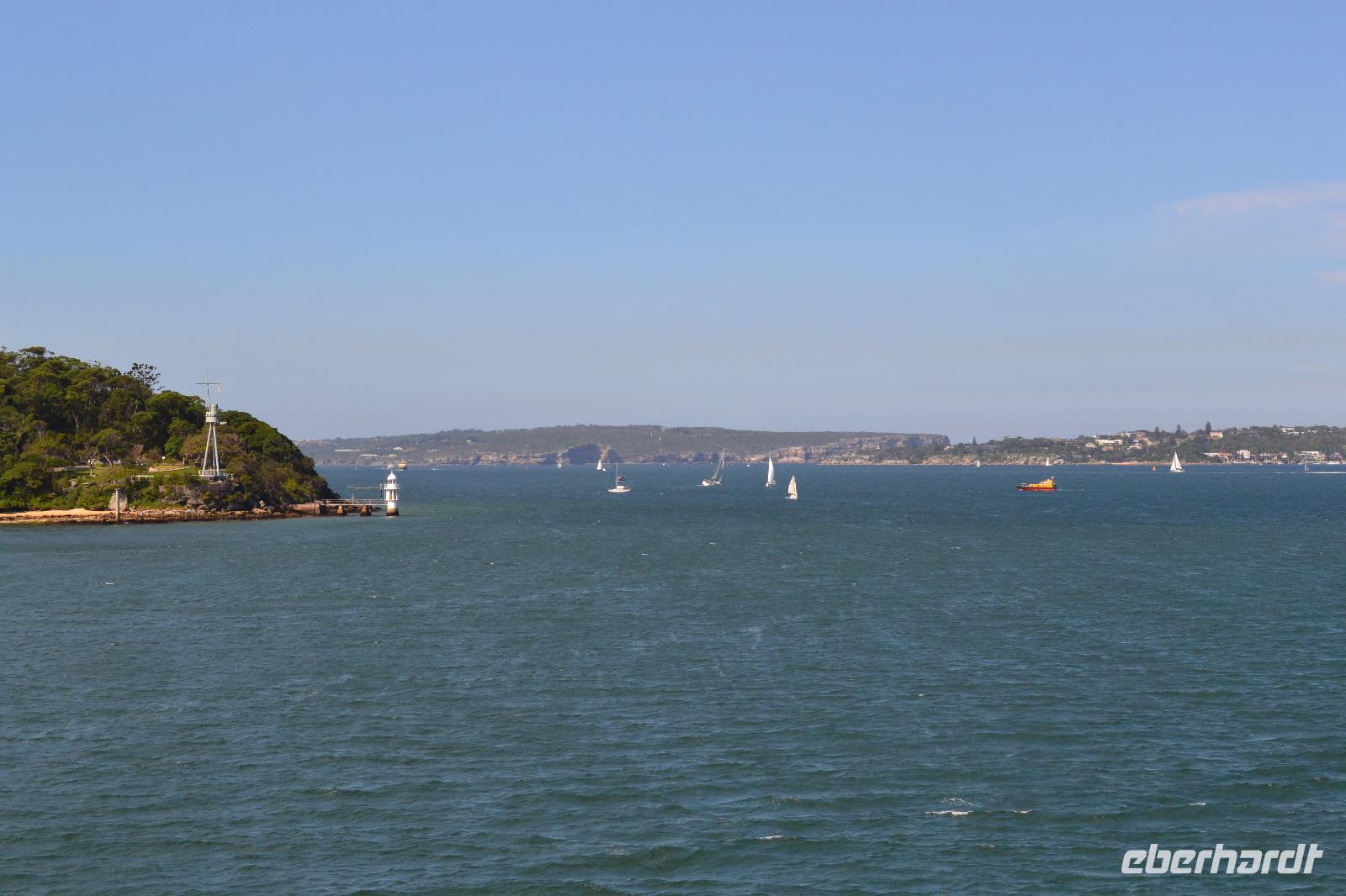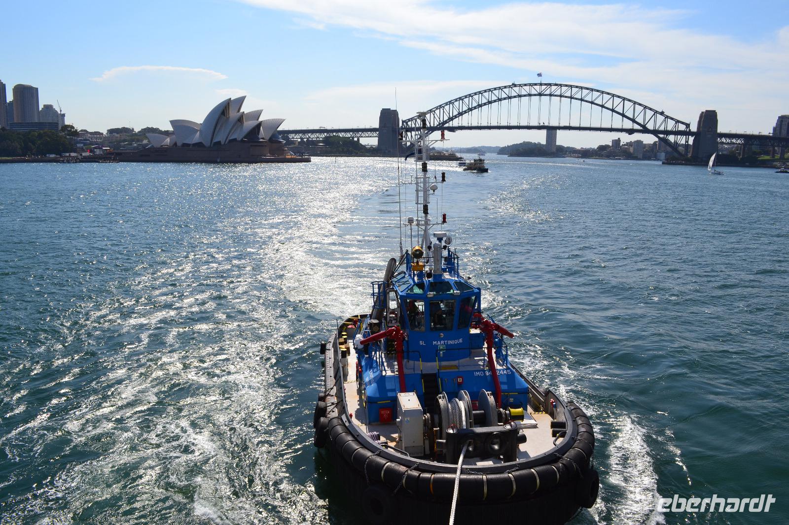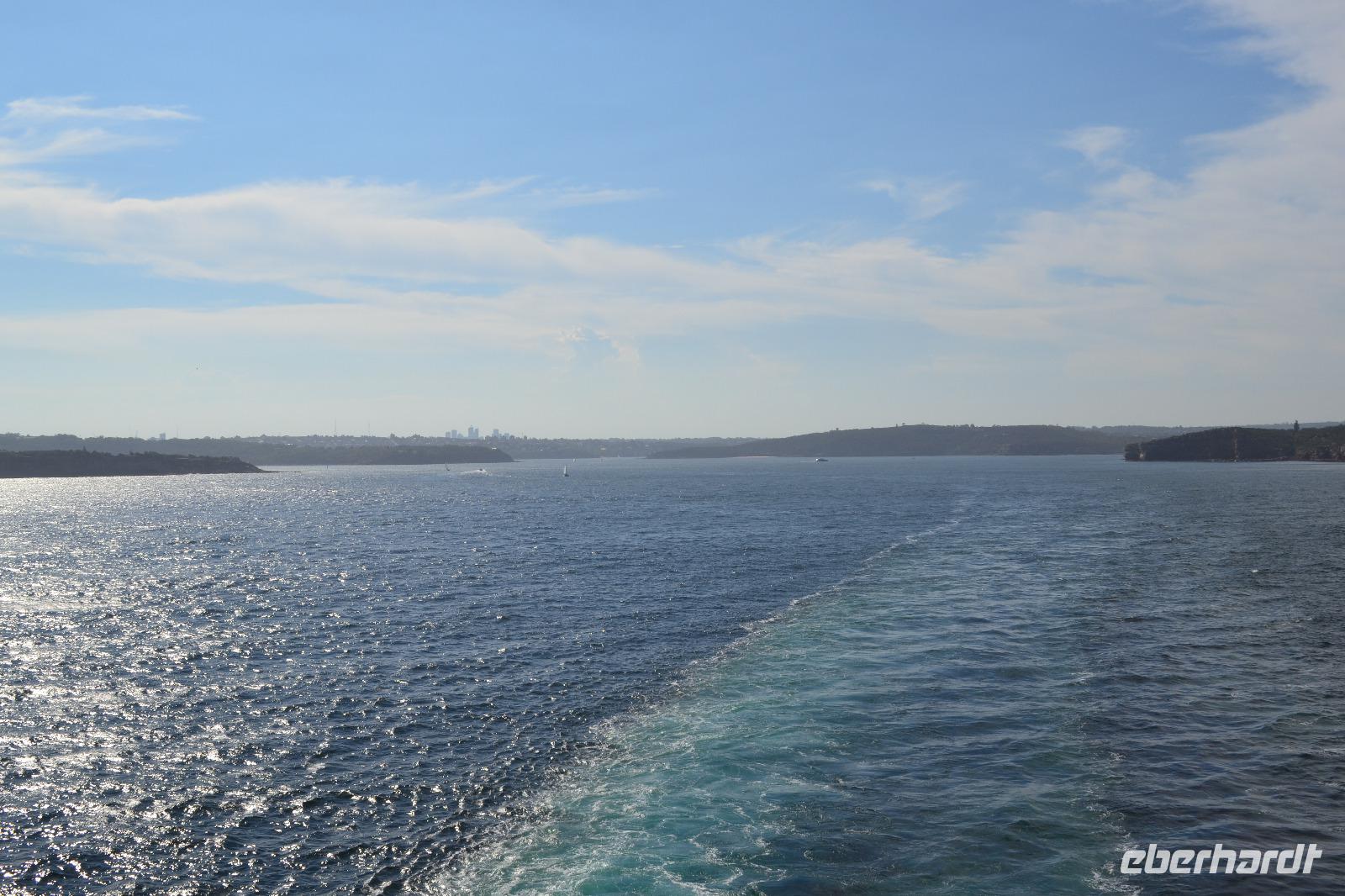 Nach einem freien sonnigen Vormittag in einer der schönsten Städte der Welt finden wir uns alle gegen Mittag in der Lobby des Hotels ein und werden von unserem Fahrer Sam zum Kreuzfahrtterminal gebracht. Die Sun Princess hat am Circular Quay direkt in der Innenstadt von Sydney festgemacht und liegt somit zwischen Harbour Bridge und Opernhaus - einen besseren Start einer Kreuzfahrt kann ich mir nicht vorstellen. Nach der obligatorischen Seenotrettungsübung werden die Leinen um 16 Uhr eingeholt und die Sun Princess nimmt Kurs auf das offene Meer. Die beiden berühmtesten Wahrzeichen Australiens bleiben hinter uns zurück, und wenig später passieren wir die Hafeneinfahrt, an der wir vor zwei Tagen schon während unserer Stadtrundfahrt gestanden und sehnsüchtig auf die Tasmanische See geblickt haben. Unsere Kreuzfahrt in die Südsee hat nun begonnen, und wir finden uns zu unserem ersten gemeinsamen Abendessen im Restaurant ein.