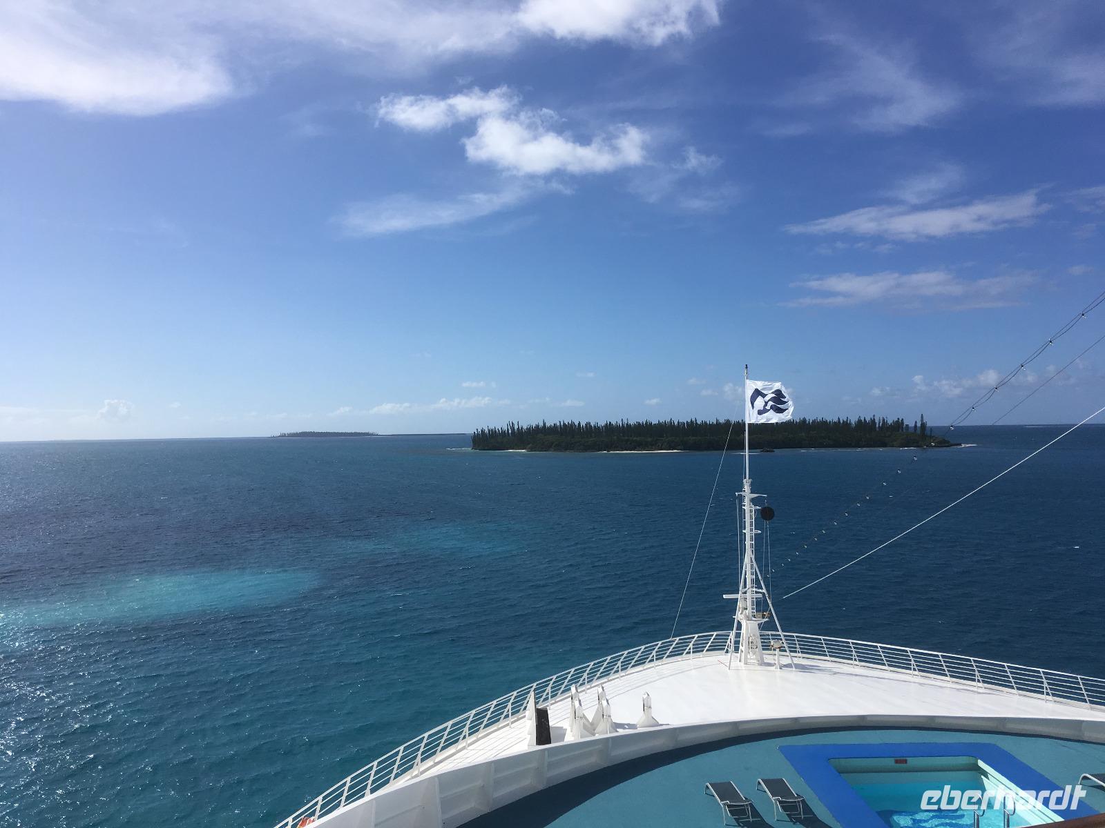 Unsere ersten beiden Seetage nutzen wir dazu, uns in unseren Kabinen häuslich einzurichten, auszuschlafen und gemeinsam das Schiff von ganz unten bis ganz oben zu entdecken, vor allem natürlich das kulinarische Angebot. Wir suchen uns schöne Plätze, an denen wir besonders gut entspannen können, egal ob auf dem Promenadendeck auf Deck 7 oder in den Sonnenstühlen ganz oben am Heck des Schiffes. Auch die Lage des Fitnessstudios ist nicht ganz uninteressant, denn bei so einer Kreuzfahrt kann der Bauch gefährlich schnell wachsen, wenn man(n) nicht rechtzeitig gegensteuert. Derweil steuert unser Kapitän aus England unbeirrt weiter die Isle of Pines an, die zum französischen Überseedepartement Neukaledonien gehört. Bis dorthin sind es schon 1.109 Seemeilen. Pünktlich zur Mittagszeit gibt uns der Kapitän jeden Tag die nautischen Informationen durch und informiert uns über die aktuelle Wettervorhersage. Die ersten Tage bleibt uns die Sonne treu und verwöhnt uns mit ihren warmen Strahlen. Auch für unseren ersten Tag in Neukaledonien ist die Vorhersage ausgesprochen positiv, sodass wir voller Vorfreude die Badesachen bereitlegen.