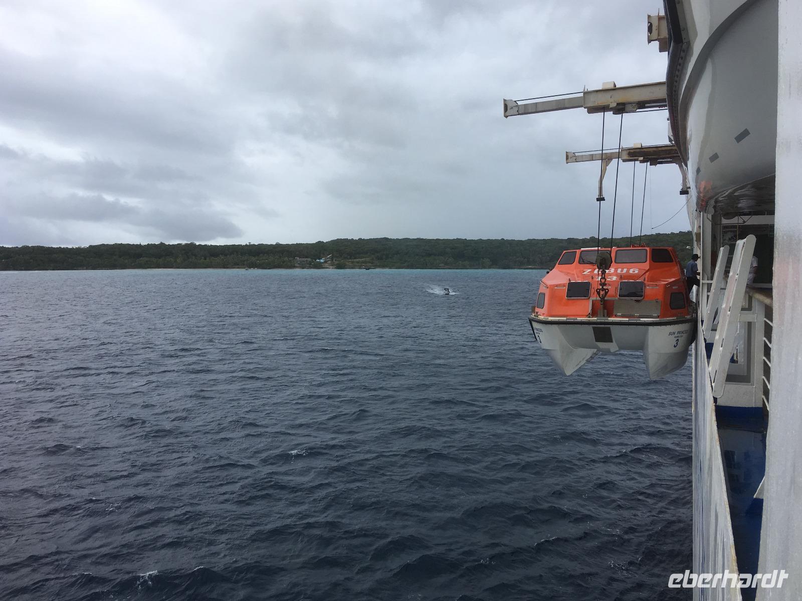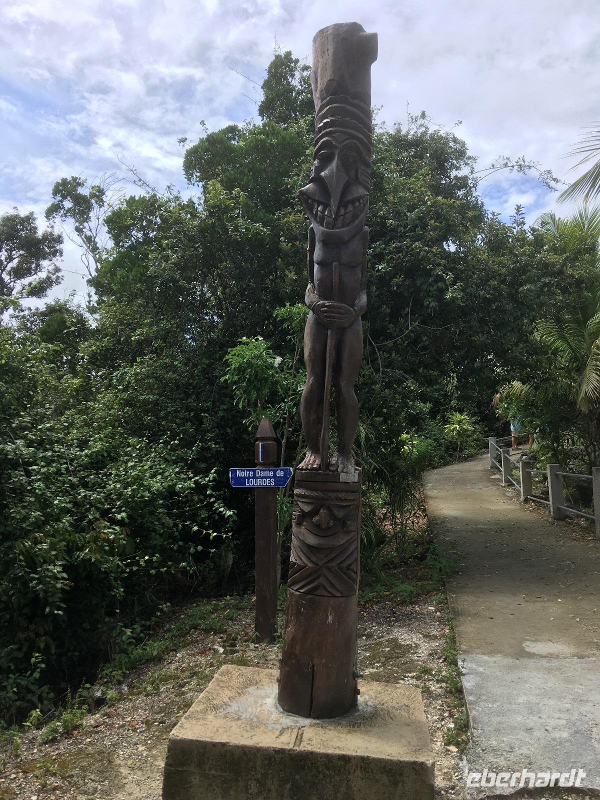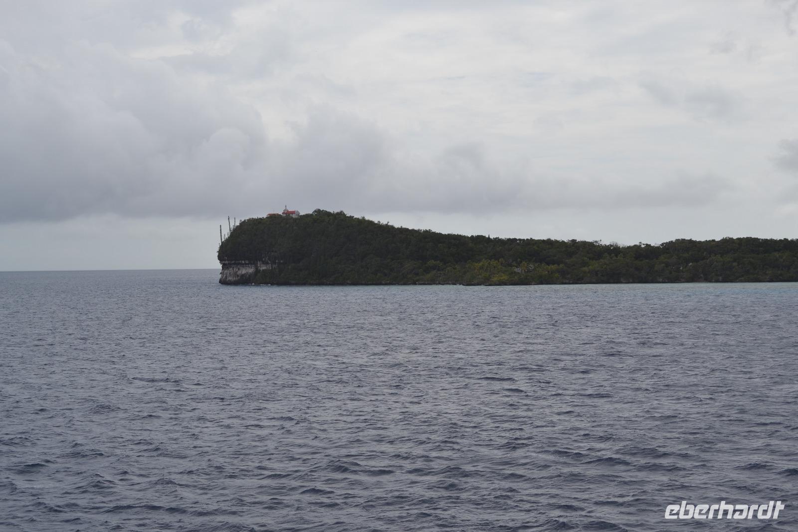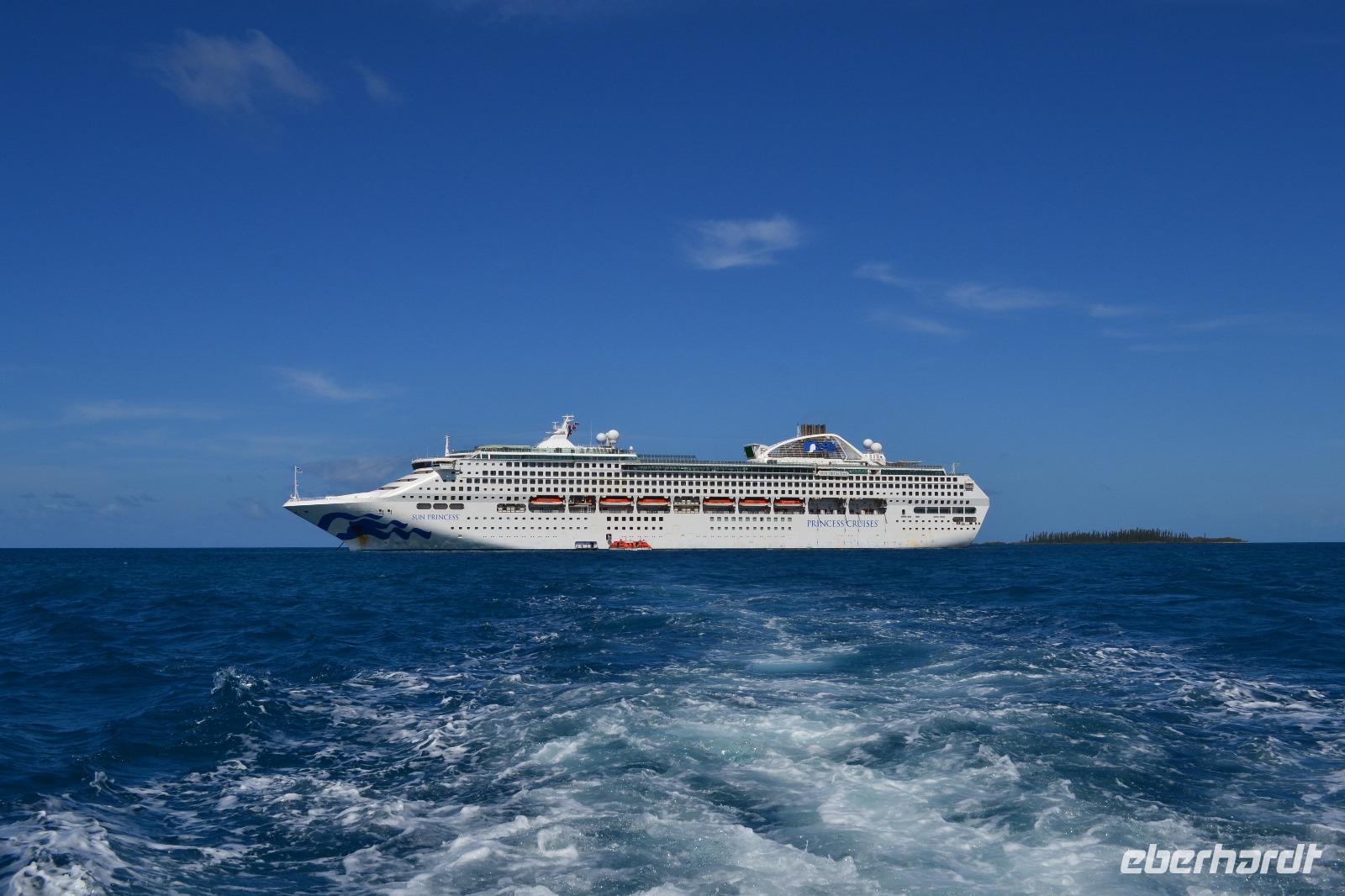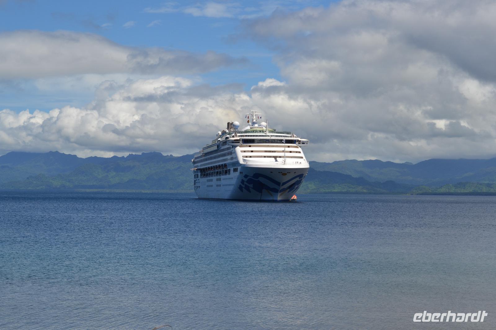 Nach 657 Seemeilen sind wir zurück in Neukaledonien. Lifou ist ein Korallenatoll und die größte der Loyalitätsinseln, die höchstwahrscheinlich nach einem britischen Handelsschiff, der Loyalty, benannt wurden. Nicht einmal 10.000 Menschen wohnen hier, in diesem Südsee-Paradies. Sie sollen aber alle mit Christian Karembeu mehr oder weniger direkt verwandt sein, dem ehemaligen französischen Nationalspieler, der hier als Volksheld verehrt wird. Ich kann nur meine eigenen Eindrücke von unserem letzten Landausflug auf dieser Kreuzfahrt wiedergeben, denn dank des heute sehr missmutig gelaunten Wettergottes werde ich von meiner Reisegruppe getrennt. Während es sich meine Reisegäste am Strand gemütlich machen bzw. zu ihrer Shore Excursion aufbrechen, unternehme ich einen Spaziergang zur Erkundung der näheren Umgebung, sozusagen als Kundschafter für Eberhardt TRAVEL. Mein Weg führt mich zunächst zur kleinen Kapelle Notre Dame de Lourdes, die malerisch auf einer Klippe thront. Die Aussicht von hier auf die Baie de Sandal, in der unser Schiff wie ein kleines Spielzeugboot wirkt, übertrifft sogar meine Erwartungen. In der Baie de Jinek liegt das Aquarium naturel de Lifou, ein Korallenschutzgebiet mit einem schönen Schnorchel-Parcours. Auf dem Weg zurück zur Anlegestelle gerate ich in den ersten heftigen Regenschauer an diesem Tag. Zum Glück kann ich mich an einem alten Stand am Straßenrand unterstellen. Der Strand ist bei meiner Rückkehr fast menschenleer, auch meine Gäste sind wie vom Erdboden verschwunden. Ich treffe allerdings das australische Ehepaar, das abends neben uns im Restaurant sitzt und unterhalte mich ein bisschen mit ihnen. Dann breche ich in die andere Richtung auf, denn mir wurde der Besuch einer Tropfsteinhöhle hinter der Kirche St Francis Xavier empfohlen. Gemeinsam mit Max klettere ich die unebenen Stufen hinab und finde mich in einem dichten grünen Dschungel wieder. Ich fühle mich wie Indiana Jones, als ich die kleine Höhle erreiche, in der leider nicht die Bundeslade, sondern ein dunkles schwarzes Wasserloch auf mich wartet. Nun gut, man kann nicht jeden Tag einen Schatz finden, denke ich mir, und begebe mich zurück zum Strand. Auf dem Weg komme ich an mehreren traditionellen Hütten (Cases) der Einheimischen Kanak vorbei, die man besichtigen und fotografieren kann. Kurz bevor ich das rettende Tenderboot erreiche, öffnet der Himmel noch einmal alle Schleusen. Der Regen fällt so dicht, dass wir selbst die nun wirklich große Sun Princess nicht mehr sehen können, und warten müssen, bis er etwas nachgelassen hat. Das Wetter ist natürlich beim Abendessen das Gesprächsthema Nummer Eins, denn auch die Crew hat so einen heftigen Regenguss noch nicht erlebt. Meine beiden Gäste, die am Ausflug teilgenommen haben, schwärmen indes von der Vanillefarm und der Besichtigung der Klippen von Jokin. Nachdem uns unser Kellner Edwin beigebracht hat, wie man aus einer Stoffserviette eine kleine Maus zaubert, bricht an Bord der Sun Princess in den nächsten Tagen eine regelrechte Nagetier-Epidemie aus.