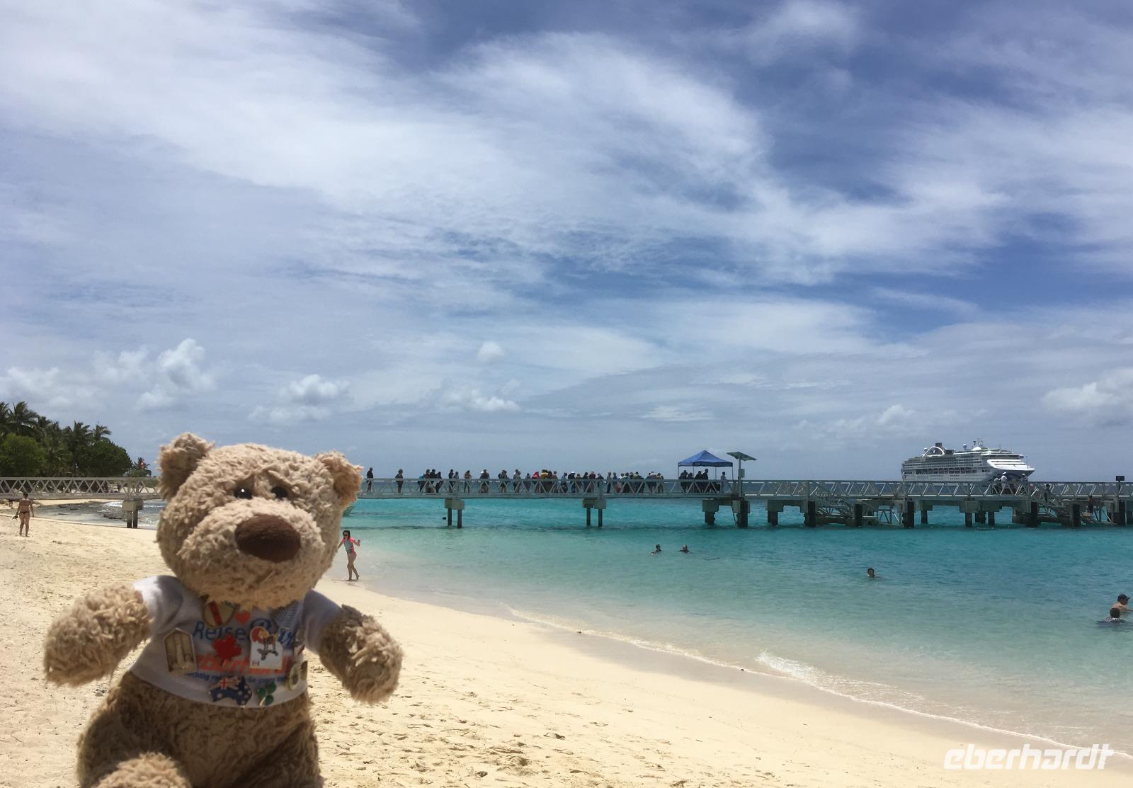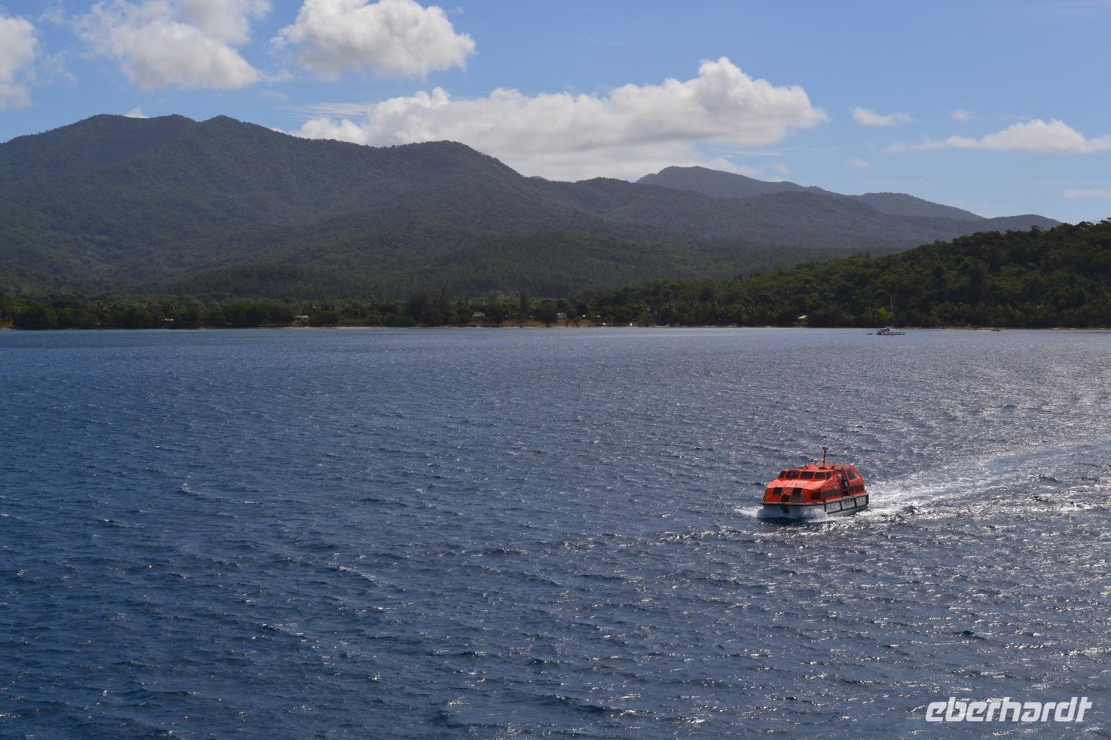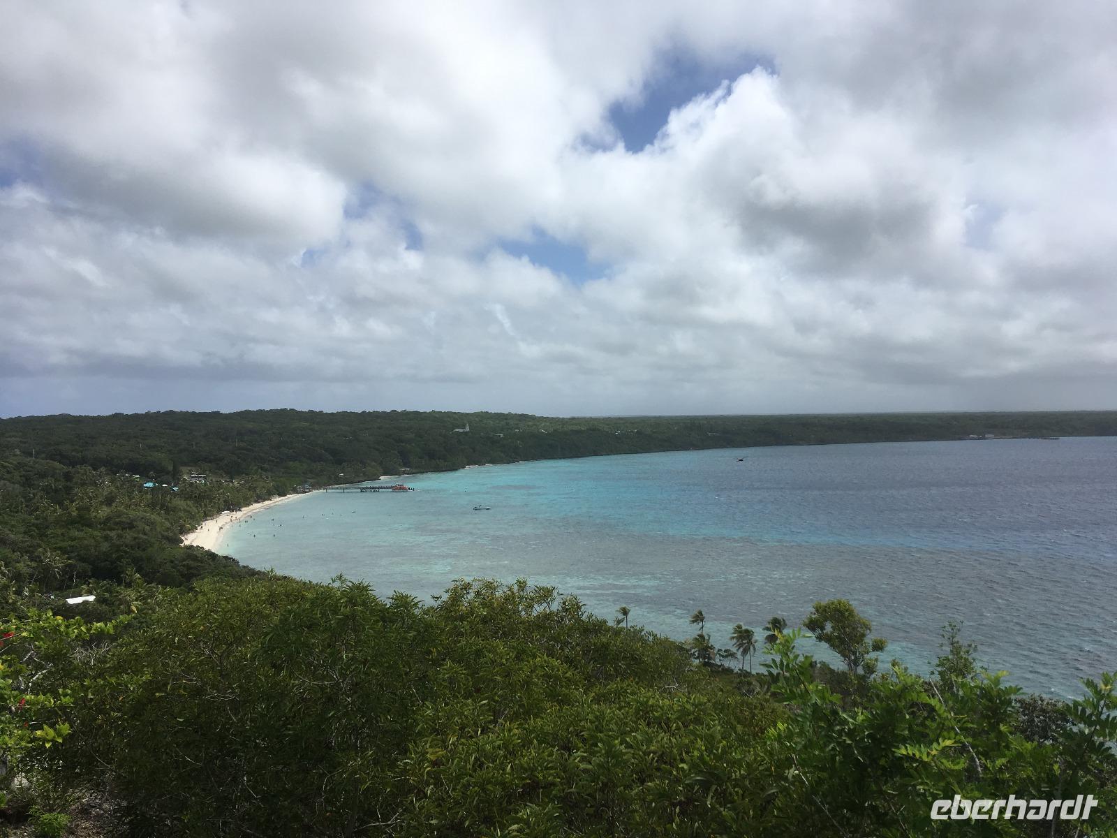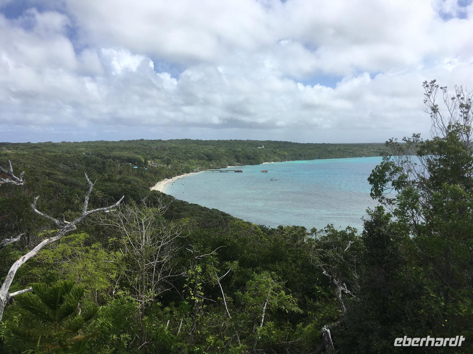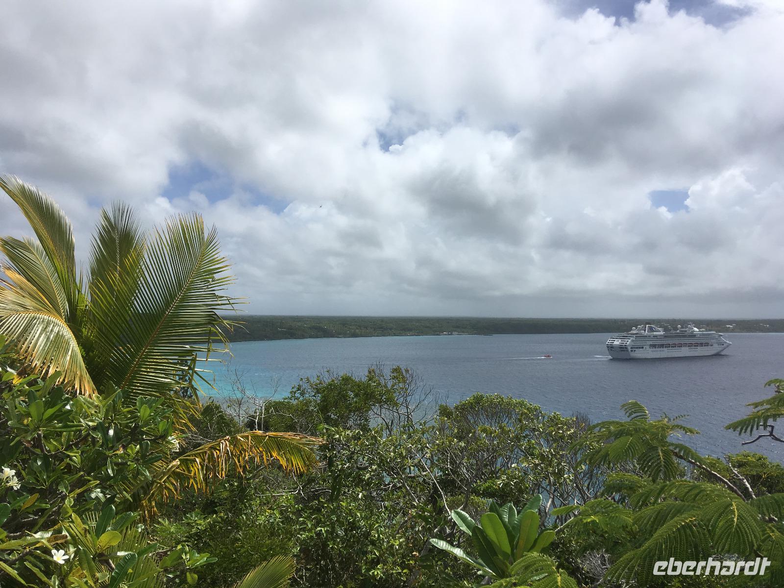Wir unsere erste Insel in der Südsee erreicht. Wie freudige Entdecker können wir es kaum erwarten, unser Schiff zu verlassen und das uns fremde Eiland zu erkunden. Mit dem orangefarbenen Tenderboot der Sun Princess werden wir zur Insel gebracht. Diese wollen wir zunächst auf einer kleinen Rundfahrt mit dem Bus erkunden. Zu unserer Überraschung haben wir doch eine Reiseleiterin im Bus dabei (der Ausflug war als „unguided" ausgeschrieben): Diana, die die Gelegenheit nutzen will, ihr Englisch zu verbessern. Sie beschreibt uns das Leben der einheimischen Kuniés und zeigt uns die wichtigsten Sehenswürdigkeiten. Gerade einmal 2.000 Einwohner leben auf der Insel, hauptsächlich vom Fischfang und dem Anbau von Yamswurzeln. Sie sind auf acht Stämme und damit Dörfer verteilt. Bei dieser kleinen Einwohnerzahl sind wir nicht erstaunt, dass jeder jeden zu kennen scheint. Die Einheimischen begrüßen sich alle freundlich und winken sich zu. Das tägliche Leben scheint einfach zu sein, aber alle wichtigen Einrichtungen sind vorhanden: kleine Lebensmittelgeschäfte, die Feuerwehr, ein Krankenhaus, eine Apotheke und Schulen für die Kinder. Sie haben gerade Ferien und tollen an den wunderschönen weißen Stränden herum und planschen vergnügt im Wasser. Auch eine katholische Kirche gibt es, in der gefühlt alle Einwohner Platz nehmen könnten. Ein großes weißes Pfarrhaus mit einem schönen Garten steht daneben. Die Kirche und ein Denkmal an der nächsten Bucht erinnern an die Bekehrung der Kuniés durch französische Missionare, vor allem Jesuiten. Der letzte Stopp unseres Ausflugs verweist ebenfalls auf dunklere Zeiten, denn bis 1912 unterhielt Frankreich auf der Insel eine Strafkolonie. Die Ruinen der Verwaltungsgebäude und Gefängniszellen können wir besichtigen. Obwohl es 1880 eine Generalamnestie für die Häftlinge gab, kehrten nicht alle nach Frankreich zurück. Einige ließen sich dauerhaft auf der Isle of Pines nieder, nun aber als freie Menschen. Zurück in der Kuta Bay verabschieden wir uns von Diana und spazieren zum herrlichen Strand hinüber. Das klare türkisblaue Wasser der Bucht lockt uns hinein, wir können nicht widerstehen. Das inoffizielle Eberhardt-Wasserthermometer misst 26 Grad. Strandurlaub in der Südsee, während Deutschland in der Kälte bibbert. Wir haben es schon gut. Beim italienischen Abend im Restaurant feiern wir später mit italienischem Prosecco unser Bergfest (streng genommen hätten wir heute Vormittag ein Bergfrühstück feiern müssen). Etwas mehr als die Hälfte der Reise ist vorbei, aber unsere Kreuzfahrt in die Südsee hat mit einem gelungenen Auftakt gerade erst so richtig begonnen.