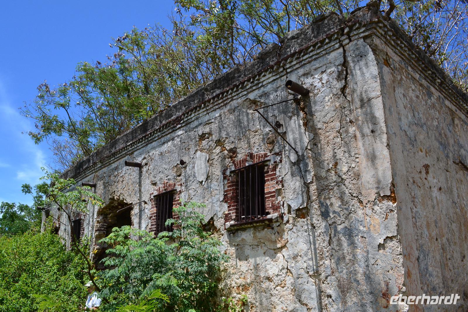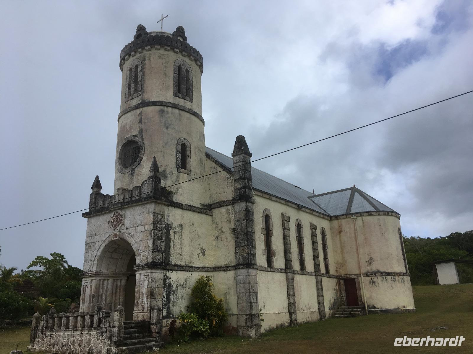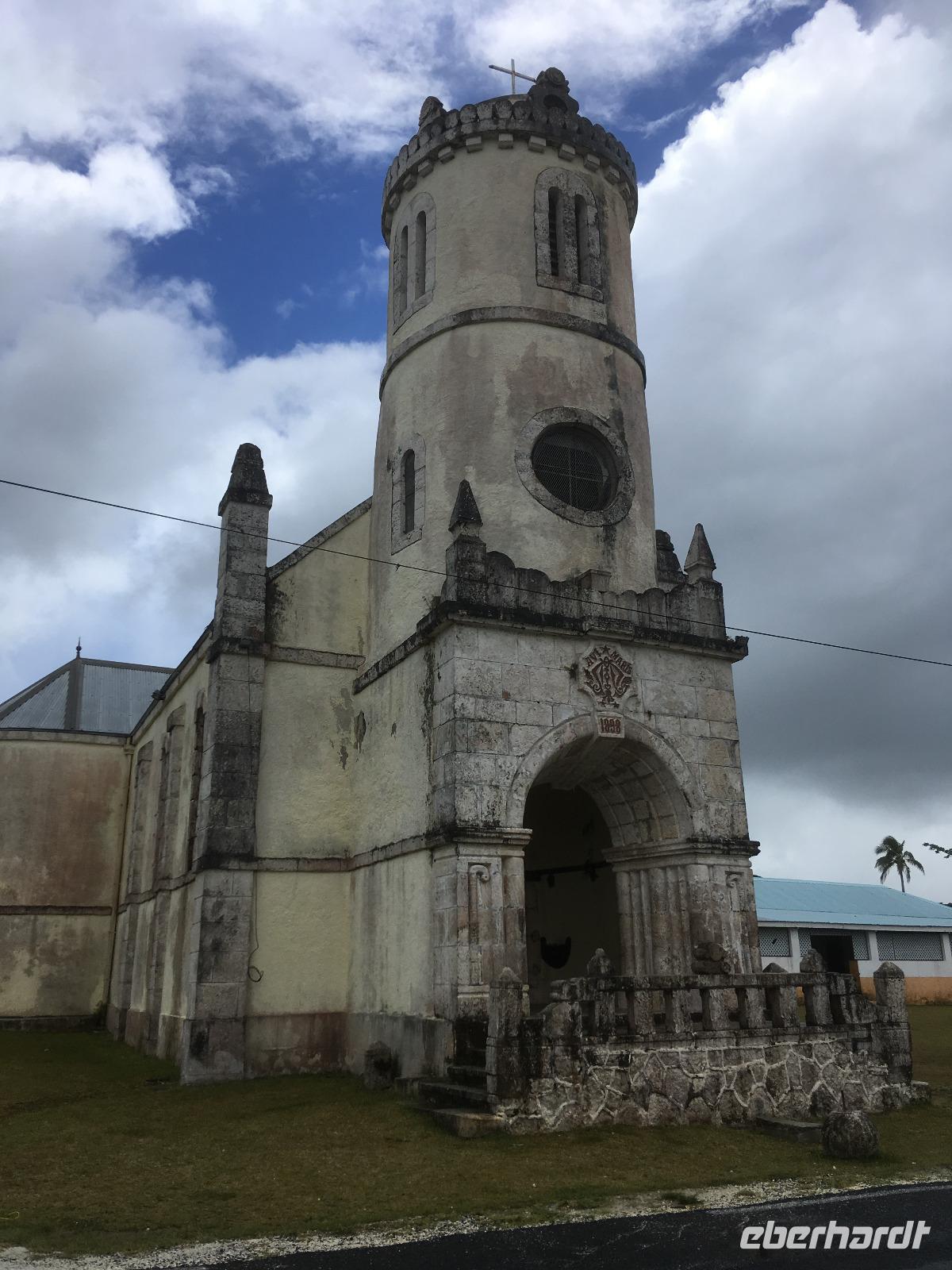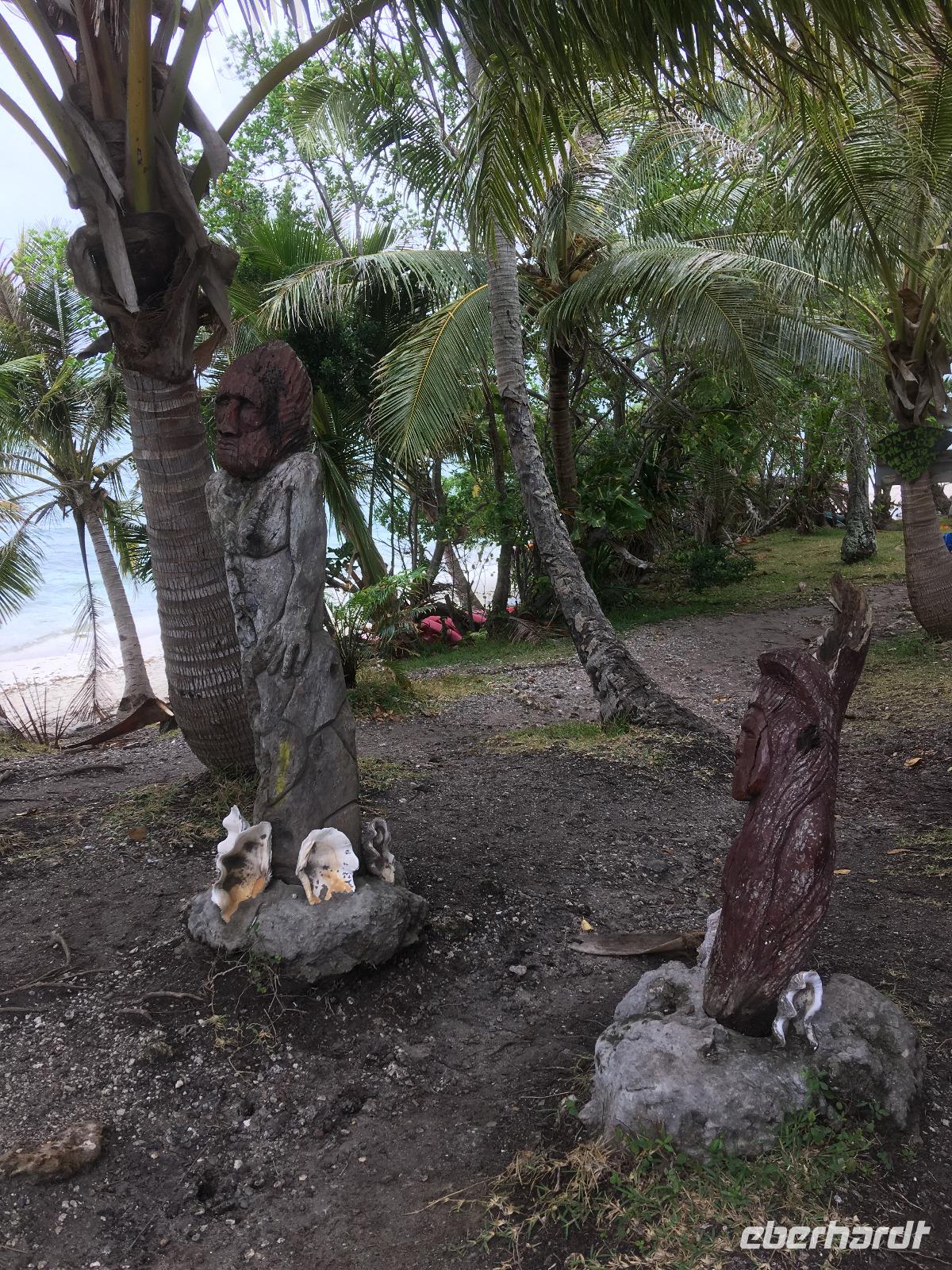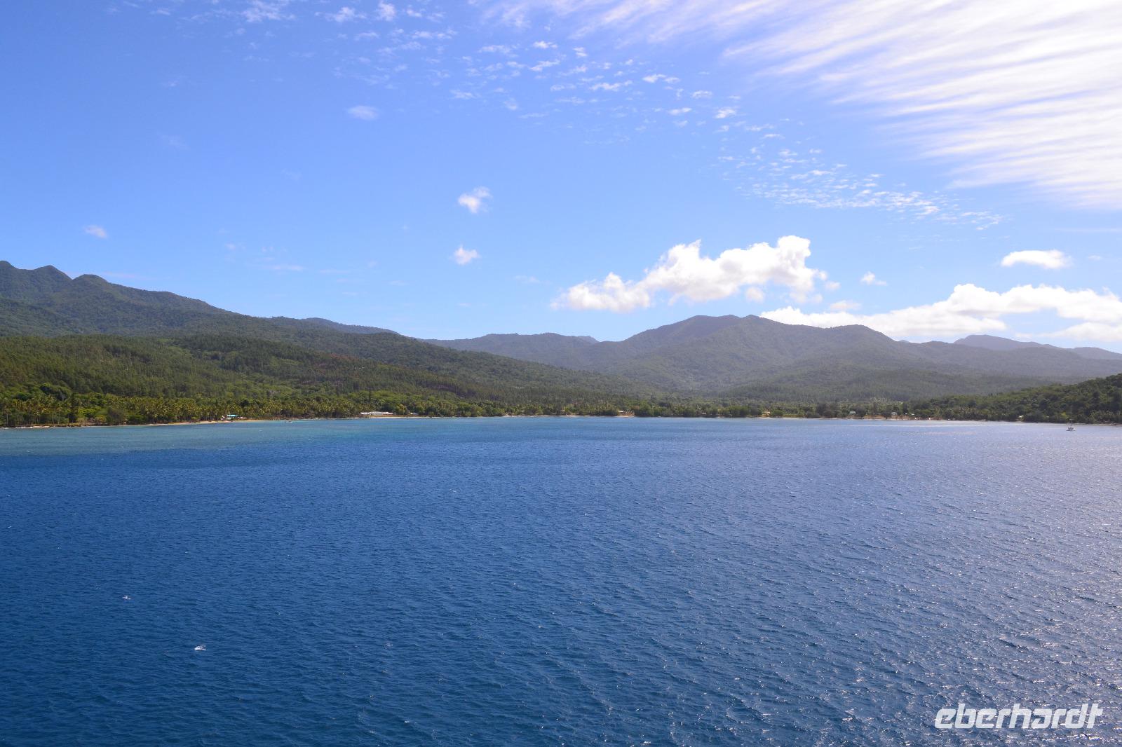 Wir unsere erste Insel in der Südsee erreicht. Wie freudige Entdecker können wir es kaum erwarten, unser Schiff zu verlassen und das uns fremde Eiland zu erkunden. Mit dem orangefarbenen Tenderboot der Sun Princess werden wir zur Insel gebracht. Diese wollen wir zunächst auf einer kleinen Rundfahrt mit dem Bus erkunden. Zu unserer Überraschung haben wir doch eine Reiseleiterin im Bus dabei (der Ausflug war als „unguided" ausgeschrieben): Diana, die die Gelegenheit nutzen will, ihr Englisch zu verbessern. Sie beschreibt uns das Leben der einheimischen Kuniés und zeigt uns die wichtigsten Sehenswürdigkeiten. Gerade einmal 2.000 Einwohner leben auf der Insel, hauptsächlich vom Fischfang und dem Anbau von Yamswurzeln. Sie sind auf acht Stämme und damit Dörfer verteilt. Bei dieser kleinen Einwohnerzahl sind wir nicht erstaunt, dass jeder jeden zu kennen scheint. Die Einheimischen begrüßen sich alle freundlich und winken sich zu. Das tägliche Leben scheint einfach zu sein, aber alle wichtigen Einrichtungen sind vorhanden: kleine Lebensmittelgeschäfte, die Feuerwehr, ein Krankenhaus, eine Apotheke und Schulen für die Kinder. Sie haben gerade Ferien und tollen an den wunderschönen weißen Stränden herum und planschen vergnügt im Wasser. Auch eine katholische Kirche gibt es, in der gefühlt alle Einwohner Platz nehmen könnten. Ein großes weißes Pfarrhaus mit einem schönen Garten steht daneben. Die Kirche und ein Denkmal an der nächsten Bucht erinnern an die Bekehrung der Kuniés durch französische Missionare, vor allem Jesuiten. Der letzte Stopp unseres Ausflugs verweist ebenfalls auf dunklere Zeiten, denn bis 1912 unterhielt Frankreich auf der Insel eine Strafkolonie. Die Ruinen der Verwaltungsgebäude und Gefängniszellen können wir besichtigen. Obwohl es 1880 eine Generalamnestie für die Häftlinge gab, kehrten nicht alle nach Frankreich zurück. Einige ließen sich dauerhaft auf der Isle of Pines nieder, nun aber als freie Menschen. Zurück in der Kuta Bay verabschieden wir uns von Diana und spazieren zum herrlichen Strand hinüber. Das klare türkisblaue Wasser der Bucht lockt uns hinein, wir können nicht widerstehen. Das inoffizielle Eberhardt-Wasserthermometer misst 26 Grad. Strandurlaub in der Südsee, während Deutschland in der Kälte bibbert. Wir haben es schon gut. Beim italienischen Abend im Restaurant feiern wir später mit italienischem Prosecco unser Bergfest (streng genommen hätten wir heute Vormittag ein Bergfrühstück feiern müssen). Etwas mehr als die Hälfte der Reise ist vorbei, aber unsere Kreuzfahrt in die Südsee hat mit einem gelungenen Auftakt gerade erst so richtig begonnen.