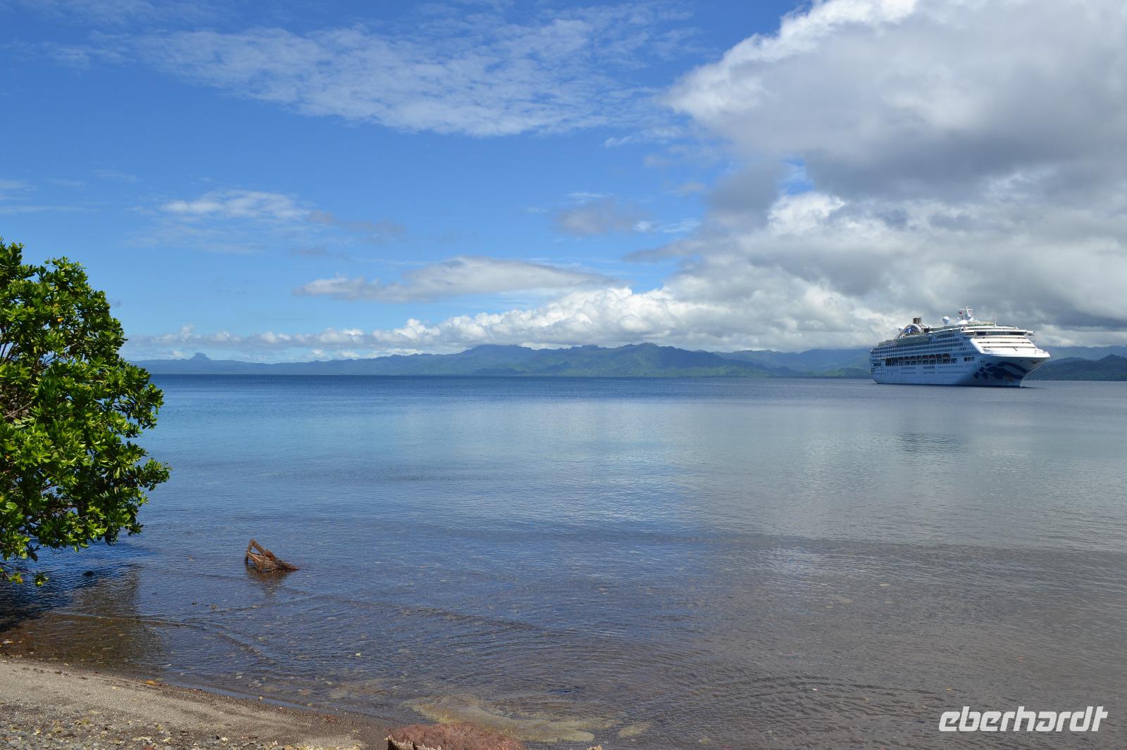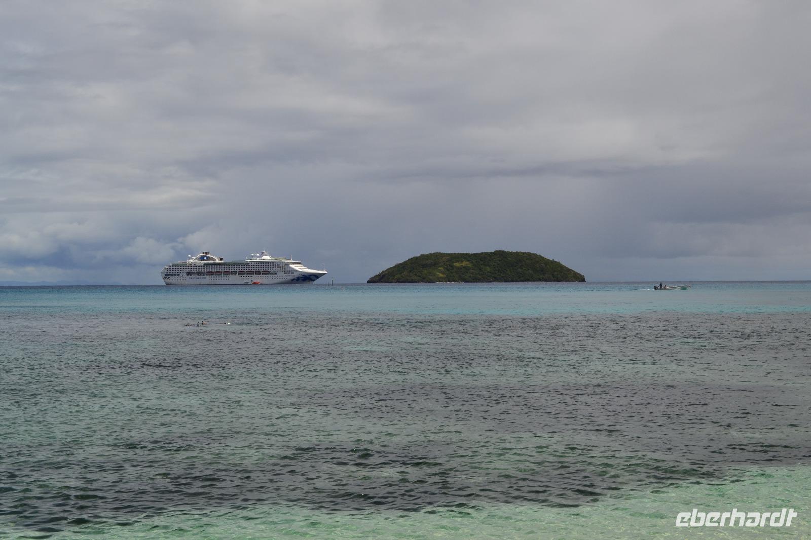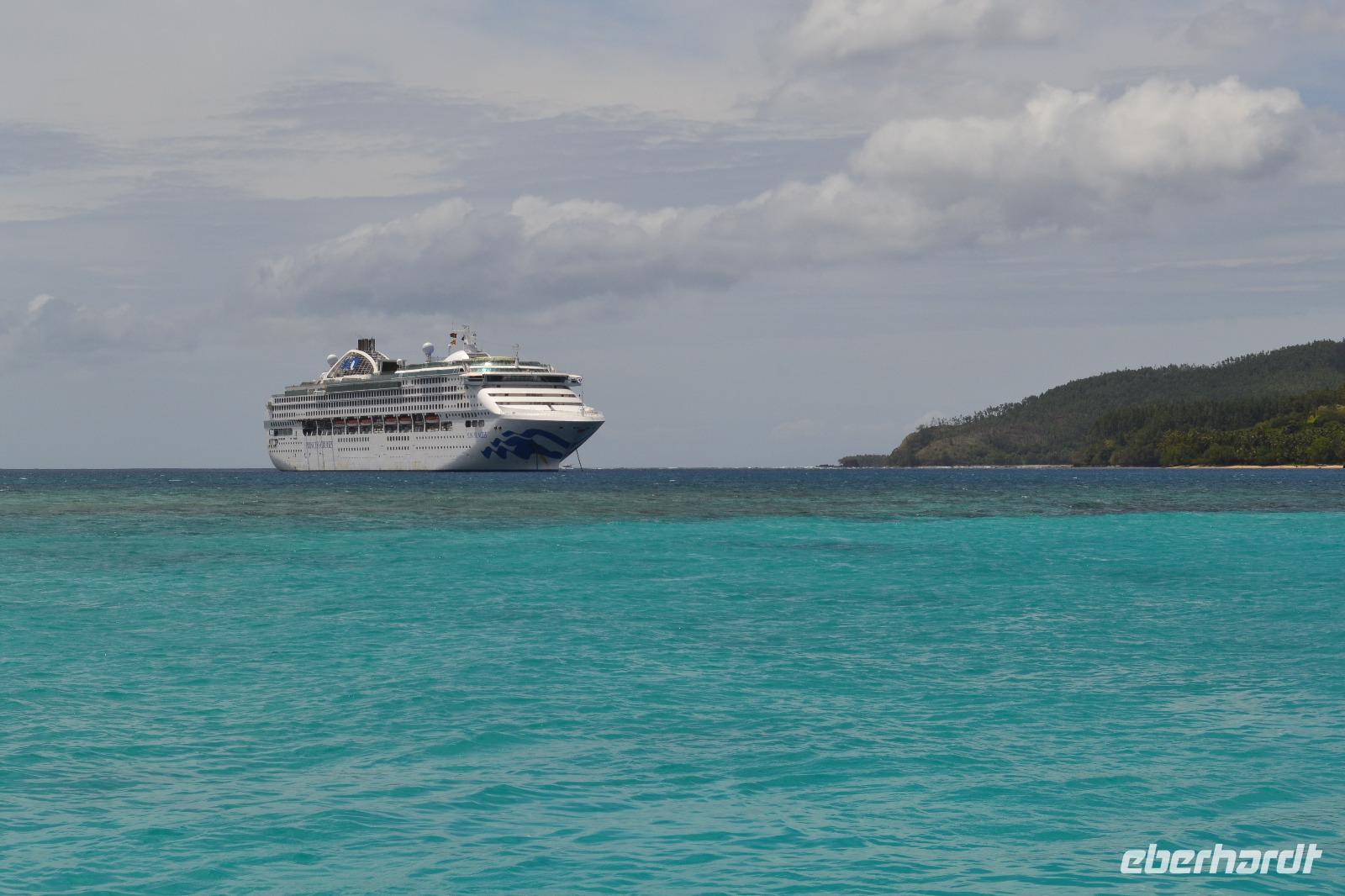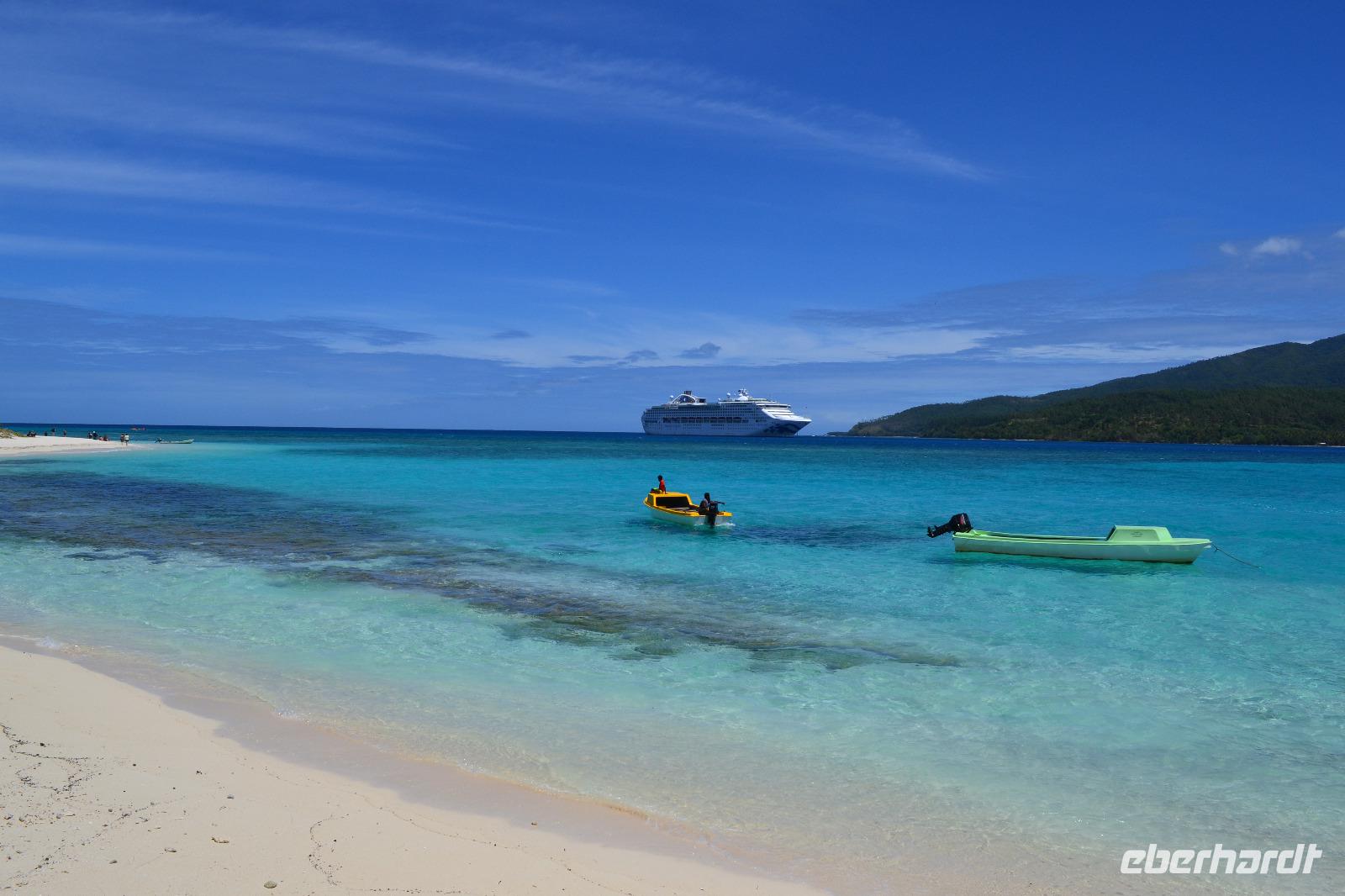 Bula! Der typische Willkommensgruß der Fidschi-Inseln hallt uns überall entgegen, wo wir in den nächsten Tagen auf Einheimische treffen. Drei Inseln in Fidschi werden wir erkunden, und vielleicht ist es ganz gut, dass wir zuerst auf einer kleinen Insel an Land gehen, wo wir von den Einheimischen sehr herzlich begrüßt werden. Auf Dravuni Island leben nicht einmal 200 Menschen in einem winzigen Dorf. Wir dürfen die Grundschule besuchen, in der uns die Schulklassen mit fröhlichen Liedern empfangen. Die Schule wird mit Mitteln aus der australischen Entwicklungshilfe finanziert, weshalb es vor allem für die australischen Passagiere an Bord eine interessante Begegnung ist. Doch auch wir lassen uns von der Heiterkeit anstecken und erkunden die Insel, fotografieren die kleinen Ferkel und Hühner, weichen herabfallenden Kokosnüssen aus, beobachten am Strand kleine Krebse, die sich in ihrem Muschelhaus verstecken. Ein Pfad führt zur höchsten Erhebung, von der man einen tolle Aussicht über die ganze Insel hat. Auch zum Strand auf der anderen Seite der Insel führt ein Weg. Dort ist es zwar deutlich leerer, doch ab und zu stößt man schon auf Plastikmüll und ist damit wieder mittendrin in den aktuellen Zivilisationsproblemen. Der sehr saubere Badestrand entlang des Dorfes füllt sich hingegen immer mehr. Das inoffizielle Eberhardt-Wasserthermometer misst auch hier eine Temperatur von 27 Grad. Eine Schnorchelausrüstung ist sehr zu empfehlen, denn es gibt Korallen und viele kleine Fische zu bewundern. Die Einheimischen bieten Massagen, Getränke und kleine Speisen an - wir können übrigens bei jedem Landgang auf dieser Kreuzfahrt mit australischen Dollar bezahlen. Wer Glück hat, wird sogar in ein Haus eingeladen. Die technische Ausstattung der kleinen Pfahlhäuser ist wider Erwarten gut, auch wenn es für den europäischen Geschmack in den Innenräumen etwas karg aussieht. Aber das Leben spielt sich bei den warmen Temperaturen natürlich vor allem draußen ab. Auch wir genießen noch den Aufenthalt am Strand, bevor es mit den Tenderbooten zurück an Bord der Sun Princess geht.