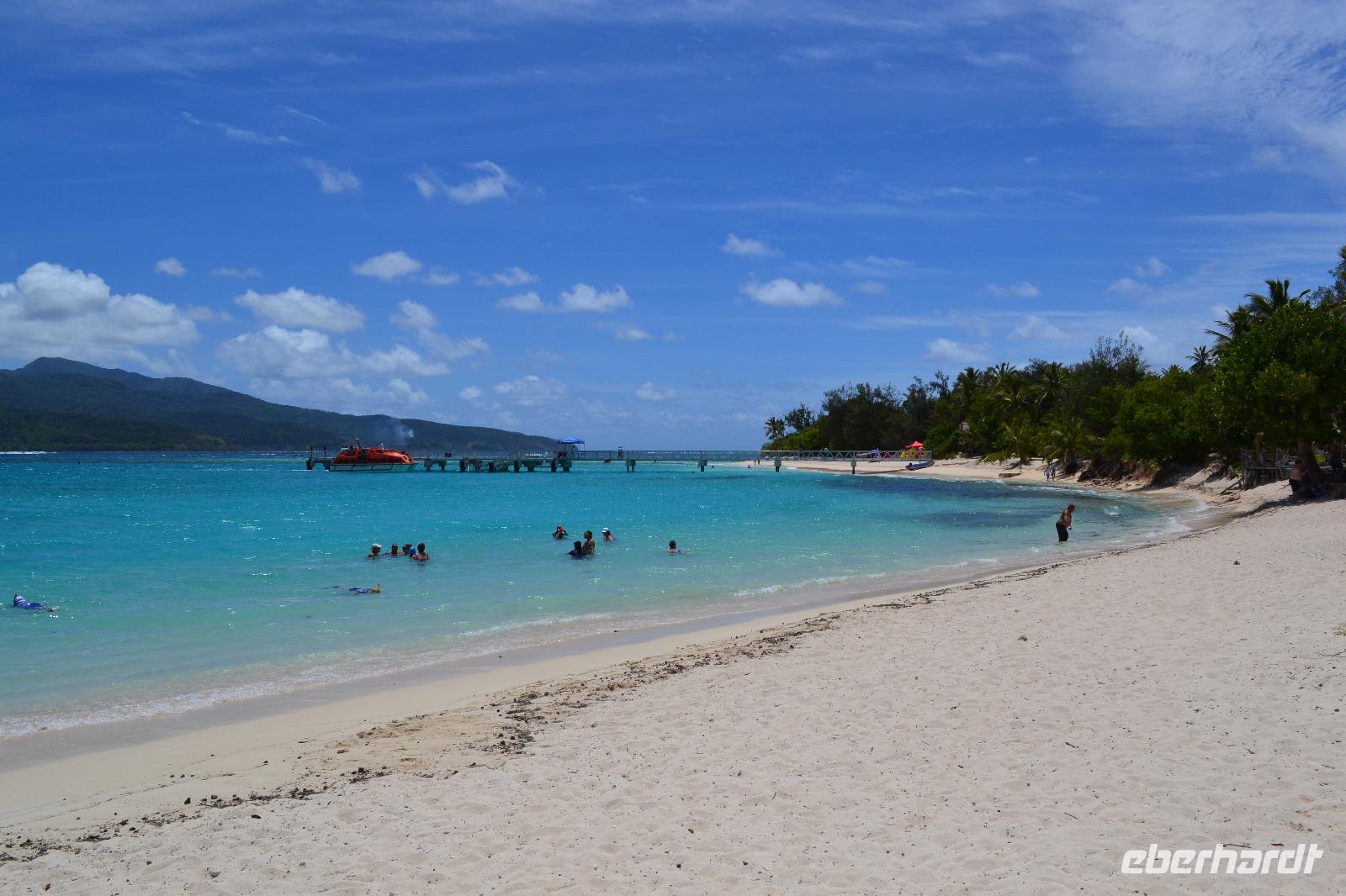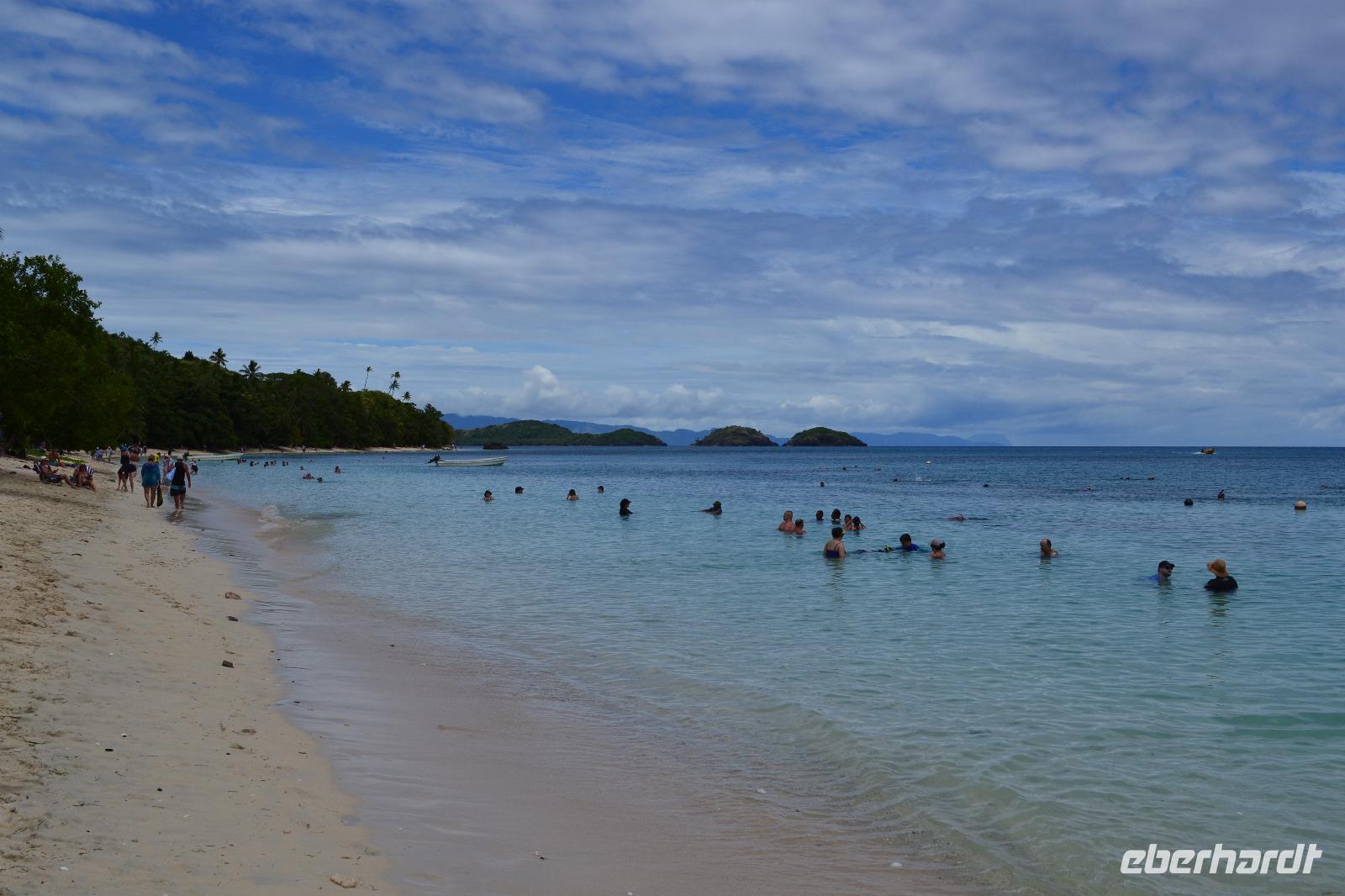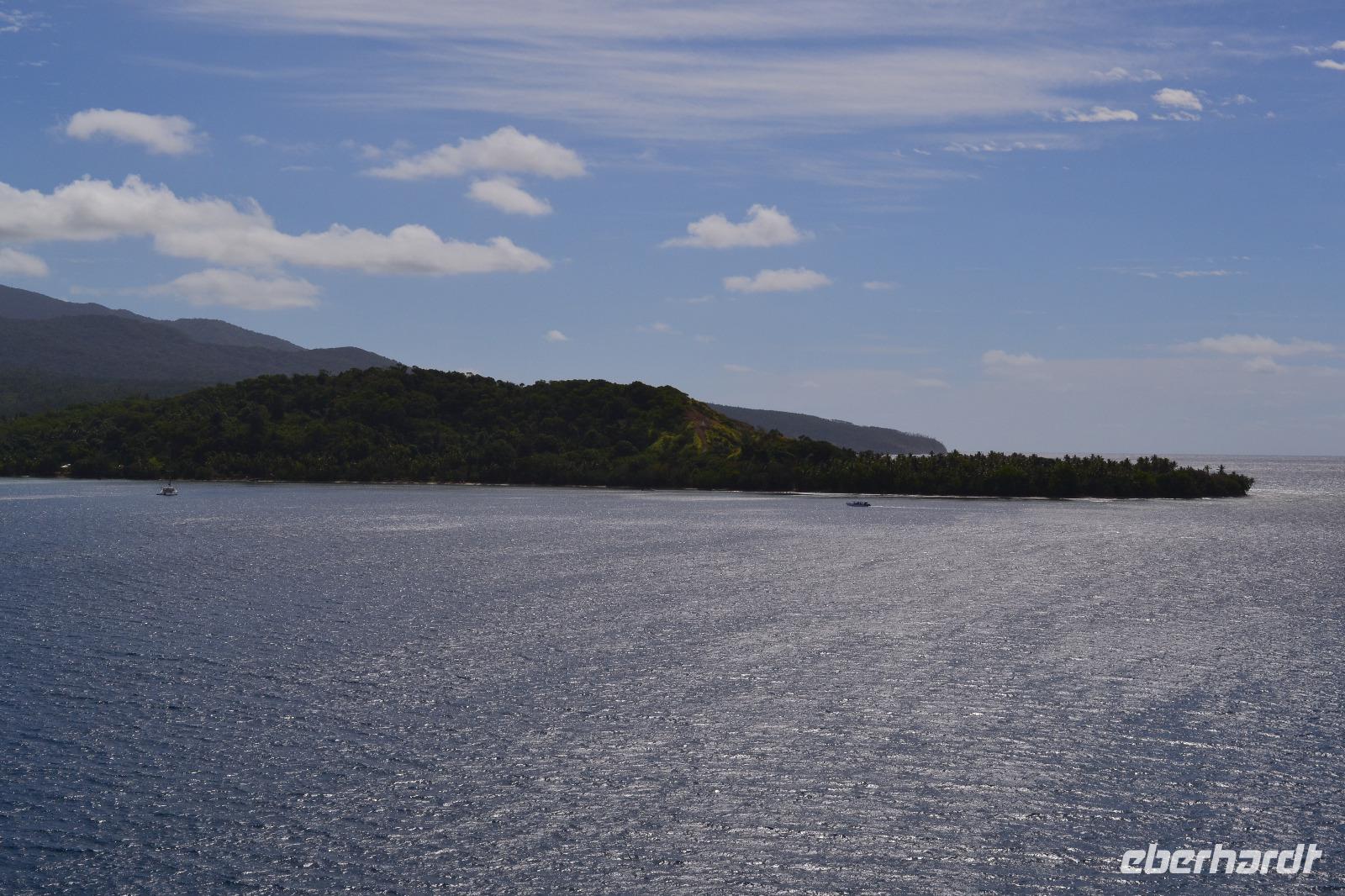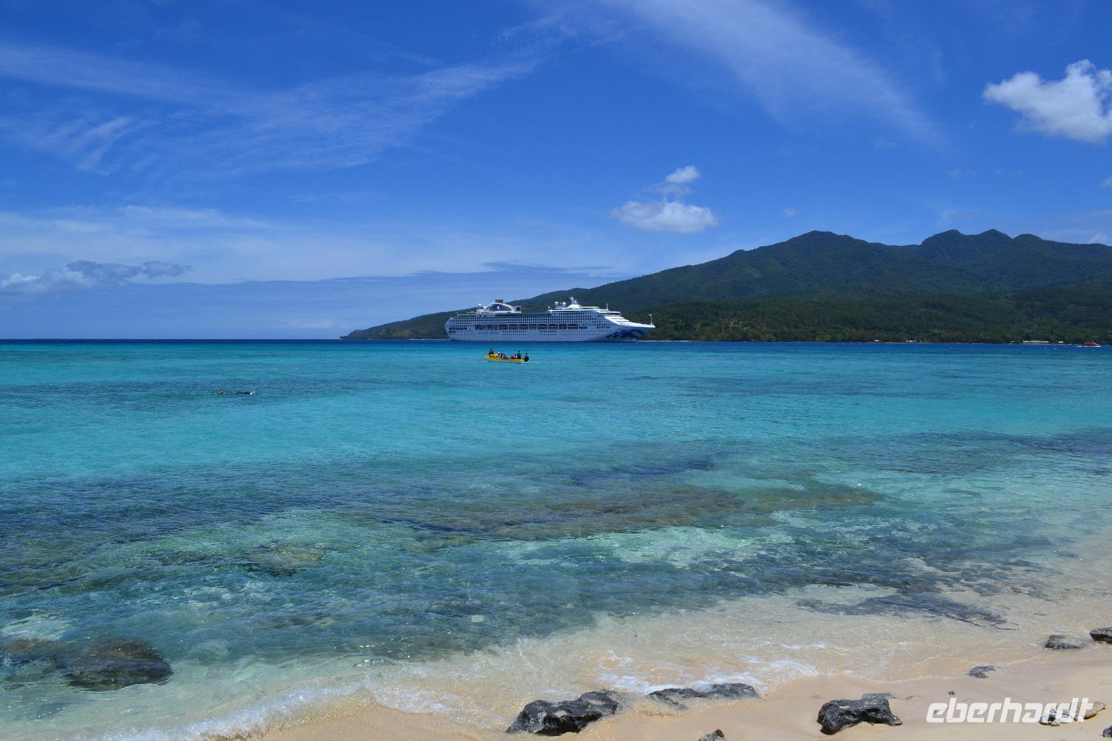 Bula! Der typische Willkommensgruß der Fidschi-Inseln hallt uns überall entgegen, wo wir in den nächsten Tagen auf Einheimische treffen. Drei Inseln in Fidschi werden wir erkunden, und vielleicht ist es ganz gut, dass wir zuerst auf einer kleinen Insel an Land gehen, wo wir von den Einheimischen sehr herzlich begrüßt werden. Auf Dravuni Island leben nicht einmal 200 Menschen in einem winzigen Dorf. Wir dürfen die Grundschule besuchen, in der uns die Schulklassen mit fröhlichen Liedern empfangen. Die Schule wird mit Mitteln aus der australischen Entwicklungshilfe finanziert, weshalb es vor allem für die australischen Passagiere an Bord eine interessante Begegnung ist. Doch auch wir lassen uns von der Heiterkeit anstecken und erkunden die Insel, fotografieren die kleinen Ferkel und Hühner, weichen herabfallenden Kokosnüssen aus, beobachten am Strand kleine Krebse, die sich in ihrem Muschelhaus verstecken. Ein Pfad führt zur höchsten Erhebung, von der man einen tolle Aussicht über die ganze Insel hat. Auch zum Strand auf der anderen Seite der Insel führt ein Weg. Dort ist es zwar deutlich leerer, doch ab und zu stößt man schon auf Plastikmüll und ist damit wieder mittendrin in den aktuellen Zivilisationsproblemen. Der sehr saubere Badestrand entlang des Dorfes füllt sich hingegen immer mehr. Das inoffizielle Eberhardt-Wasserthermometer misst auch hier eine Temperatur von 27 Grad. Eine Schnorchelausrüstung ist sehr zu empfehlen, denn es gibt Korallen und viele kleine Fische zu bewundern. Die Einheimischen bieten Massagen, Getränke und kleine Speisen an - wir können übrigens bei jedem Landgang auf dieser Kreuzfahrt mit australischen Dollar bezahlen. Wer Glück hat, wird sogar in ein Haus eingeladen. Die technische Ausstattung der kleinen Pfahlhäuser ist wider Erwarten gut, auch wenn es für den europäischen Geschmack in den Innenräumen etwas karg aussieht. Aber das Leben spielt sich bei den warmen Temperaturen natürlich vor allem draußen ab. Auch wir genießen noch den Aufenthalt am Strand, bevor es mit den Tenderbooten zurück an Bord der Sun Princess geht.