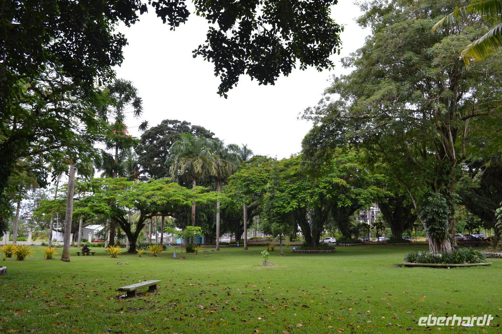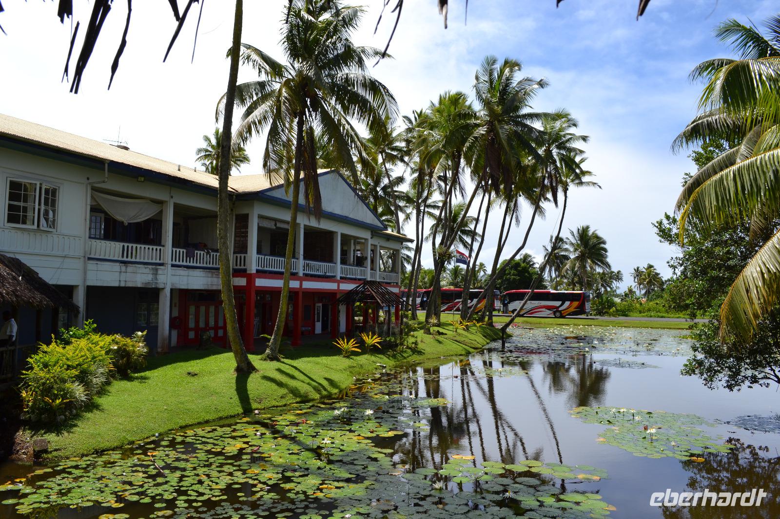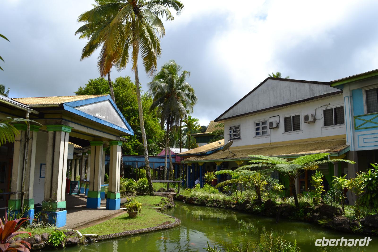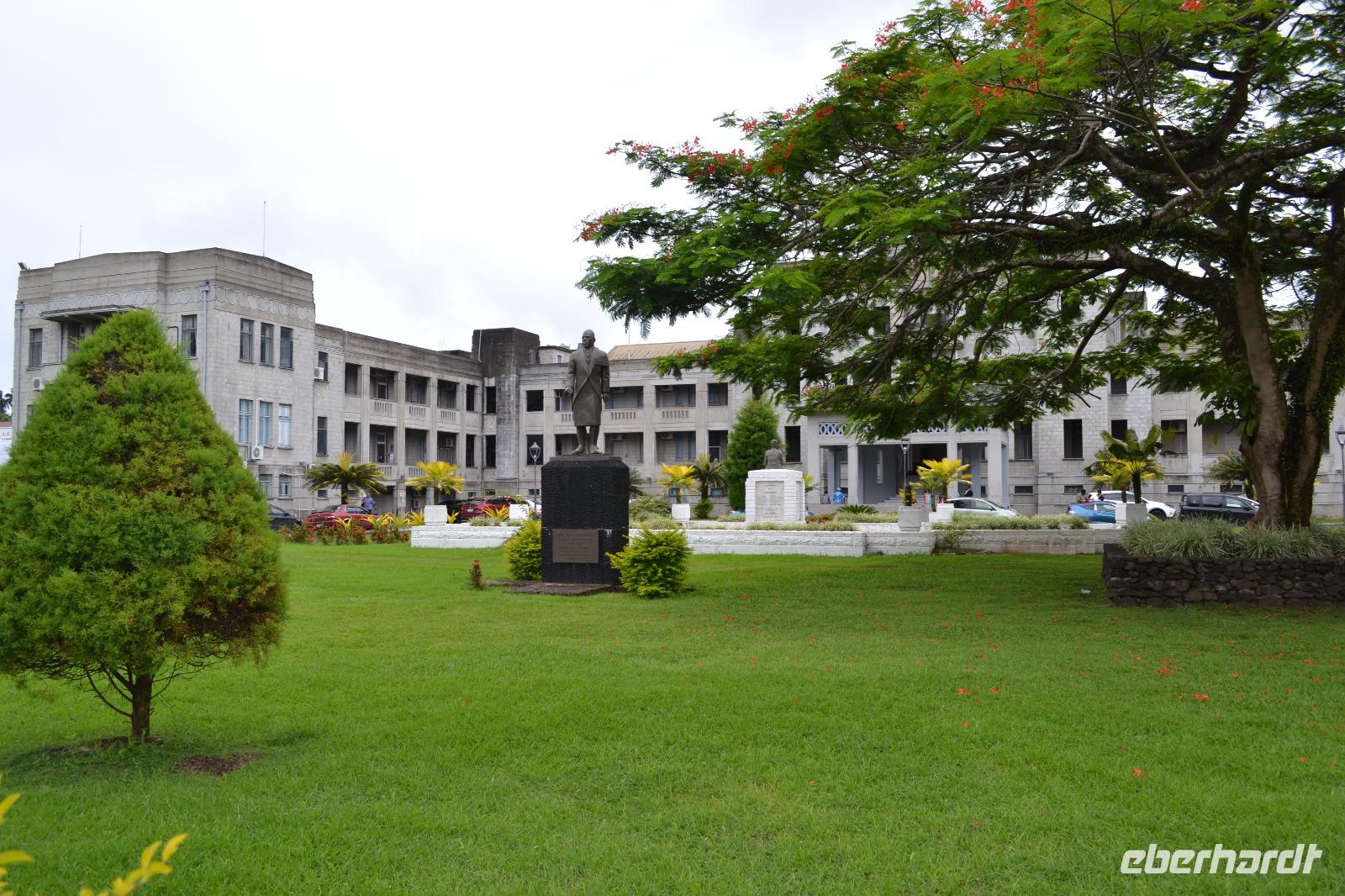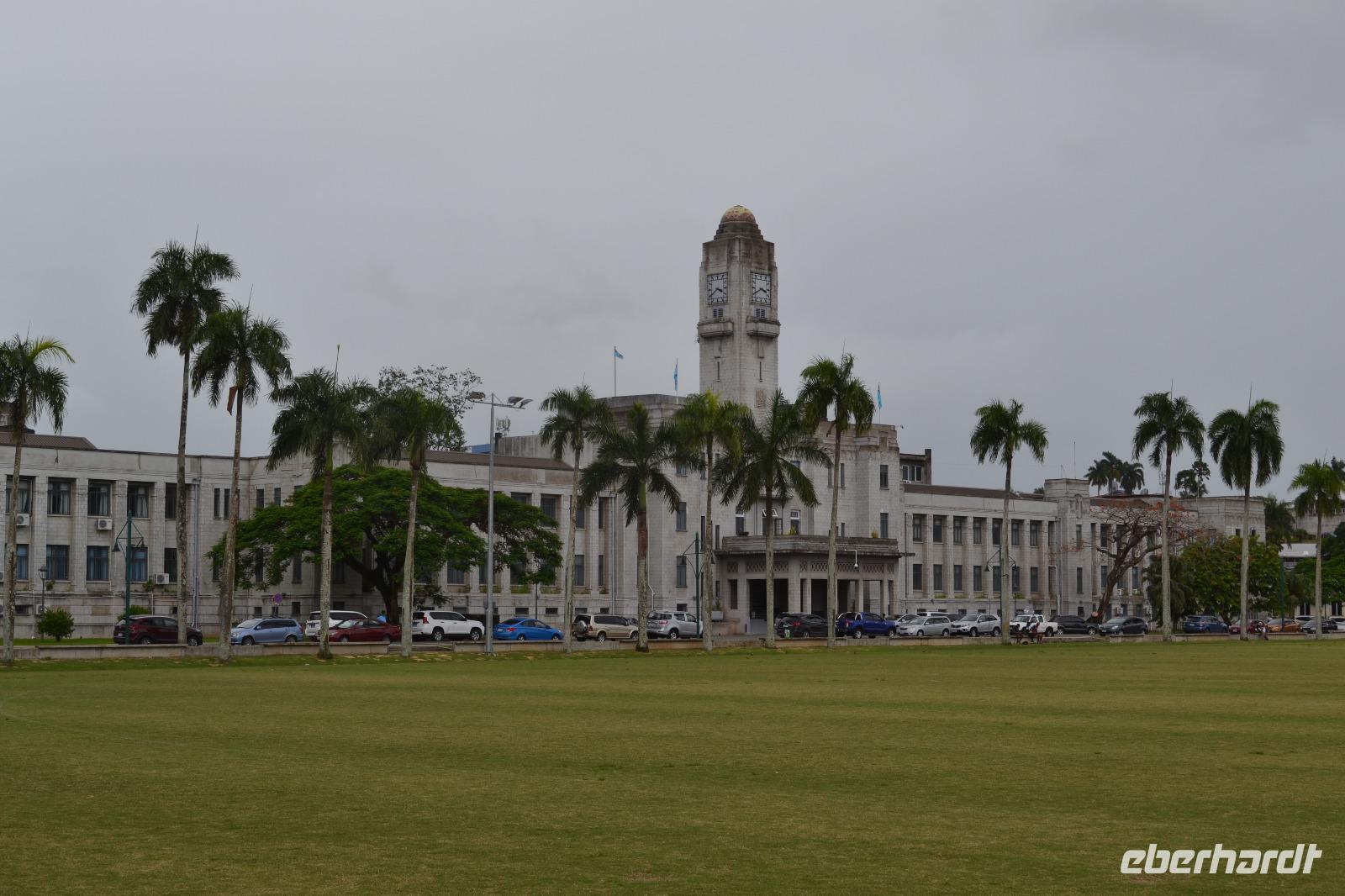 Nicht nur vom Wetter her unterscheidet sich unser zweiter Stopp in Fidschi deutlich vom gestrigen. Die Sun Princess legt heute in Suva, der Hauptstadt, an. Wir können direkt von Bord gehen und müssen nicht in ein Tenderboot umsteigen. Wir unternehmen geschlossen als Gruppe einen Ausflug zum Arts Village, einem Künstlerdorf etwas außerhalb, denn wir wollen die berühmten Feuerläufer von Fidschi sehen. Die Fahrt vorbei an der Brauerei, am Gefängnis, einem mit chinesischen Geldern finanzierten Krankenhaus, einer Polizeistation am Straßenrand und ein paar Dörfern dauert gut eine Stunde und gewährt uns Einblicke in das alltägliche Leben der Bevölkerung. Im Künstlerdorf werden wir mit Trommelwirbel und Muschelketten begrüßt und können uns dann erstmal umschauen. Unter musikalischer Begleitung werden wir dann in das Freilufttheater geführt, wo die abwechslungsreiche Show beginnt. Die Feuerläufer kommen von einer vorgelagerten Insel und tragen in sich die Fähigkeit, über heiße Steine laufen zu können - ein Talent, das ihnen von den Elfen gewährt wurde. Weiter geht es mit Kriegstänzen und Gesang, und am Ende wird der Überfall durch einen feindlichen Stamm nachgespielt. Auf der Rückfahrt zum Schiff sind wir schon ein bisschen froh, dass der Kannibalismus in Fidschi nicht mehr praktiziert wird, denn getötete Feinde wurden früher von den Siegern verspeist. Heutzutage haben die Einheimischen bei uns Touristen vor allem den Geldbeutel im Visier - wie überall. Zurück in Suva können wir am Nachmittag den großen Markt für Lebensmittel besuchen und eine Handwerksmesse. Ich unternehme nach dem Mittagessen noch einen Spaziergang zum Botanischen Garten, in dem sich auch das Nationalmuseum befindet. Dabei komme ich auch am im Art-deco-Stil errichteten Regierungsgebäude vorbei und durchquere einige kleinere Parks mit einheimischen Pflanzen und Bäumen. Suva wirkt laut, etwas chaotisch und lebendig. Es ist schade, dass der Regen, der heute immer wieder einsetzt, ein bisschen unseren Eindruck und die Stimmung trüben.