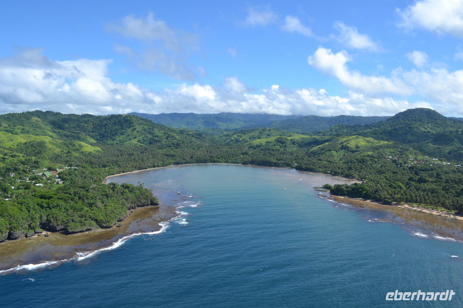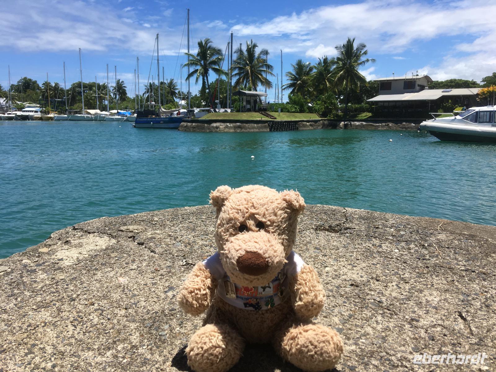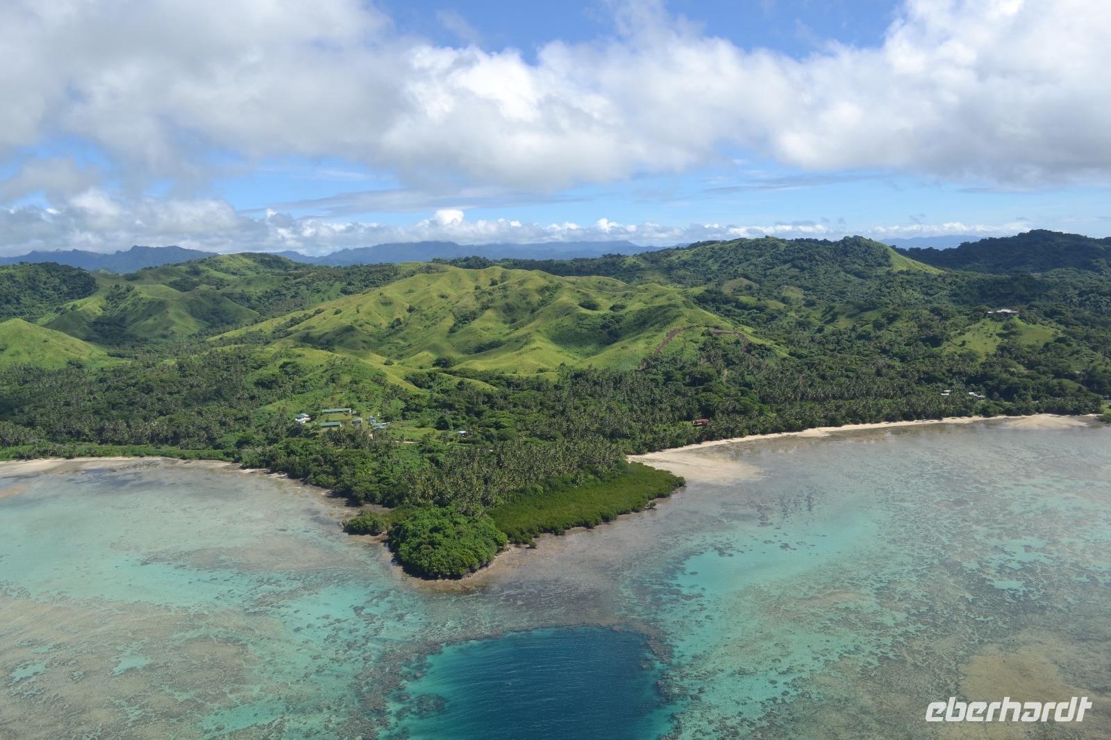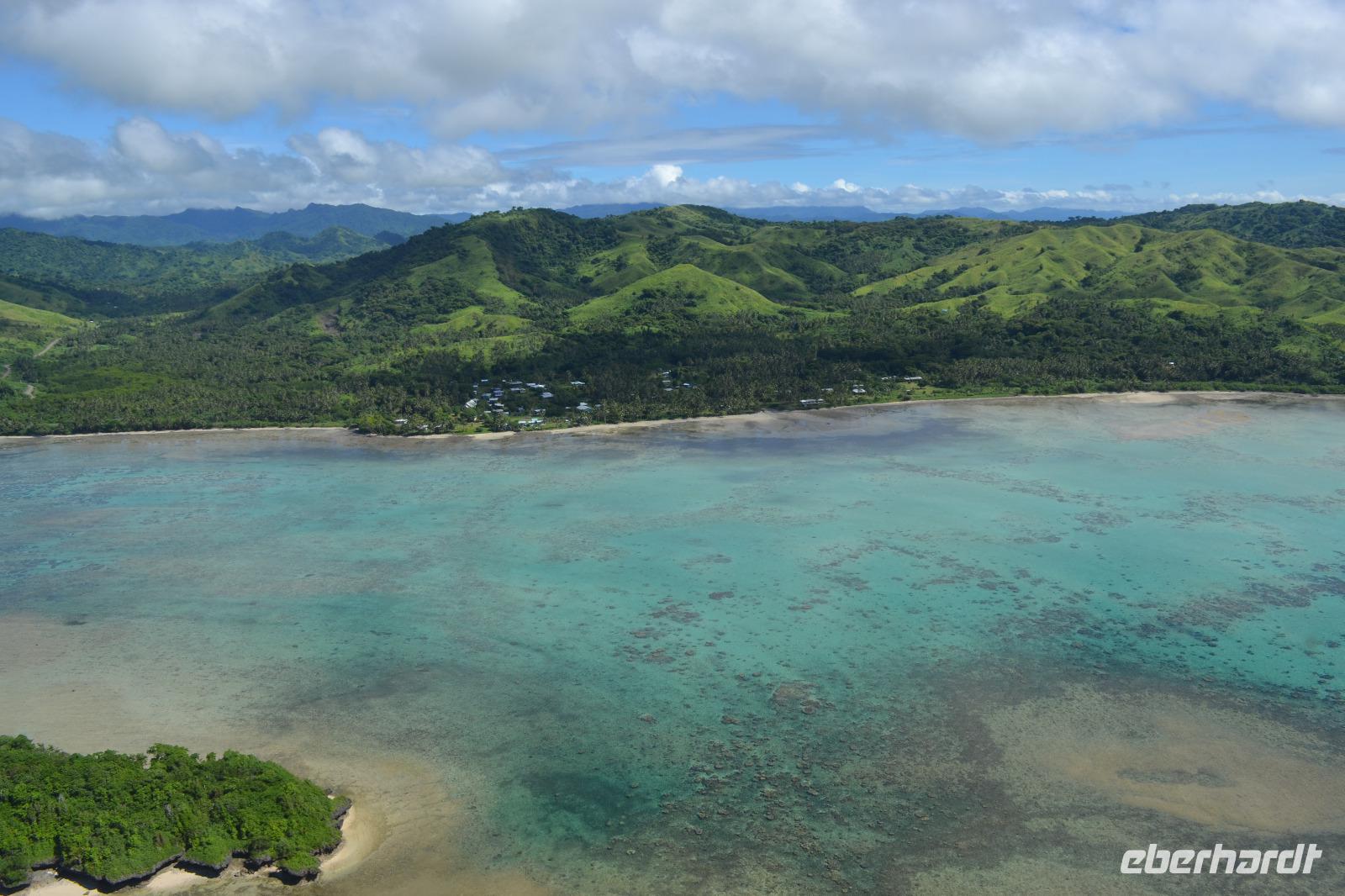 Auf der zweitgrößten Insel, Vanua Levu, steht heute wieder die Natur stärker im Mittelpunkt. Die kleine Stadt Savusavu, vor der die Sun Princess vor Anker liegt, ist deutlich kleiner als Suva und wirkt heller, sauberer und freundlicher. Das mag auch mit am Wetter liegen, denn die Wolken sind wieder verschwunden und die Sonne ist zurück. Die Insel ist vulkanischen Ursprungs und kann leider nicht mit schönen Stränden glänzen, dafür aber mit einem ausgedehnten Korallenriff. Ich habe das Glück, mit meinen Gästen einen Rundflug mit dem Hubschrauber über einen Teil der kaum besiedelten grünen Insel unternehmen zu dürfen. Unsere toughe Pilotin aus England holt uns vom Pier ab und bringt uns zum kleinen Flugplatz. Dann kommt die Waage und damit die Stunde der Wahrheit: wie viele Kilos haben wir in den letzten Tagen schon zugelegt? Die Antwort bleibt natürlich geheim. Mitfliegen dürfen wir zum Glück alle noch, sogar mein kleiner pummeliger Eberhardt-Reisebär. Unsere Pilotin ist ganz locker und achtet auch nicht so genau auf die Zeit. Wir teilen uns in zwei Gruppen auf und mit der zweiten Gruppe fliege ich zuerst an der Küste entlang über das Korallenriff und dann quer über das von dichtem Urwald bedeckte Landesinnere zum Flugplatz zurück. Während des Rückflugs können wir auch Savusavu und unsere Sun Princess von oben sehen. Wieder unten auf festem Boden machen wir noch einen Abstecher zu den heißen Quellen von Savusavu. Kochend heißes Wasser blubbert hier aus der Erde und wird tatsächlich immer noch von einigen Einheimischen zum Garen von Lebensmitteln verwendet. Ich spaziere anschließend noch ein bisschen die Uferstraße entlang, während sich meine Reisegäste in Savusavu auf die Suche nach einem Bierchen begeben. Beim Abendessen - die Sun Princess fährt schon wieder zurück zur Hauptinsel - berichten mir vier Gäste dann von ihrem Landausflug in ein traditionelles Dorf. Auch sie klingen begeistert von ihrem Tag auf Vanua Levu. Die Teilnahme an der Kava-Zeremonie (bzw. das Getränk) haben sie vorsichtshalber ausgeschlagen. Es soll wie Abwaschwasser schmecken, hat aber eine berauschende Wirkung.
