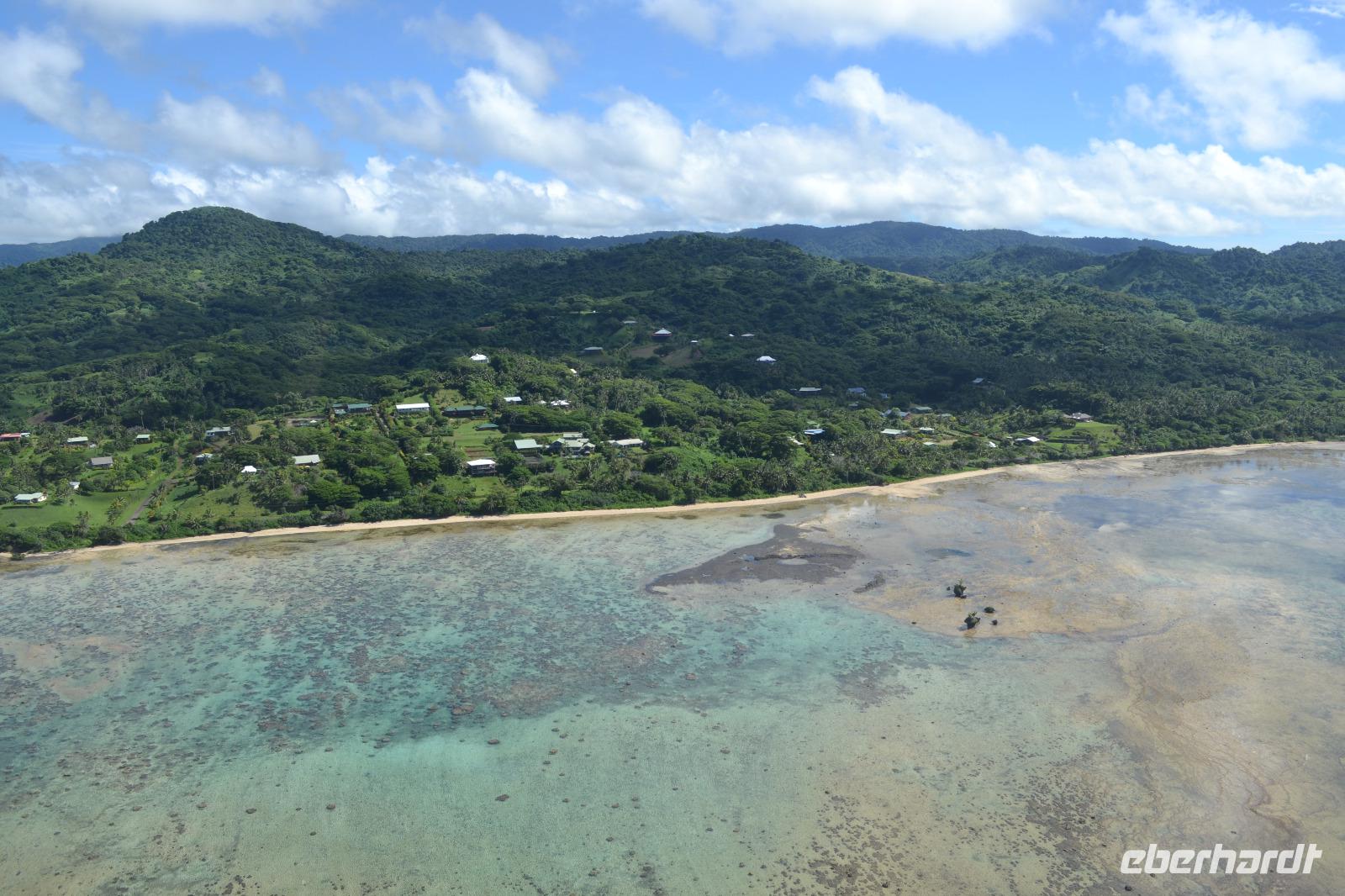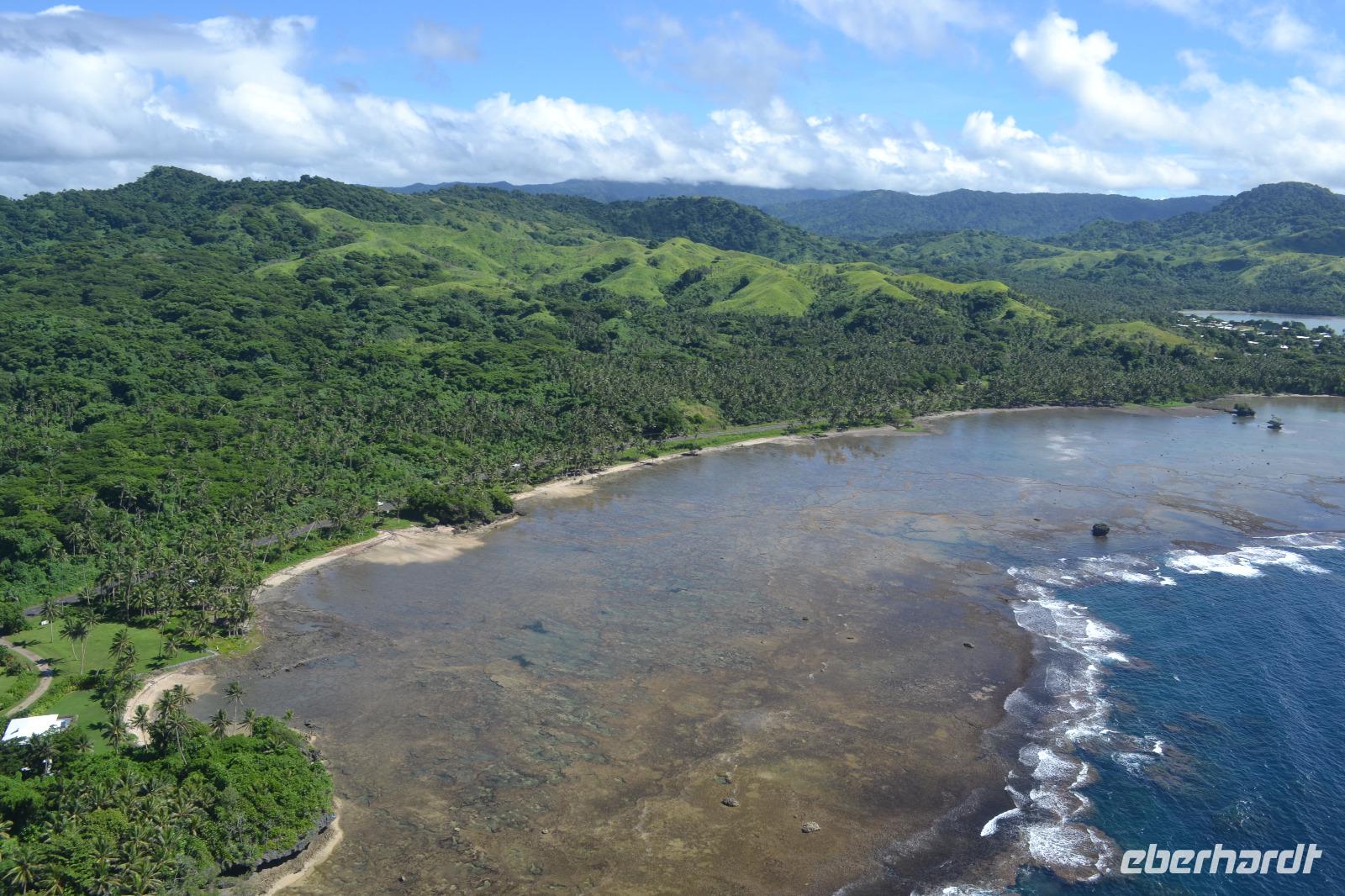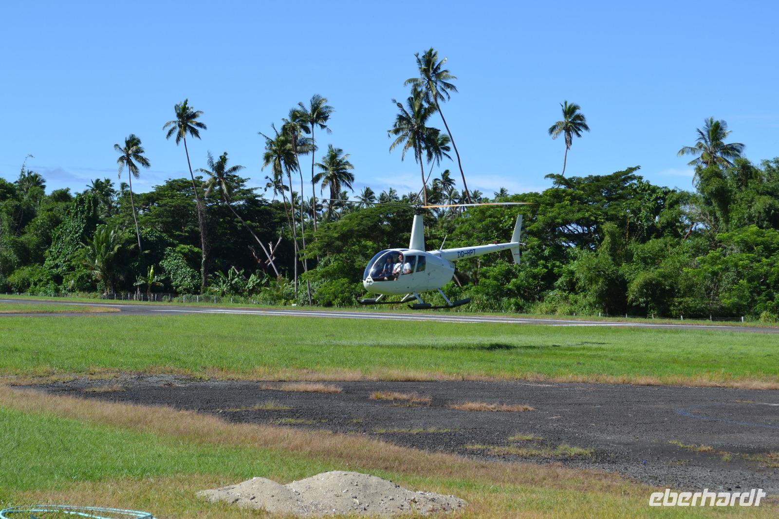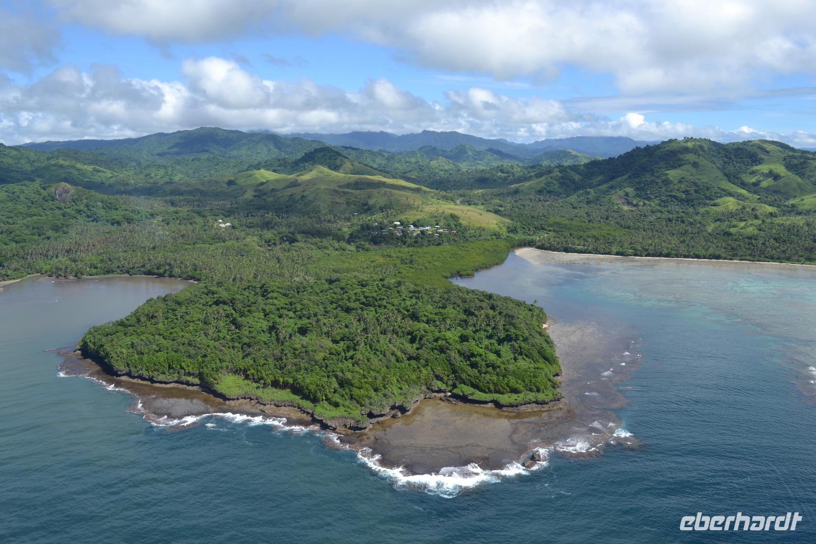 Auf der zweitgrößten Insel, Vanua Levu, steht heute wieder die Natur stärker im Mittelpunkt. Die kleine Stadt Savusavu, vor der die Sun Princess vor Anker liegt, ist deutlich kleiner als Suva und wirkt heller, sauberer und freundlicher. Das mag auch mit am Wetter liegen, denn die Wolken sind wieder verschwunden und die Sonne ist zurück. Die Insel ist vulkanischen Ursprungs und kann leider nicht mit schönen Stränden glänzen, dafür aber mit einem ausgedehnten Korallenriff. Ich habe das Glück, mit meinen Gästen einen Rundflug mit dem Hubschrauber über einen Teil der kaum besiedelten grünen Insel unternehmen zu dürfen. Unsere toughe Pilotin aus England holt uns vom Pier ab und bringt uns zum kleinen Flugplatz. Dann kommt die Waage und damit die Stunde der Wahrheit: wie viele Kilos haben wir in den letzten Tagen schon zugelegt? Die Antwort bleibt natürlich geheim. Mitfliegen dürfen wir zum Glück alle noch, sogar mein kleiner pummeliger Eberhardt-Reisebär. Unsere Pilotin ist ganz locker und achtet auch nicht so genau auf die Zeit. Wir teilen uns in zwei Gruppen auf und mit der zweiten Gruppe fliege ich zuerst an der Küste entlang über das Korallenriff und dann quer über das von dichtem Urwald bedeckte Landesinnere zum Flugplatz zurück. Während des Rückflugs können wir auch Savusavu und unsere Sun Princess von oben sehen. Wieder unten auf festem Boden machen wir noch einen Abstecher zu den heißen Quellen von Savusavu. Kochend heißes Wasser blubbert hier aus der Erde und wird tatsächlich immer noch von einigen Einheimischen zum Garen von Lebensmitteln verwendet. Ich spaziere anschließend noch ein bisschen die Uferstraße entlang, während sich meine Reisegäste in Savusavu auf die Suche nach einem Bierchen begeben. Beim Abendessen - die Sun Princess fährt schon wieder zurück zur Hauptinsel - berichten mir vier Gäste dann von ihrem Landausflug in ein traditionelles Dorf. Auch sie klingen begeistert von ihrem Tag auf Vanua Levu. Die Teilnahme an der Kava-Zeremonie (bzw. das Getränk) haben sie vorsichtshalber ausgeschlagen. Es soll wie Abwaschwasser schmecken, hat aber eine berauschende Wirkung.