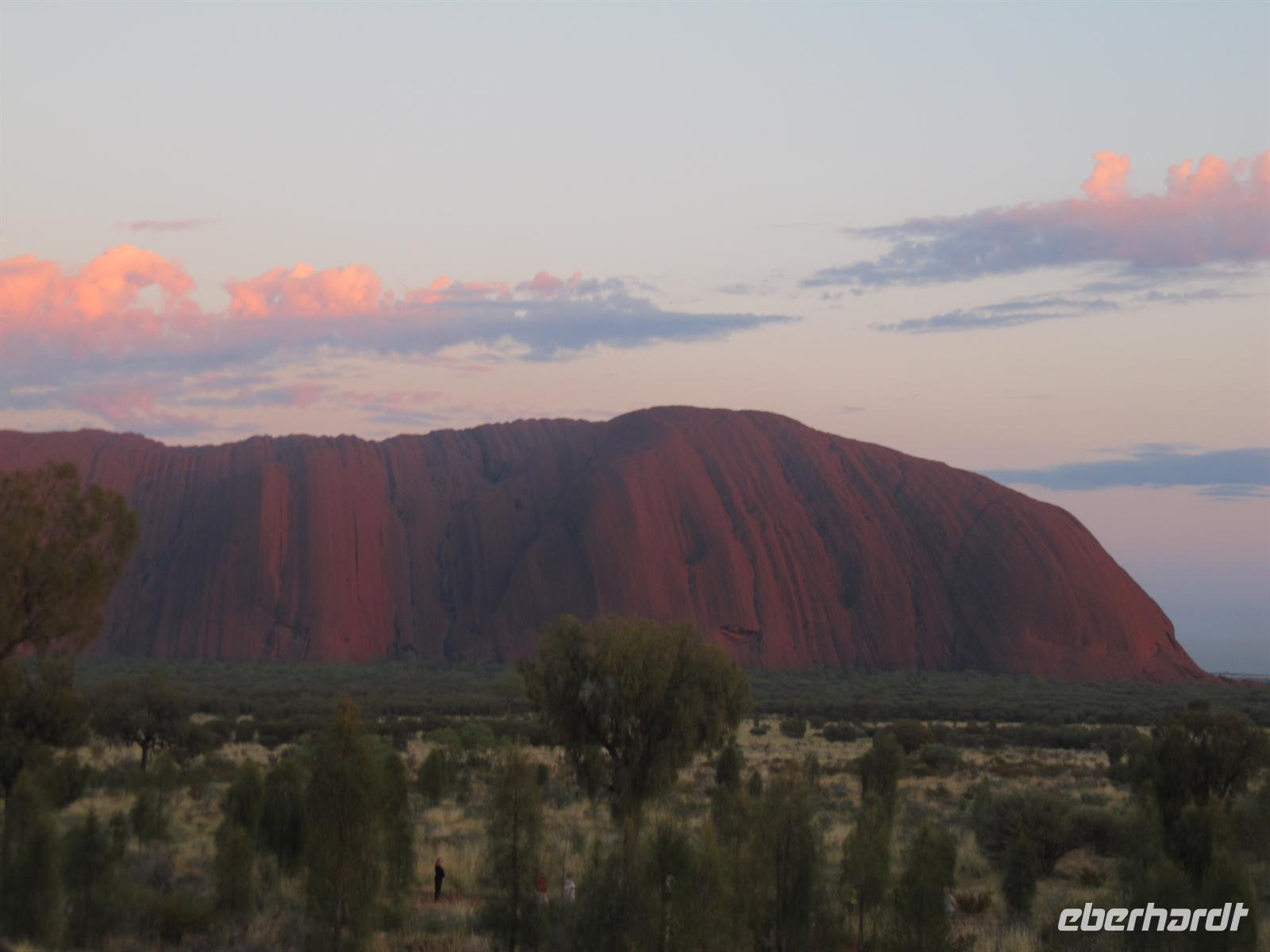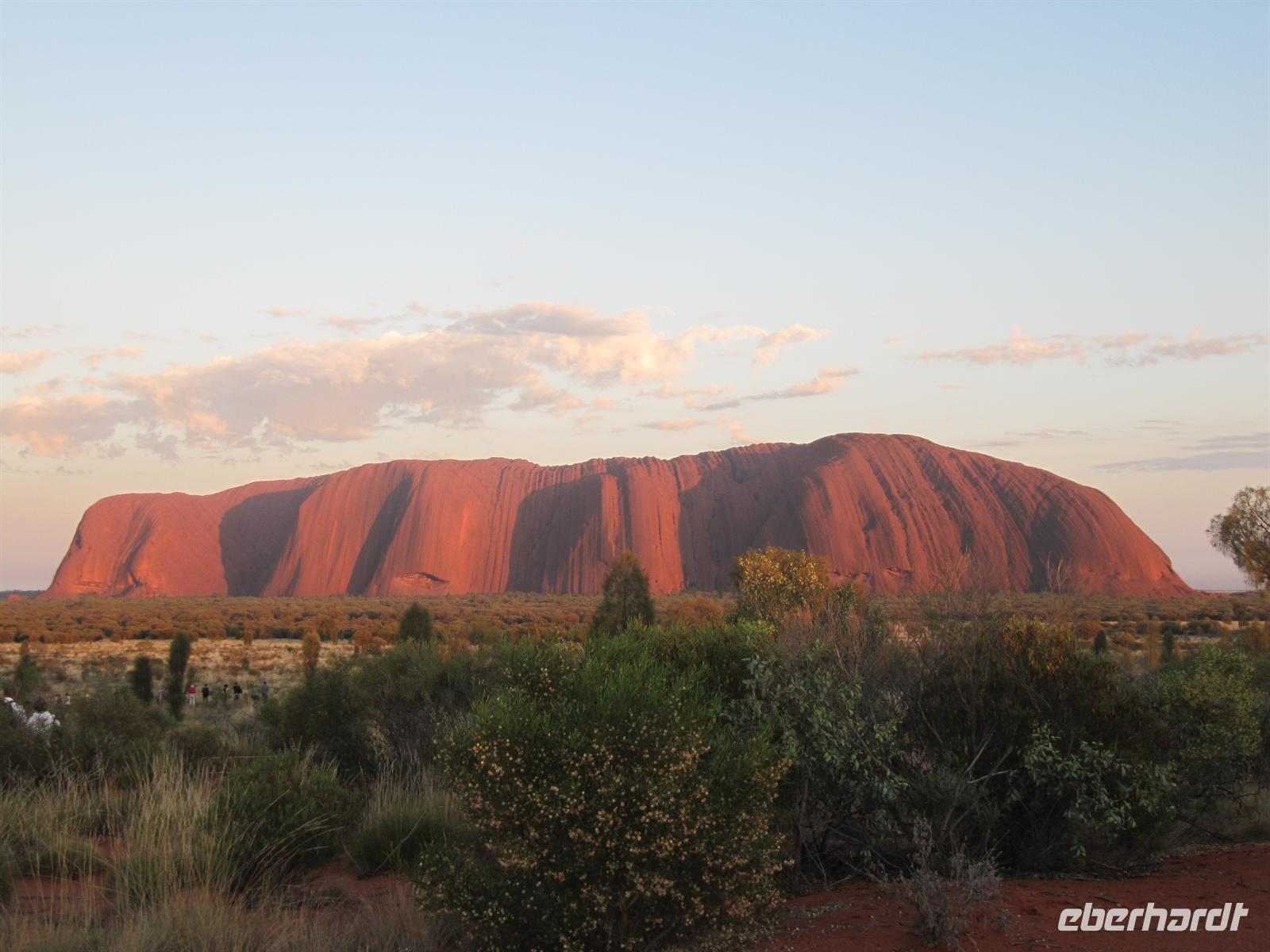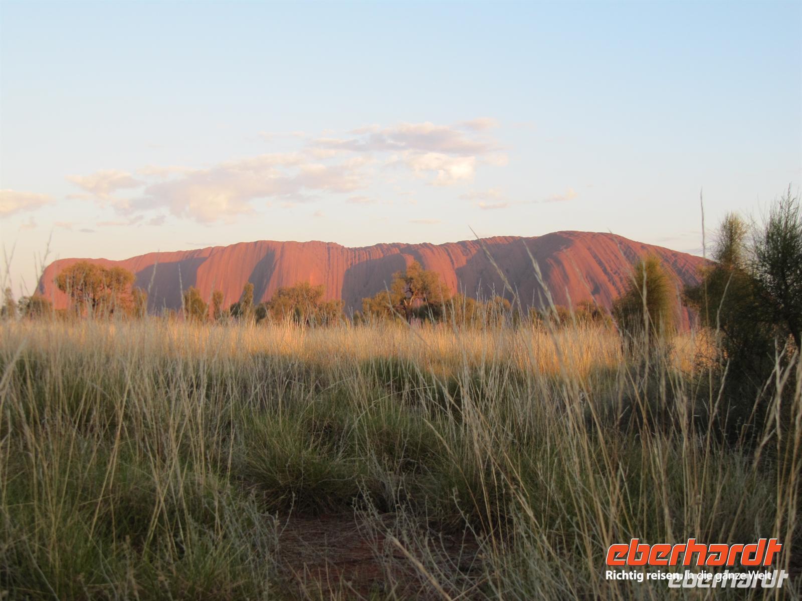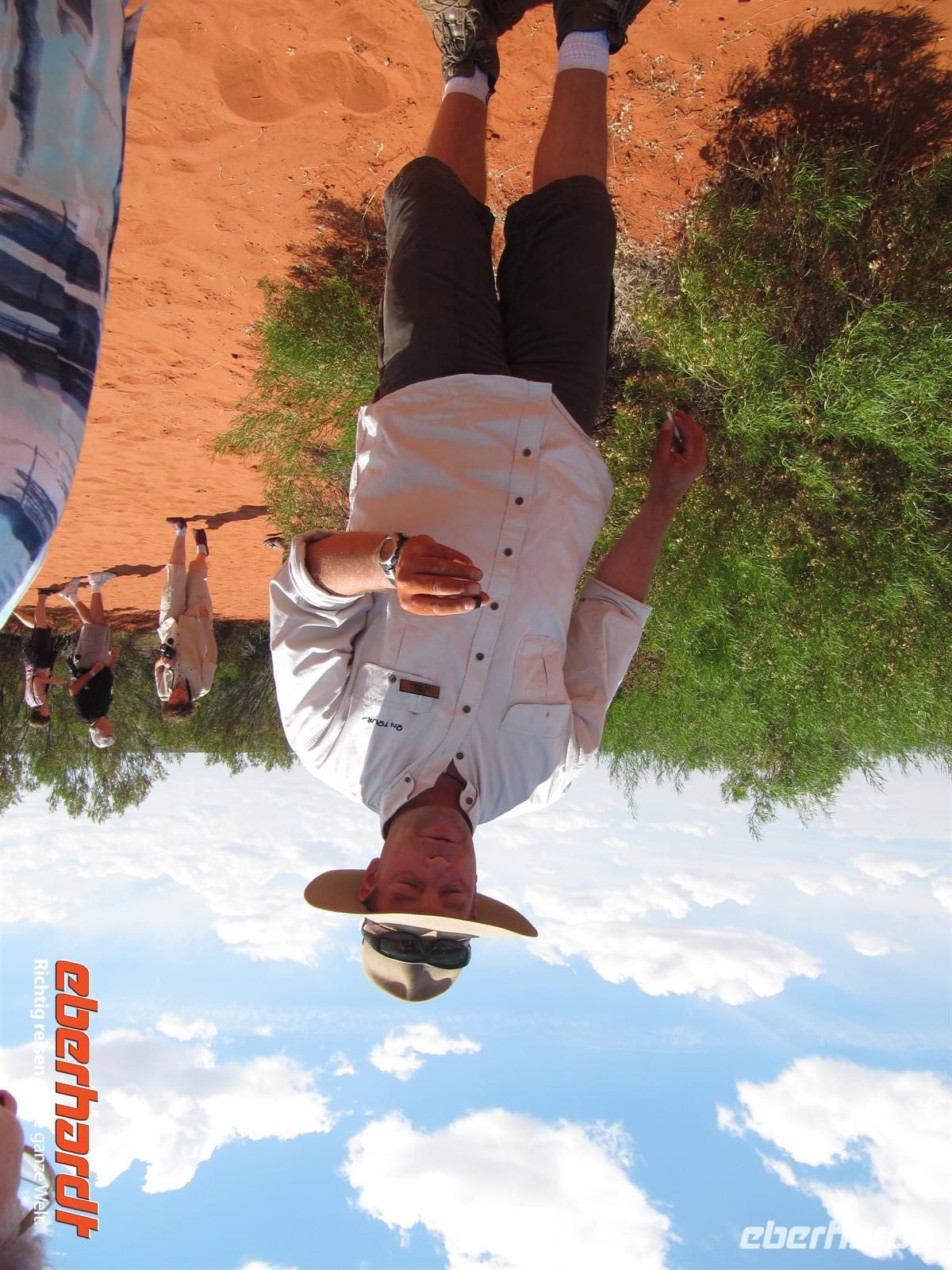 Mitten ins Nirgendwo - auf ins Outback! Über den Stuart Highway, nach dem Expeditionsleiter Stuart, der sich auf machte um den besten Ort für eine Telegraphenstation zu suchen, ging es über ewige weiten Richtung Süden nach Ayers Rock. An unserem ersten Stopp erfuhren wir mehr über die Kamele, wie sie nach Australien kamen und wie sie heute noch genutzt werden. Auf einer Kamelfarm erwarteten uns die freundlich drein schauenden Tiere, auch ein Dingo, ein Emu und einige Kängurus erwarteten uns. Nach fast 200 Kilometern bogen wir dann einmal rechts ab und Poowww, da platzte einer der Reifen. Mitten im Outback legten wir eine ungeplante Pause ein. Doch unser Fahrer meisterte die Situation souverän und so ging es schnell mit einem neuen Reifen weiter. Da war es endlich soweit, der heilige Berg, der Uluru zeigte sich hinter den Sanddünen. Nach nur einem kurzen Stopp in unserem Resort machten wir uns auf den Weg in den Nationalpark. Auf dem Weg zu den Olgas erfuhren wir von unserem Guide Jörg so einiges über die Ureinwohner, Ihre Sitten und Geschichten. Bevor wir weiter zu Sonnenuntergang am Ayers Rock fuhren, wanderten wir ein Stück in die Schluchten der Olgas. Am Uluru erwartete uns dann ein erheiterndes Gläschen Sekt und ein bevorstehendes Farbenspiel beim Untergang der Sonne. Am Abend durften wir selbst an Grillstationen unser Abendessen zubereiten - urig, exotisch, Outback Gefühl pur.