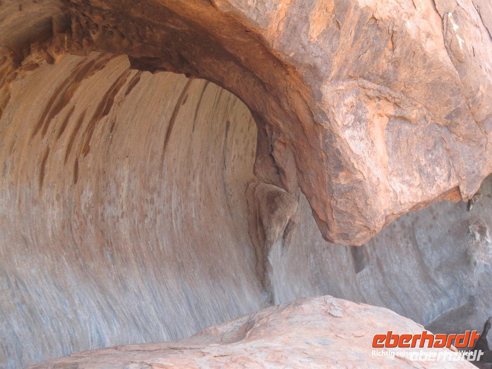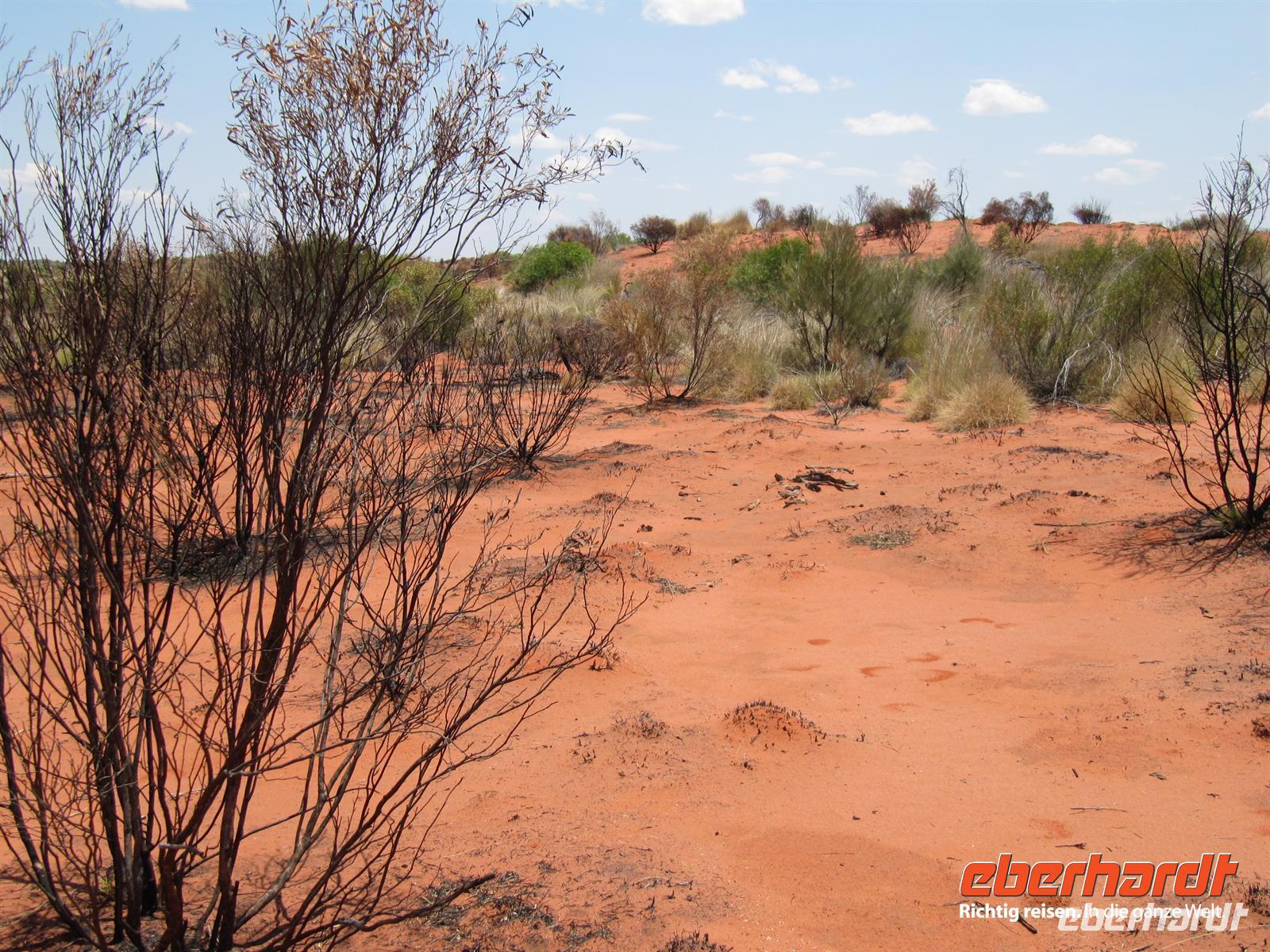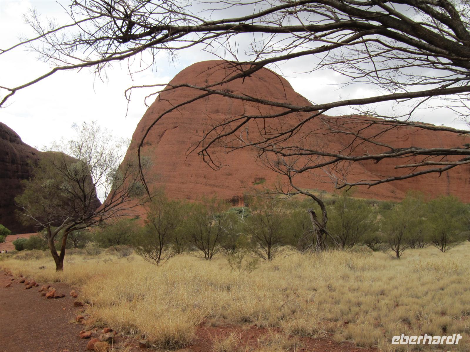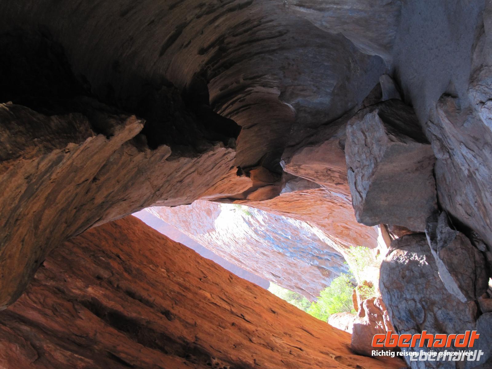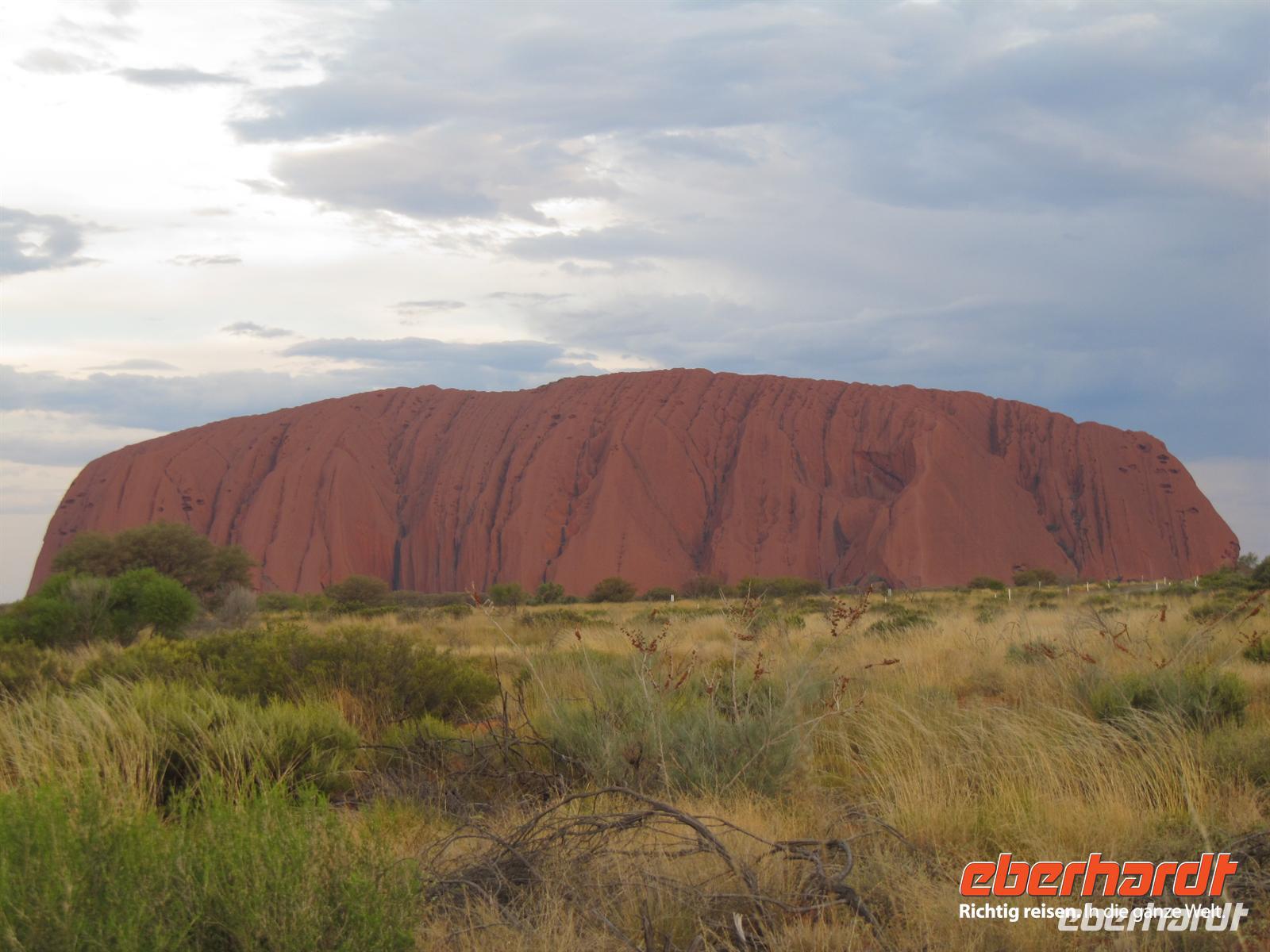 Mitten ins Nirgendwo - auf ins Outback! Über den Stuart Highway, nach dem Expeditionsleiter Stuart, der sich auf machte um den besten Ort für eine Telegraphenstation zu suchen, ging es über ewige weiten Richtung Süden nach Ayers Rock. An unserem ersten Stopp erfuhren wir mehr über die Kamele, wie sie nach Australien kamen und wie sie heute noch genutzt werden. Auf einer Kamelfarm erwarteten uns die freundlich drein schauenden Tiere, auch ein Dingo, ein Emu und einige Kängurus erwarteten uns. Nach fast 200 Kilometern bogen wir dann einmal rechts ab und Poowww, da platzte einer der Reifen. Mitten im Outback legten wir eine ungeplante Pause ein. Doch unser Fahrer meisterte die Situation souverän und so ging es schnell mit einem neuen Reifen weiter. Da war es endlich soweit, der heilige Berg, der Uluru zeigte sich hinter den Sanddünen. Nach nur einem kurzen Stopp in unserem Resort machten wir uns auf den Weg in den Nationalpark. Auf dem Weg zu den Olgas erfuhren wir von unserem Guide Jörg so einiges über die Ureinwohner, Ihre Sitten und Geschichten. Bevor wir weiter zu Sonnenuntergang am Ayers Rock fuhren, wanderten wir ein Stück in die Schluchten der Olgas. Am Uluru erwartete uns dann ein erheiterndes Gläschen Sekt und ein bevorstehendes Farbenspiel beim Untergang der Sonne. Am Abend durften wir selbst an Grillstationen unser Abendessen zubereiten - urig, exotisch, Outback Gefühl pur.