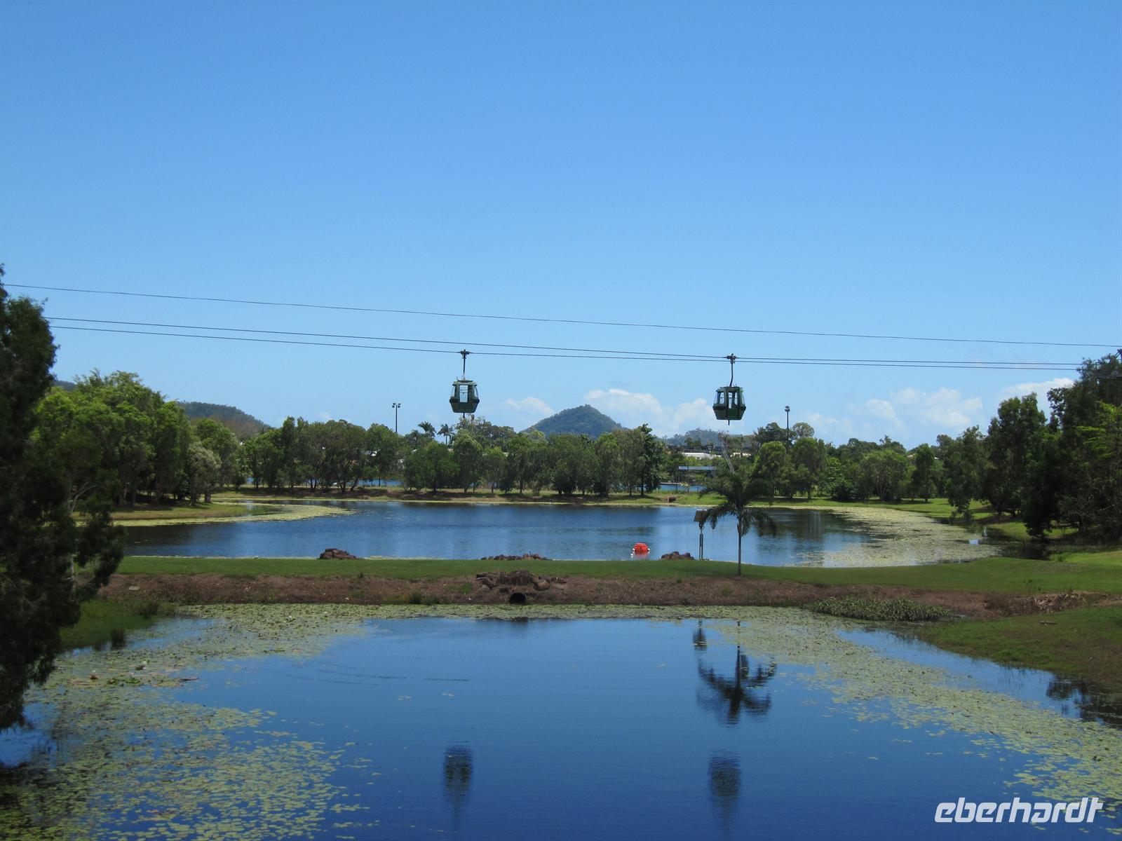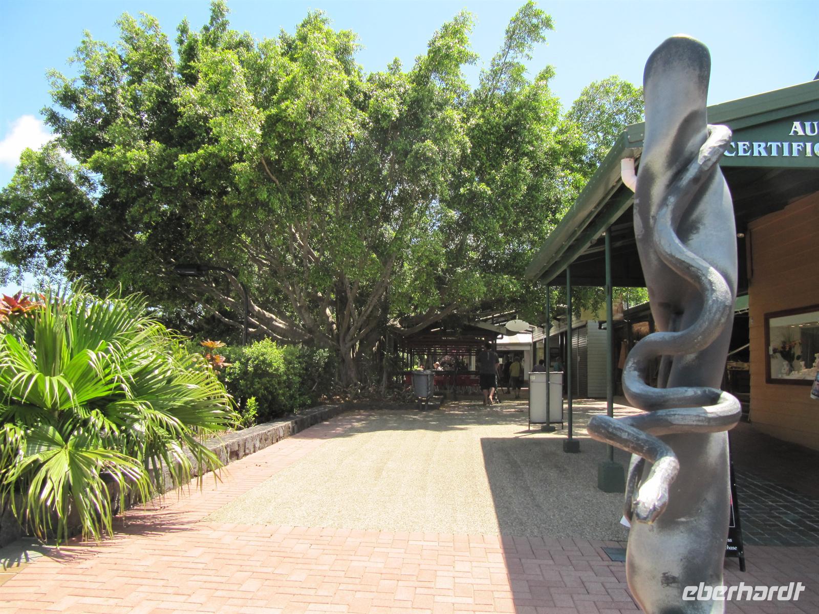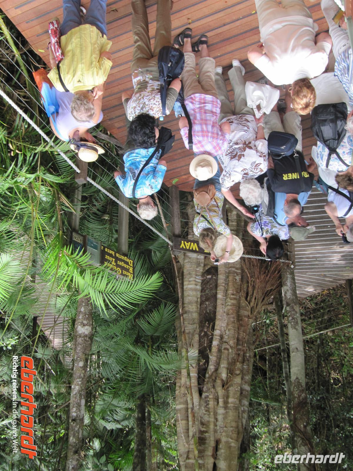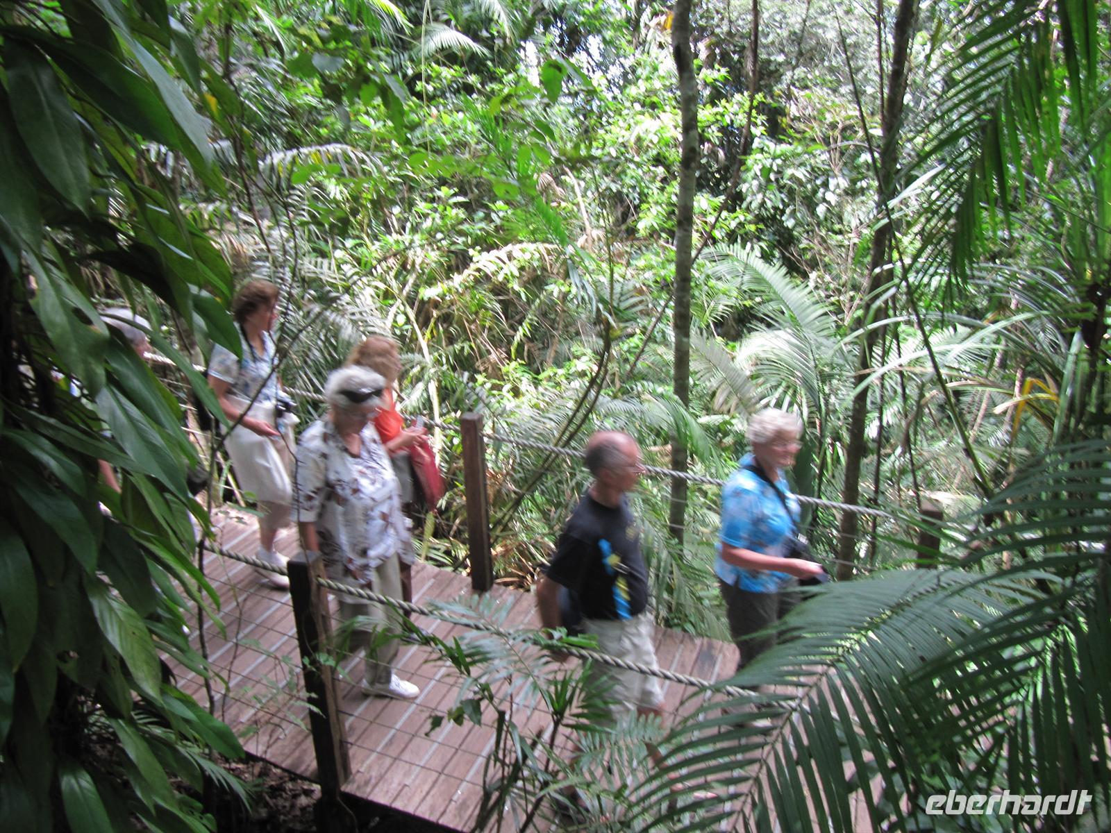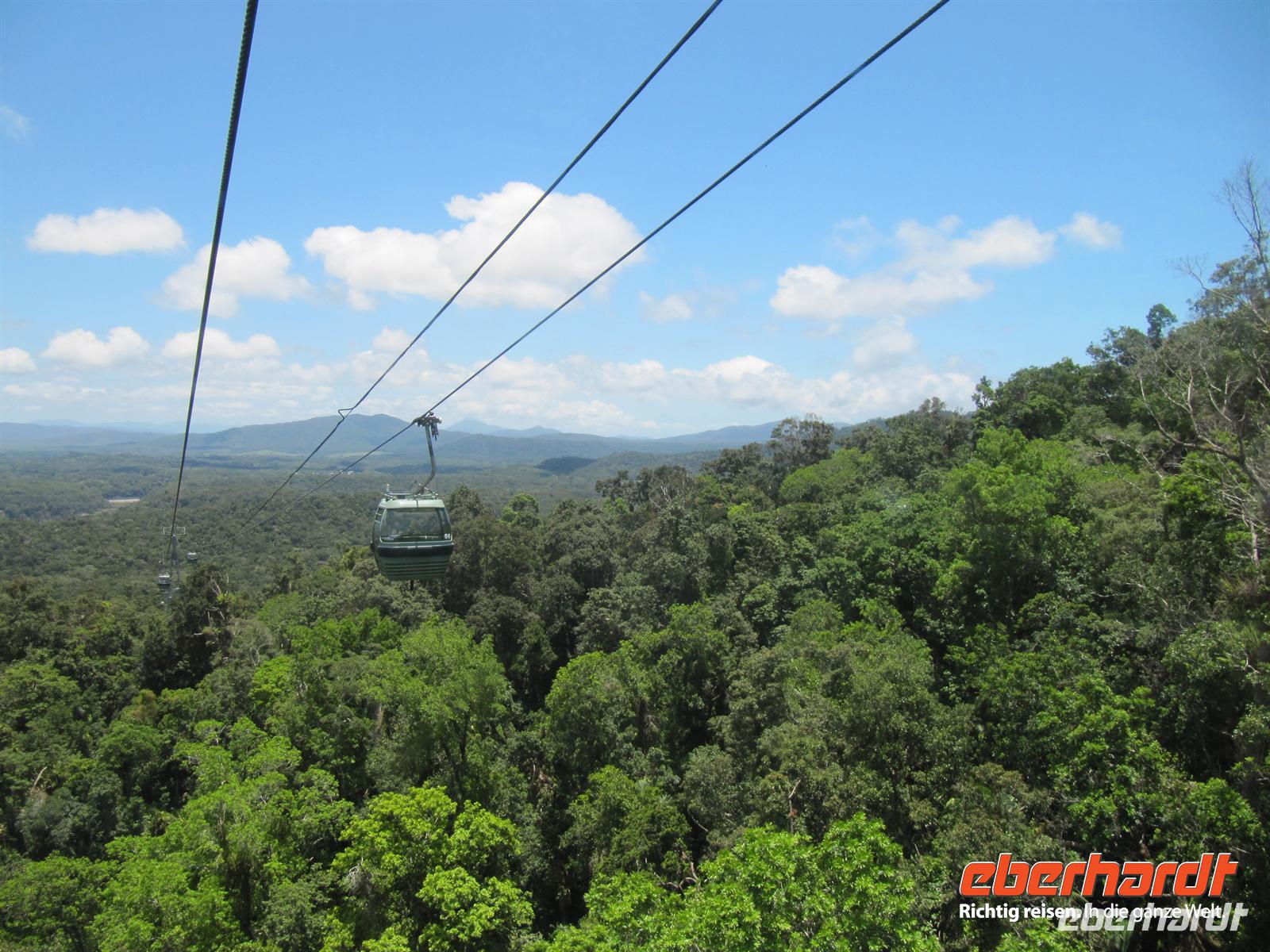 Auch heute verschaffte uns das leckere Frühstücksbuffet einen guten Start in den Tag. Den Vormittag widmeten wir wieder der Kultur der Ureinwohner. Im Kulturzentrum der Aboriniges hörten wir den Klängen des Didergidoospielers. Anschließend besuchten wir ein visuell, raffiniert gemachtes Theaterstück, welches die Entstehungsgeschichte Australiens aus dem Blickwinkel der Ureinwohner zeigt. In der Außenanlage des Kulturzentrums erwartete uns eine Show mit traditionellen Tänzen. Bei dem Versuch einen Boomerang wieder zurück kommen zu lassen haben viele unserer Gäste Talent bewiesen. Wäre unsere Sippe jedoch auf die Beute der Sperrwerfer angewiesen, wäre es nicht so gut um uns bestellt. Nach einem eindrucksvollen und heiteren Vormittag im Aborigines Kultuzentrum fuhren wir mit der weltweit längsten Gondelbahn über die Dächer des Regenwaldes nach Kuranda. 7,5 Kilometer lang eröffnete sich uns ein einmaliger Blick über die Flora des Regenwaldes, die Schluchten und die hügelige Landschaft. Im Bergdorf Kuranda angekommen spazierten wir entlang der Hauptstrasse des Örtchens - gesäumt von vielen Cafés, Restaurants, Souvenirsläden und bunten Gallerien. Hier verbrachten wir etwas Freizeit bevor wir die größte Schmetterlingsfarm des südlichen Hemisphäre besuchen würden. Am frühen Nachmittag fuhren wir mit der Kuranda Scenic Railway hinab ins Tal. Die Aussichtsbahn fuhr entlang des Barron Flusses, des Barron Wasserfalles durch zahlreiche Tunnel hinunter nach Cairns. Nach einem leckeren Abendessen im Hotel spazierten wir zum Nachtmarkt von Cairns. Bis 23.00 Uhr werden hier allerlei Waren aus der Umgebung, Souvenirs, Schmuck und Kunsthandwerk angeboten.