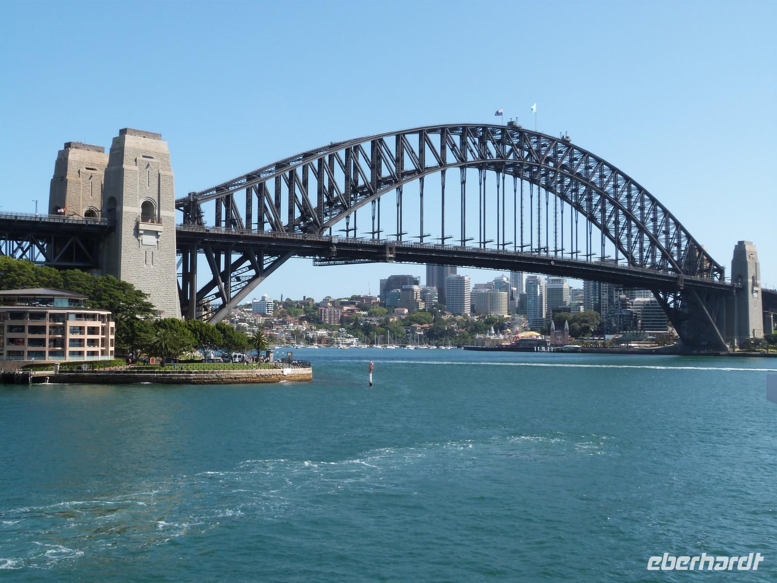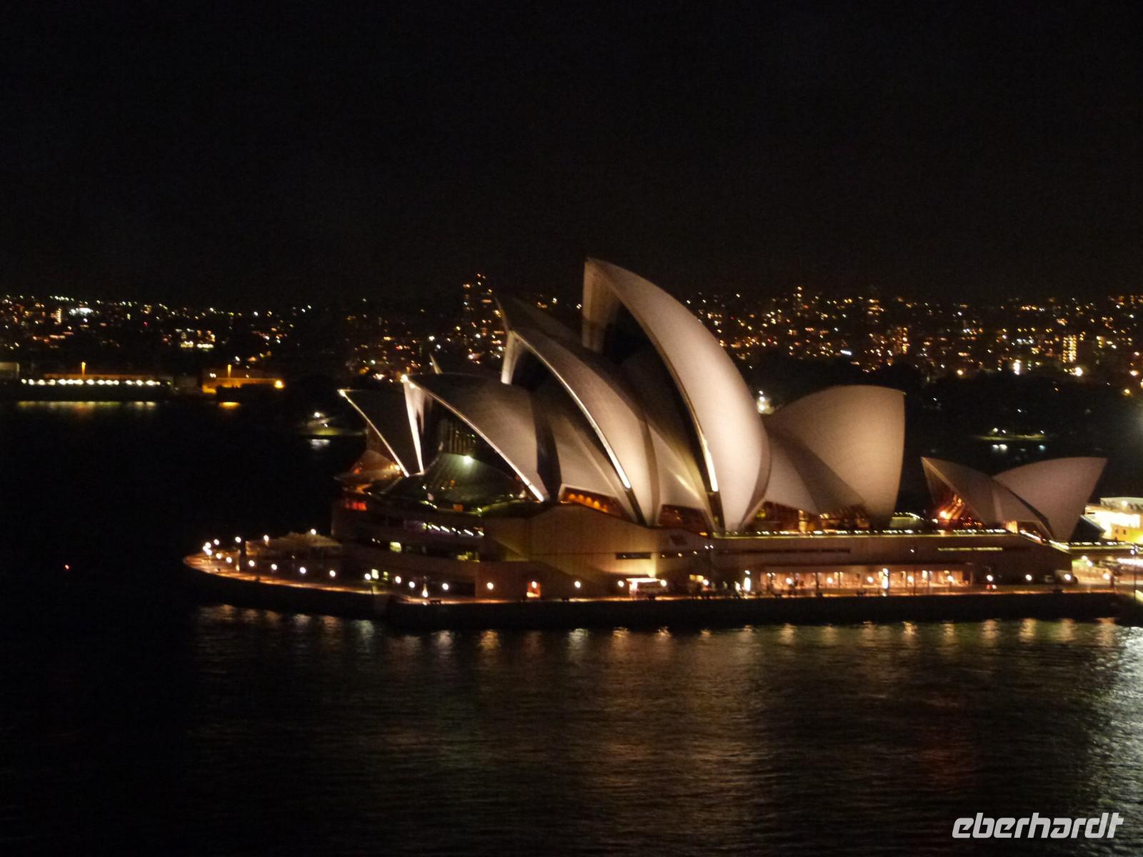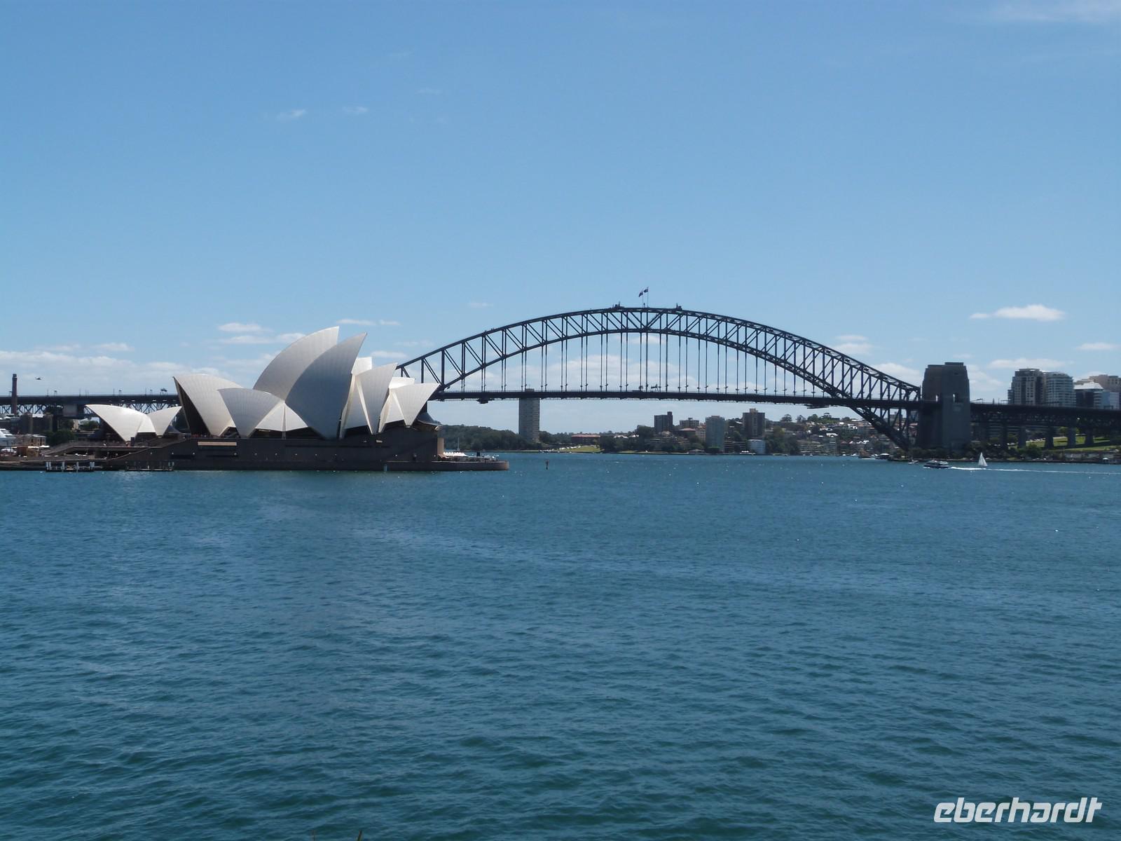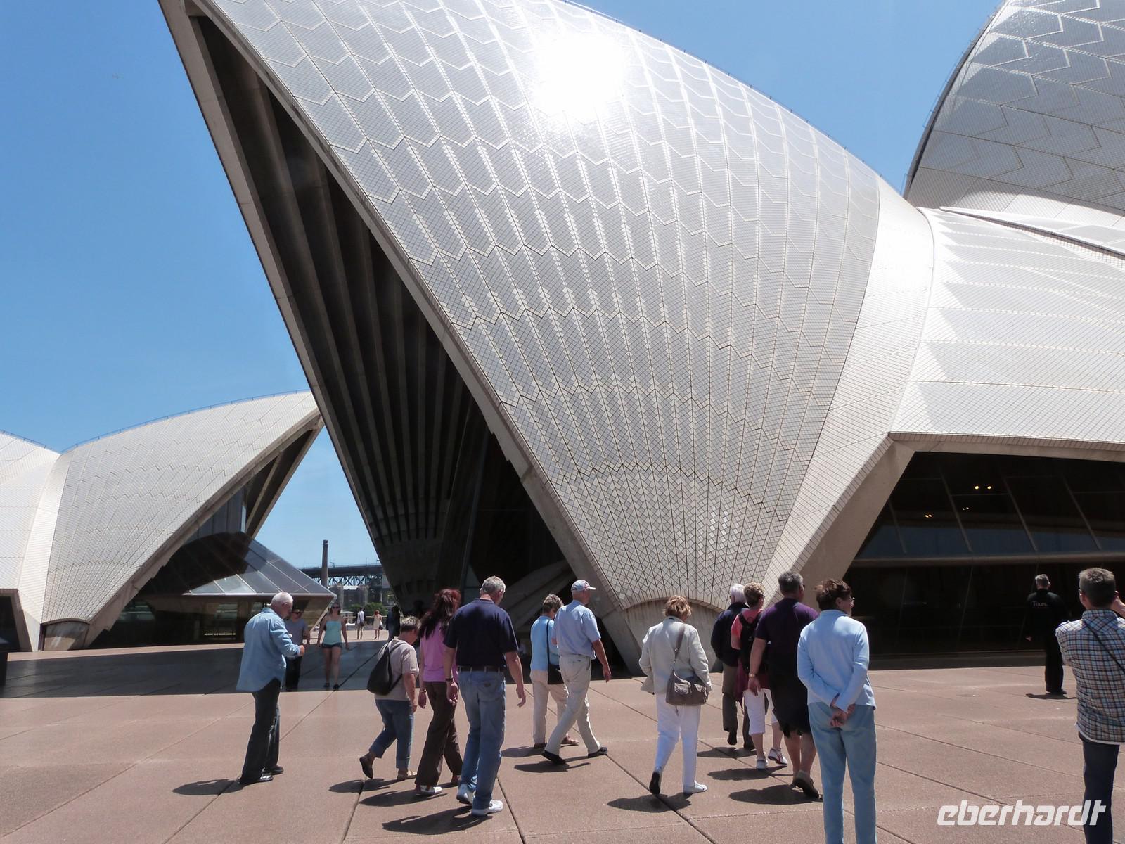2- stündigen-Fahrt hatten wir wieder Land unter den Füßen und wir liefen zum legendären Opernhaus. 1957 gewann der dänische Architekt Jörn Utzon den Wettbewerb zur Gestaltung des Opernhauses. Während der ersten Jahre entstanden jedoch technische Probleme, die die Bauzeit verlängerten und die Kosten explodieren ließen. Nach 7 Jahren Bauzeit stieg Jörn Utzon aus dem Projekt aus und verließ Australien. Mittels einer Opernhaus-Lotterie wurden zusätzliche Spendengelder aufgebracht und das Architekturwunder konnte nach 14 Jahren und ca. 102 Mio. Australische Dollar beendet werden. 2004 wurde nach Plänen vom Architekt Jörn Utzon die Eingangshalle gestaltet. Das Opernhaus heute ist kein reines Opernhaus, sondern beinhaltet neben dem „Opera Theater" auch noch die „Konzerthalle", das „Drama Theater", das „Playhouse" und verschiedene Musikstudios. Bei einer interessanten Führung konnten wir uns die verschiedenen Säle ansehen. Am Nachmittag hatten wir Freizeit und die Mehrheit der Gruppe lief mit mir durch den „Königlichen Botanischen Garten", entlang des Palmenhauses und weiter vorbei an australischen Pflanzen. Verschiedene Farne und Palmen sowie Bananenstauden begleiteten uns auf unserem Weg. Als wir am Ende des Gartens ankamen, liefen wir am „Sydney Tower" vorbei und kamen zu den Einkaufsstraßen George Street und Pitt Street. Dort flanierten wir an edlen Boutiquen vorbei und kamen am Bankenviertel der Stadt vorbei. Am Wolkenkratzer „Summit O" hielten wir und fuhren in das dortige Drehrestaurant hinauf. Von da aus hatten wir einen ganz tollen Blick auf die Stadt Sydney und genossen den Ausblick bei einer Tasse Kaffee. Unser Abendessen nahmen wir heute an der Waterfront in Sydney ein im gleichnamigen Restaurant. Uns wurde Baramundi-Fisch gereicht, einer der Speisefische Australiens. Sehr lecker! Den Abend ließen wir dann bei einem Spaziergang auf der beleuchteten Harbour Bridge ausklingen.