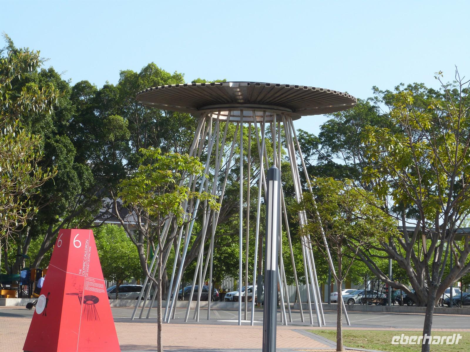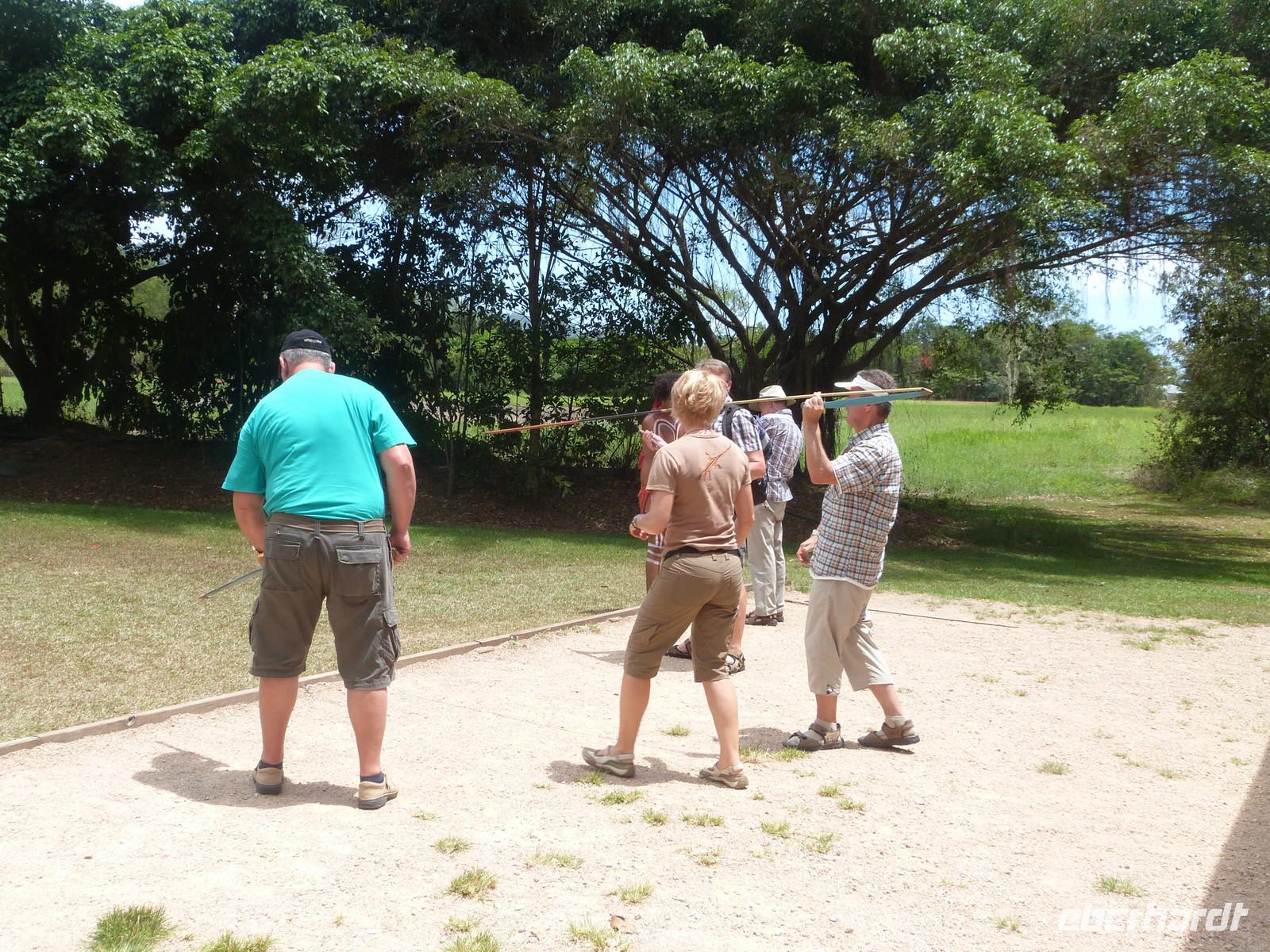 Den heutigen Tag widmeten wir dem Thema: Regenwald in Australien. Wir fuhren in das „Tjapukai Kulturzentrum" und erhielten einen Einblick in die Lebensweise der Regenwaldbewohner. Bei einer Didgeridoo-Show lernten wir Interessantes über dieses Musikinstrument der Ureinwohner kennen. Wussten Sie, daß das Didgeridoo ein Baumstamm ist, der von Termiten ausgehöhlt wurde? Des Weiteren nahmen wir an einer Tanzvorführung der Ureinwohner teil und konnten selbst Bumerang- und Speerwerfen ausprobieren. Wir hatten großen Spaß dabei. Dann ging es mit der Seilbahn oberhalb der Baumgrenze über den Regenwald bis nach Kuranda. Unterwegs stiegen wir kurz aus und liefen ein Stück durch den Regenwald. Die riesen Baumfarne und Kletterpflanzen waren beeindruckend. In Kuranda konnten wir uns die Zeit bei einem Bummel durch den kleinen Ort vertreiben, bevor es mit der historischen Eisenbahn zurück nach Cairns ging. Vorbei an den Barron Falls ging es durch den dichten Wald Richtung Küste. Eine einmalige Bahnreise haben wir erlebt. Am späten Nachmittag kamen wir im Hotel an und gingen nach dem Abendessen noch im kleinen Nachtmarkt von Cairns auf letzte Suche von Mitbringseln für die Daheimgebliebenen.