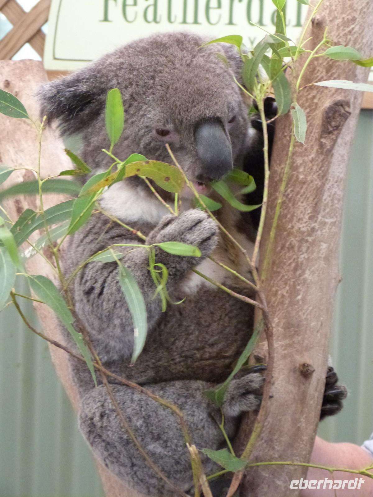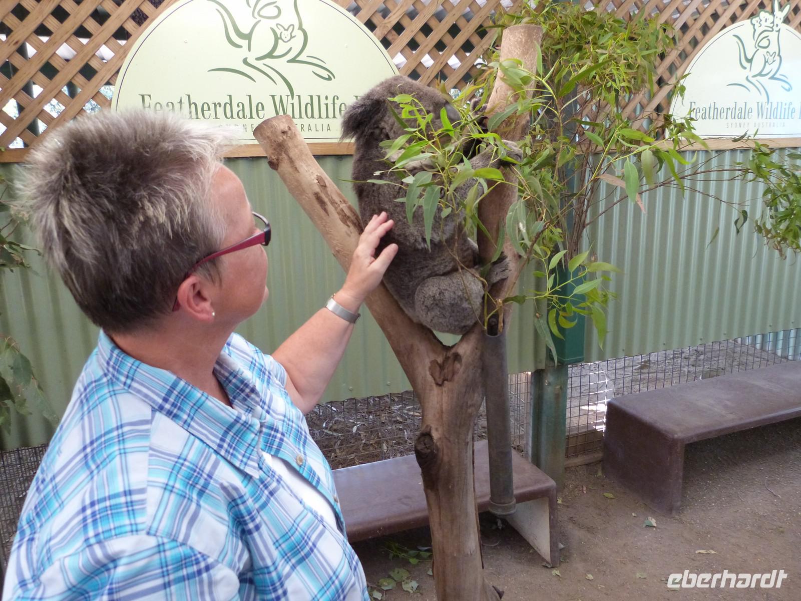 Heute fuhren wir aus der Stadt Sydney hinaus und schauten uns das Hinterland an. Bernd holte uns mit dem Bus am Hotel ab und wir fuhren aus der Stadt raus. Unterwegs stoppten wir am Olympia Zentrum, wo wir uns die Stadien der „Olympischen Sommerspiele 2000" von außen ansahen. Dies war für unsere Sportfans in der Gruppe ein kleiner Höhepunkt der Reise! Selbst die Stelle, wo das Olympische Feuer im Jahr 2000 stand, konnten wir uns ansehen. Weiter ging es zum „Echo Point", wo wir uns die Felsformation der „Drei Schwestern" ansahen. Sie Landschaft erinnerte uns ein wenig an die Sächsische Schweiz mit Ihren karge Felsen. Die herrliche Sicht auf die Ebene ließ uns nicht los und wir konnten den bläulichen Dampf der Eukalytusbäume sehen. Diese Naturerscheinung gibt diesem Gebiet den Namen: „Blue Mountains". Ein kurzer Stopp im Örtchen Lura gab uns einen Eindruck. Die Holzhäuser mit ihren kleinen Läden luden zum Bummel ein. Unser Mittagessen nahmen wir im schönen „Fairmont Resort" ein. Ein leckeres Buffet aus warmen und kalten Speisen ließen wir uns schmecken. Im hoteleigenen Garten konnten wir herrliche Jakaranda Bäume, die in lilafarbener Blüte standen, sehen. Den Nachmittag widmeten wir der australischen Tierwelt. Beim Besuch des „Featherdale Wildlife Park" konnten wir Kängurus, Wallabys, verschiedene Vogelarten und Krokodile sehen. Am Eingang begrüßte uns ein Tierpfleger mit einem kleinen Känguru im Arm. Wir durften alle das Kleine mal anfassen und erhielten einen Eindruck über das weiche Fell der Tiere. Ein weiterer Höhepunkt an diesem Tag war, dass wir Koalas streicheln konnten. Was für ein Erlebnis, wenn man den Tieren so nah sein kann! Am späten Nachmittag kamen wir wieder zurück nach Sydney und zu unserem Hotel. Ich verabredete mich mit dem Großteil der Gruppe zu einem individuellen Abendessen im Darling Harbour. Bei einem guten Glas australischen Bier ließen wir den ereignisreichen Tag Revue passieren.