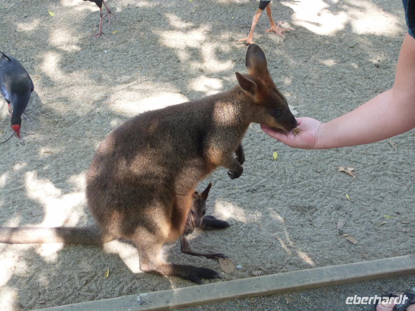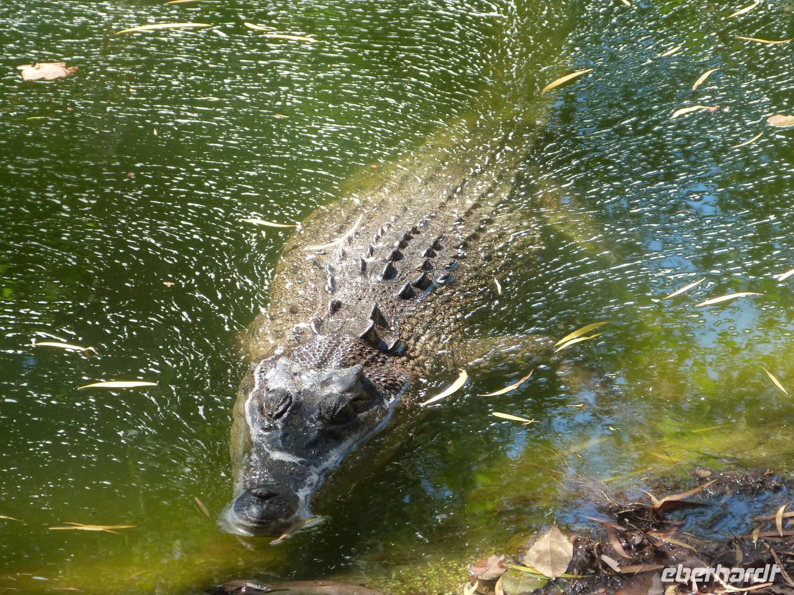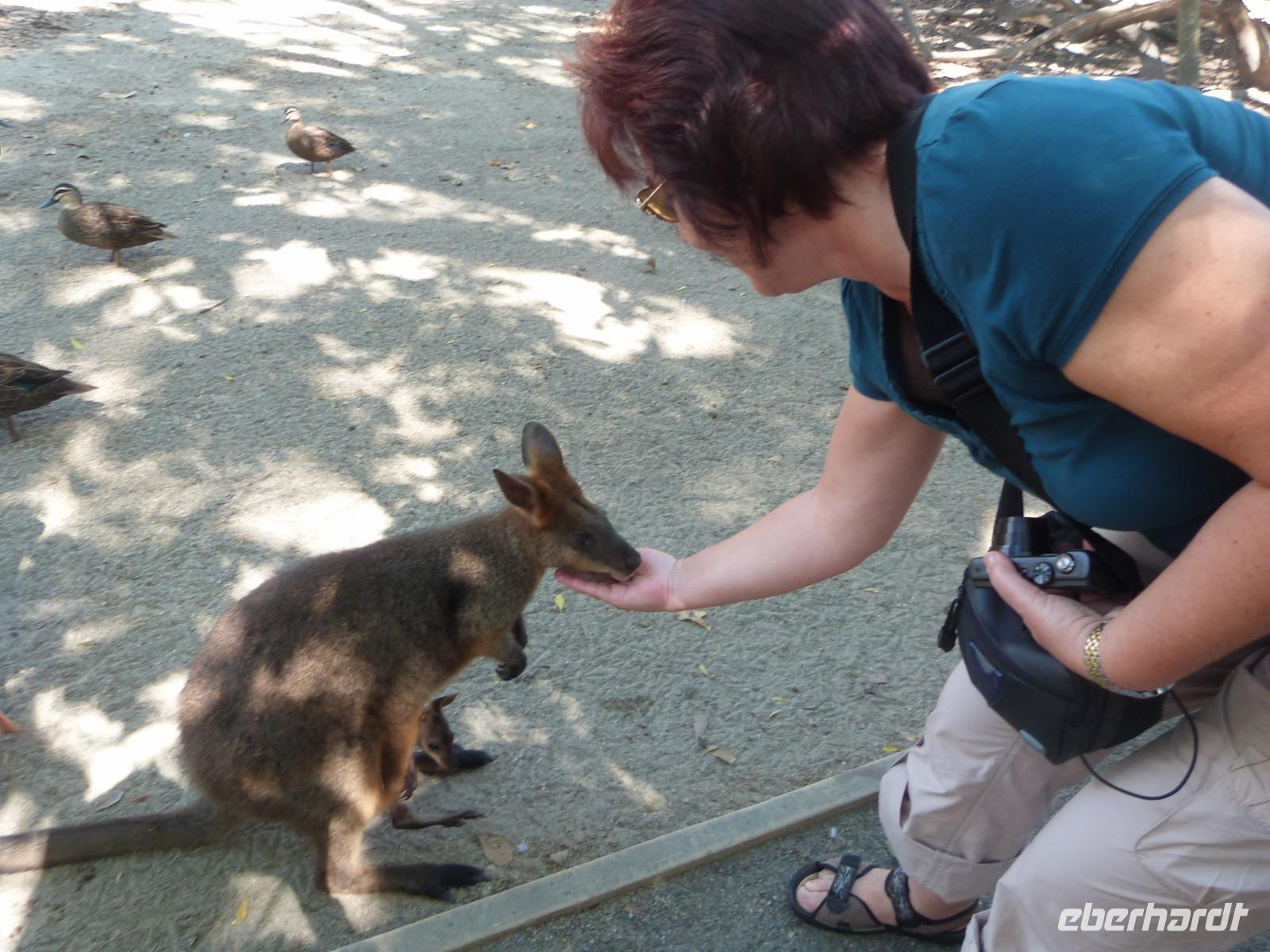Heute war unser letzter Besichtigungstag in Australien und wir hatten noch einmal einen ganz tollen Tag. Karin holte uns nach dem Frühstück im Hotel ab und wir fuhren in den „Habitats Wildlife Park", einem Tierpark. Dort konnten wir uns von Koalas, Wallabys und Kängurus persönlich verabschieden, in dem wir sie fütterten und streichelten. Eine tolle Erfahrung die Tiere hautnah zu sehen. Für alle von uns ein weiterer Höhepunkt der Reise. Am Mittag ging es dann zum Erfrischen zu Mossman Gorge, wo wir im eiskalten Wasser unsere Füße abkühlen konnten. Im Ort Mossman aßen wir im „Mossman Tea House" zu Mittag und der Besitzer des Lokals erläuterte uns die Pflanzen des Regenwaldes. Für was sie alles gut waren und ob sie essbar waren. Nach dem Essen fuhren wir an Zuckerrohrfeldern vorbei und kamen zum Daintree River, wo wir auf „Krokodilsafari" gingen. Bei unserer Bootsfahrt sahen wir ein Salzwasserkrokodil im Wald liegen und erfuhren Wissenswertes über das Ökö-System Regenwald in Australien. Die Mangroven und die Ruhe in diesem Gebiet werden uns in guter Erinnerung bleiben. Am Abend packten wir unsere Koffer, denn am nächsten Tag traten wir unsere Heimreise nach Deutschland an.