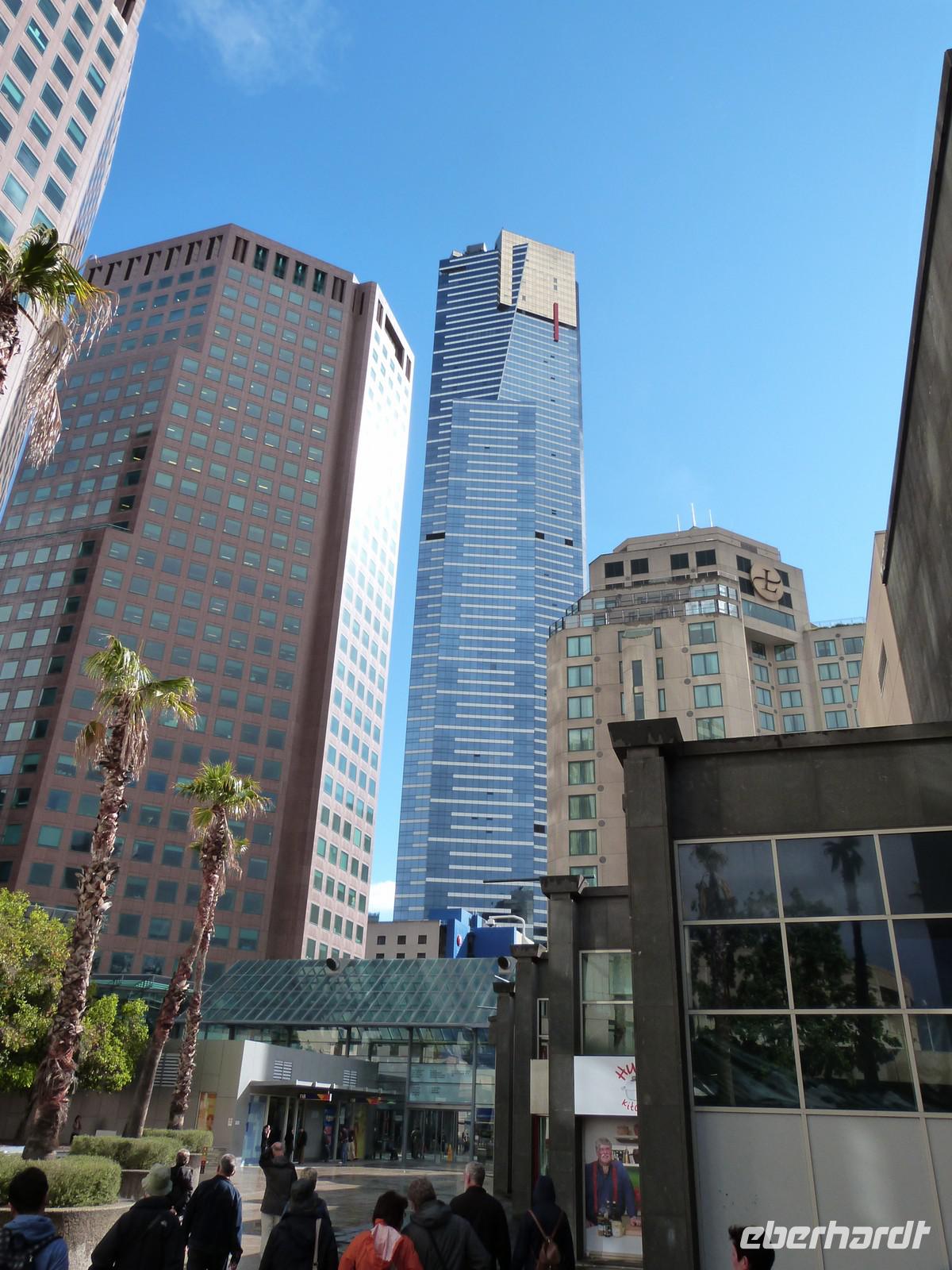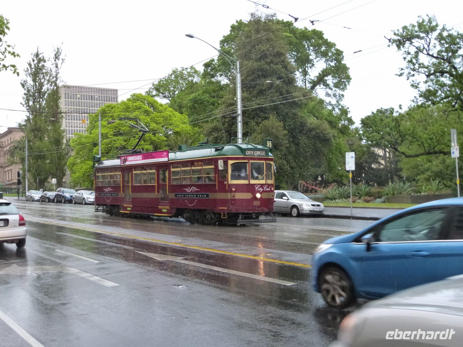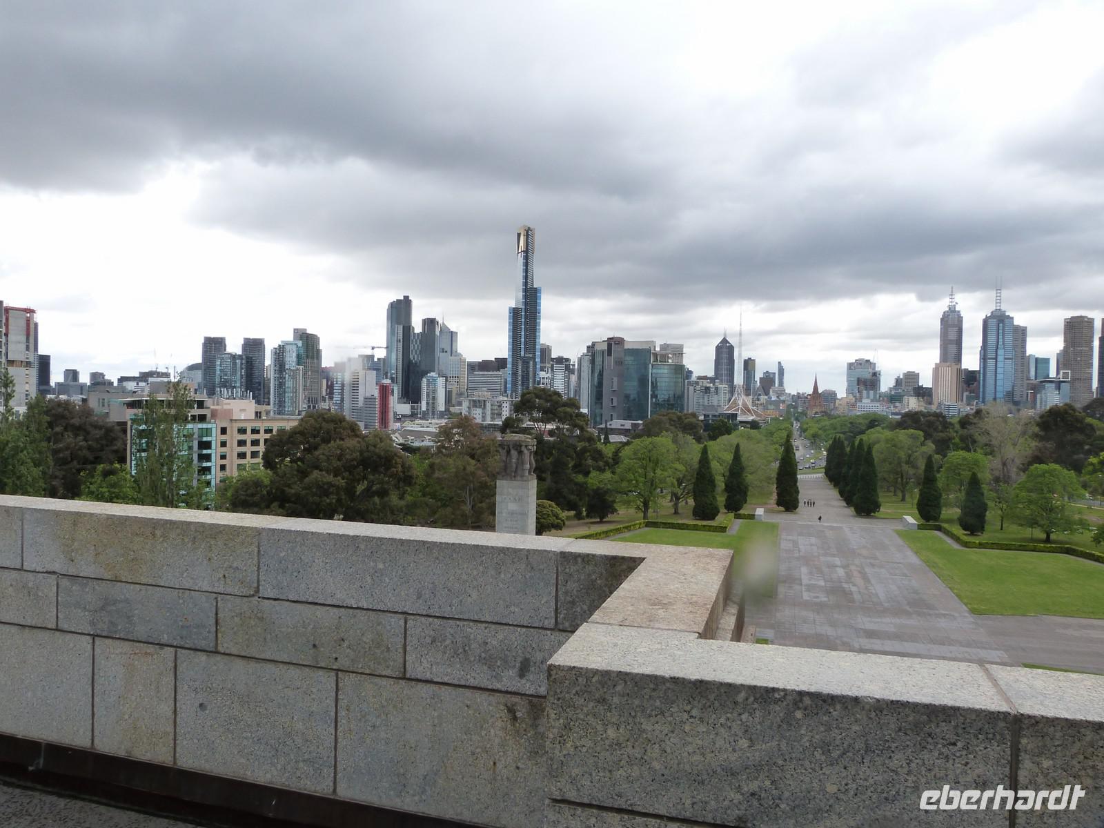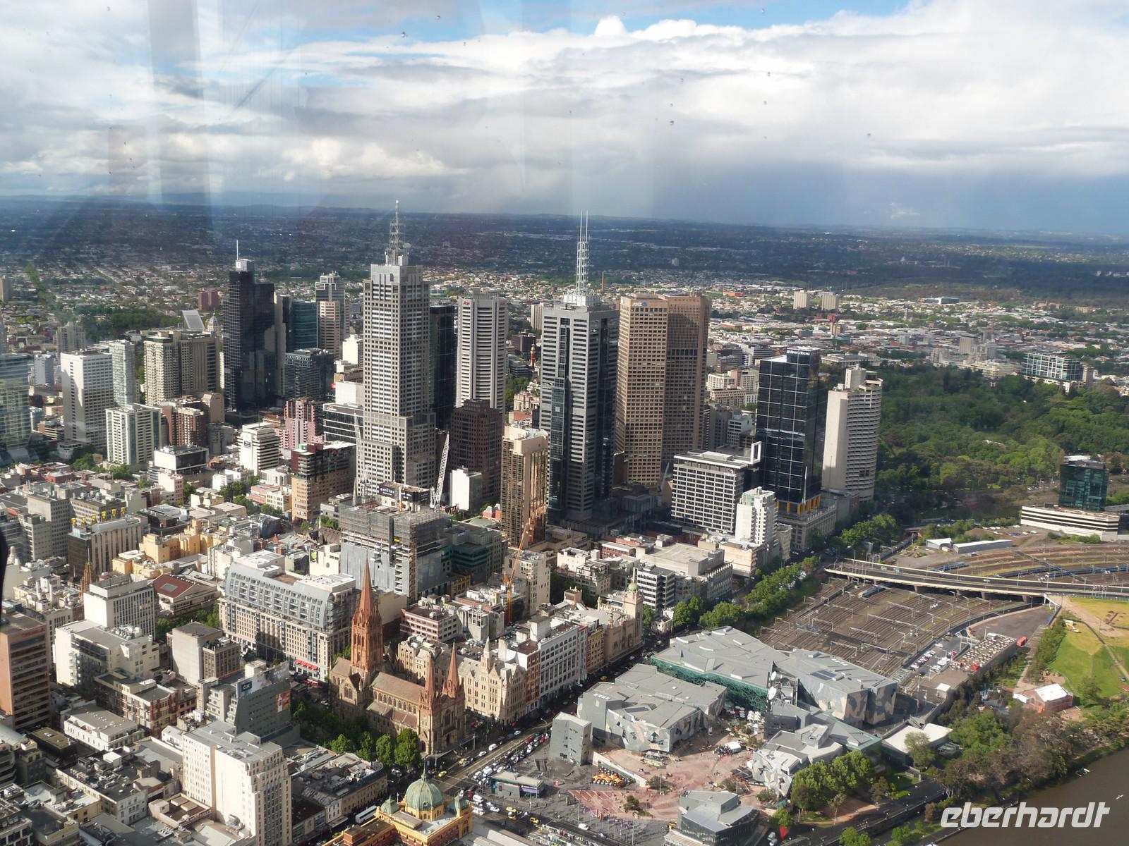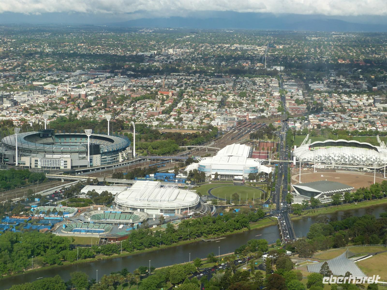 Heute hieß es leider „Abschied nehmen" von Sydney und Reiseleiter Bernd. Wir fuhren am Morgen zum Flughafen und checkten bei Qantas ein. Bei den inneraustralischen Flügen funktioniert der Check In für Gruppen sehr einfach und schnell. Ca. 2 Stunden ging unser Flug nach Melbourne und leider empfing uns Melbourne mit leichtem Regen. Unser örtlicher Reiseleiter Rainer holte uns auch hier wieder am Flughafen ab und wir unternahmen sofort die Stadtrundfahrt in Melbourne. Vorbei an der Altstadt, der St.Paul´s Kathedrale, dem Victoria Market und dem Olympiazentrum kamen wir zum Kriegerdenkmal, wo wir von der oberen Plattform einen guten Blick auf die Skyline der Stadt hatten. Gegen frühen Nachmittag erreichten wir unser Hotel „Mercure" wo wir unsere modernen Zimmer bezogen. Leider wurde das Wetter nur ein klein wenig besser aber wir unternahmen trotz allem eine Fahrt mit der historischen Straßenbahn. Als erstes fuhren wir bis zum Bahnhof und liefen von da aus zum „Eureka Tower". Dieses Hochhaus bietet in der 88.Etage einen herrlichen Blick über die Stadt. Wir passten gerade einen trockenen Moment ab und die Sonne kam heraus, als wir gerade auf dem „Eureka Tower" waren. So konnten wir doch noch etwas mehr von der Stadt sehen. Als wir den Tower wieder verließen, fing es wieder leicht an zu regnen. Wir fuhren wieder mit der Straßenbahn zum Hotel und machten uns für das geplante Abendessen im Hotel zurecht. In einem separaten Raum im Hotel nahmen wir unser 2-Gang-Menü ein und ließen den Abend gemütlich ausklingen.