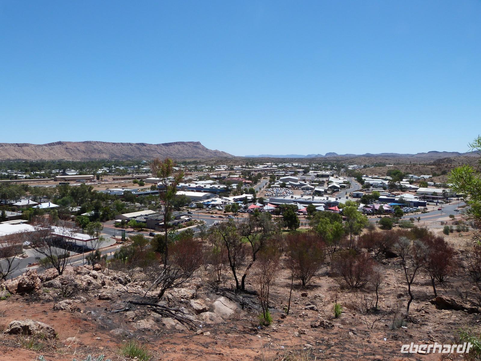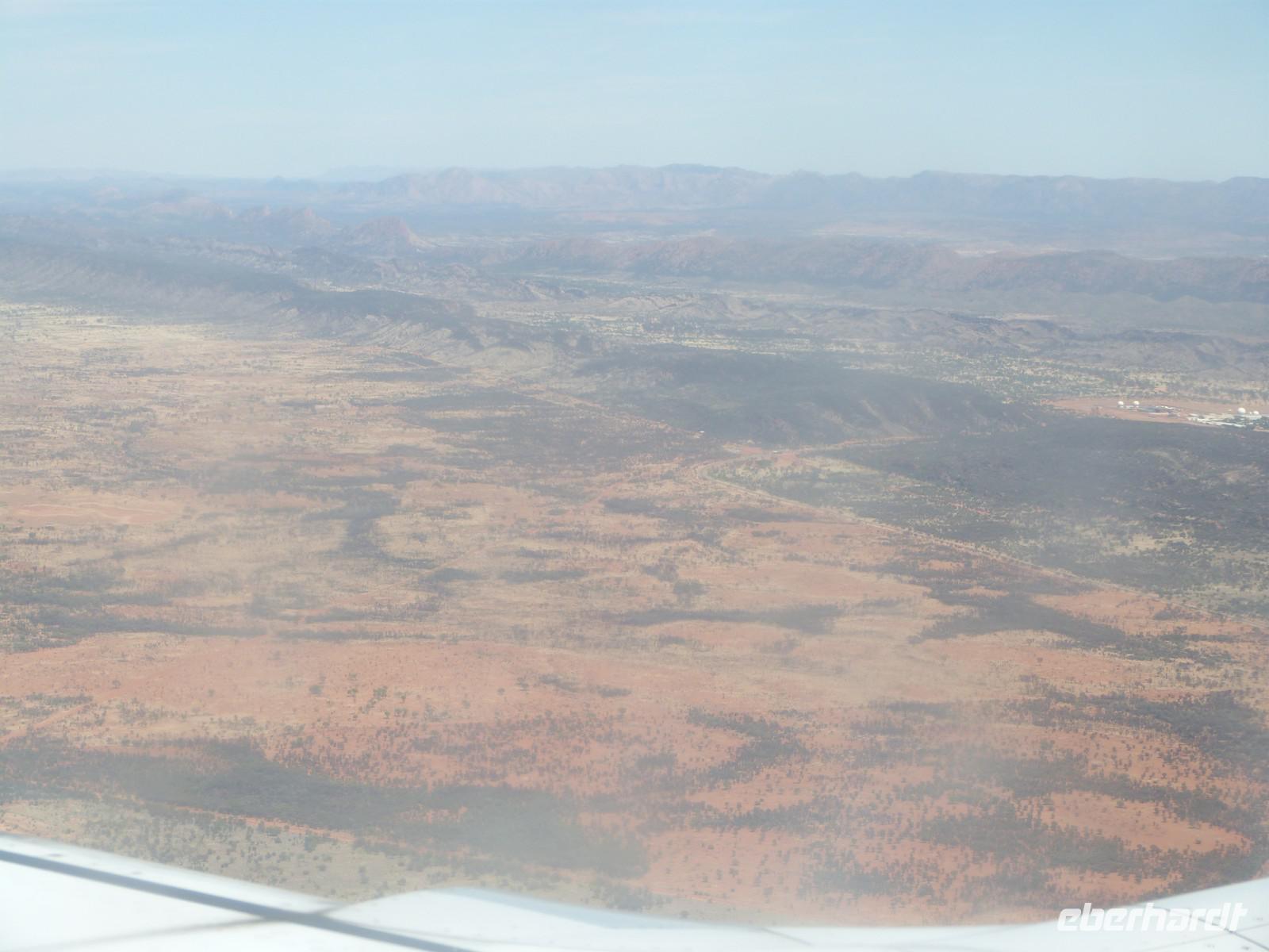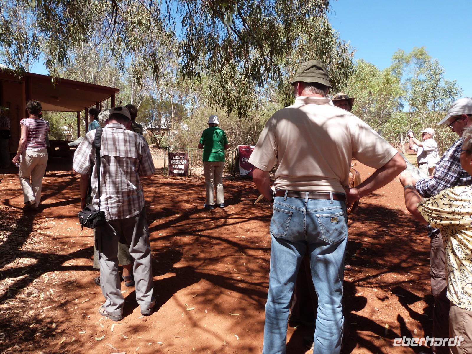 9.Tag - Sonntag: 28.10.2012 - Flug nach Alice Springs und Stadtbesichtigung Alice Springs Heute hieß es „Abschied nehmen" von Meldbourne und Rainer und unsere Reise ging weiter in das Herzstück Australiens - dem Outback. Am Morgen checkten wir in Melbourne am Flughafen ein und es funktionierte wieder alles so unkompliziert mit unserem Gepäck. Wir verabschiedeten uns von Rainer und los ging es! Das Outback ruft!! Ca. 3 Stunden ging unser Flug nach Alice Springs und wir konnten die tiefrote Erde und die Salzseen bereits aus dem Flugzeug sehen. Ein tolles Gefühl und die wahnsinnige Weite dieses Kontinents! Nach einer etwas holprigen Landung kamen wir gut am Terminal von Alice Springs an. Dort empfing uns Chrissy unsere erste Reiseleiterin im Outback. Sie begrüßte uns mit festem Handdruck, großer Wasserflasche, Cowboyhut und Sonnenbrille. Alles was man im Outback so benötigt! Wir gingen aus dem Terminal hinaus und stiegen in unseren Bus ein und fuhren in die Stadt Alice Springs, die nur ca. 5 Minuten Fahrtzeit vom Flughafen entfernt liegt. Wir fahren in die Stadt und haben die Möglichkeit vom Hausberg „Anzac Hill" einen ersten Blick auf die Kleinstadt mit ca. 30000 Einwohnern zu bekommen. Hauptsächlich leben in „Alice", wie die Stadt liebevoll genannt wird, Aboriginals. Diese sind die Ureinwohner Australiens. Sie leben heutzutage mit in der Stadt oder in eigenen Camps außerhalb der Stadt. Sie verdienen sich Ihr Geld in den Hotels als Personal oder mit ihren Kunstarbeiten. Im Outback ist die Kunst der Aboriginals hauptsächlich eine Art Punkt-Malerei, worin Sie auf den Leinwänden ihre Kultur und Rituale wiederspiegeln. Eine ganz tolle Geschenkidee für unsere Daheimgebliebenen. Vom „Anzac Hill" aus fahren wir in die Innenstadt von „Alice" und machen einen kurzen Bummel über die Todd Street, der Einkaufsmeile der Stadt. Dort kauften wir uns Wasser und Hüte, damit wir vor der prallen Sonne geschützt waren. Von der Todd Street aus fuhren wir zur alten „Telegrafenstation" von „Alice" wo früher alles begann. Genau an der Stelle wurde nämlich 1871 die Telegrafenstation „Alice" gebaut. Diese war wichtig für den Ausbau des Telekommunikationsnetzes im Outback im 19.Jahrhundert. Heute ist es ein Freilichtmuseum, wo man einen interessanten Einblick über die Lebensweise in einer Telegrafenstation bekommt. Auch Kängurus finden im Schatten der alten Bäume Schutz vor der intensiven Sonneneinstrahlung. Anschließend besuchten wir die Basis der „Royal Flying Doctors", wo wir einen Einblick in die medizinische Versorgung und Organisation von Einsätzen im Outback erhielten. In einem Gebiet von 7 Mio. Km² werden Spezialflugzeuge mit Ärzten und Krankenschwestern eingesetzt, damit Familien im Outback medizinisch versorgt werden können. Bei einem deutschsprachigen Film verrieten uns Zeitzeugen Erlebnisse, die sie selbst schon mit den „Royal Flying Doctor´s" erlebt hatten. Ein sehr interessantes kleines Museum zeigte uns dann auch technische Geräte, die bei den Einsätzen verwendet werden. Eine kleine Spende von unserer Seite durfte nicht fehlen, denn die Ärzte und Krankenschwestern sind auf Spenden angewiesen und kaufen mit diesem Geld Medikamente, technische Geräte etc. Ein wahnsinniges Projekt was unseren größten Respekt verdient! Ein weiteres tolles Projekt ist die „School of the Air". Dieses Projekt gibt den Schülern im Australischen Outback die Möglichkeit am Schulunterricht teilzunehmen. Sie werden über den Computer unterrichtet und sehen Ihre Lehrerin und Mitschüler nur über Web-Cameras. Die Lehrer sind in Alice Springs und die Kinder ca. 2000-3000 Kilometer entfernt. Ein technischer Fortschritt für die Kinder, denn sonst müssten Sie in Internate und wären von ihren Familien tausende Kilometer entfernt. Mit beeindruckenden Erlebnissen und Informationen fuhren wir in unser Hotel und ließen die Erlebnisse bis zum Abendessen im „Overleander Steakhouse" Revue passieren. Das „Overleander Steakhouse" empfing uns bereits mit einer toll dekorierten Tafel. Wir nahmen alle Platz und erhielten typisch australische Tiere zum Abendessen: Känguru, Krokodil, Emu, Kamel, und als Hauptgang Rind oder Baramundi Fisch. Ein leckeres Essen mit toller Atmosphäre. Nach dem Essen lud uns der Wirt dann noch auf ein gemeinsames Singen und Tanzen ein. Hatten wir ein Spaß!!