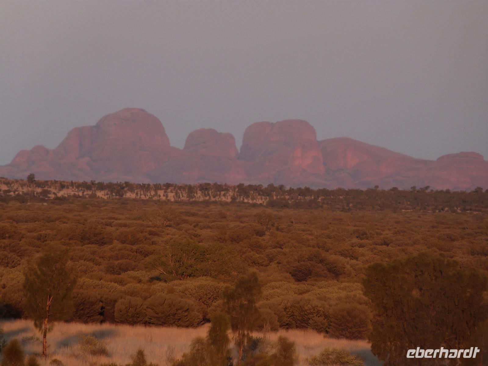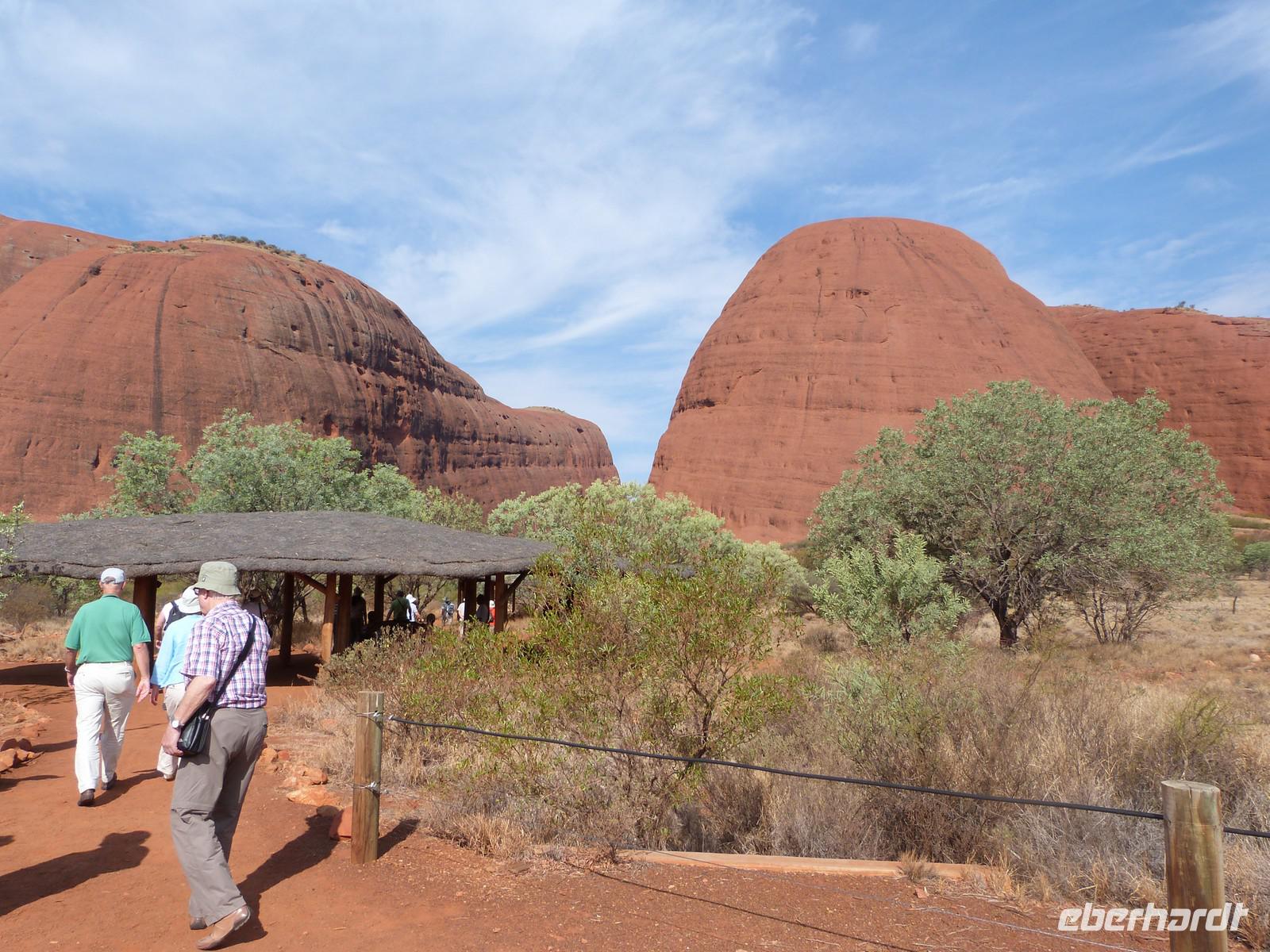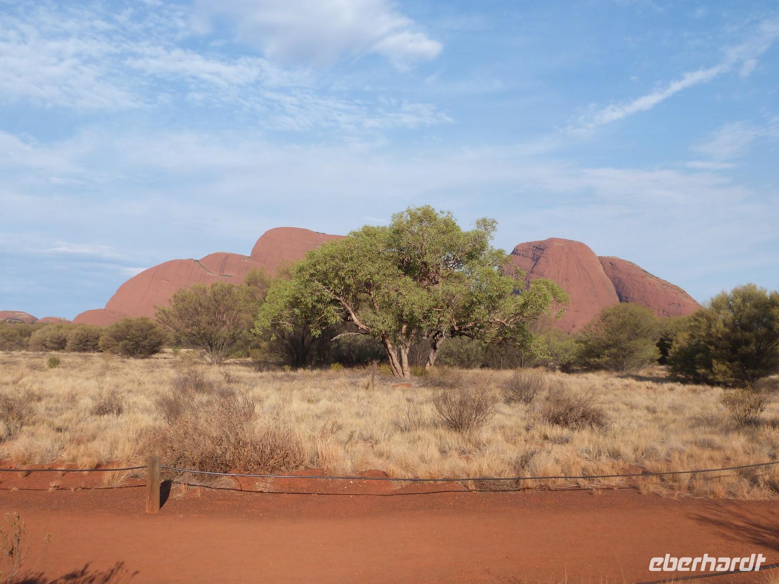 In Australien leben, von 26 der giftigsten Schlangenarten der Welt, 18 Arten. Auf dem Weg zum „Uluru" hielten wir noch an einer Wanderdüne, wo wir uns den herrlichen roten Sand abfüllen konnten. Der Mount Connor begleitete uns ein ganzes Stück in der Ferne bis wir irgendwann am „Uluru" ankamen. Wir brachten unsere Koffer schnell ins Hotel „Outback Pioneer" am „Uluru" und fuhren weiter mit dem Bus am „Uluru" vorbei bis zu den „Kata Tjuta´s". Diese 36 Felskugeln haben in der Aboriginal Kultur eine bestimmte Bedeutung. Wir liefen den Wanderweg entlang und konnten uns von der Schönheit der Gesteine überzeugen. Auf dem Rückweg hielten wir an einem Aussichtspunkt, wo wir den „Uluru" von weiten sehen konnten. Traumhafte Motive kamen uns vor die Kamera! Nach dem Abendessen ging es dann zum Sonnenuntergang am „Uluru". Bei einem Glas Sekt stoßen wir auf unsere Reise an und Eva, unsere Reiseleiterin, machte von uns tolle Gruppenfotos! Ein erlebnisreicher Tag ging zu Ende, den wir immer in unseren Herzen tragen werden.