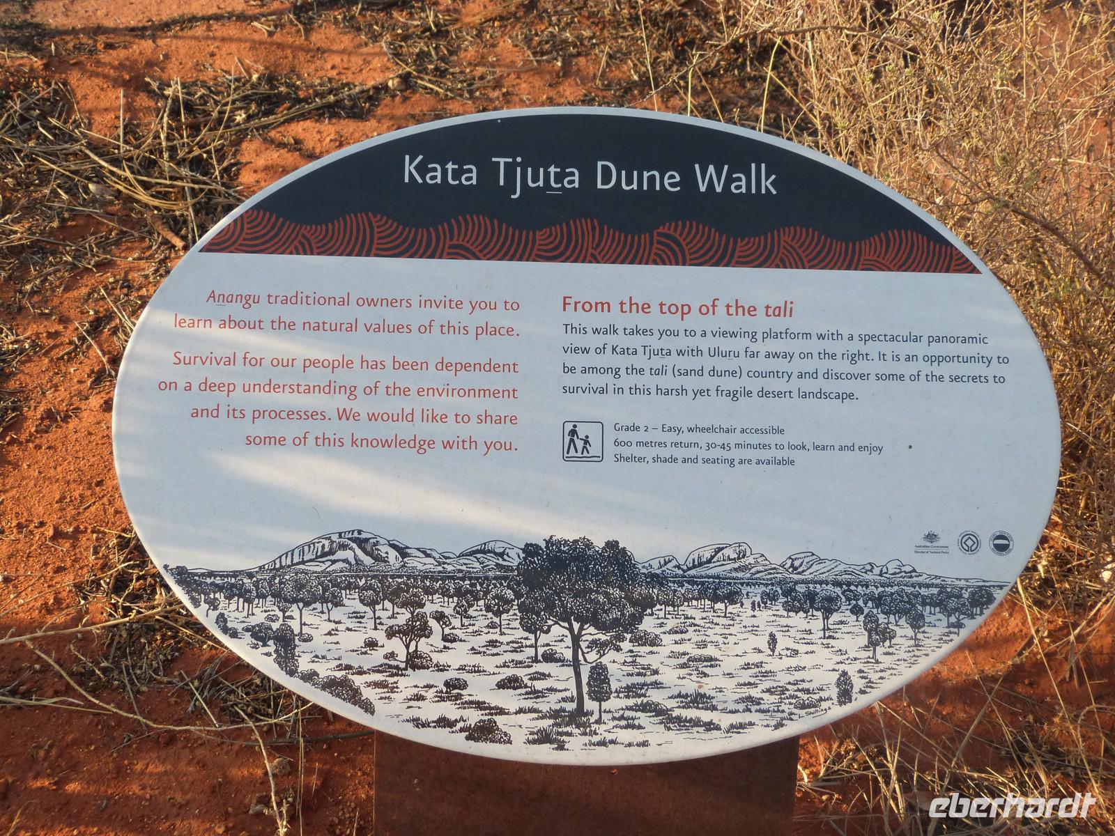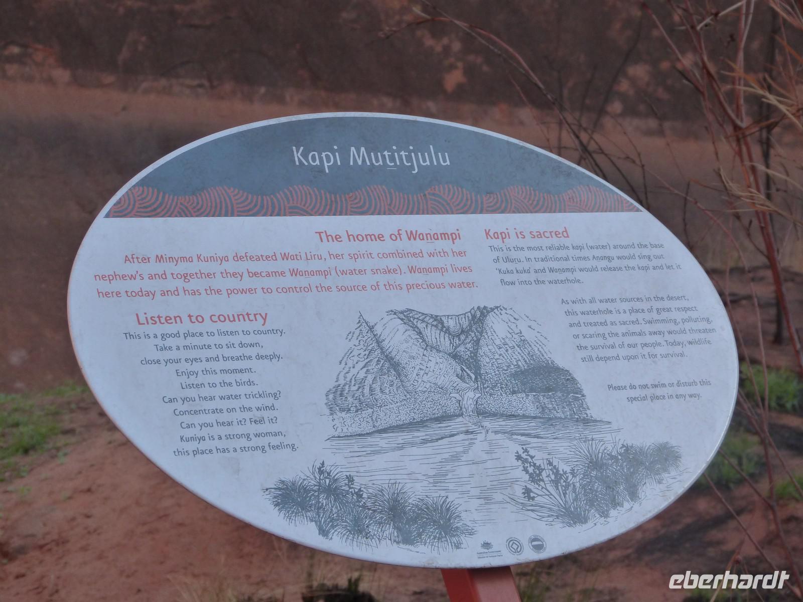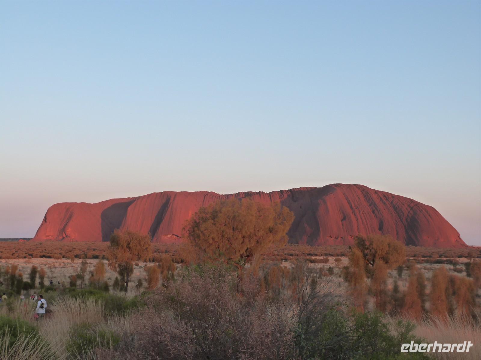 In Australien leben, von 26 der giftigsten Schlangenarten der Welt, 18 Arten. Auf dem Weg zum „Uluru" hielten wir noch an einer Wanderdüne, wo wir uns den herrlichen roten Sand abfüllen konnten. Der Mount Connor begleitete uns ein ganzes Stück in der Ferne bis wir irgendwann am „Uluru" ankamen. Wir brachten unsere Koffer schnell ins Hotel „Outback Pioneer" am „Uluru" und fuhren weiter mit dem Bus am „Uluru" vorbei bis zu den „Kata Tjuta´s". Diese 36 Felskugeln haben in der Aboriginal Kultur eine bestimmte Bedeutung. Wir liefen den Wanderweg entlang und konnten uns von der Schönheit der Gesteine überzeugen. Auf dem Rückweg hielten wir an einem Aussichtspunkt, wo wir den „Uluru" von weiten sehen konnten. Traumhafte Motive kamen uns vor die Kamera! Nach dem Abendessen ging es dann zum Sonnenuntergang am „Uluru". Bei einem Glas Sekt stoßen wir auf unsere Reise an und Eva, unsere Reiseleiterin, machte von uns tolle Gruppenfotos! Ein erlebnisreicher Tag ging zu Ende, den wir immer in unseren Herzen tragen werden.