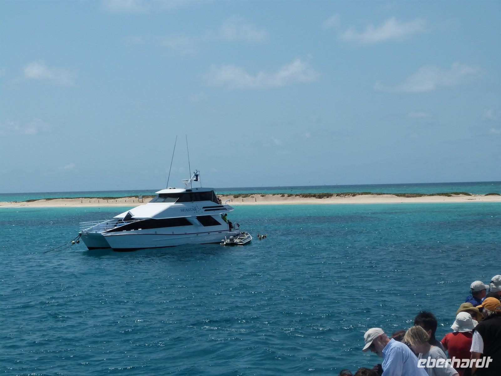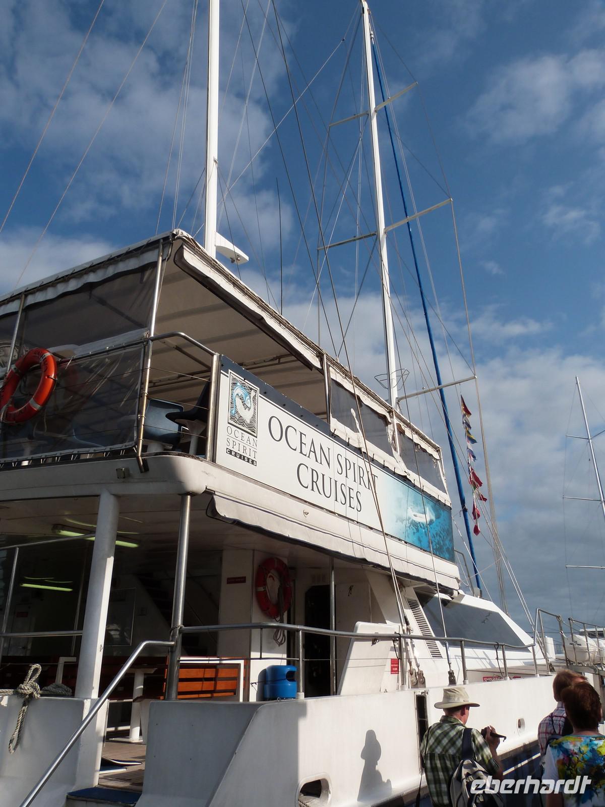 Heute ging es mit dem Katamaran los und wir fuhren ca. 40 Kilometer ins Meer hinaus um im „Great Barrier Reef" zu schnorcheln, zu baden oder einfach die Seele baumeln zu lassen. Wir kamen nach ca. 2- stündiger- Fahrt an der kleinen Vogelschutzinsel an und gingen davor vor Anker. Mit einem Tenderboot wurden wir an Land gebracht und dann hieß es „Kopf unter Wasser und einfach die Unterwasserwelt bestaunen und genießen". Man kam sich vor wie in einem Aquarium. Zum Mittagessen verwöhnte uns die Schiffcrew mit einem leckeren Buffet und dann konnten wir noch mit dem Glasbodenboot auf Tauchgang gehen und die Regenbogenfische und Riesenmuscheln bestaunen. Ein einzigartiges Erlebnis! Zum Abendessen waren wir wieder im Hotel und konnten bei einem Glas Wein oder Bier den Tag Revue passieren lassen.