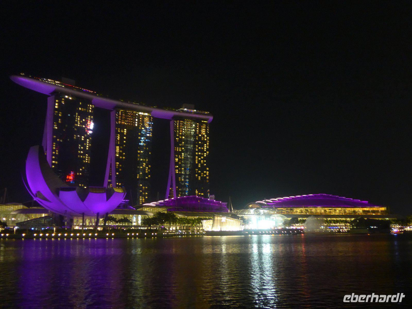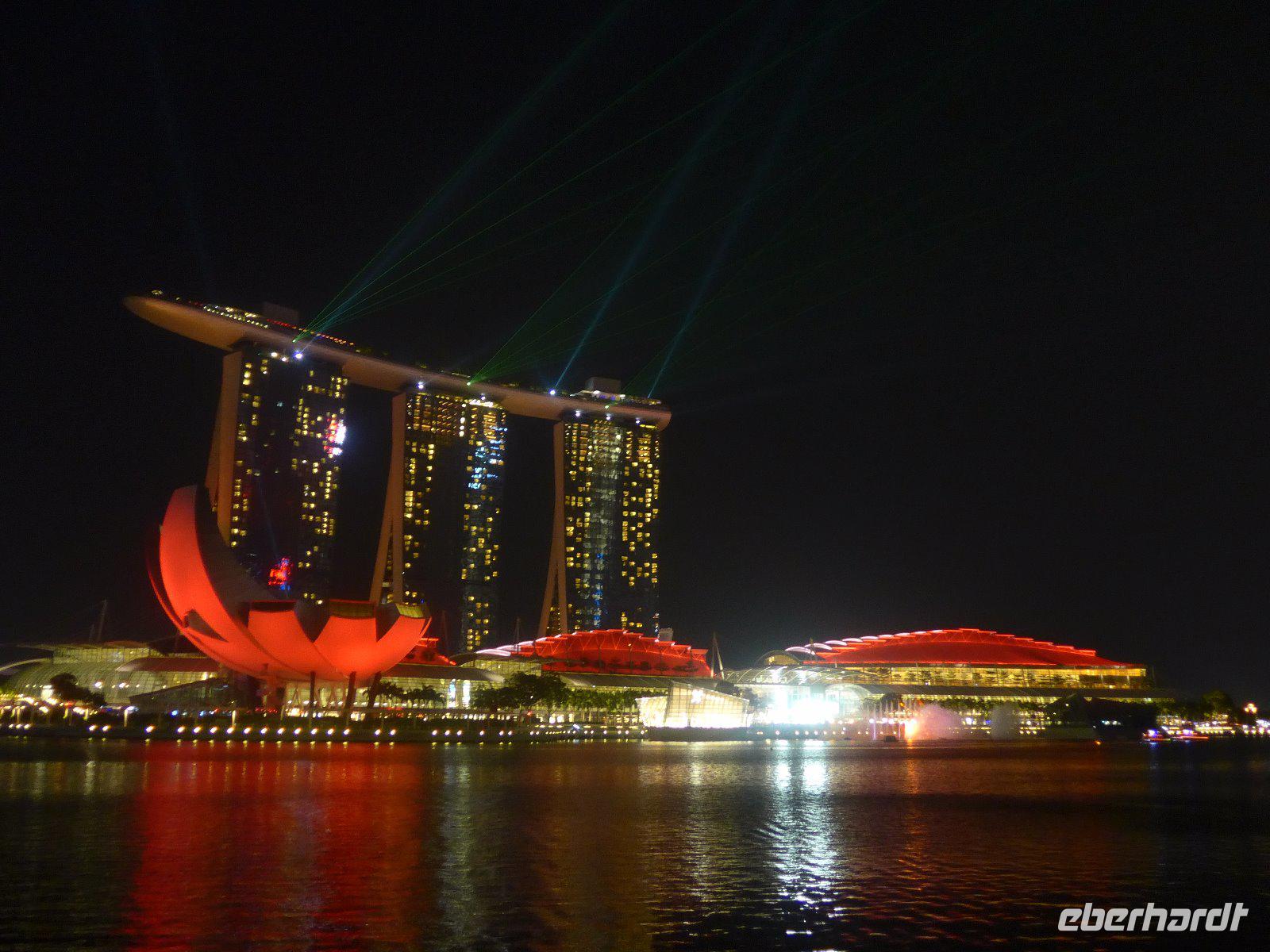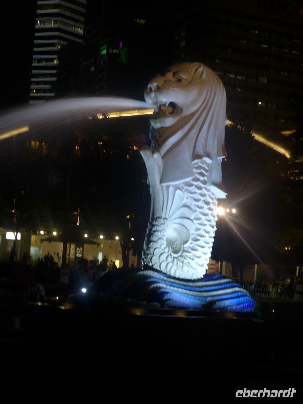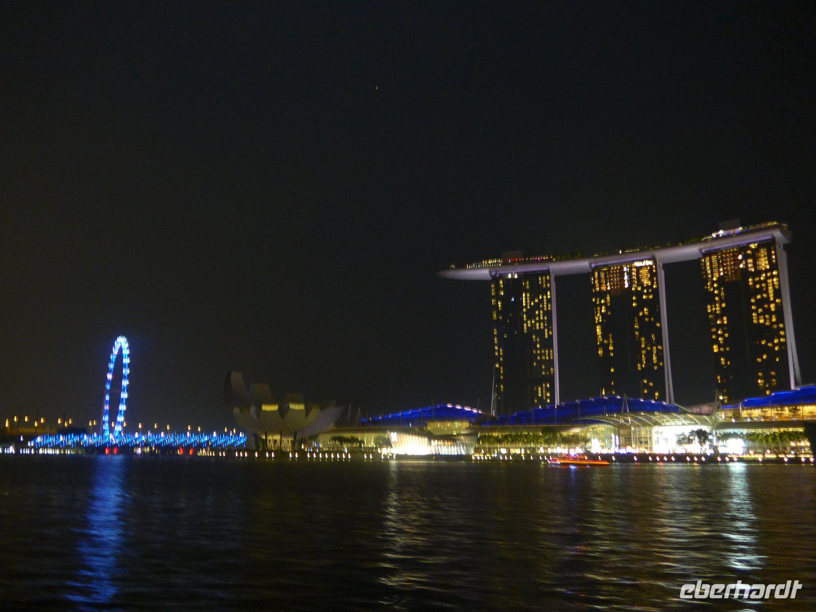 Nach einem knapp 12-stündigen Flug und reichlich 10.000 Kilometern landeten wir im nachmittäglichen Singapur. Zunächst erschlägt uns die ungewohnte hohe Luftfeuchtigkeit. Hatten wir wirklich die Sauna bei Eberhardt gebucht? Schnell ging es mit ersten Erläuterungen zur Stadt im klimatisierten Bus ins Hotel um sich etwas frisch zu machen. Wieder dem tatsächlichen Klima ausgesetzt, erlebten wir schon am Singapore-River die nächtliche Skyline. Diese Kulisse setzte sich auf einer kleinen Bootfahrt fort. Ein wirkliches Highlight bei unserem Aufenthalt in der saubersten Stadt Asiens. Mit einer Lasershow ließen wird den lauen Abend ausklingen. Ein Erinnerungsfoto am Merlin und dann ging es völlig geschafft zurück zum Hotel.