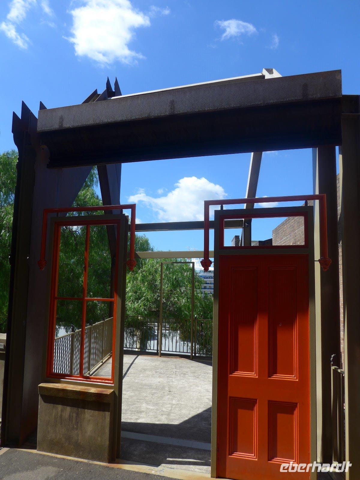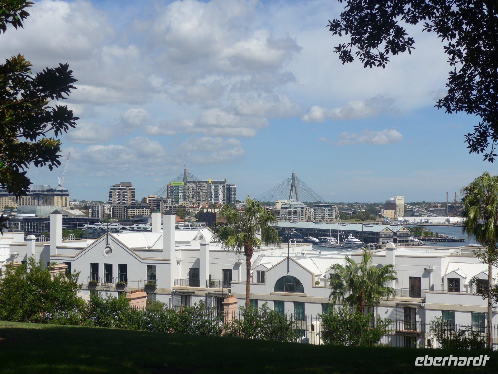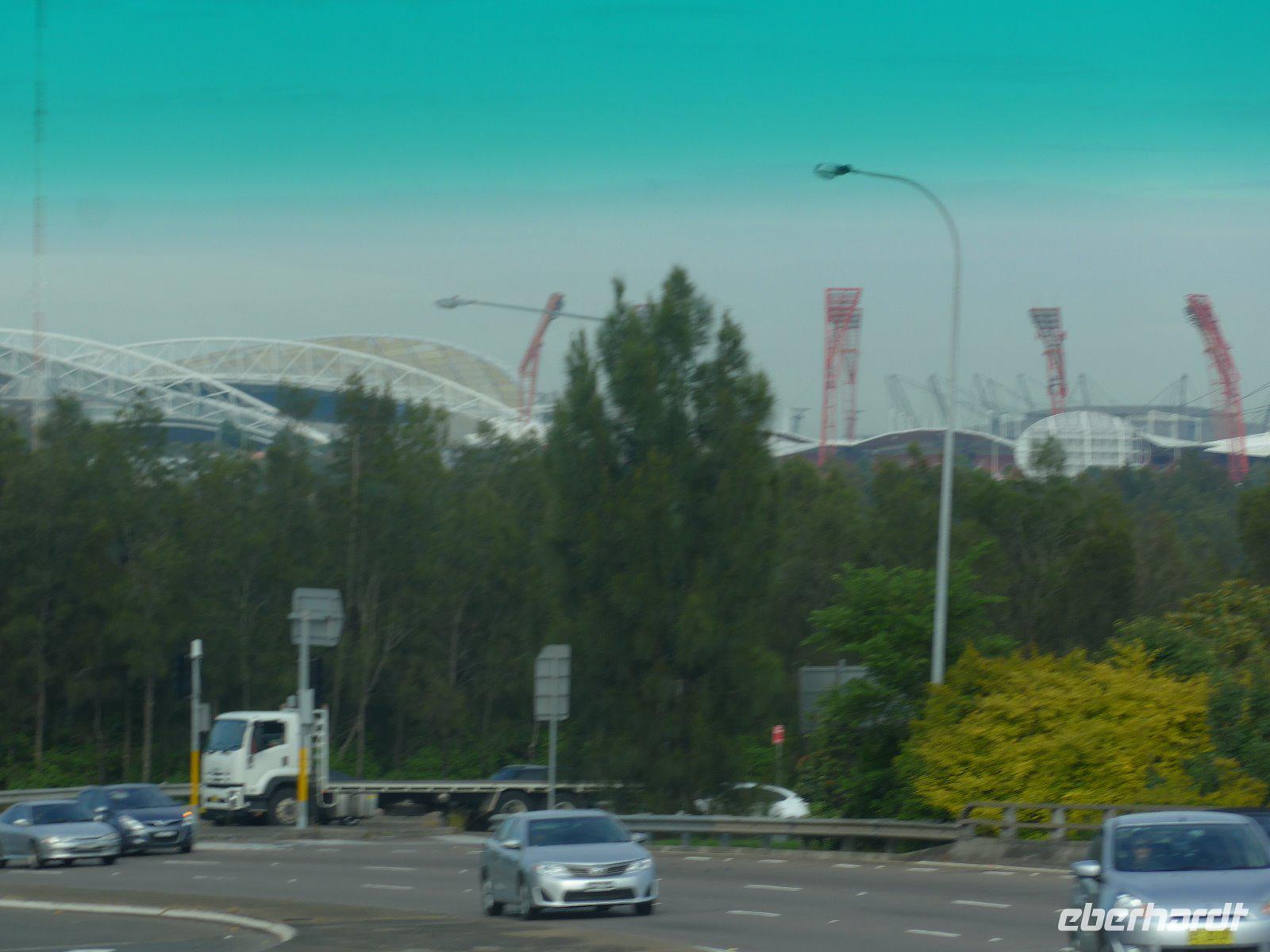 Bei Hin- u. Rückfahrt erhaschten wir hinter der Bebauung (Industrieanlage) einen Blick auf das Olympiastation von Sydney. Seit den Spielen in 2000 hat sich mittlerweile ein neuer Stadtteil mit Wohnvierteln, Schulen und Einkaufsmöglichkeiten hier entwickelt. Die verschiedenen Sportstätten werden natürlich weiterhin für zahlreiche Sport- und Kulturveranstaltungen genutzt.