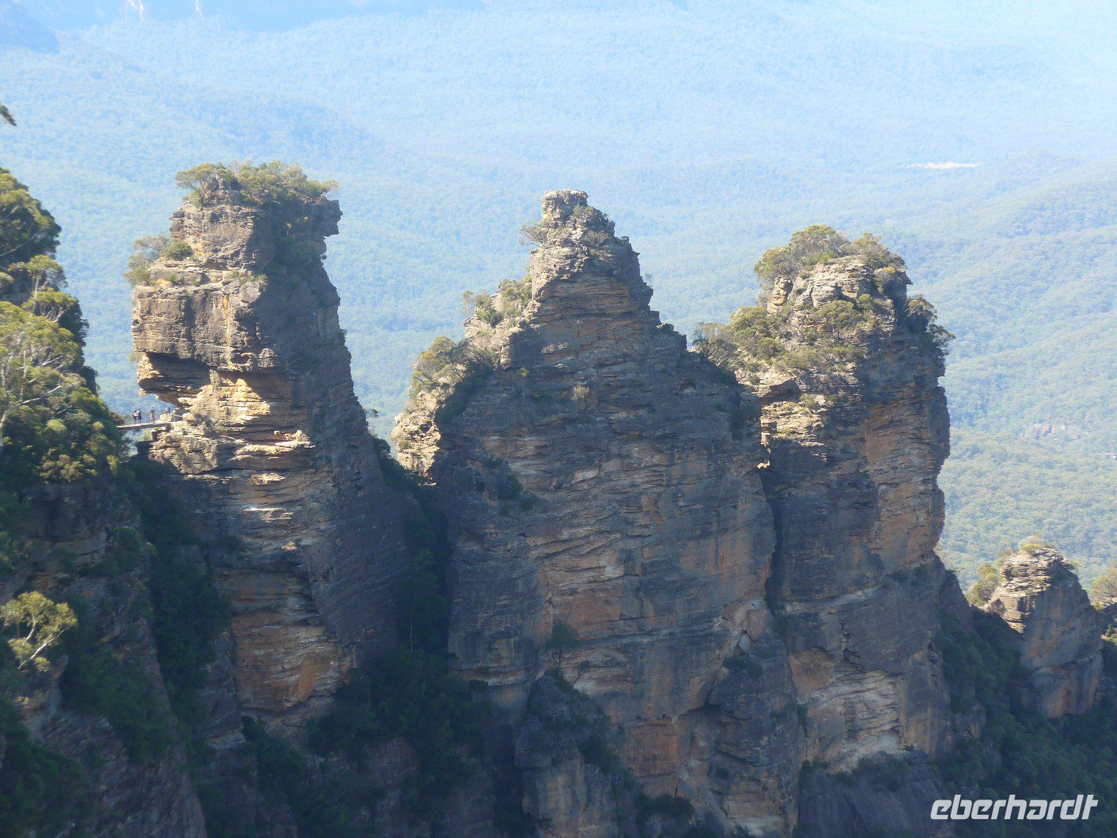 Heute ging es in die Blue Mountains und uns stellte sich natürlich zuallererst die Frage, „warum gerade Blaue Berge?". Den üblichen Erklärungen zufolge stammt der Name „Blue Mountains" (Blaue Berge) von den blauen Dämpfen, die aus den ätherischen Ölen der Eukalyptusbäume entstehen und die ganze Landschaft in einen blauen Dunst hüllen. Tatsächlich aber sorgen der Staub- und Wassergehalt der Luft, die Höhenlage und der Lichteinfall für einen blauen Dunstschleier! Die Blue Mountains sind nur etwa sechzig Kilometer von Sydney entfernt und besonders im Sommer sehr beliebt, da man der Hitze der Stadt auf diesem etwa 1.000 Meter hohen Hochplateau entfliehen kann. Durch die bizarre Bergwelt mit seinen Schluchten u. Bergformationen führte uns der Weg zum Wahrzeichen der Blue Mountains - der spektakulären Felsformation „Three Sisters" (Drei Schwestern). Wandermöglichkeiten soweit das Auge reicht - - irgendwie erinnerte uns diese Landschaft mit ihren imposanten Felsformationen an unsere „Sächsische Schweiz".