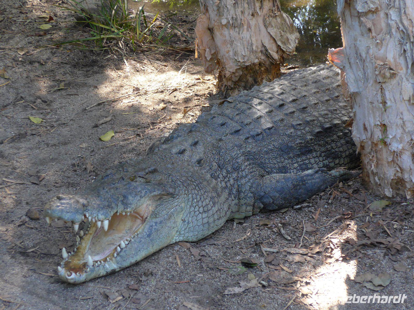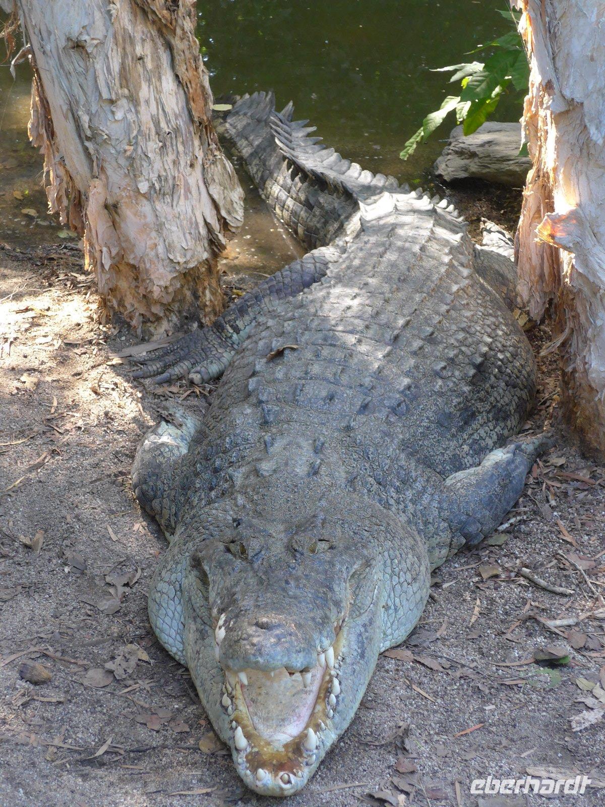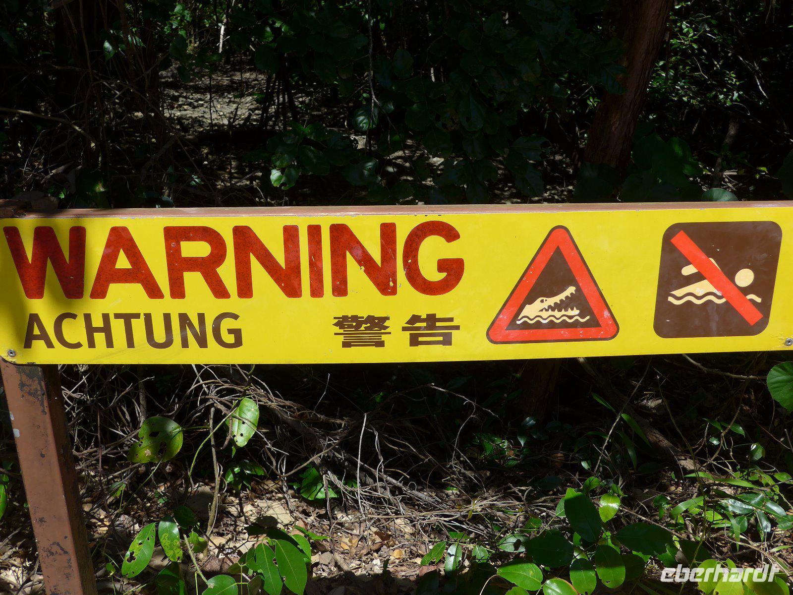 Den letzten Tag in Australien verbrachten wir im Daintree-Nationalpark. Wir erlebten die imposante Mossman-Schlucht und gingen auf Entdeckungstour im Regenwald. Ein weiterer Höhepunkt war schließlich die Fahrt auf dem Daintree River. In diesem Fluss leben die gefährlichen Salzwasserkrokodile - man kann überall die unübersehbaren Warntafeln erkennen! Wir hatten Glück und haben auf unserer Fahrt ein Krokodil gesehen - zumindest den Kopf, denn der Körper ist meistens im Wasser. Echt oder nur Showattrappe - so manche Spekulation kam auf! Egal auf jeden Fall hatten wir eine schöne Mittagspause. Schlangen waren zur Mittagspause zum Greifen nahe u. ein kurzer Spaziergang am Strand rundete unser Erlebnis im Daintree-Gebiet ab.