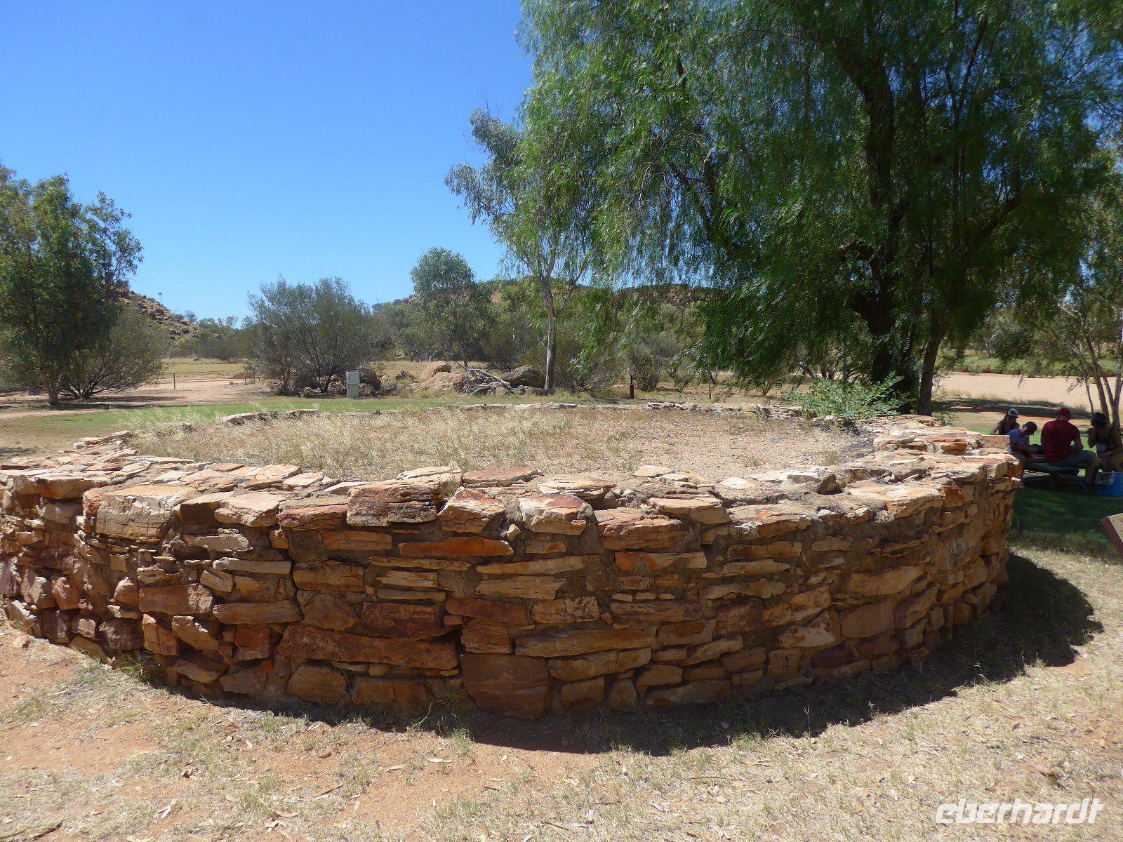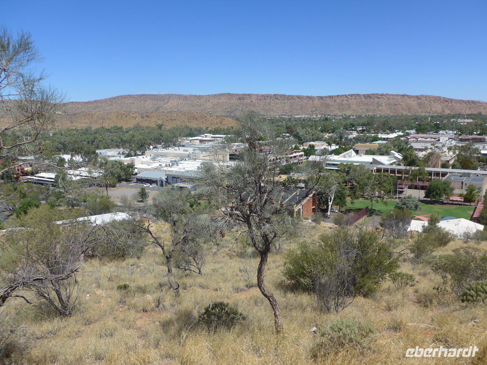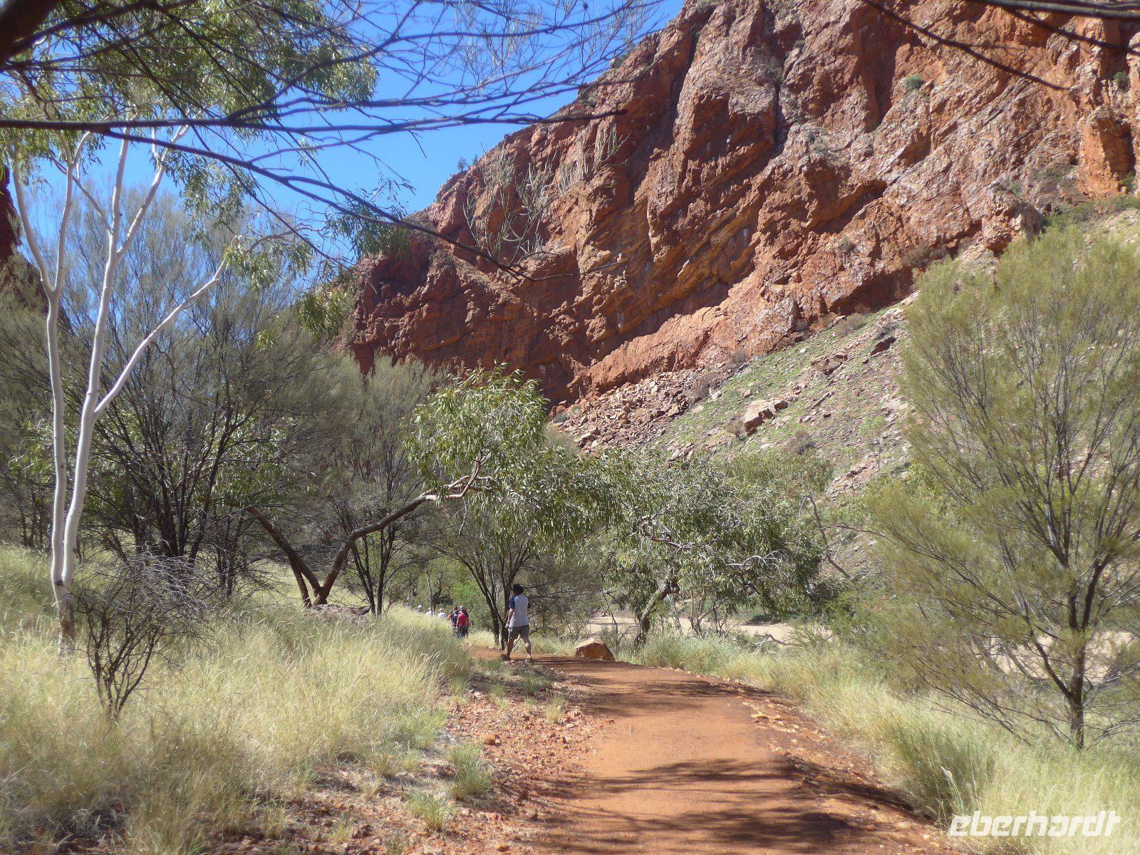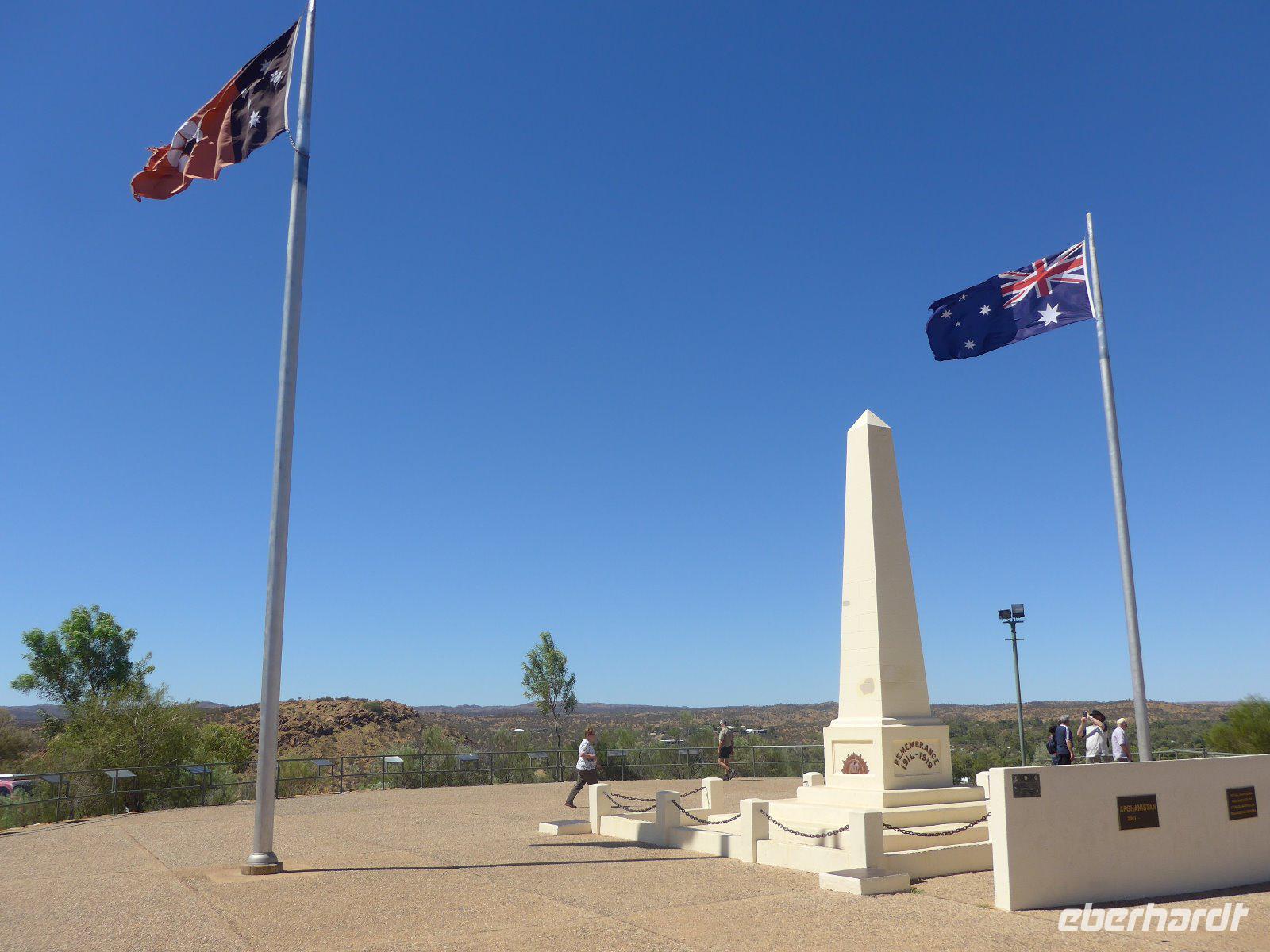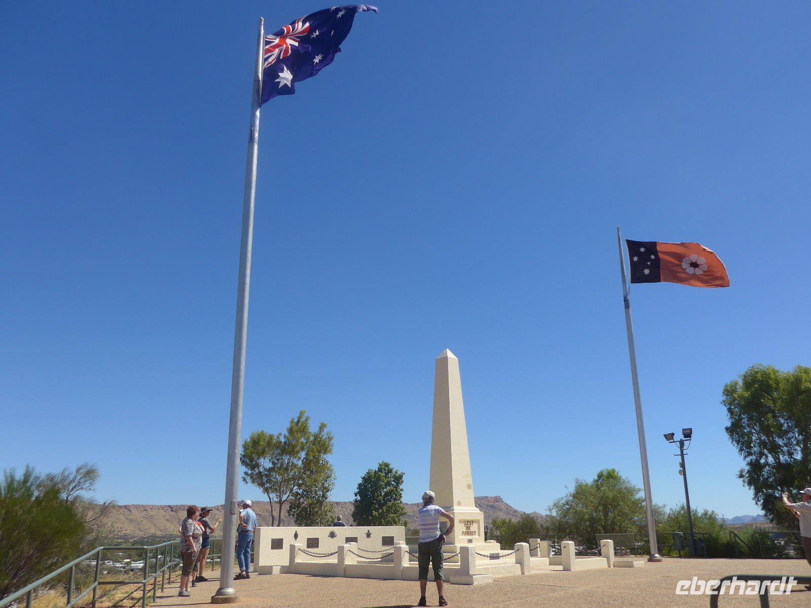 Nun hieß es auch schon wieder Abschied nehmen von Sydney und den Blue Mountains - es ging weiter mit einem knapp dreistündigen Flug ins Herz von Australien - nach Alice Springs. Von seinen etwa 25.000 Bewohnern wird Alice Springs nur ganz schlicht und einfach „Alice" genannt. War der Ort noch vor zwei Jahrzehnten ein verschlafenes Outback-Nest, so ist die Stadt heute der wichtigste Ausgangspunkt für Ausflüge im „Red Centre", dem Roten Zentrum des Landes. Man muss trotz allem feststellen, dass „Alice" eine gewisse Provinzialität noch nicht abgelegt hat, denn das Leben hier ist einfach und anspruchslos. Und dennoch die Immobilienpreise sind gesalzen. Man sagt, so erfuhren wir von Einheimischen, die meisten bleiben keine zwei Jahre hier, wer es dennoch länger hier aushält, der ist vom Outback-Fieber ergriffen und bleibt oft das ganze Leben hier. Hier in „Alice" trifft man sehr oft auf die australischen Ureinwohner, die „Aborigines", deren Bevölkerungsanteil bei über 25 Prozent liegt. Viele fristen ein bedauernswertes Dasein, es wird allerdings durch verstärkte Sozialarbeit versucht, die Lage der Aborigine-Bevölkerung zu verbessern. Für mich war dennoch überraschend zu sehen, dass die Ureinwohner mitten in der Stadt sitzen und einfach zum Stadtbild von Alice Springs gehören. Der Anblick eines Aborigines ist für uns Mitteleuropäer sicherlich gewöhnungsbedürftig - dunkle, teilweise verrunzelte Haut und vor allem dreckige Haare. Wir erfuhren allerdings auch, dass die Aborigines das kostbare Wasser eher zum Trinken nehmen und seltener zum Waschen ihres Körpers. Vom Anzac Hill hat man den besten Blick auf die Stadt und man erkenn sofort, dass man mitten in der Wüste ist. Am Rande sei noch bemerkt, dass dies auch ein Denkmal für die vielen Kriege sind an denen auch Australier beteiligt waren. Die alte Telegraphenstation an dem das Leben von Alice Springs eigentlich begann u. zum Abschluss noch Simpsons Gap mit seinem Restwasserbestand des Sees waren Höhepunkte des heutigen Tages. Die Hitze macht ganz schön zu schaffen - gut, dass unser Hotel einen Pool hat, der rege genutzt wurde.
