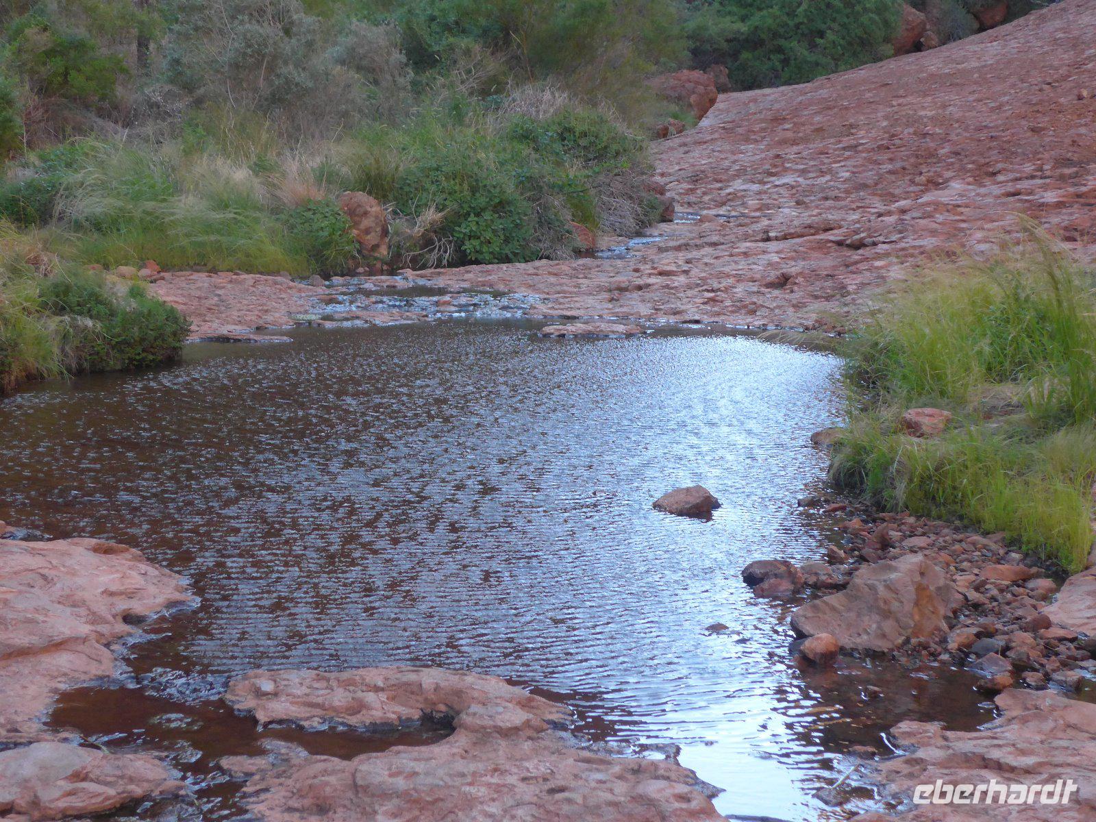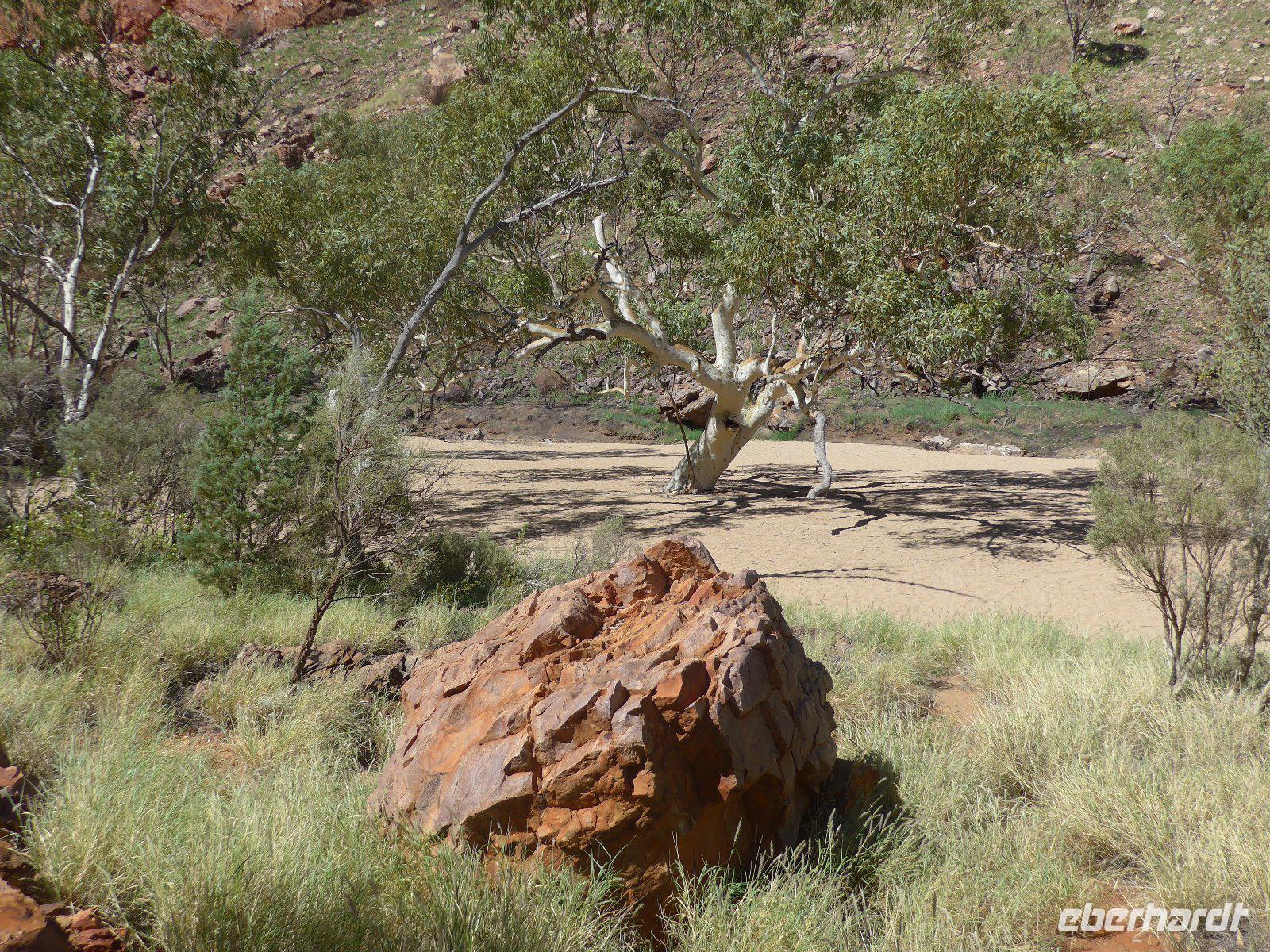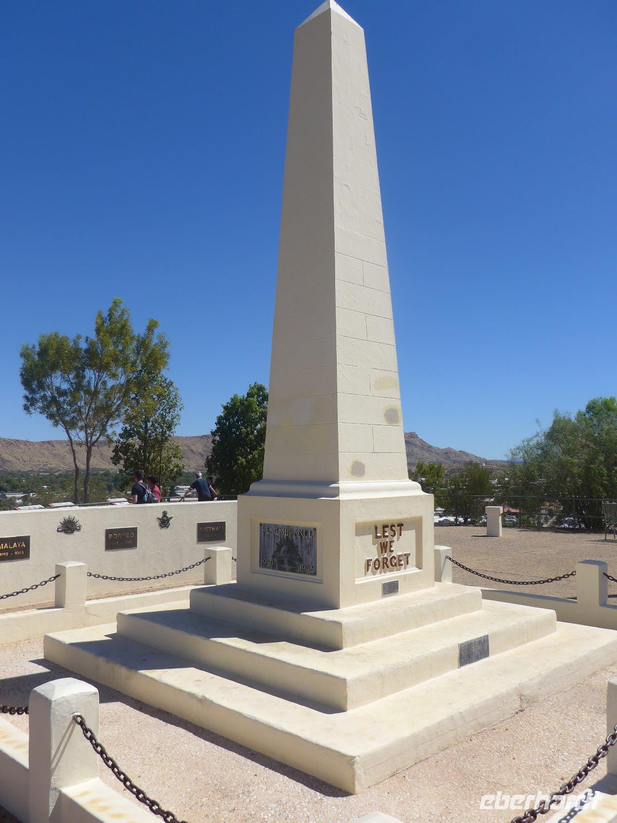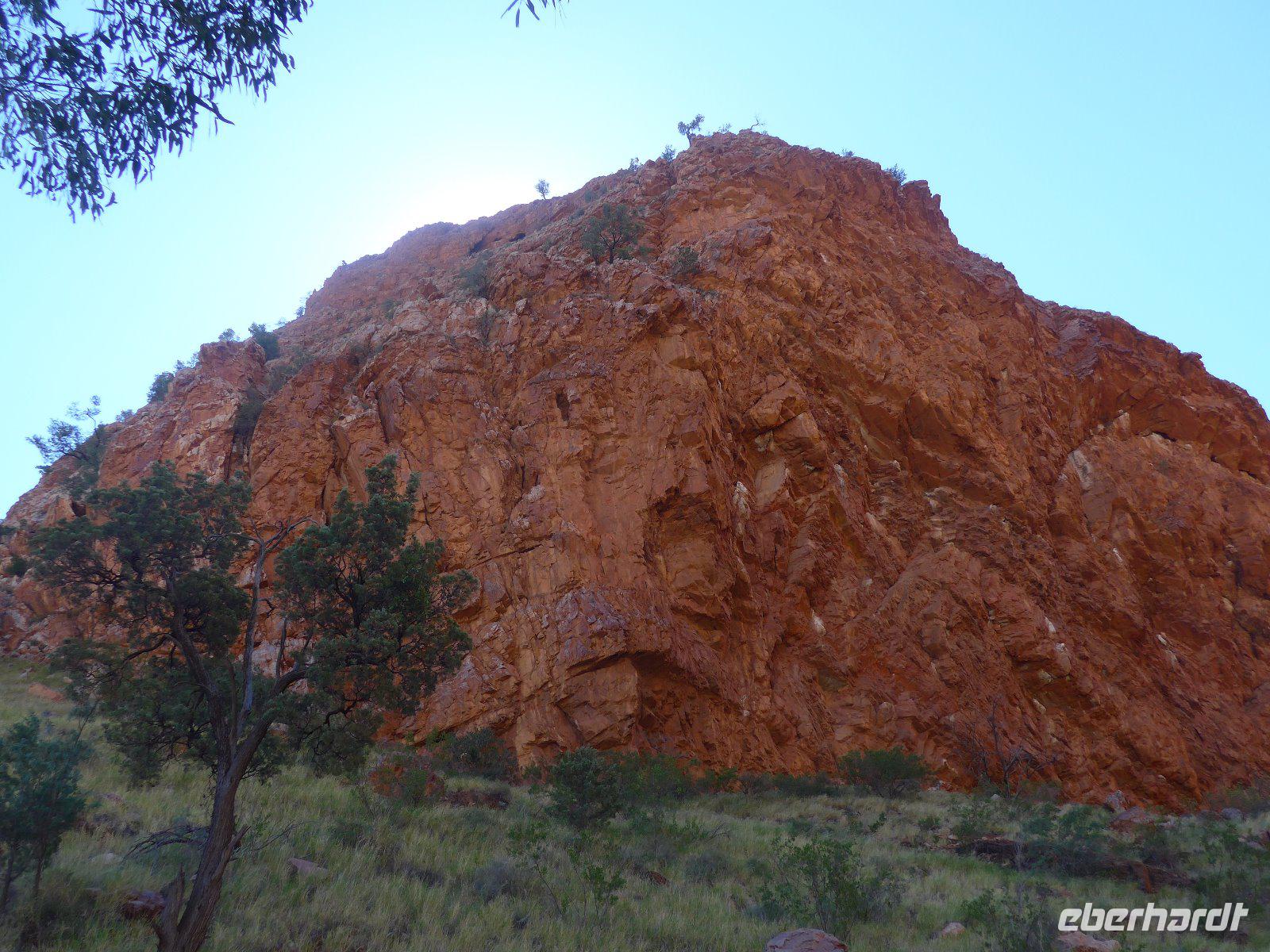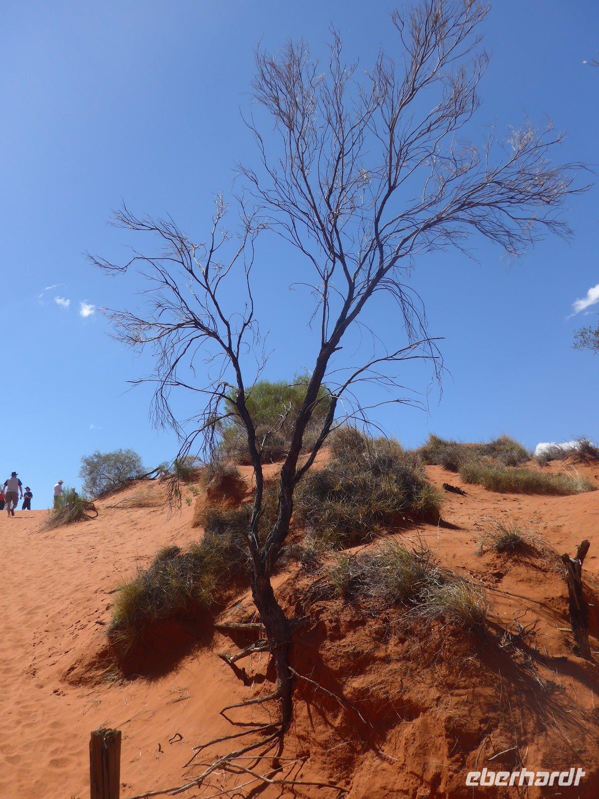 Nun hieß es auch schon wieder Abschied nehmen von Sydney und den Blue Mountains - es ging weiter mit einem knapp dreistündigen Flug ins Herz von Australien - nach Alice Springs. Von seinen etwa 25.000 Bewohnern wird Alice Springs nur ganz schlicht und einfach „Alice" genannt. War der Ort noch vor zwei Jahrzehnten ein verschlafenes Outback-Nest, so ist die Stadt heute der wichtigste Ausgangspunkt für Ausflüge im „Red Centre", dem Roten Zentrum des Landes. Man muss trotz allem feststellen, dass „Alice" eine gewisse Provinzialität noch nicht abgelegt hat, denn das Leben hier ist einfach und anspruchslos. Und dennoch die Immobilienpreise sind gesalzen. Man sagt, so erfuhren wir von Einheimischen, die meisten bleiben keine zwei Jahre hier, wer es dennoch länger hier aushält, der ist vom Outback-Fieber ergriffen und bleibt oft das ganze Leben hier. Hier in „Alice" trifft man sehr oft auf die australischen Ureinwohner, die „Aborigines", deren Bevölkerungsanteil bei über 25 Prozent liegt. Viele fristen ein bedauernswertes Dasein, es wird allerdings durch verstärkte Sozialarbeit versucht, die Lage der Aborigine-Bevölkerung zu verbessern. Für mich war dennoch überraschend zu sehen, dass die Ureinwohner mitten in der Stadt sitzen und einfach zum Stadtbild von Alice Springs gehören. Der Anblick eines Aborigines ist für uns Mitteleuropäer sicherlich gewöhnungsbedürftig - dunkle, teilweise verrunzelte Haut und vor allem dreckige Haare. Wir erfuhren allerdings auch, dass die Aborigines das kostbare Wasser eher zum Trinken nehmen und seltener zum Waschen ihres Körpers. Vom Anzac Hill hat man den besten Blick auf die Stadt und man erkenn sofort, dass man mitten in der Wüste ist. Am Rande sei noch bemerkt, dass dies auch ein Denkmal für die vielen Kriege sind an denen auch Australier beteiligt waren. Die alte Telegraphenstation an dem das Leben von Alice Springs eigentlich begann u. zum Abschluss noch Simpsons Gap mit seinem Restwasserbestand des Sees waren Höhepunkte des heutigen Tages. Die Hitze macht ganz schön zu schaffen - gut, dass unser Hotel einen Pool hat, der rege genutzt wurde.