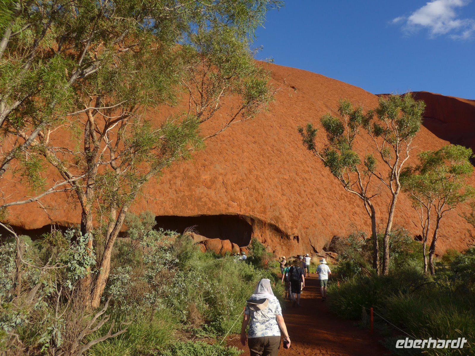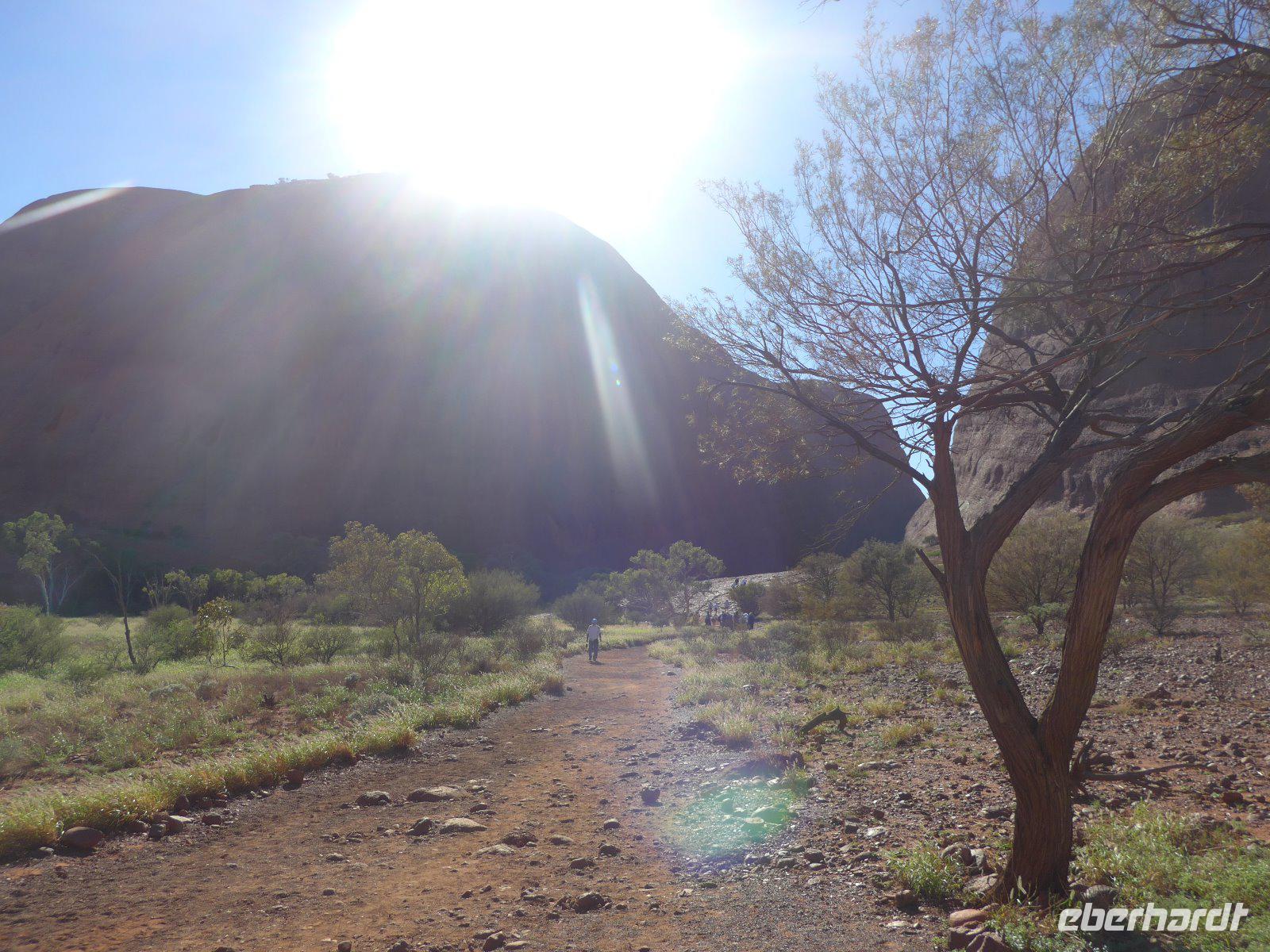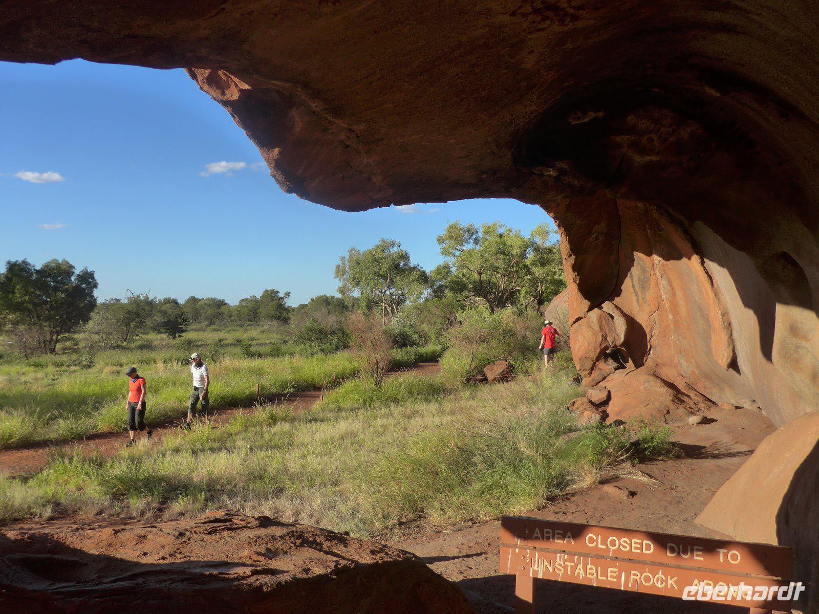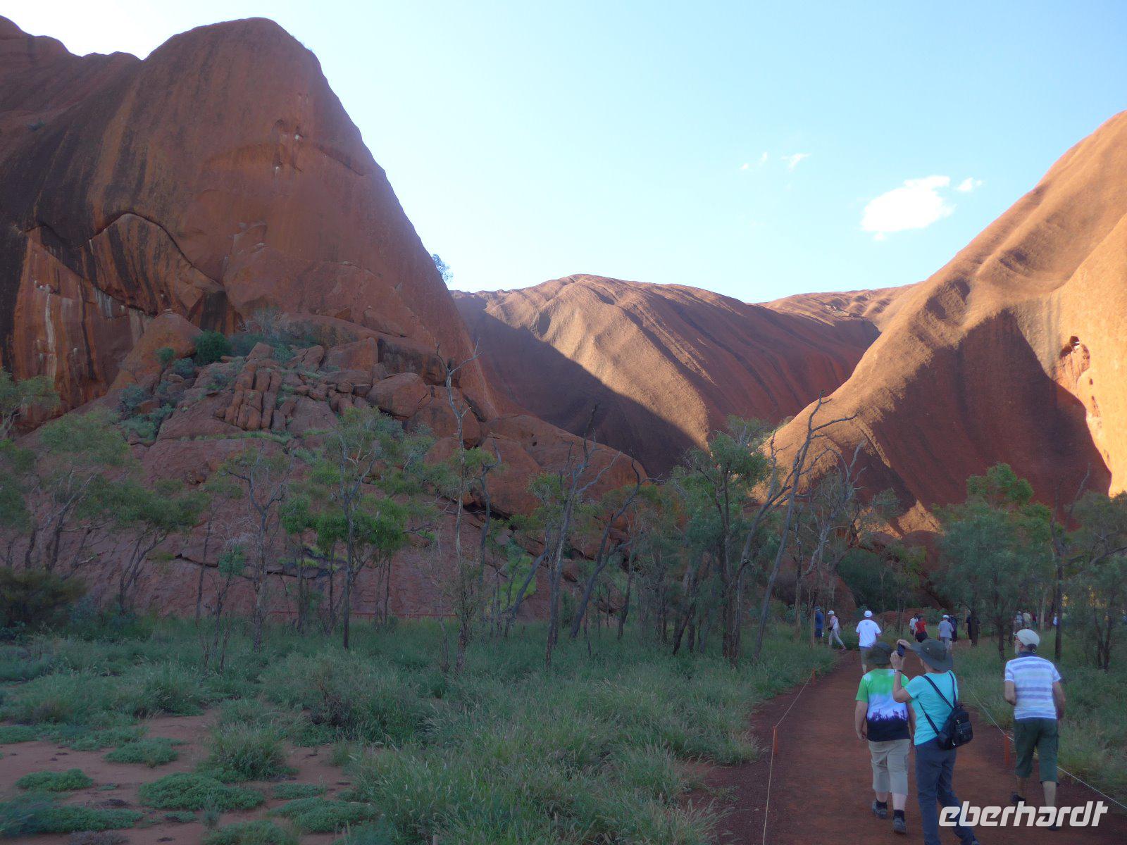 Gleich früh gegen 6 Uhr ging es dann weiter, denn auch den Sonnenaufgang am Ayers Rock wollten wir uns nicht entgehen lassen. Kennzeichnend sind in dieser Gegend die großen Temperaturschwankungen (Tags heiß und nachts mitunter sehr kalt). Bei uns waren es noch erträgliche Temperaturen. Prinzipiell ist es auch möglich, den Uluru zu besteigen. Aber für die Ureinwohner ist dieser Berg ein heiliger Fels, dessen Besteigung für sie ein Tabu ist. Wir zollen den Ureinwohnern Respekt u. verzichten auf den Aufstieg. Im Kulturzentrum der Aborigines hatten wir die Möglichkeit der Besichtigung einer interessanten Ausstellung u. es blieb auch ausreichend Zeit für den Einkauf von Kunstgegenständen - wenn nicht hier wann dann? Danach noch ein Frühstück und dann ging es weiter zu den Olgas.