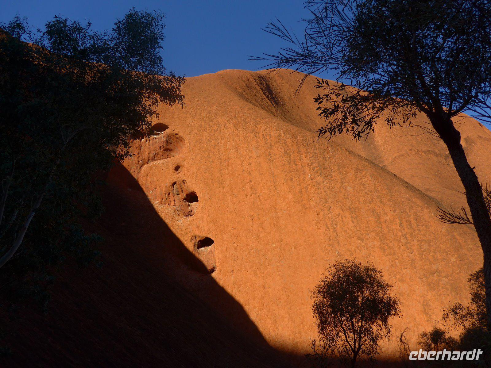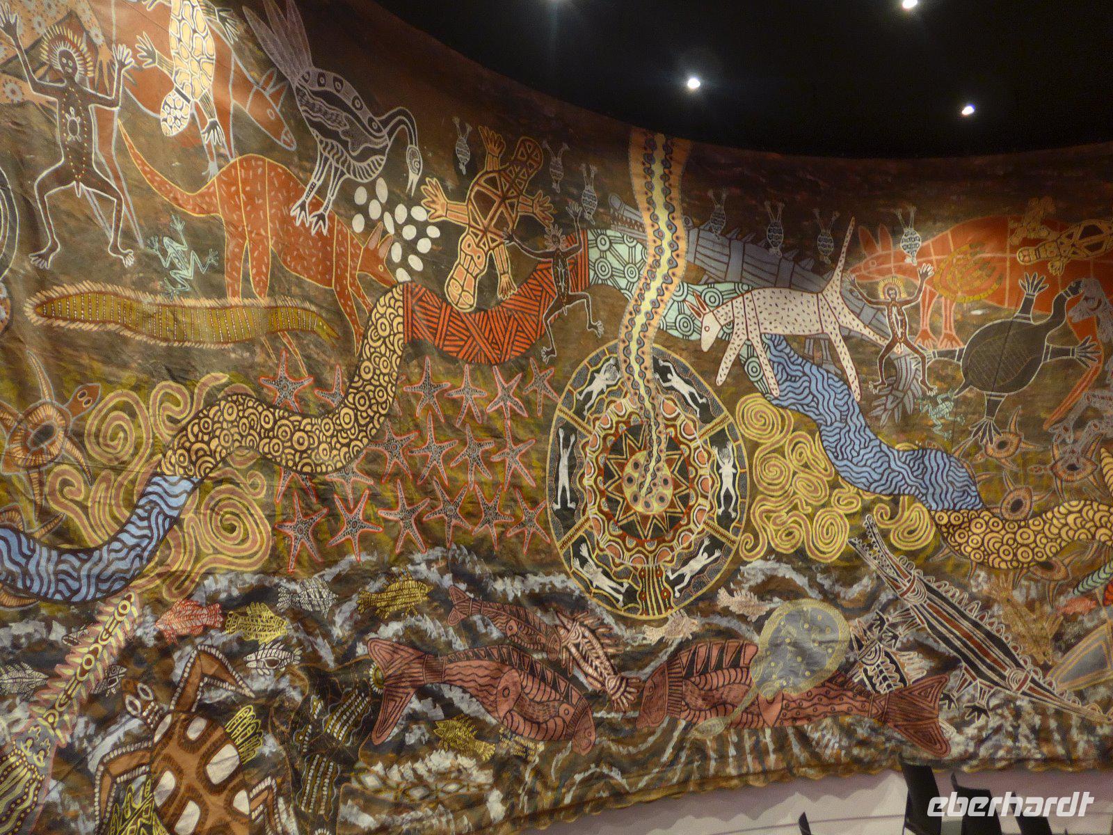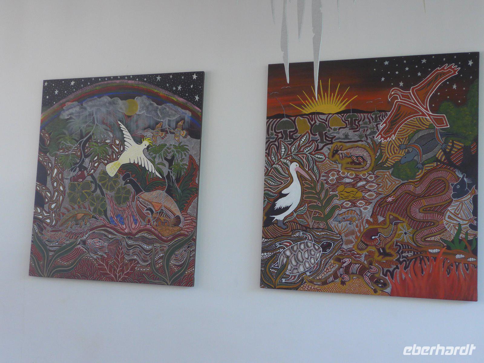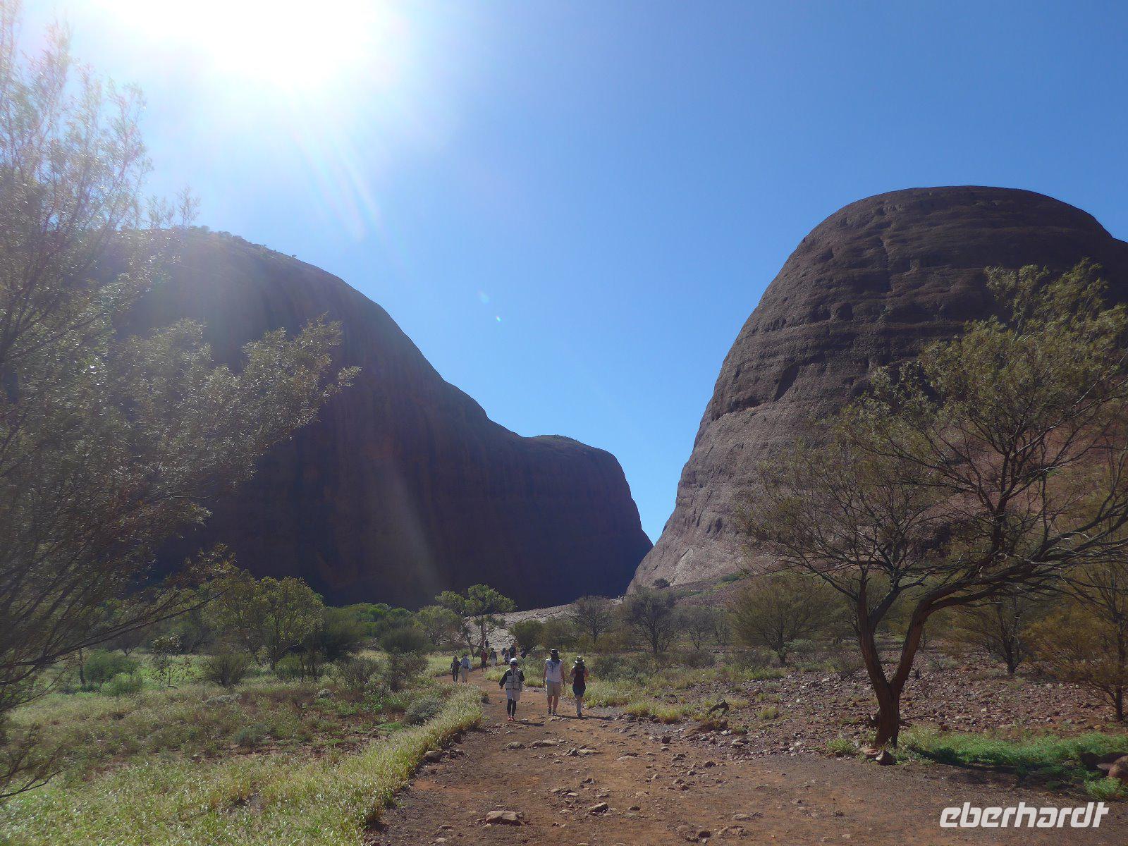 Gleich früh gegen 6 Uhr ging es dann weiter, denn auch den Sonnenaufgang am Ayers Rock wollten wir uns nicht entgehen lassen. Kennzeichnend sind in dieser Gegend die großen Temperaturschwankungen (Tags heiß und nachts mitunter sehr kalt). Bei uns waren es noch erträgliche Temperaturen. Prinzipiell ist es auch möglich, den Uluru zu besteigen. Aber für die Ureinwohner ist dieser Berg ein heiliger Fels, dessen Besteigung für sie ein Tabu ist. Wir zollen den Ureinwohnern Respekt u. verzichten auf den Aufstieg. Im Kulturzentrum der Aborigines hatten wir die Möglichkeit der Besichtigung einer interessanten Ausstellung u. es blieb auch ausreichend Zeit für den Einkauf von Kunstgegenständen - wenn nicht hier wann dann? Danach noch ein Frühstück und dann ging es weiter zu den Olgas.