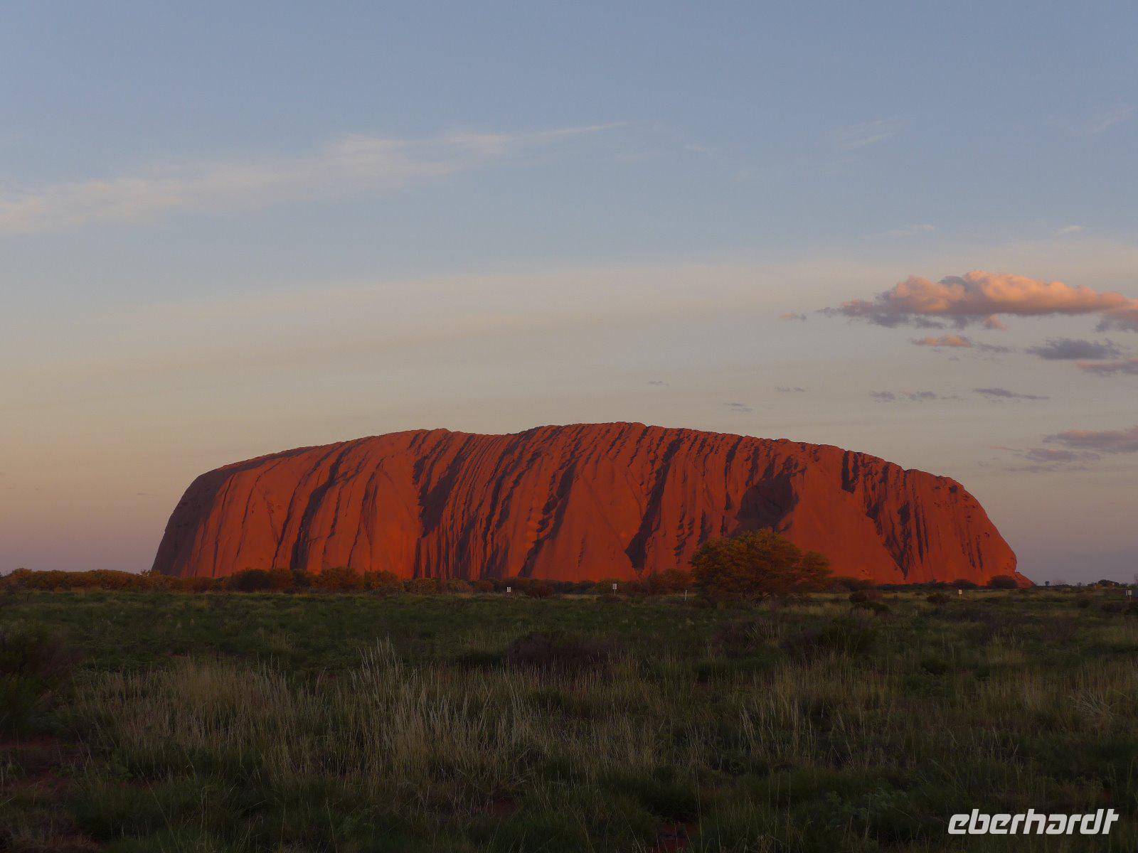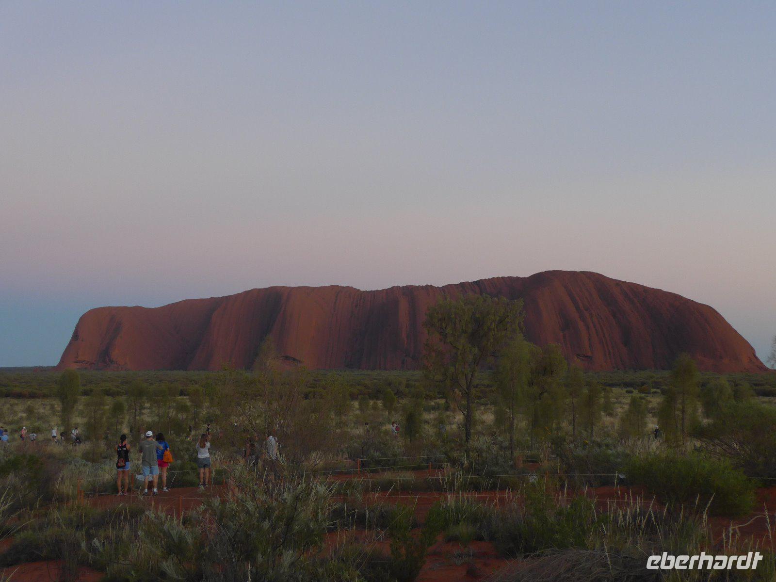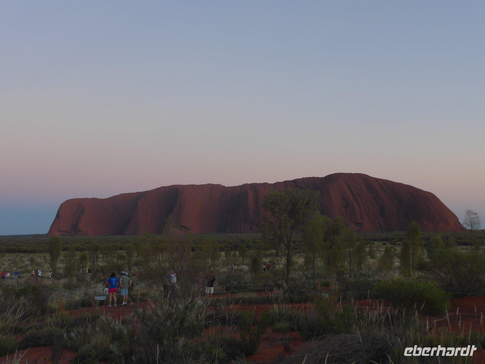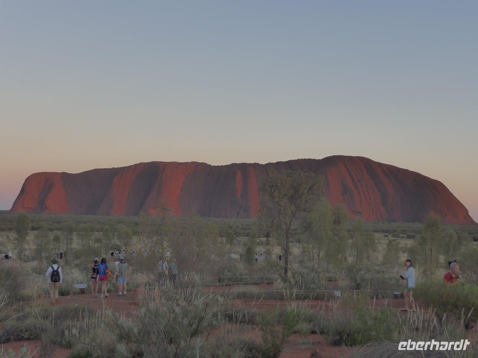 Nun war es Zeit für ein Naturerlebnis. In etwas Entfernung erlebten wir das Schauspiel der Farben bei einem herrlichen Sonnenuntergang. Zum Greifen nah - der Uluru! Betrachtet man den riesigen Felsklotz des Uluru aus der Ferne, könnte man meinen, dass er so geradewegs vom Himmel gefallen sei. Dass dem nicht so ist, beweist seine geologische Entstehungsgeschichte. Der Ayers Rock bietet für Fotografen einzigartige Möglichkeiten. Aufgrund des Eisengehalts im Stein schimmert der Fels stets rötlich und verändert seinen Farbton besonders dramatisch mit der auf- und untergehenden Sonne - deshalb waren der Sonnenuntergang und auch der Sonnenaufgang ein absolutes Muss auf unserer Reise.