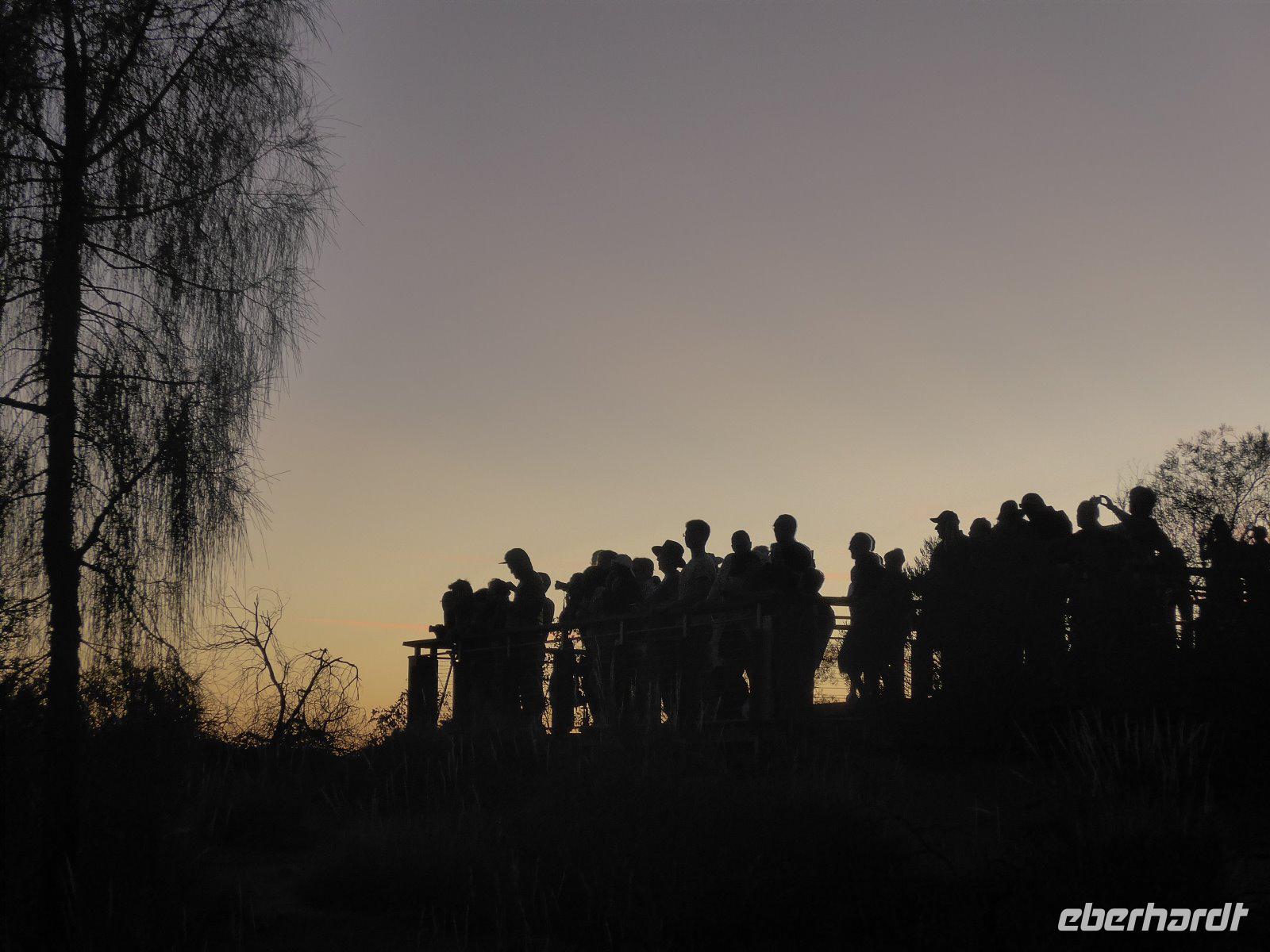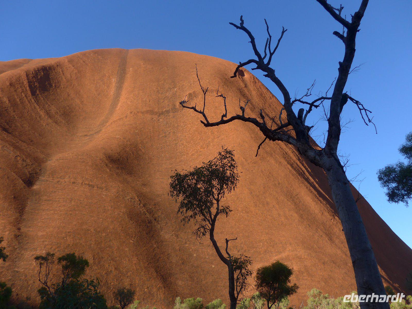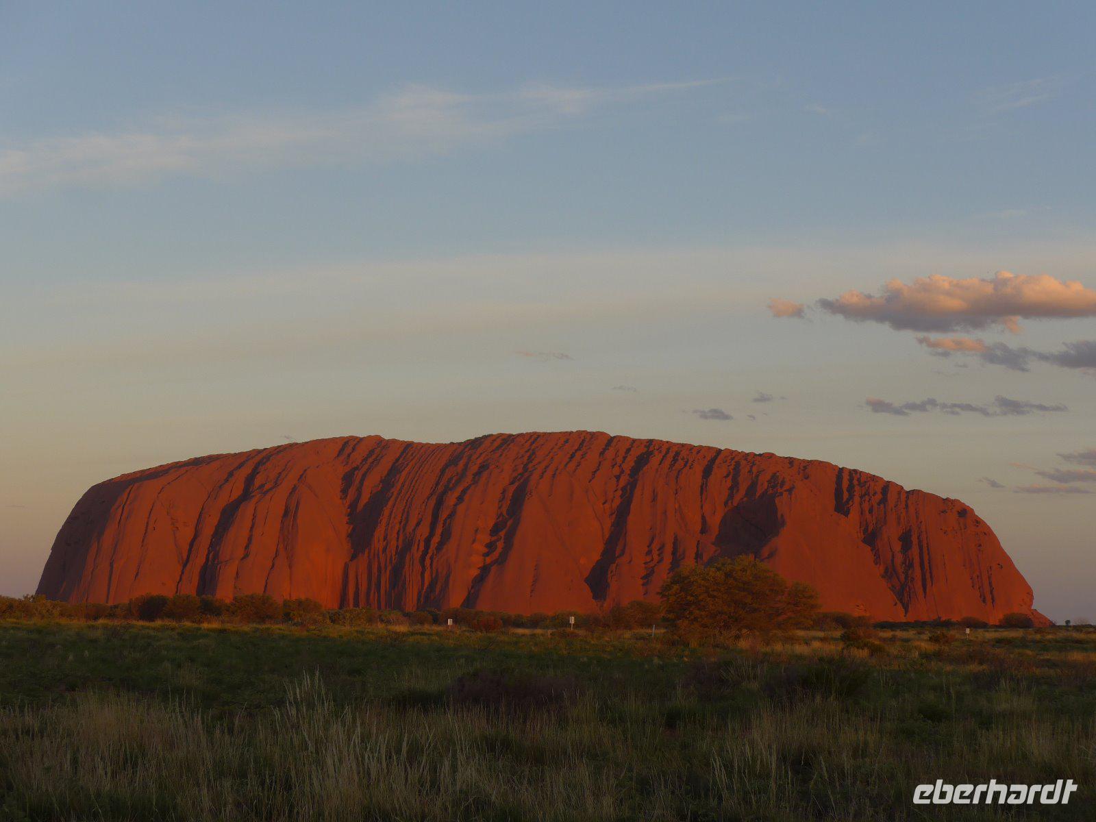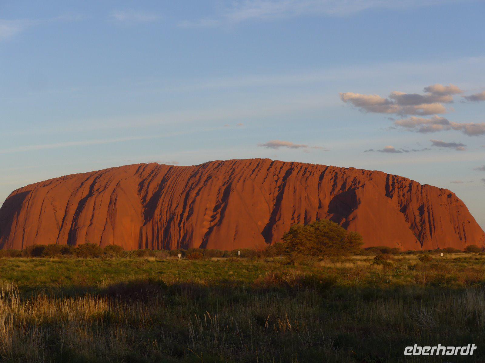 Nun war es Zeit für ein Naturerlebnis. In etwas Entfernung erlebten wir das Schauspiel der Farben bei einem herrlichen Sonnenuntergang. Zum Greifen nah - der Uluru! Betrachtet man den riesigen Felsklotz des Uluru aus der Ferne, könnte man meinen, dass er so geradewegs vom Himmel gefallen sei. Dass dem nicht so ist, beweist seine geologische Entstehungsgeschichte. Der Ayers Rock bietet für Fotografen einzigartige Möglichkeiten. Aufgrund des Eisengehalts im Stein schimmert der Fels stets rötlich und verändert seinen Farbton besonders dramatisch mit der auf- und untergehenden Sonne - deshalb waren der Sonnenuntergang und auch der Sonnenaufgang ein absolutes Muss auf unserer Reise.