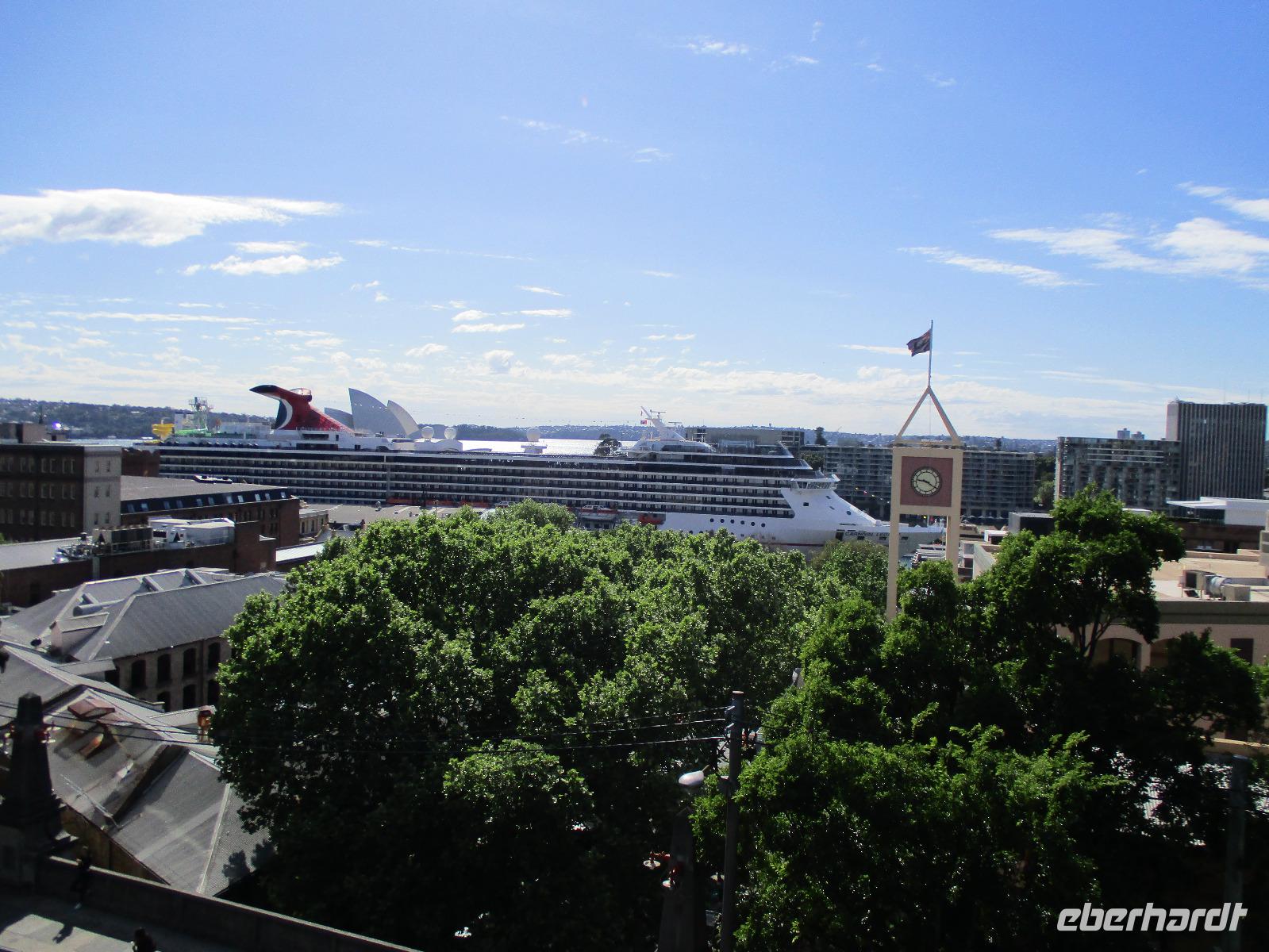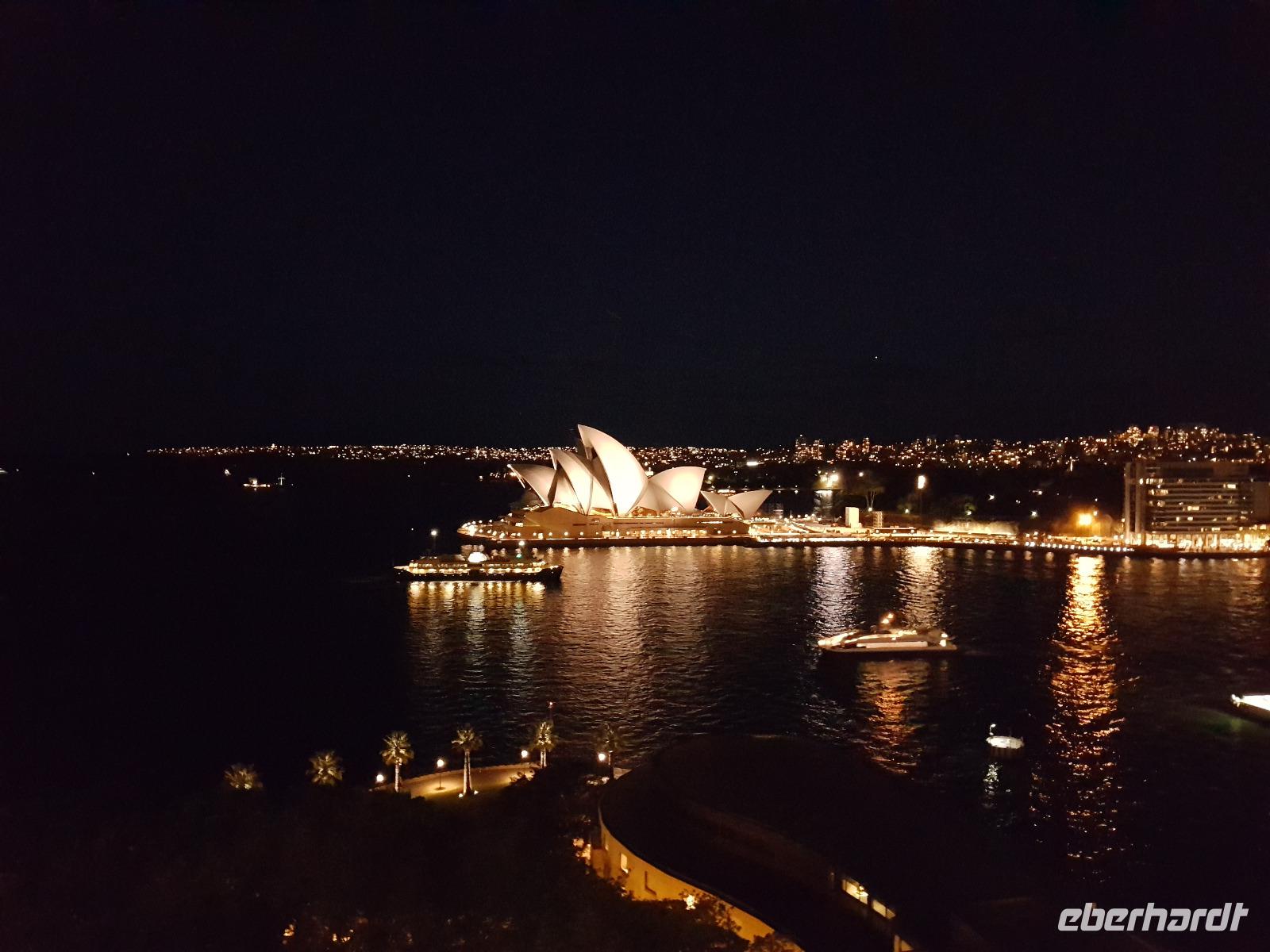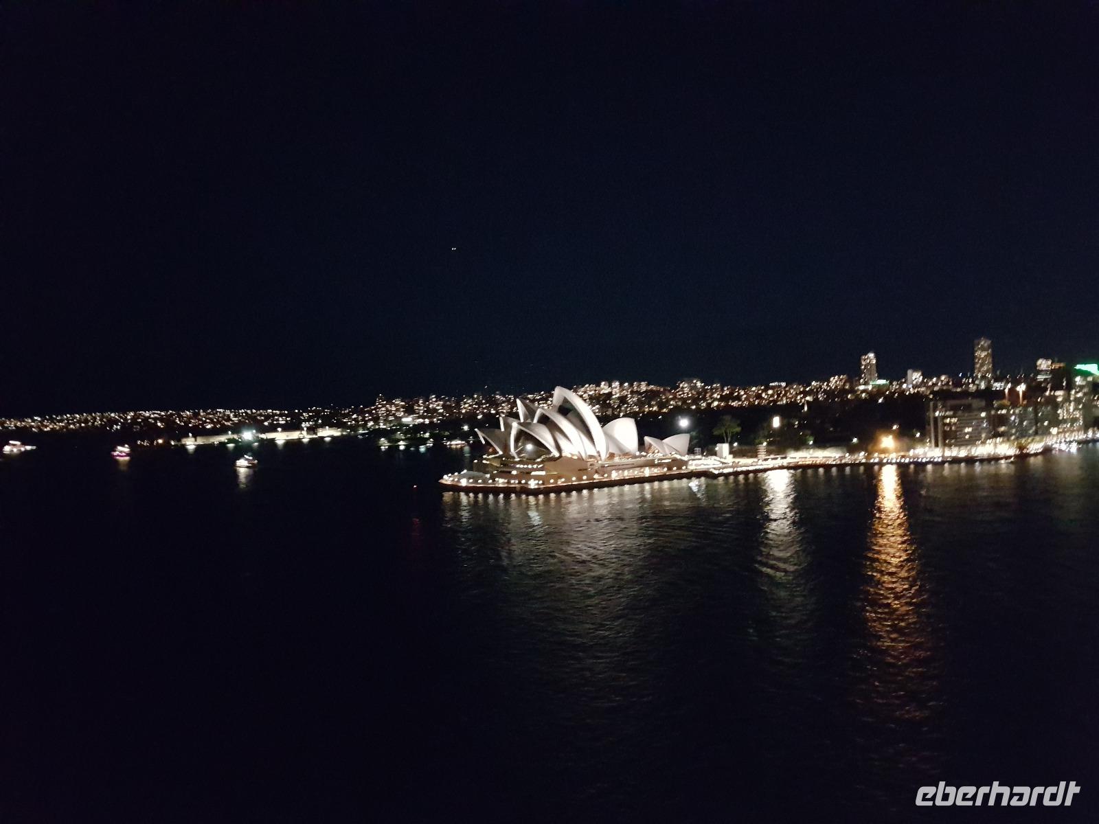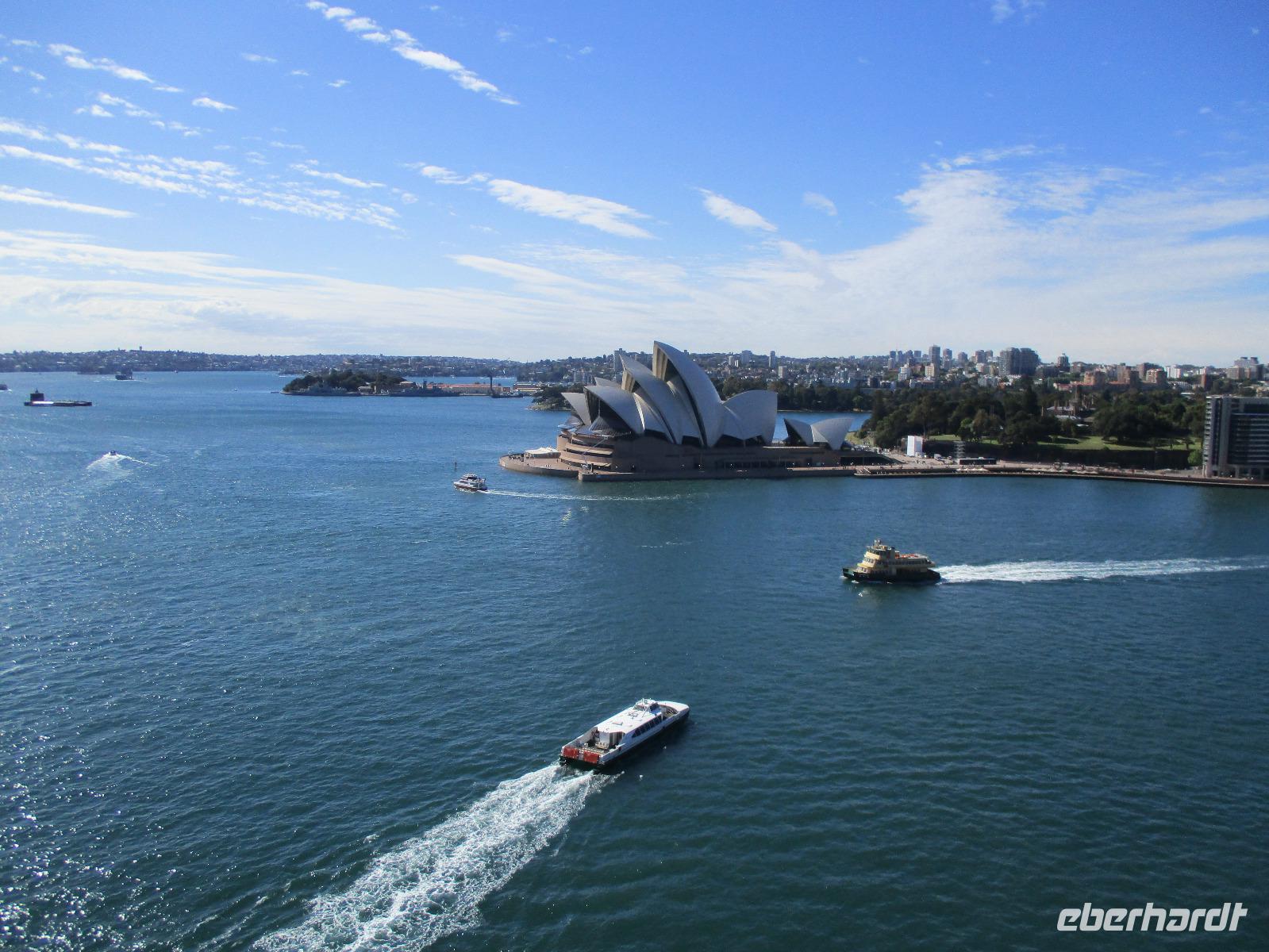 Nach dem Frühstück trafen sich die meisten Gäste, um gemeinsam zur Harbour-Bridge und darüber hinweg zu spazieren. Wir genossen schöne Aussichten und auch die vielen Schiffe auf dem Wasser im Hafen der Stadt. Ein großes Kreuzfahrtschiff dominierte die gesamte Kulisse. Nach dem Spaziergang begann am Mittag dann ein geführter Spaziergang mit unserer Reiseleiterin Uli. Wir gingen durch die Straßen der Stadt in Richtung Hafen. Unterwegs erfuhren wir viel von Uli über das Leben in der Stadt. Die berühmte Oper war unser erstes Ziel an diesem Nachmittag. Bei einer Führung in diesem berühmten Gebäude erfuhren wir interessante Details über die Entstehung und die Nutzung des markanten Operngebäudes. In einige der Säle konnten wir hineinschauen, im großen Konzertsaal kurz einer Probe beiwohnen. Nach dem Besuch der Oper begaben wir uns auf ein Schiff, um jetzt vom Wasser aus die Stadt zu sehen. Wir erkannten einige Orte, an denen wir am Vortag zur Stadtrundfahrt gewesen waren. Beeindruckend natürlich wieder die Oper und die Hafenbrücke. Entlang des Ufers neben der Oper befindet sich der Botanische Garten, den wir vom Wasser aus auch gut erkennen konnten. Bei einem Kaffee und Keksen genossen wir den herrlichen Nachmittag mit Sonnenschein auf dem Wasser. Im Anschluss daran hatten wir Freizeit in der Stadt, einige gingen zusammen durch den Botanischen Garten, danach vorbei an der katholischen Kathedrale, über den Nudelmarkt und vorbei am berühmten Kaufhaus Queen Victoria Building. Der Nachmittag endete wieder in der Nähe der Oper, an der Waterfront bei einem gemeinsamen Abendessen in einem der Fischrestaurants mit Blick auf den Hafen. Gemeinsam spazierten wir nach dem Essen zu unserem Hotel, um unsere zweite Nacht in Sydney zu verbringen.