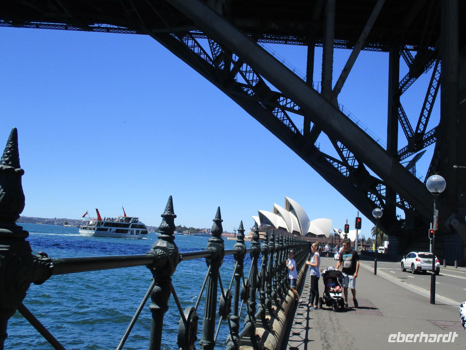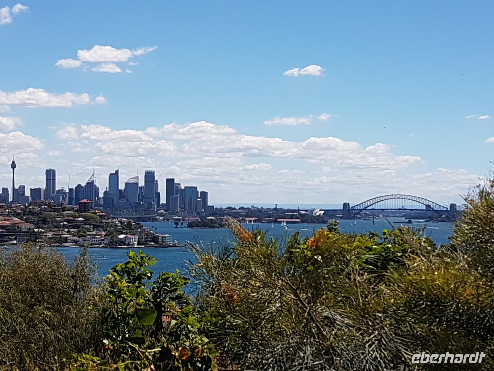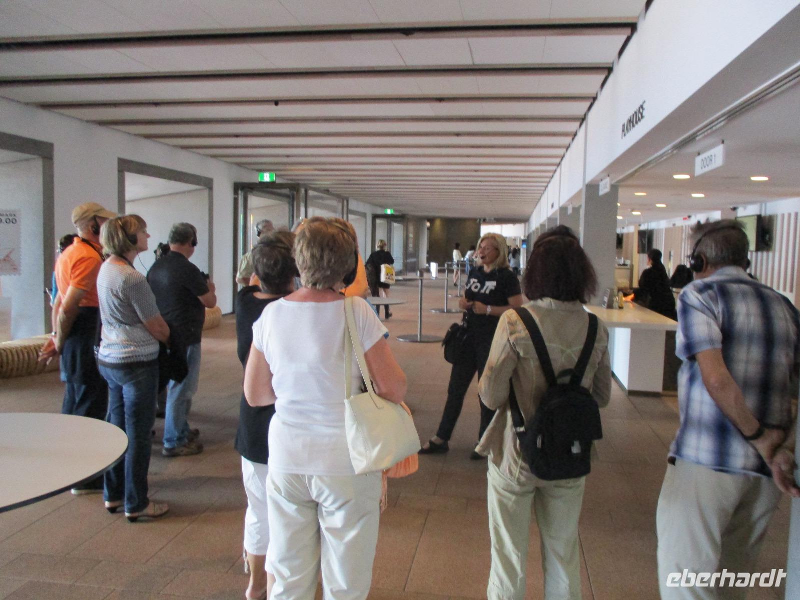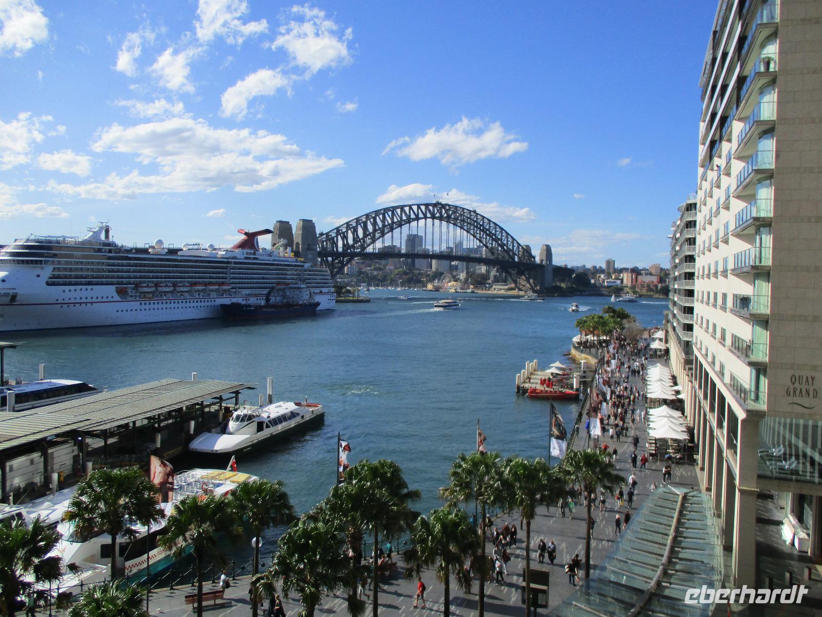 Nach dem Frühstück trafen sich die meisten Gäste, um gemeinsam zur Harbour-Bridge und darüber hinweg zu spazieren. Wir genossen schöne Aussichten und auch die vielen Schiffe auf dem Wasser im Hafen der Stadt. Ein großes Kreuzfahrtschiff dominierte die gesamte Kulisse. Nach dem Spaziergang begann am Mittag dann ein geführter Spaziergang mit unserer Reiseleiterin Uli. Wir gingen durch die Straßen der Stadt in Richtung Hafen. Unterwegs erfuhren wir viel von Uli über das Leben in der Stadt. Die berühmte Oper war unser erstes Ziel an diesem Nachmittag. Bei einer Führung in diesem berühmten Gebäude erfuhren wir interessante Details über die Entstehung und die Nutzung des markanten Operngebäudes. In einige der Säle konnten wir hineinschauen, im großen Konzertsaal kurz einer Probe beiwohnen. Nach dem Besuch der Oper begaben wir uns auf ein Schiff, um jetzt vom Wasser aus die Stadt zu sehen. Wir erkannten einige Orte, an denen wir am Vortag zur Stadtrundfahrt gewesen waren. Beeindruckend natürlich wieder die Oper und die Hafenbrücke. Entlang des Ufers neben der Oper befindet sich der Botanische Garten, den wir vom Wasser aus auch gut erkennen konnten. Bei einem Kaffee und Keksen genossen wir den herrlichen Nachmittag mit Sonnenschein auf dem Wasser. Im Anschluss daran hatten wir Freizeit in der Stadt, einige gingen zusammen durch den Botanischen Garten, danach vorbei an der katholischen Kathedrale, über den Nudelmarkt und vorbei am berühmten Kaufhaus Queen Victoria Building. Der Nachmittag endete wieder in der Nähe der Oper, an der Waterfront bei einem gemeinsamen Abendessen in einem der Fischrestaurants mit Blick auf den Hafen. Gemeinsam spazierten wir nach dem Essen zu unserem Hotel, um unsere zweite Nacht in Sydney zu verbringen.
