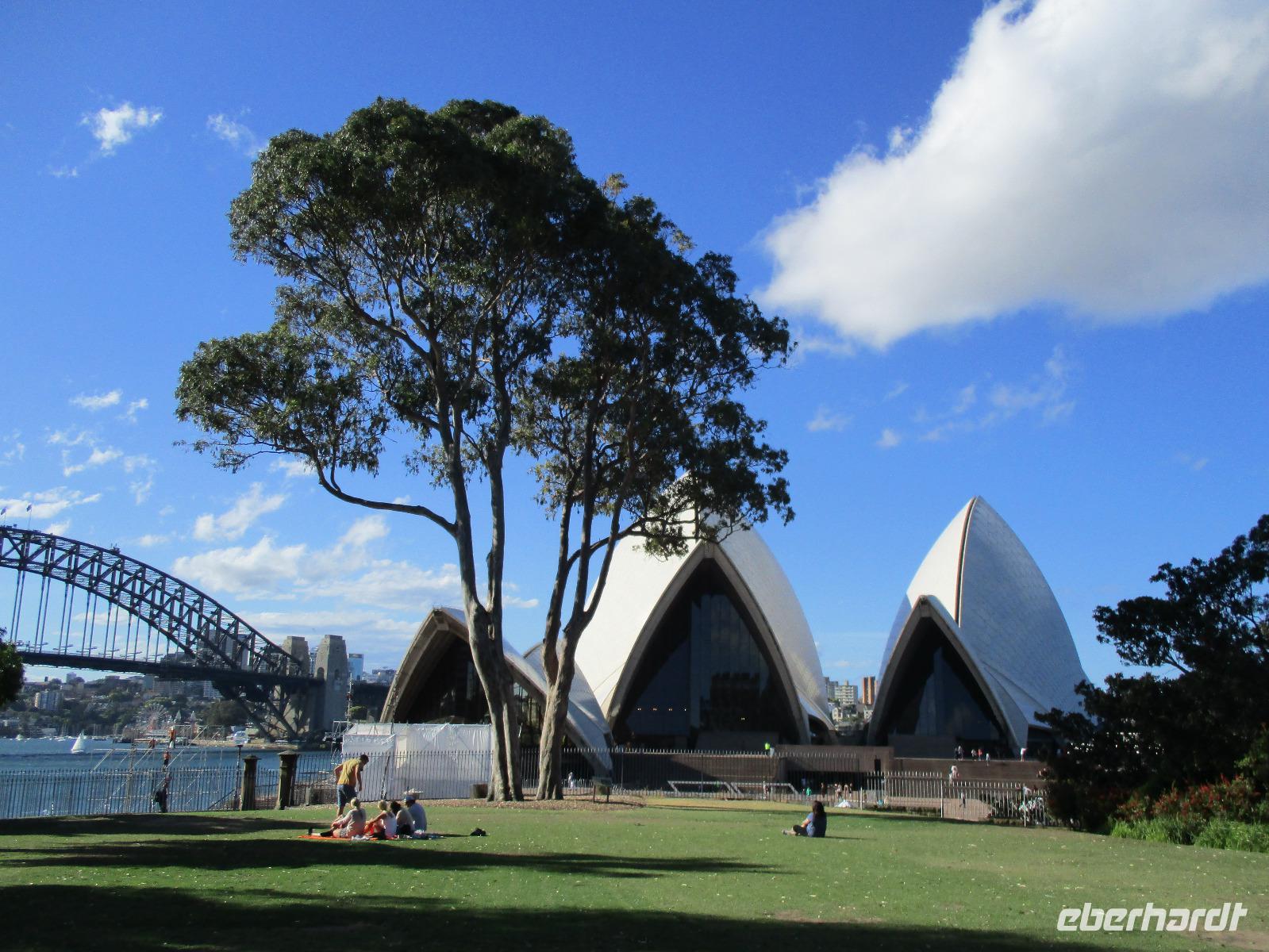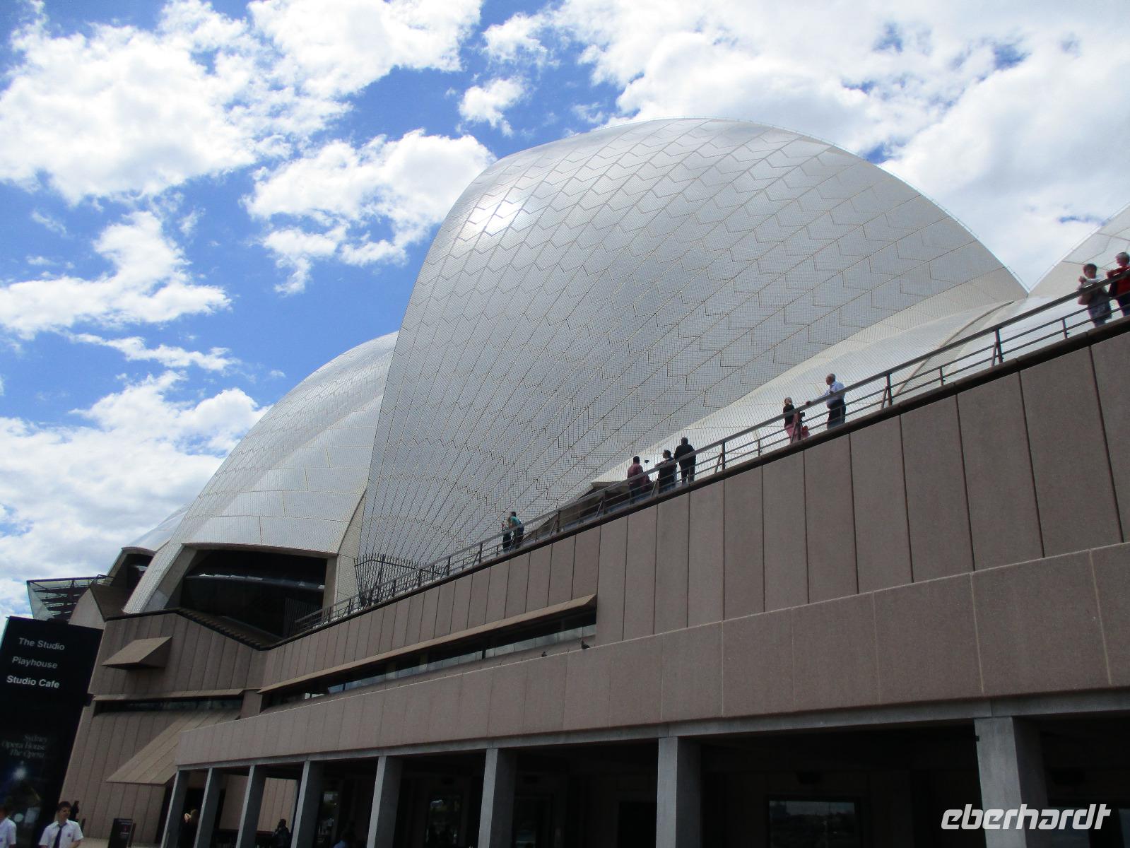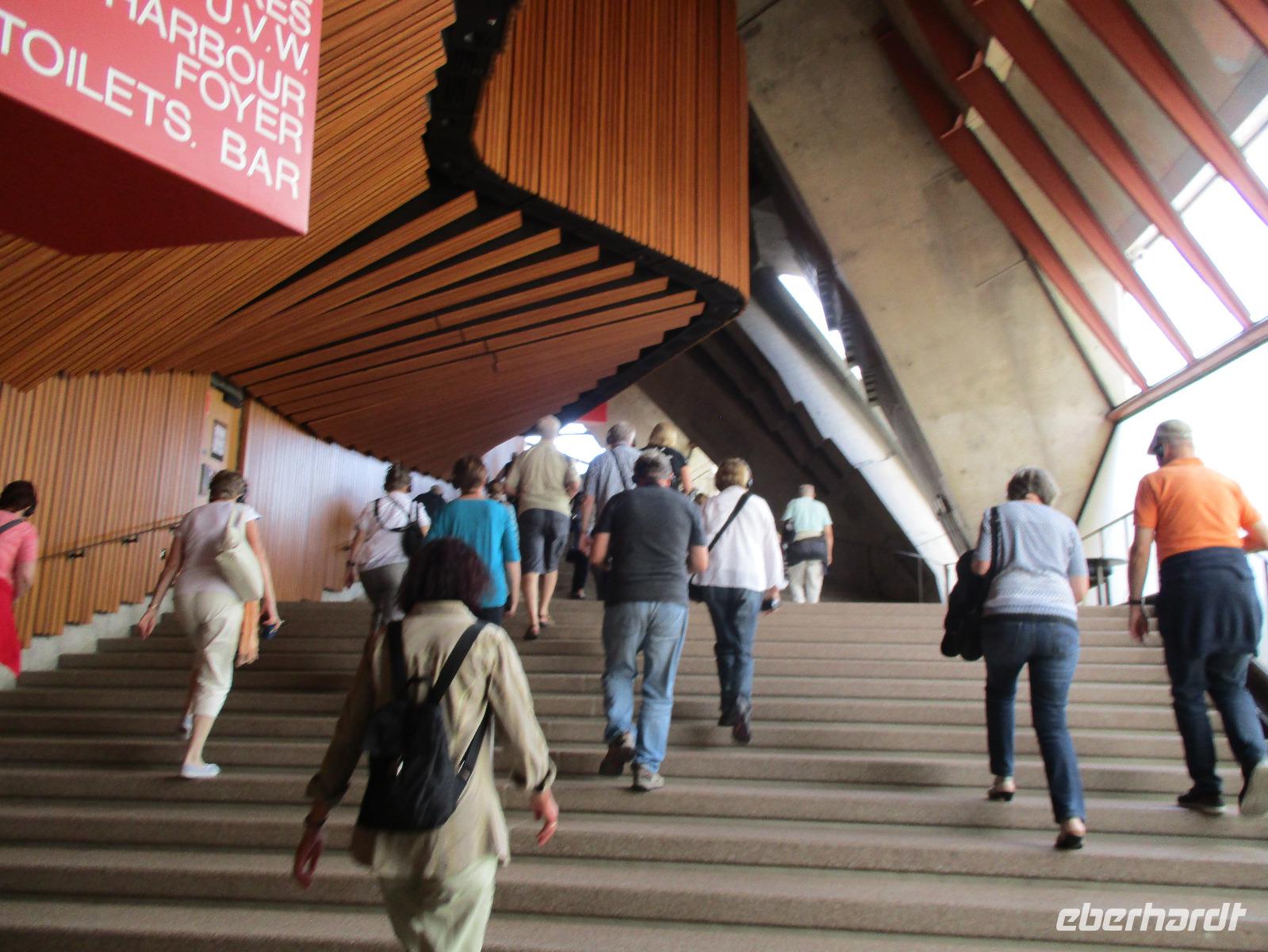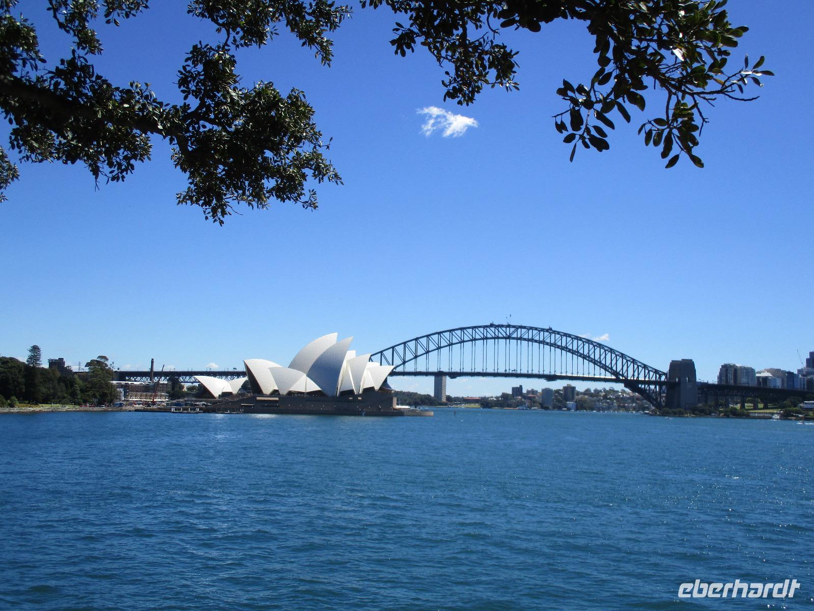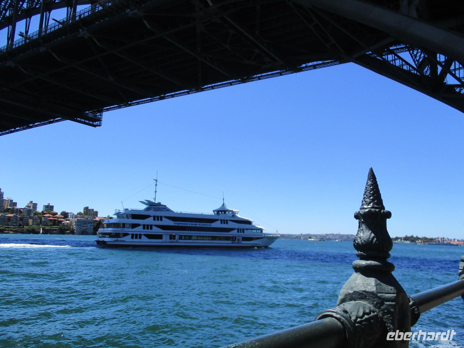 Nach dem Frühstück trafen sich die meisten Gäste, um gemeinsam zur Harbour-Bridge und darüber hinweg zu spazieren. Wir genossen schöne Aussichten und auch die vielen Schiffe auf dem Wasser im Hafen der Stadt. Ein großes Kreuzfahrtschiff dominierte die gesamte Kulisse. Nach dem Spaziergang begann am Mittag dann ein geführter Spaziergang mit unserer Reiseleiterin Uli. Wir gingen durch die Straßen der Stadt in Richtung Hafen. Unterwegs erfuhren wir viel von Uli über das Leben in der Stadt. Die berühmte Oper war unser erstes Ziel an diesem Nachmittag. Bei einer Führung in diesem berühmten Gebäude erfuhren wir interessante Details über die Entstehung und die Nutzung des markanten Operngebäudes. In einige der Säle konnten wir hineinschauen, im großen Konzertsaal kurz einer Probe beiwohnen. Nach dem Besuch der Oper begaben wir uns auf ein Schiff, um jetzt vom Wasser aus die Stadt zu sehen. Wir erkannten einige Orte, an denen wir am Vortag zur Stadtrundfahrt gewesen waren. Beeindruckend natürlich wieder die Oper und die Hafenbrücke. Entlang des Ufers neben der Oper befindet sich der Botanische Garten, den wir vom Wasser aus auch gut erkennen konnten. Bei einem Kaffee und Keksen genossen wir den herrlichen Nachmittag mit Sonnenschein auf dem Wasser. Im Anschluss daran hatten wir Freizeit in der Stadt, einige gingen zusammen durch den Botanischen Garten, danach vorbei an der katholischen Kathedrale, über den Nudelmarkt und vorbei am berühmten Kaufhaus Queen Victoria Building. Der Nachmittag endete wieder in der Nähe der Oper, an der Waterfront bei einem gemeinsamen Abendessen in einem der Fischrestaurants mit Blick auf den Hafen. Gemeinsam spazierten wir nach dem Essen zu unserem Hotel, um unsere zweite Nacht in Sydney zu verbringen.