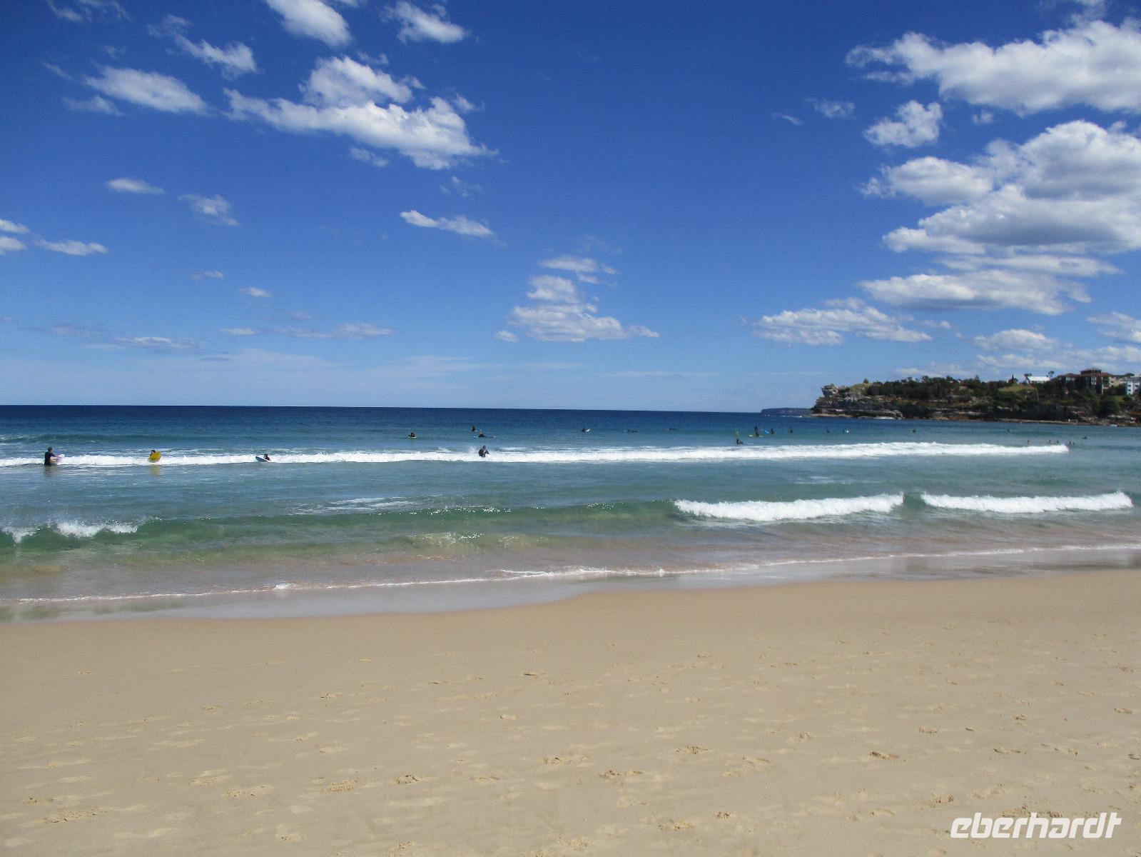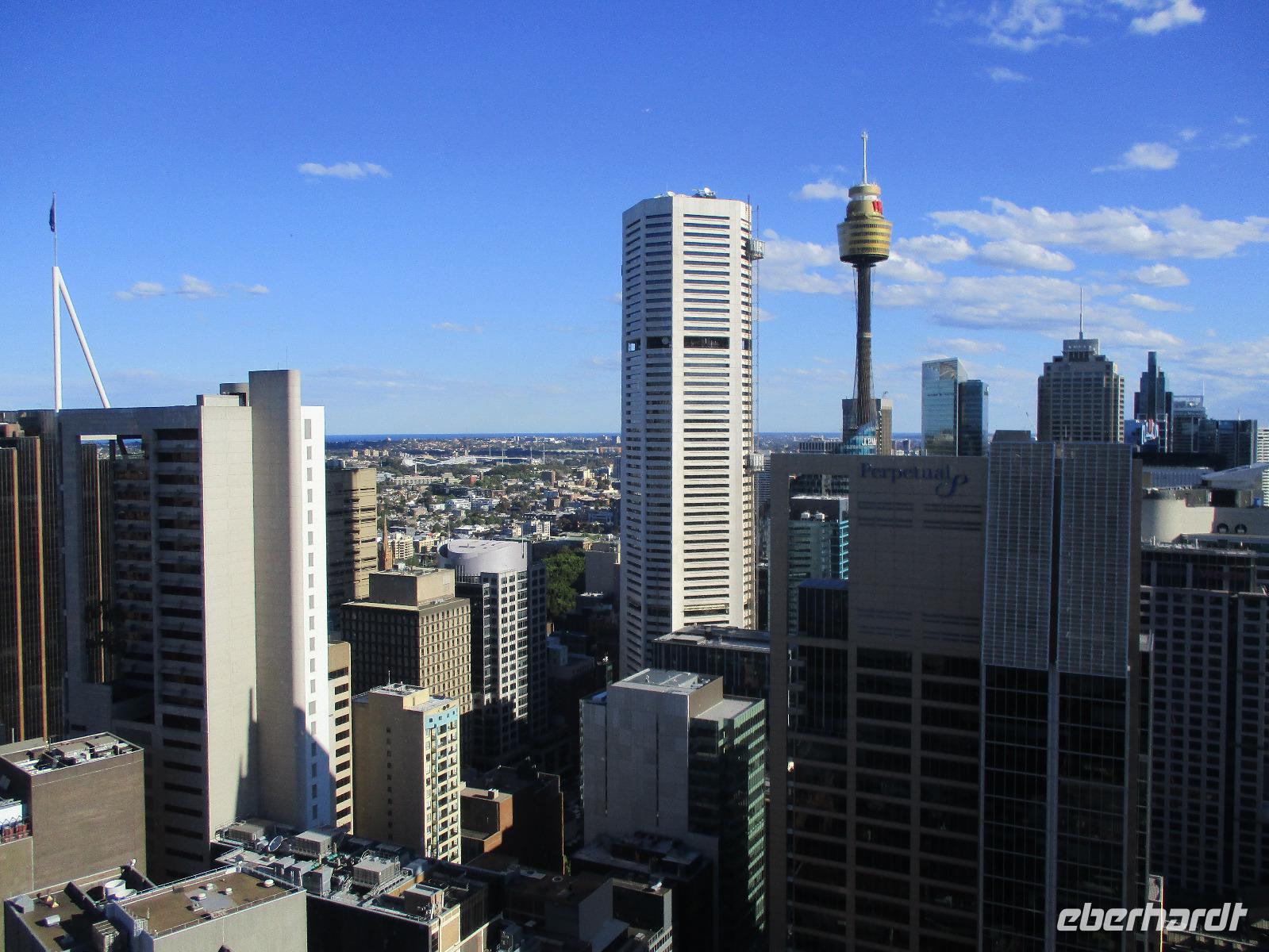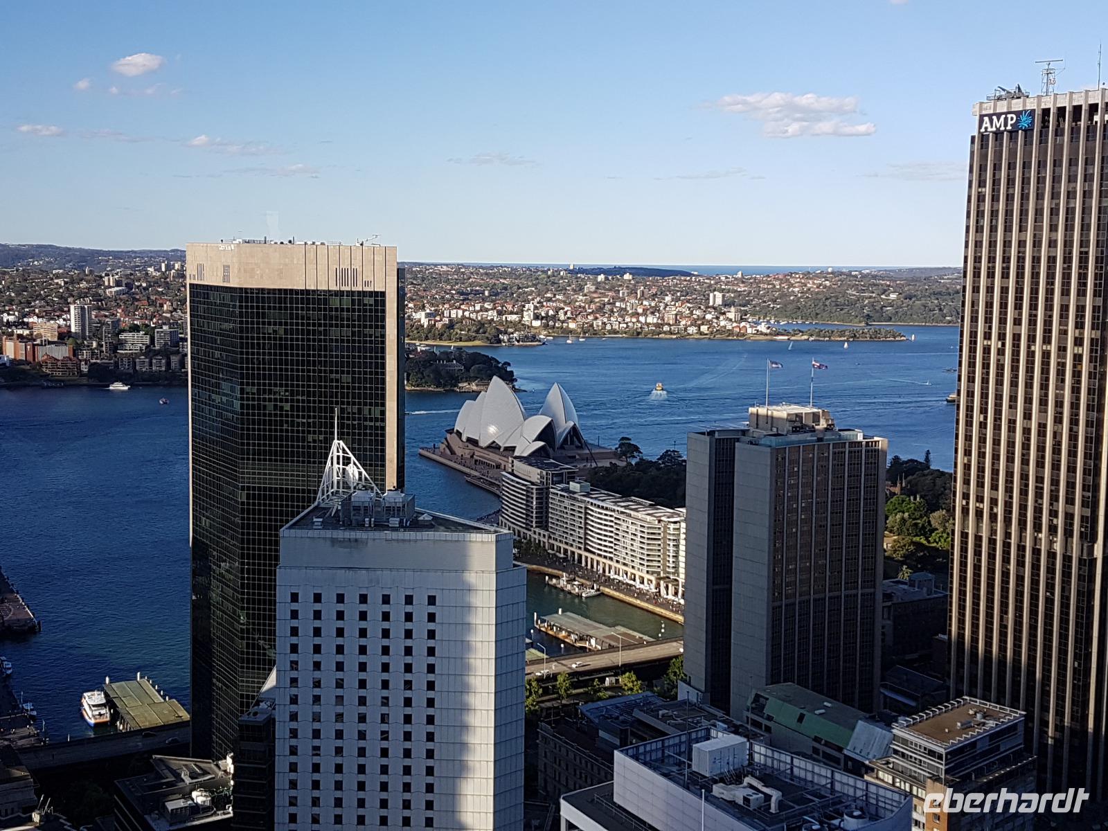 Am frühen Morgen landeten wir in Sydney. Unsere Reiseleiterin Uli holte uns ab und wir wurden zunächst einmal zu unserem Hotel Travelodge Wynyard gebracht. Wir frühstückten im Buffet-Restaurant des Hotels und bezogen unsere Zimmer. Nach kurzem Aufenthalt trafen wir uns wieder, um mit Uli eine Stadtrundfahrt durch Sydney zu erleben. Sie zeigte uns nicht nur die berühmte Harbour-Bridge und die Oper, sondern auch einige schöne Aussichtspunkte über der Stadt, die Hafeneinfahrt und auch Bondi Beach. Das ist ein beliebter Sandstrand in Sydney, wo sich auch an diesem Tag viele Leute am Wasser tummelten. Nach kurzer Freizeit am Strand erreichten wir am späten Nachmittag wieder unser Hotel. Einige unserer Gruppe trafen sich noch einmal zu einem kurzen Ausflug in eine Bar in der Nähe des Hotels. Wir spazierten um den nächsten Block und standen vor einem runden Hochhaus, dessen O-Bar im 47. Stock einen fantastischen Blick über Sydney bietet. Wir genossen einen Drink in der Bar und erlebten eine schöne Stunde weit über den Dächern der Stadt. Die Bar dreht sich um ihre Achse, und so wandelte sich der Ausblick. Highlights waren natürlich die Oper und die Hafenbrücke. Am Abend aßen wir gemeinsam im Hotel, um danach diesen ereignisreichen Tag im Hotel ausklingen zu lassen.