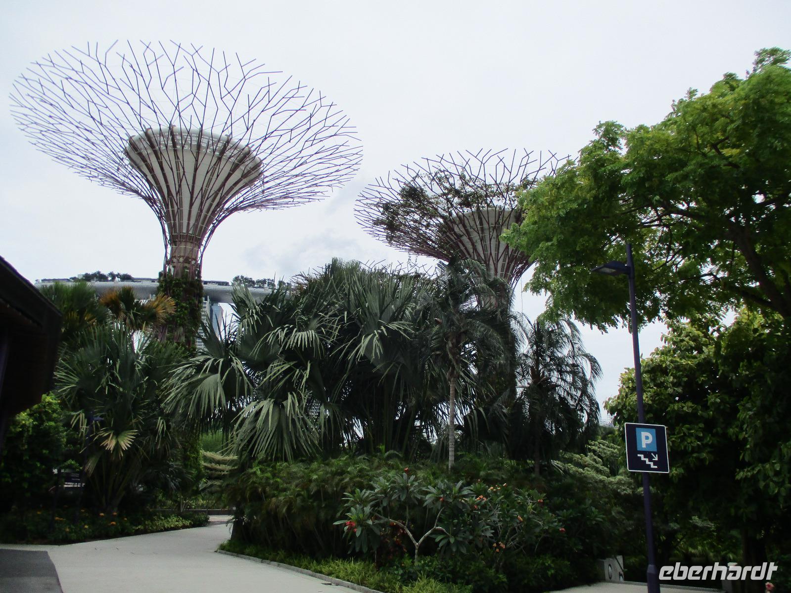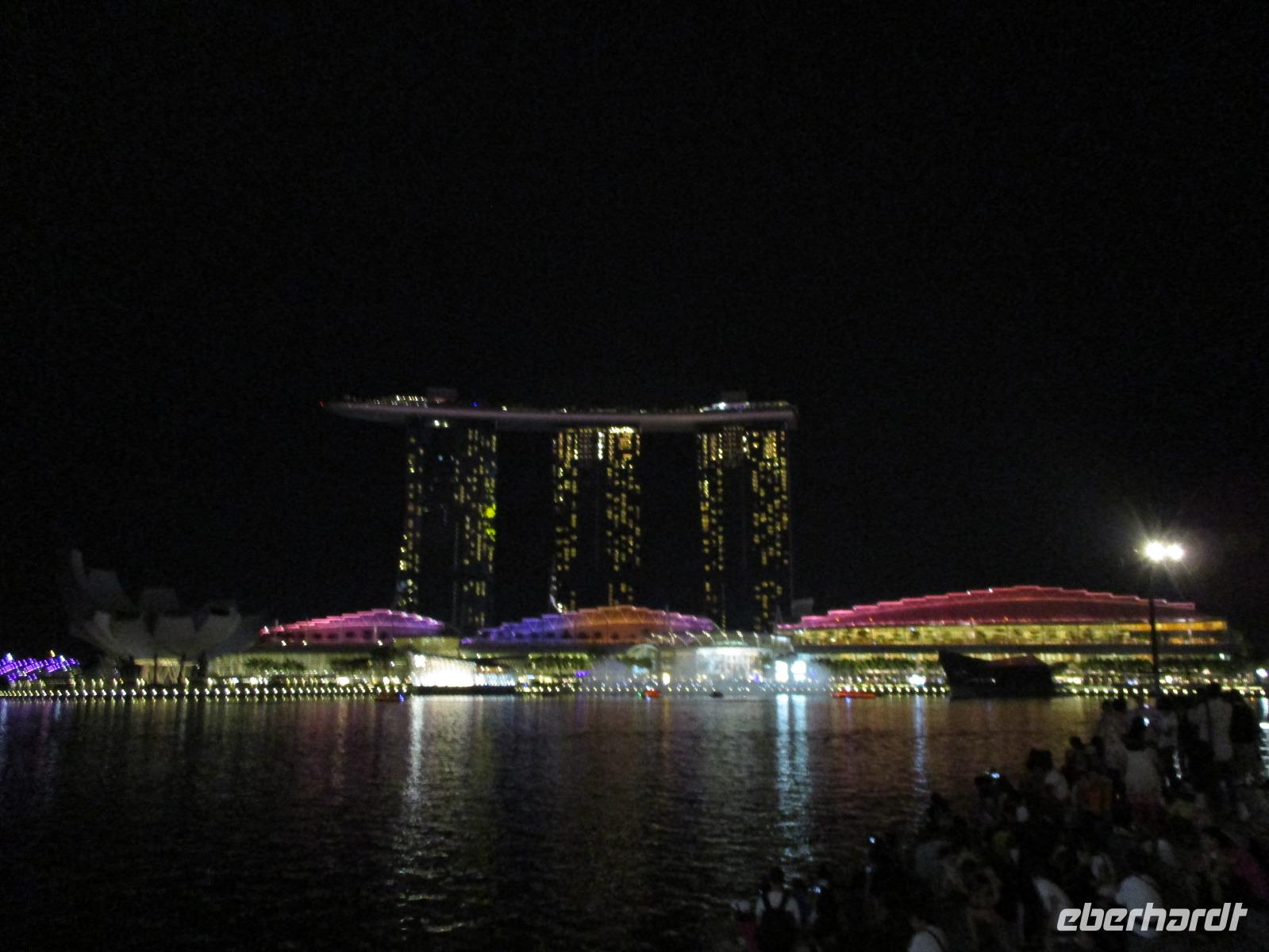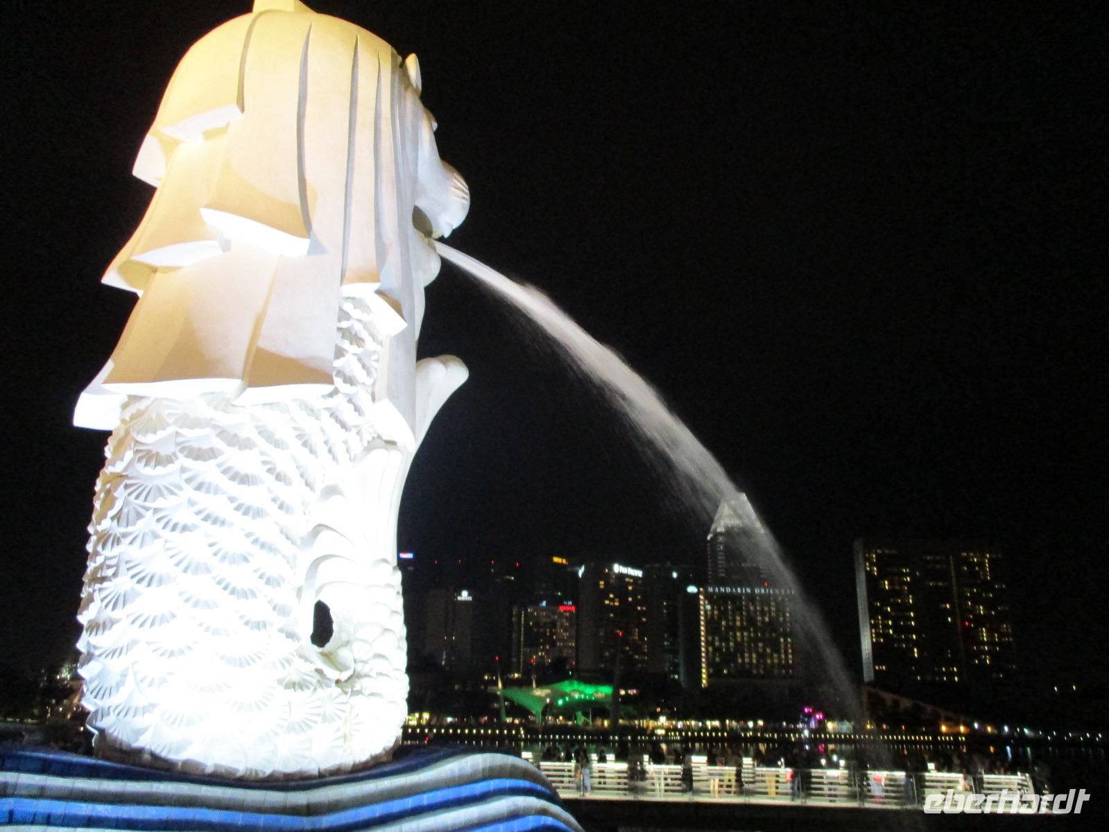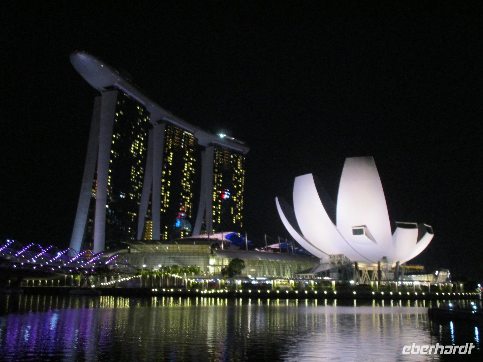 In Frankfurt auf dem Flughafen trafen wir als Gruppe zusammen, einige waren von Berlin, andere aus Leipzig und die meisten Gäste aus Dresden hierher geflogen. Gemeinsam bestiegen wir das Flugzeug, das uns nach Singapur bringen sollte. Am Nachmittag des 2. Reisetages landeten wir in Singapur. David, unser örtlicher Reiseleiter, holte uns ab. Mit dem Bus fuhren wir in die Stadt und bezogen unsere Zimmer im Park Hotel Clarke Quay in Singapur. Nach kurzem Verschnaufen trafen wir uns wieder und spazierten entlang des belebten und romantisch beleuchteten Singapur-Flusses in Richtung Marina Bay. Dort gibt es ein modernes Gebäude, das Marina Bay Sands, das den Spitznamen „Bügelbrett" trägt. Es beherbergt ein Hotel, ein Casino und ein großes Einkaufszentrum. Jeden Abend gibt es dort eine Lasershow, die auch wir bewundern wollten. Pünktlich um 20 Uhr begann sie, wir beobachteten vom gegenüber liegenden Ufer der Bucht das Schauspiel mit verschieden farbigen Lichtern und Musikuntermalung. Direkt neben uns befand sich eines der Wahrzeichen der Stadt: der wasserspeiende Löwe mit Fischschwanz. Nach der Lasershow bummelten wir noch um die Bucht herum, aßen eine Kleinigkeit im Food Court des Marina Bay Sands und fuhren zum Abschluss noch mit dem Lift hinauf zur Aussichtsplattform dieses Gebäudes und bestaunten nun von oben die hell erleuchtete Stadt. Direkt unter uns erkannten wir den Garden by the Bay, der mit seinen künstlichen Bäumen eines der neuesten Wahrzeichen Sydneys darstellt. Müde aber mit vielen interessanten Eindrücken begaben wir uns in unser Hotel für die Nacht.